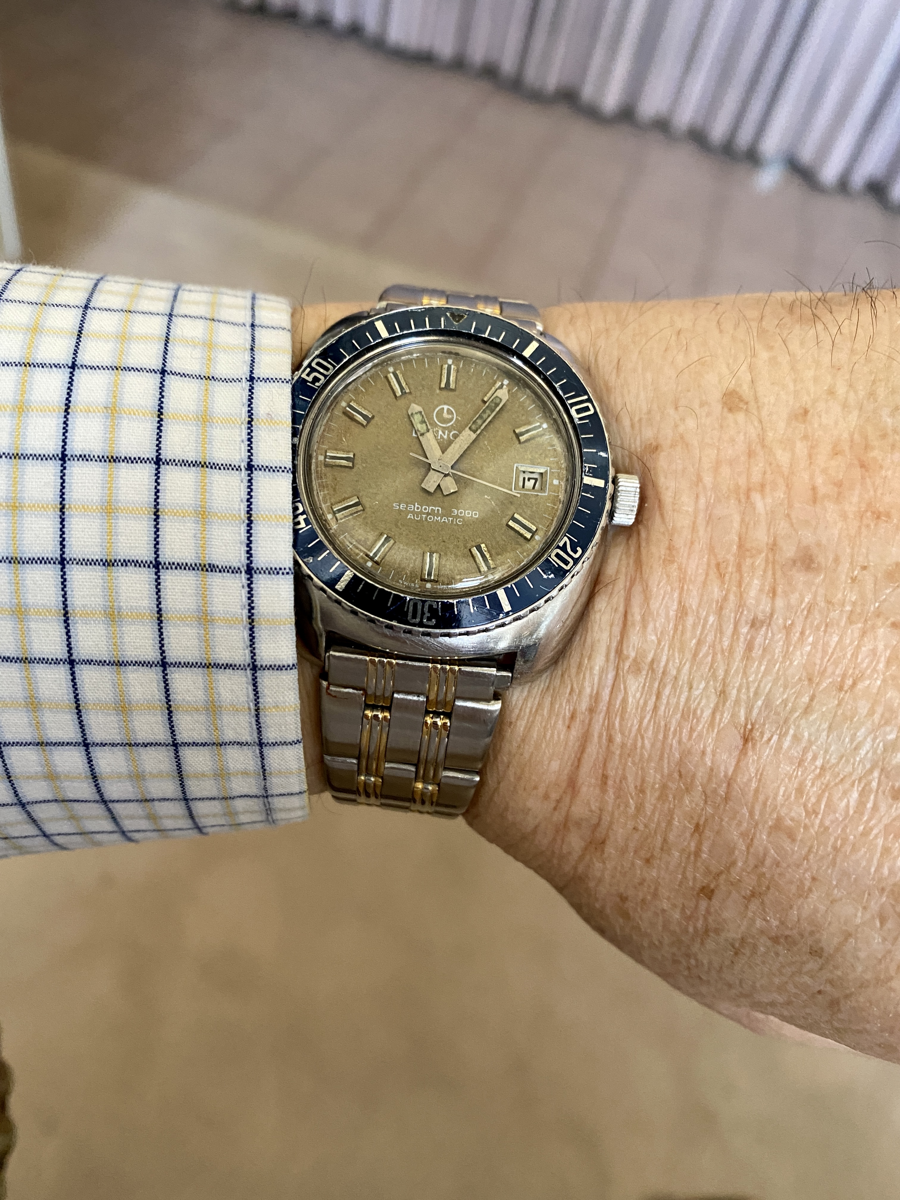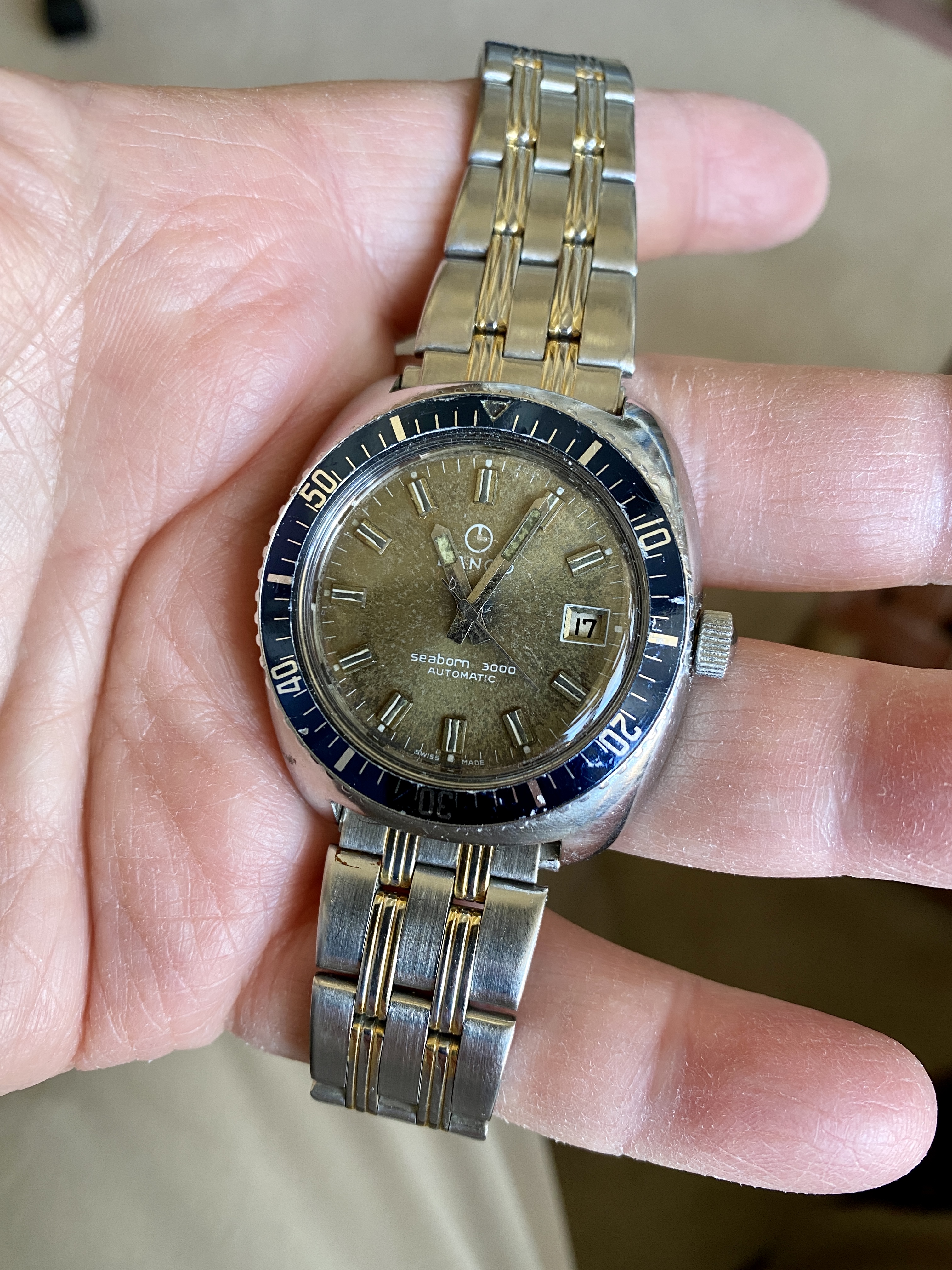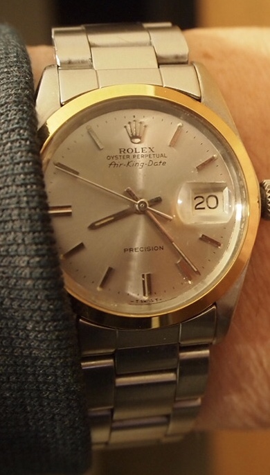 Today, my mildly modded 51-year old Rolex Air-King Date. One owner, me, won in a Rolex sales contest in 1971. Last year, it occurred to me that I had a genuine Rolex NOS 14-karat Oyster bezel in my stash. I don’t recall how I ended up with it, but the price on the envelope was $595.00! So I know I didn’t buy it! I checked the size, and it is a perfect fit for the Air-King, so here is the result. My 50th anniversary Rolex. Bracelet is after-market.
