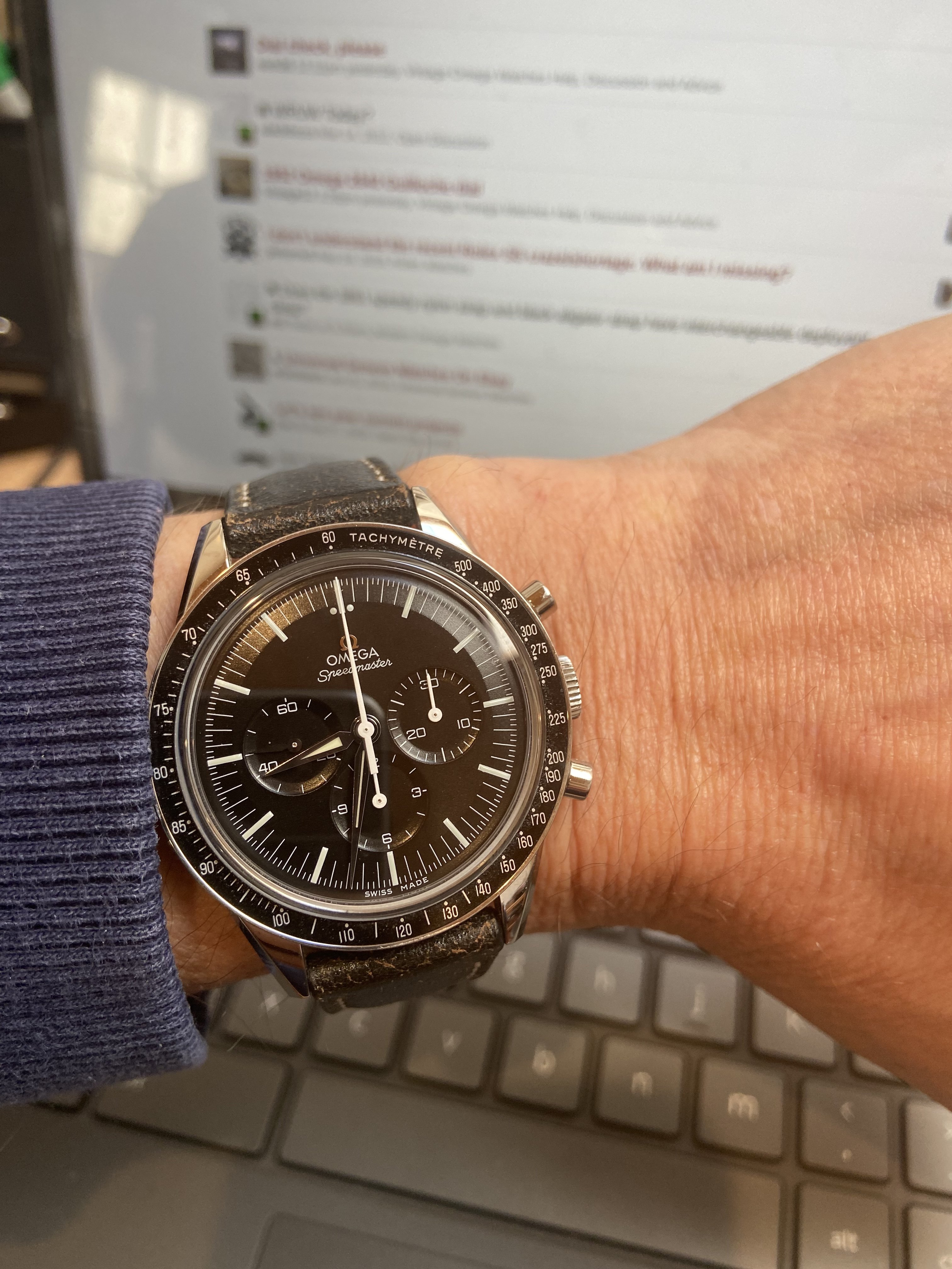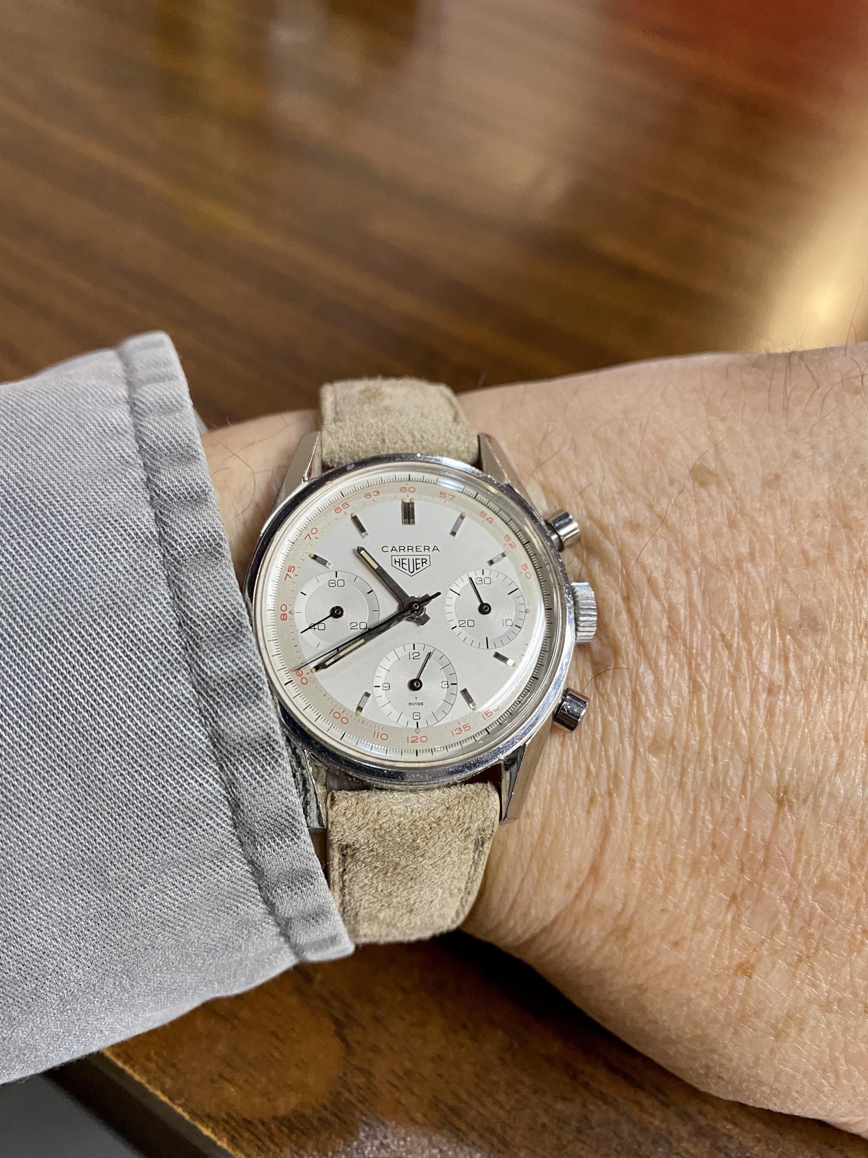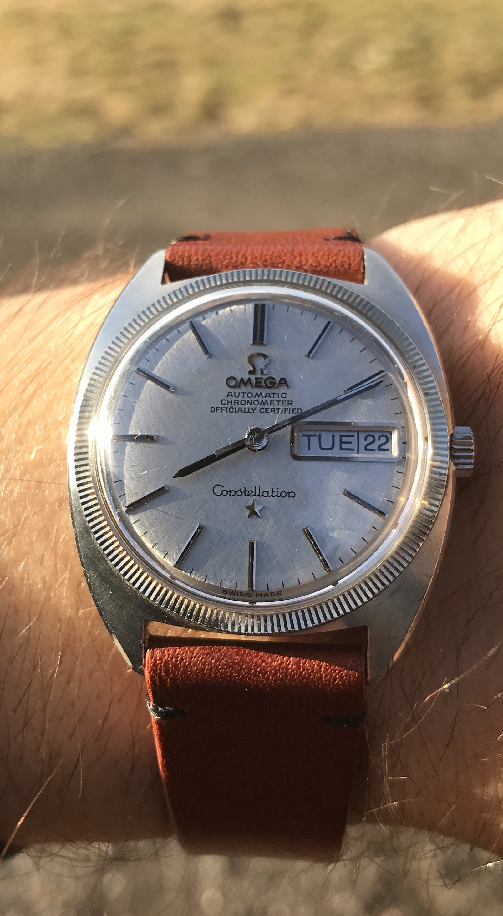 Today on the wrist: Amazing patina on this Connie 168.017 (cal 561) from about 1966. In normal light, it's cream or milk white. But in the sun it gets this really golden hues. Sometimes it can be even salmon pink. Colareb ostrich strap. Always fun to wear - and stare down your wrist 😀.