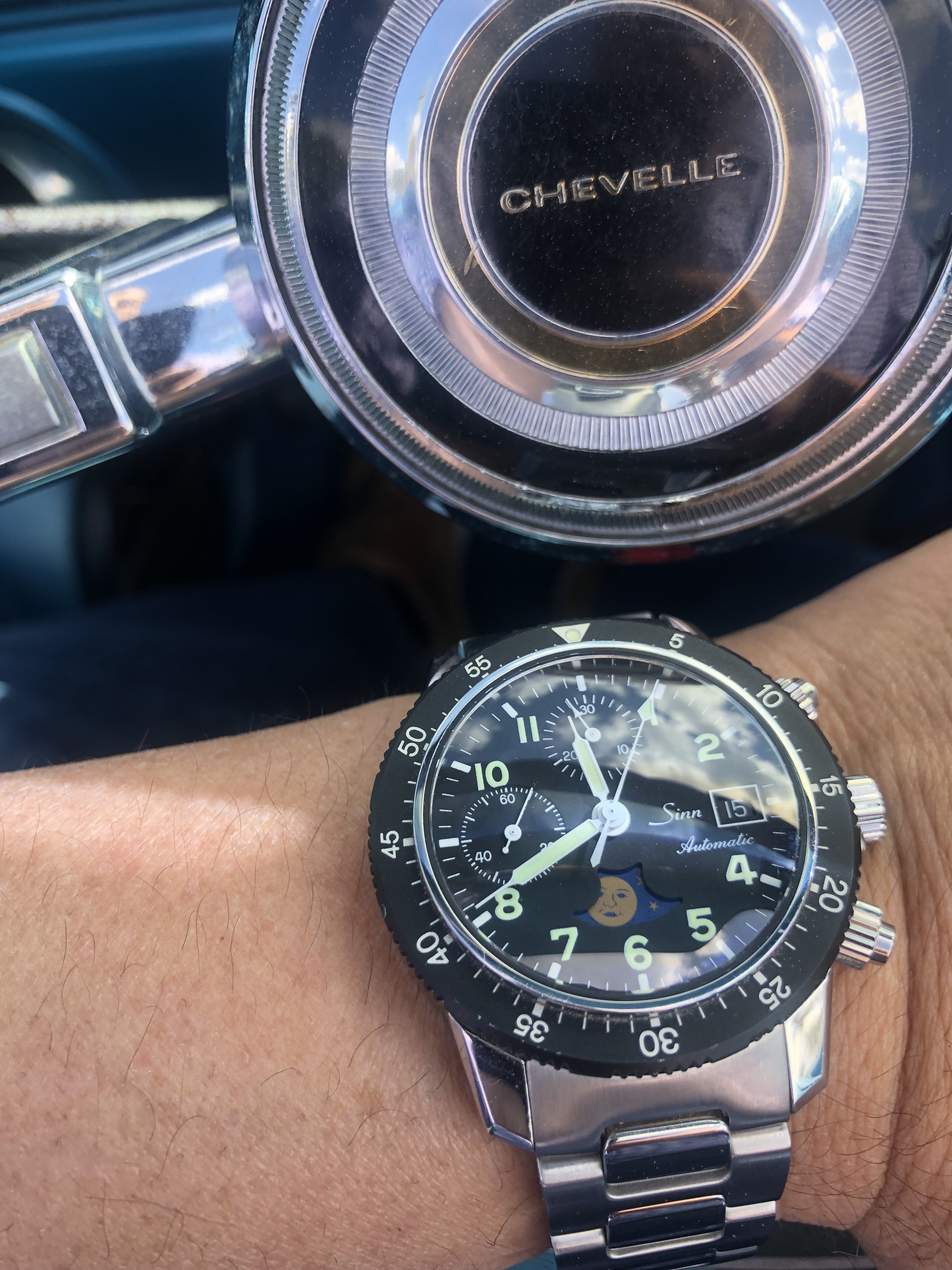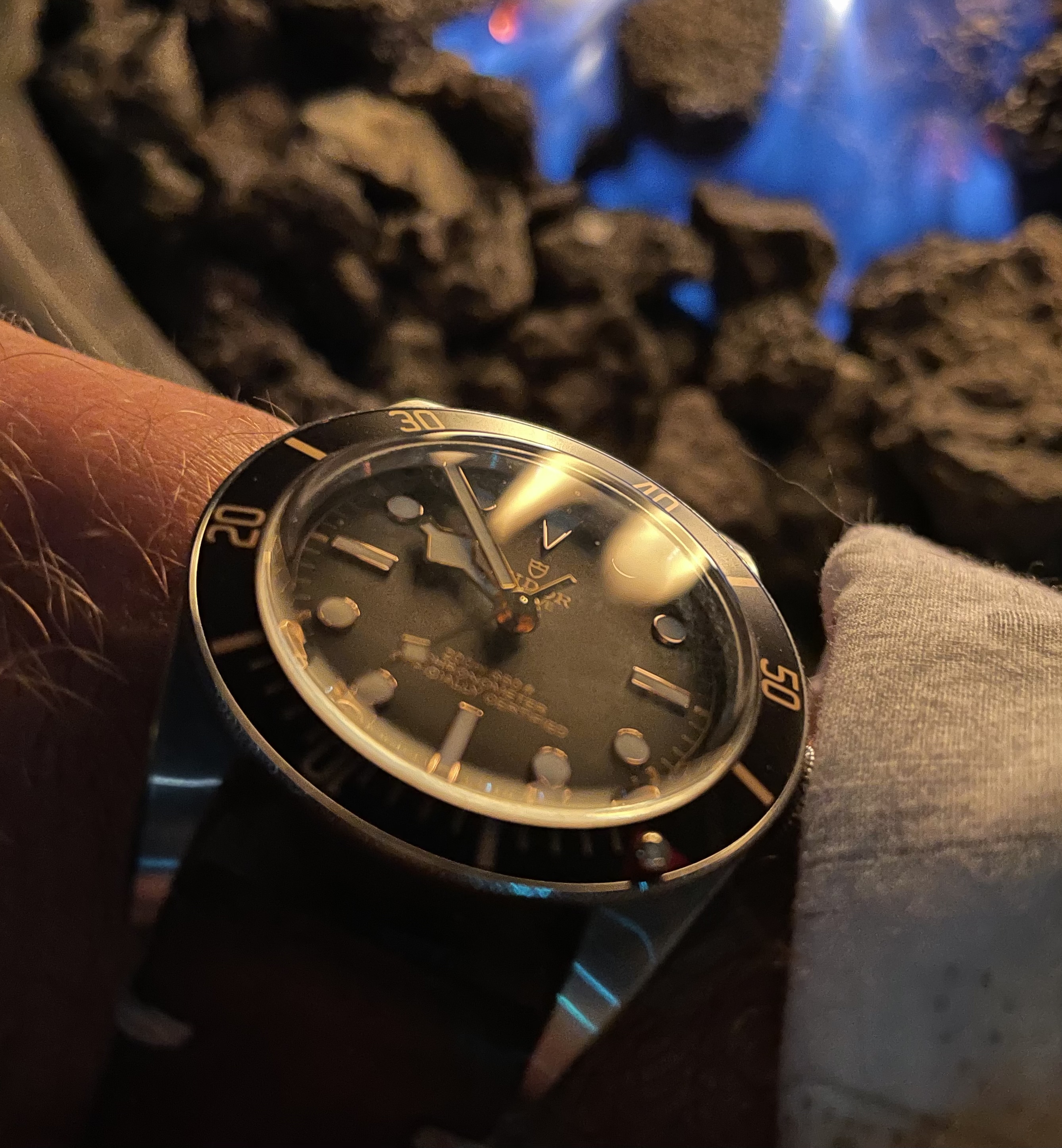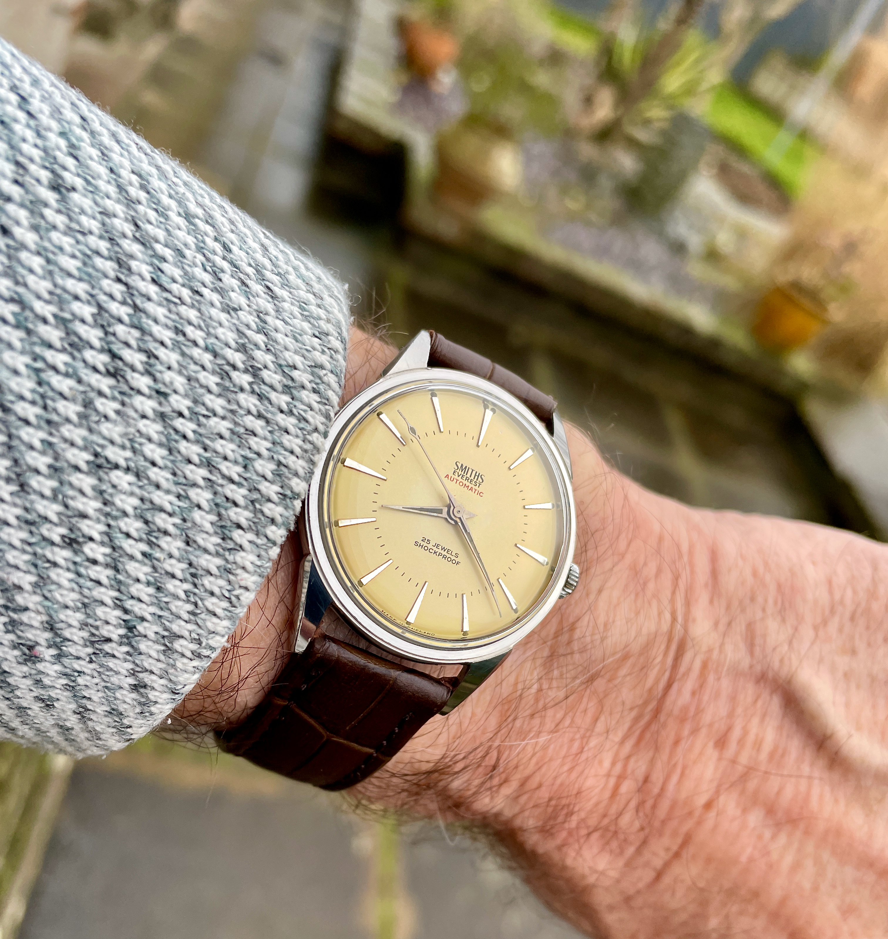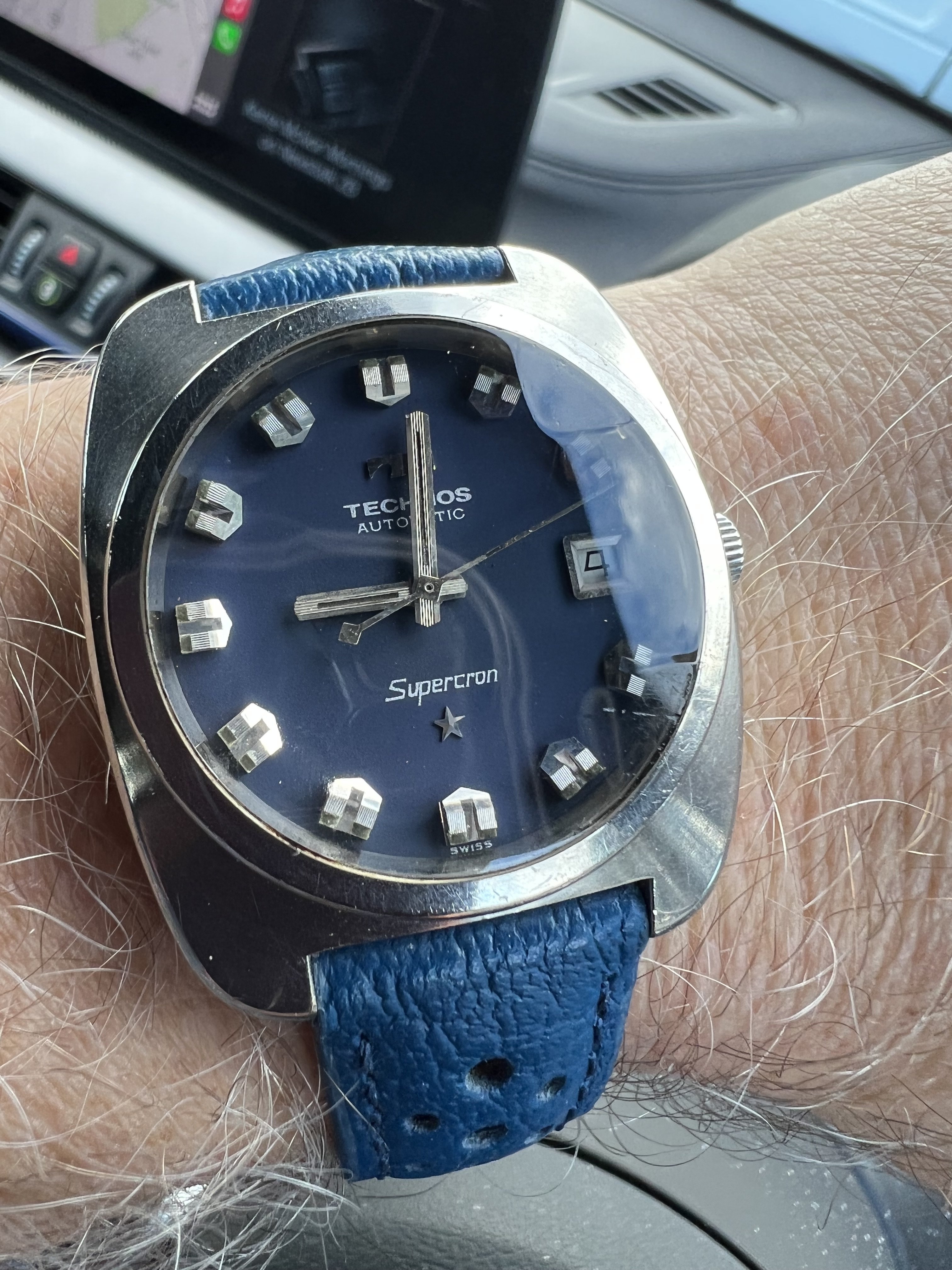 Chunky hour markers with fine lines (repeated on the hands), an applied star, and a faceted crystal (hinted at by the reflections). A lot of detail for a cheap'n'cheerful!
