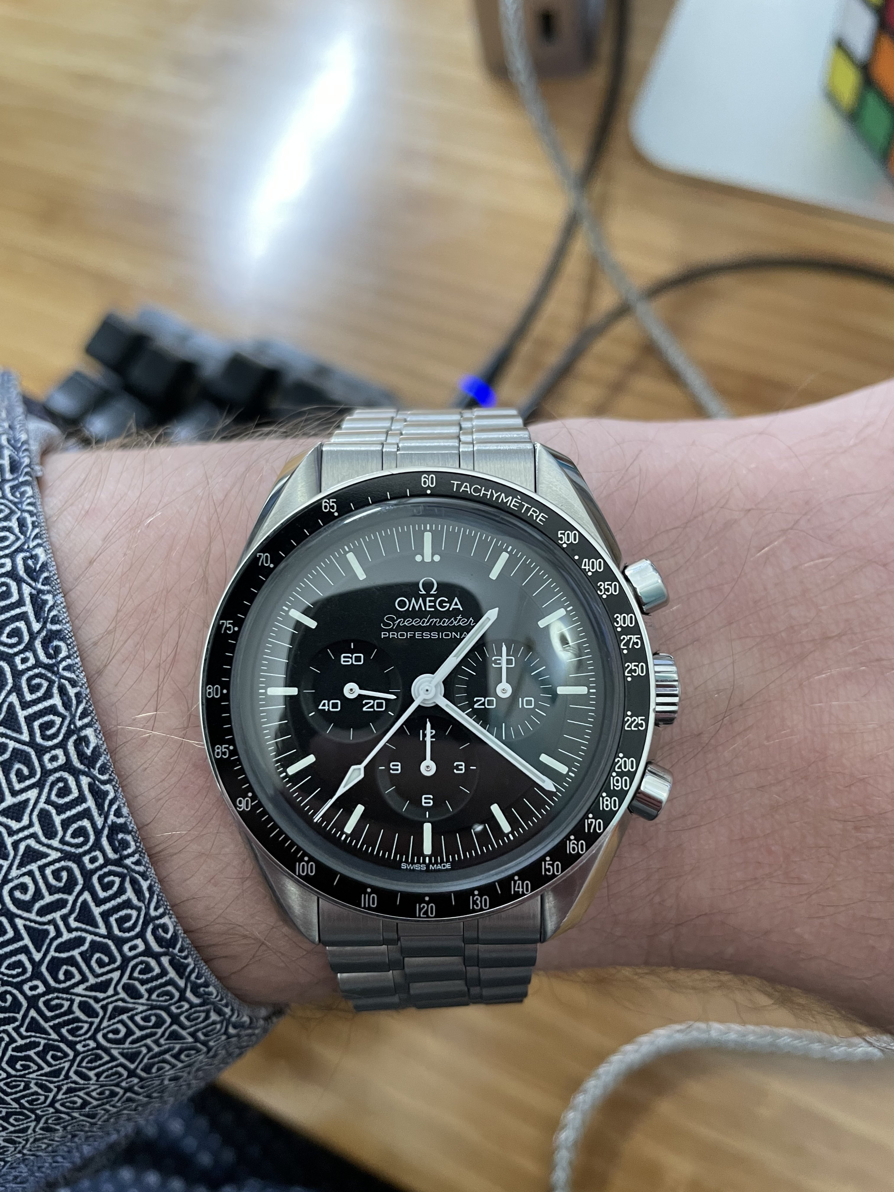 I always have trouble avoiding reflections and glare so I rarely post photos. Anyway, I have been going back and forth between the OEM bracelet and a leather strap a lot. I think I’ve settled on keeping it on the bracelet exclusively. I really enjoy wearing the bracelet and it’s my favorite looking bracelet on a modern Speedmaster Pro.