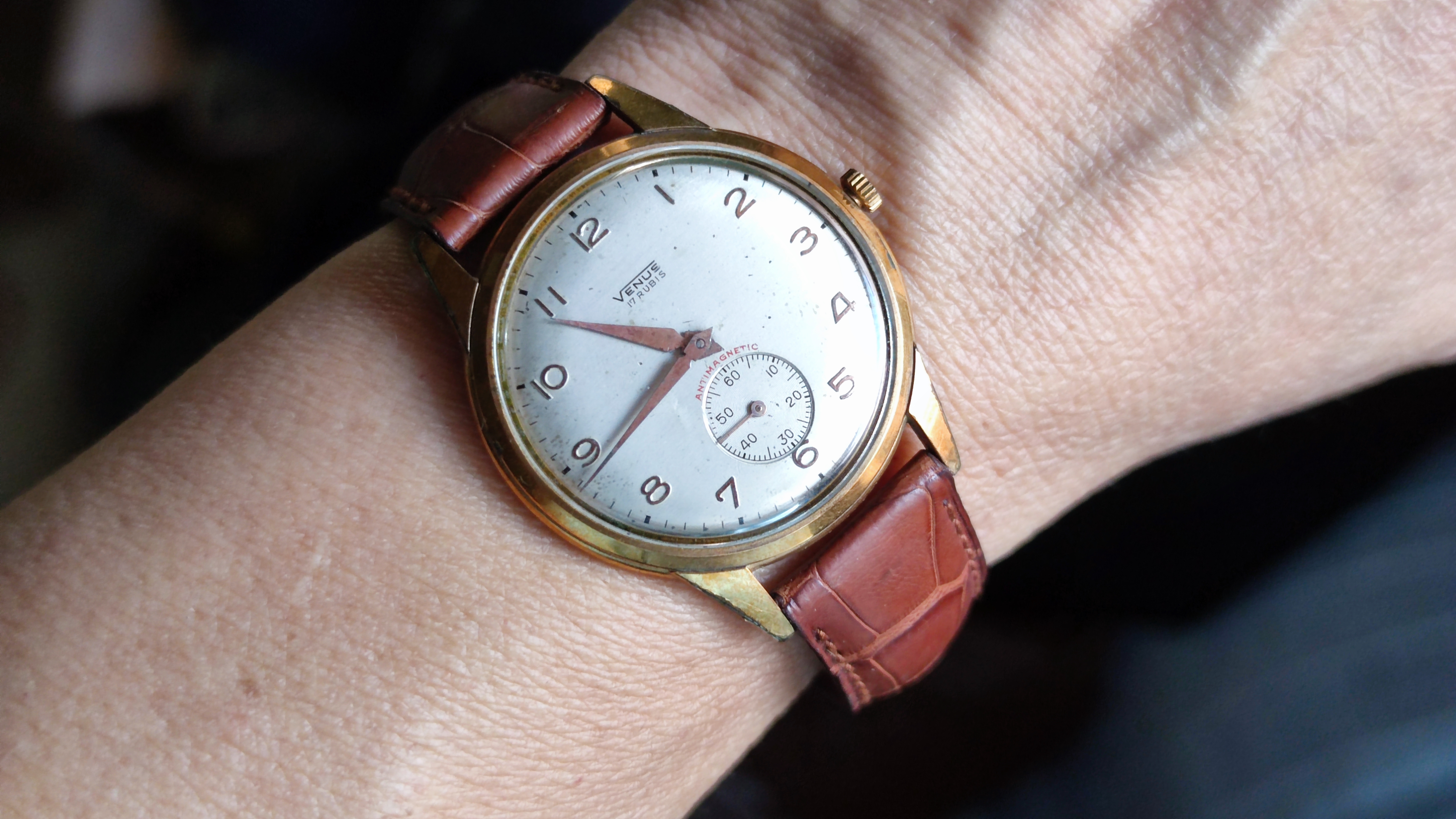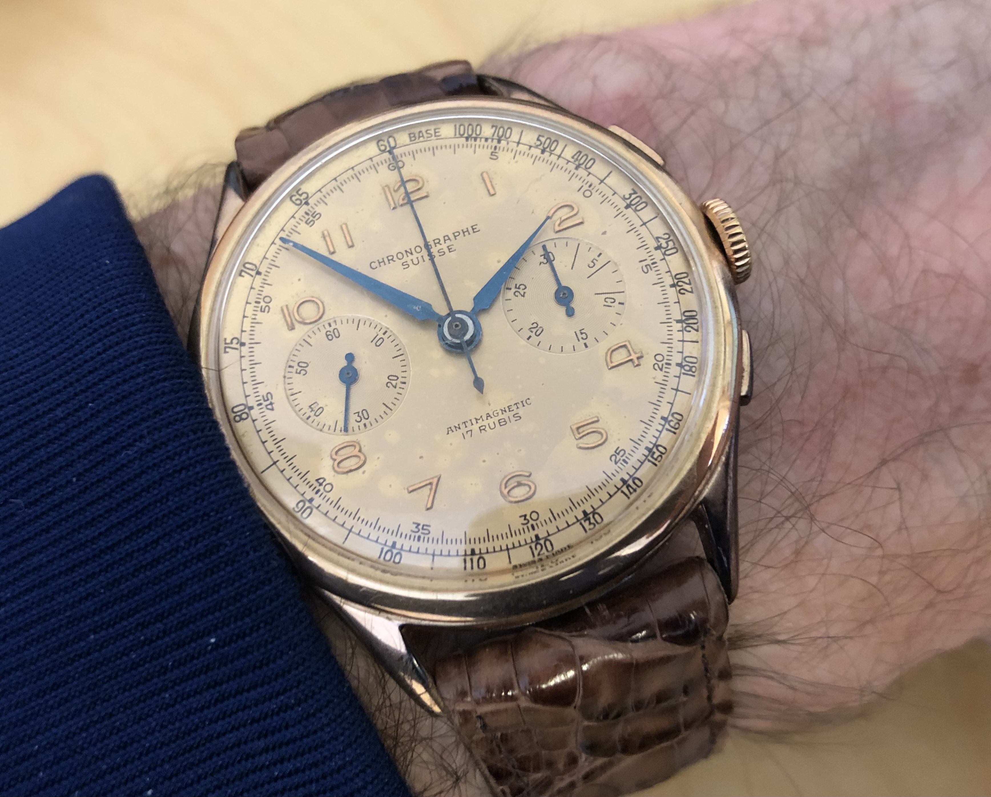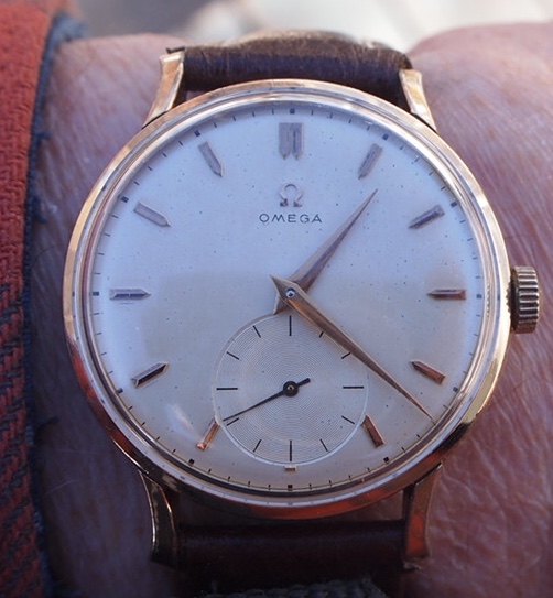 This rose gold filled Omega jumbo hasn’t seen the light of day for a long time. Calibre 265, manual wind, I’m the second owner. The serial number dates it circa 1954. This watch was the previous owner’s lucky watch. He survived a helicopter crash in the 1970s, with this watch on his wrist! New Buffalo hide padded strap. I have a low profile lentille crystal on order for it.