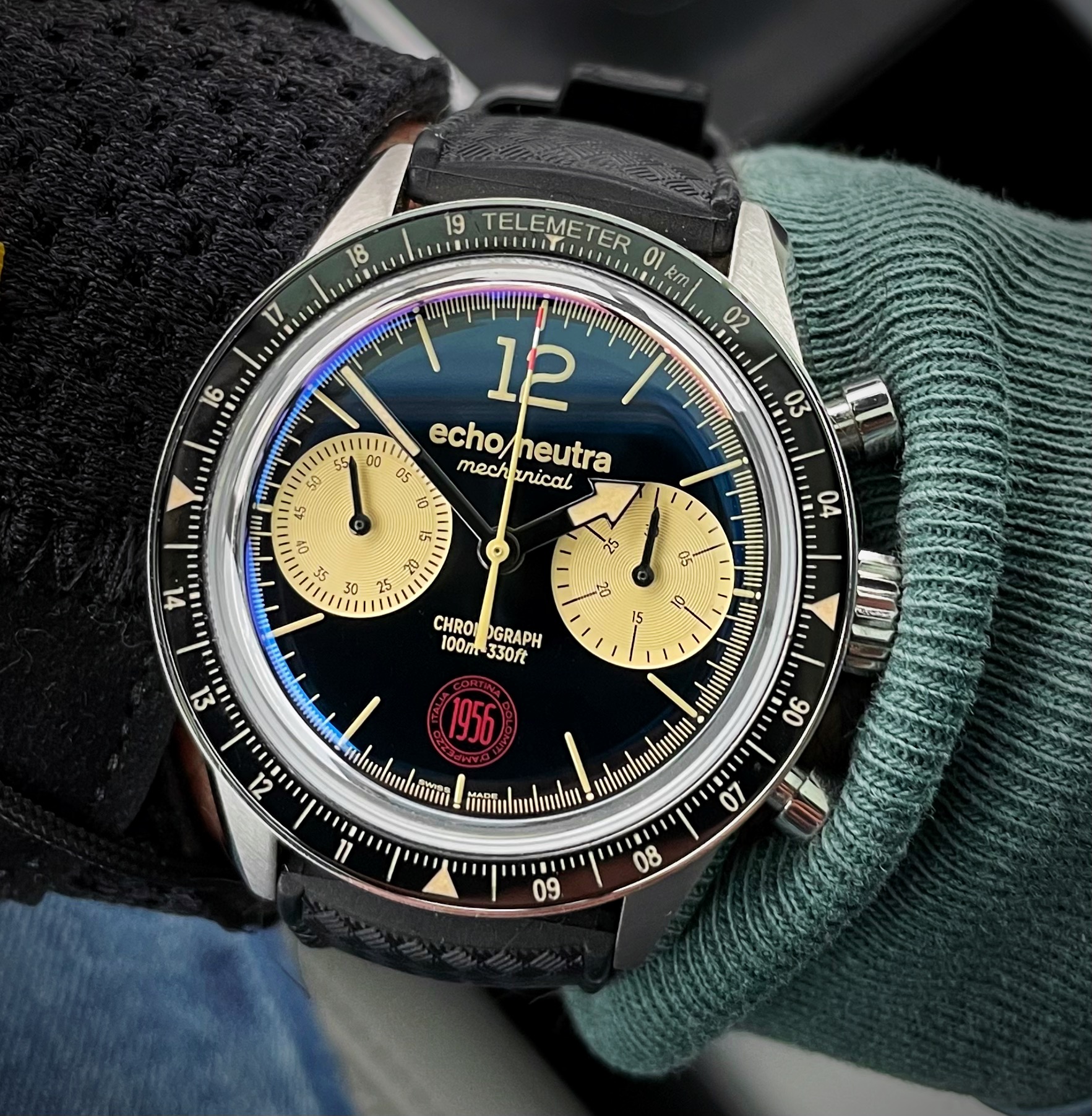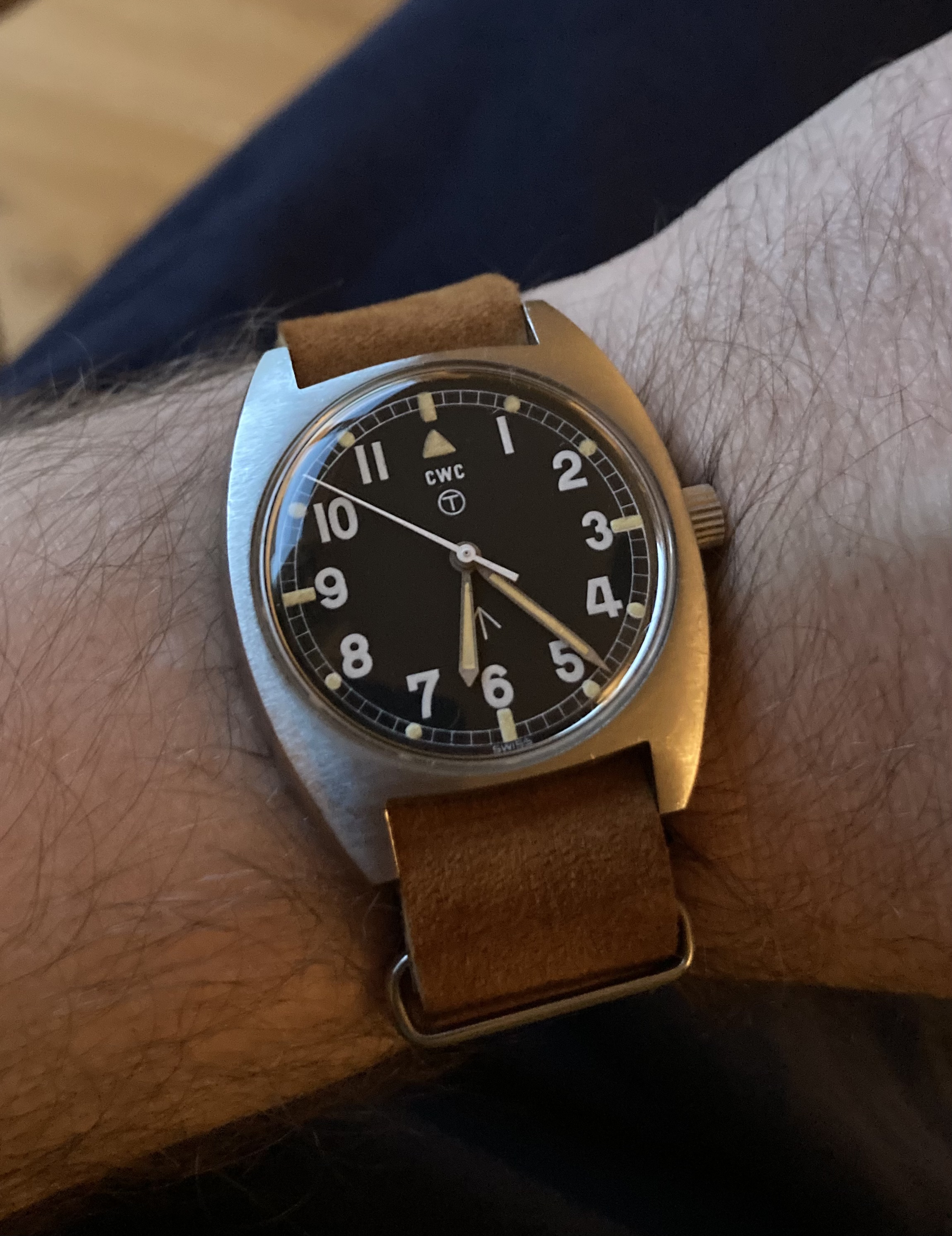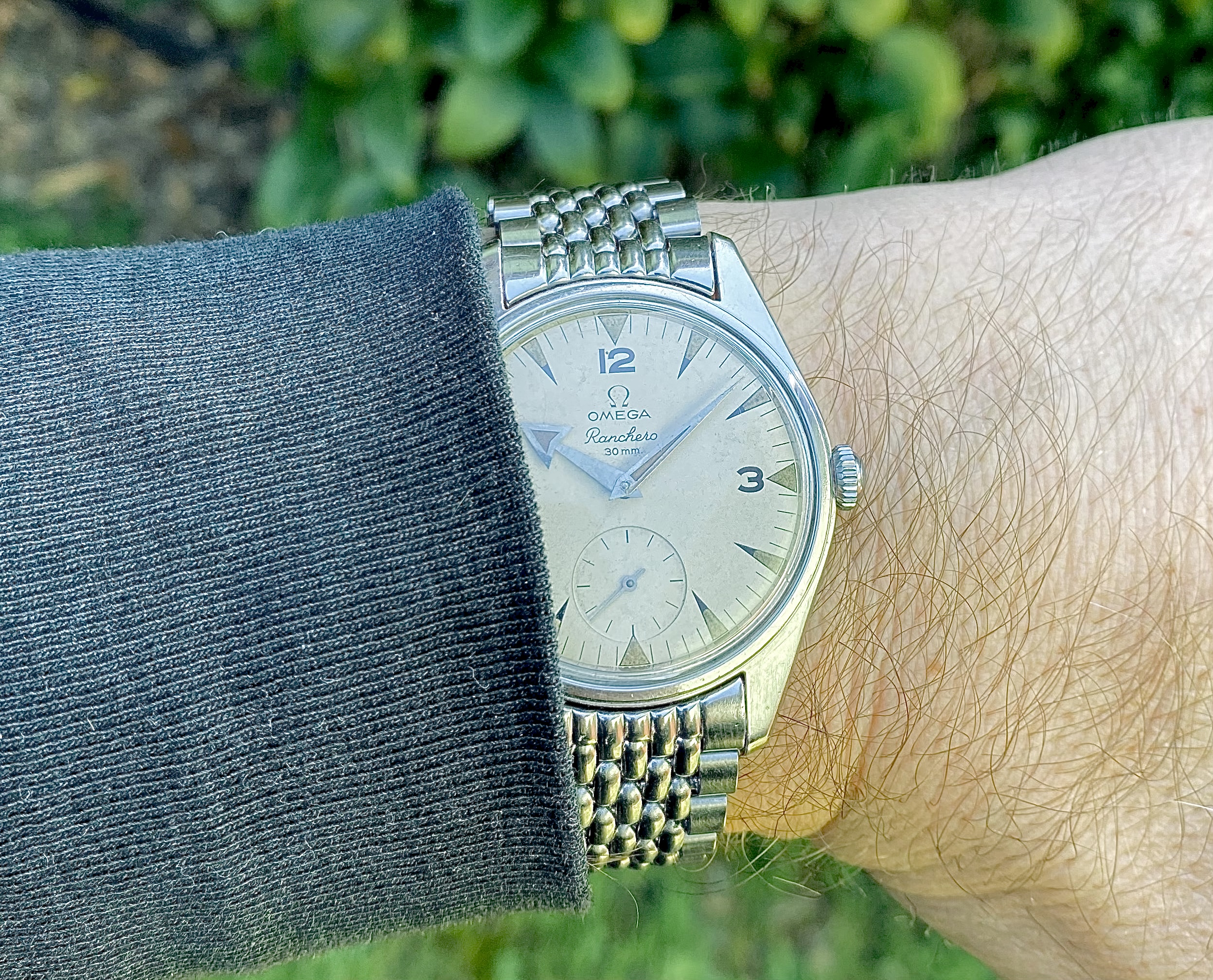 This rose gold filled Omega jumbo hasn’t seen the light of day for a long time. Calibre 265, manual wind, I’m the second owner. The serial number dates it circa 1954. This watch was the previous owner’s lucky watch. He survived a helicopter crash in the 1970s, with this watch on his wrist! New Buffalo hide padded strap. I have a low profile lentille crystal on order for it.