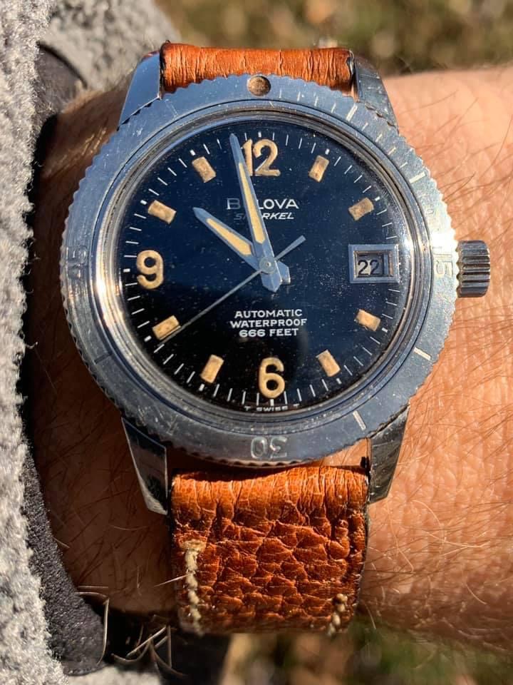 Posts 58 Likes 806 Grinderman ·Mar 30, 2022 allwoundup The Ulysse Nardin case is 37mm, and a bit beefier overall. Here it is next to a 35mm 1968 Snorkel. The bezels are very similar. Nice Bulova