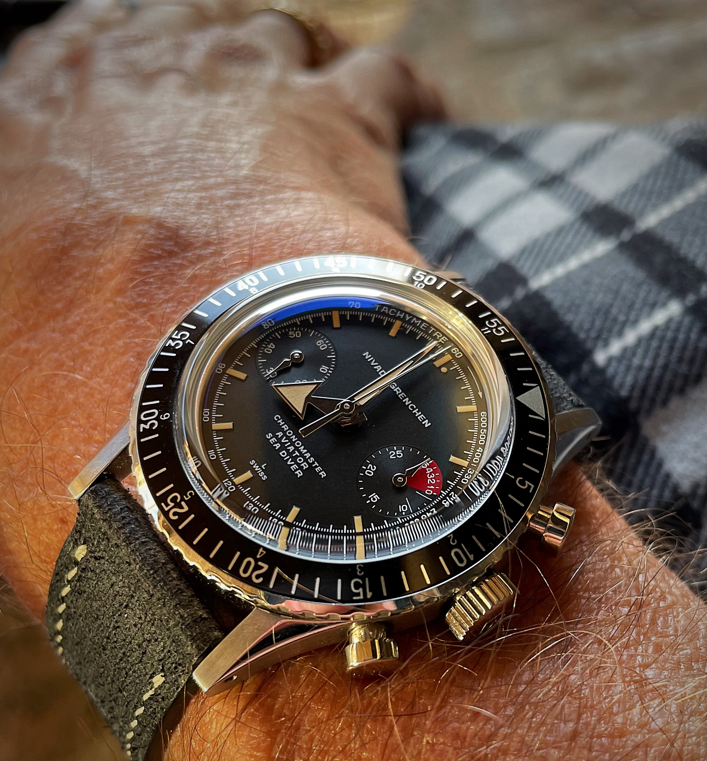 Posts 1,396 Likes 14,935 donkii ·Apr 2, 2022 bristnj 1962 AuqaLung Ref. 1573-666 powered by an A. Schild signed Felsa 4004 movement. I'd like one of those! It's something with the indexes and the crown on the bezel that gets me going. This one looks really sharp as well!