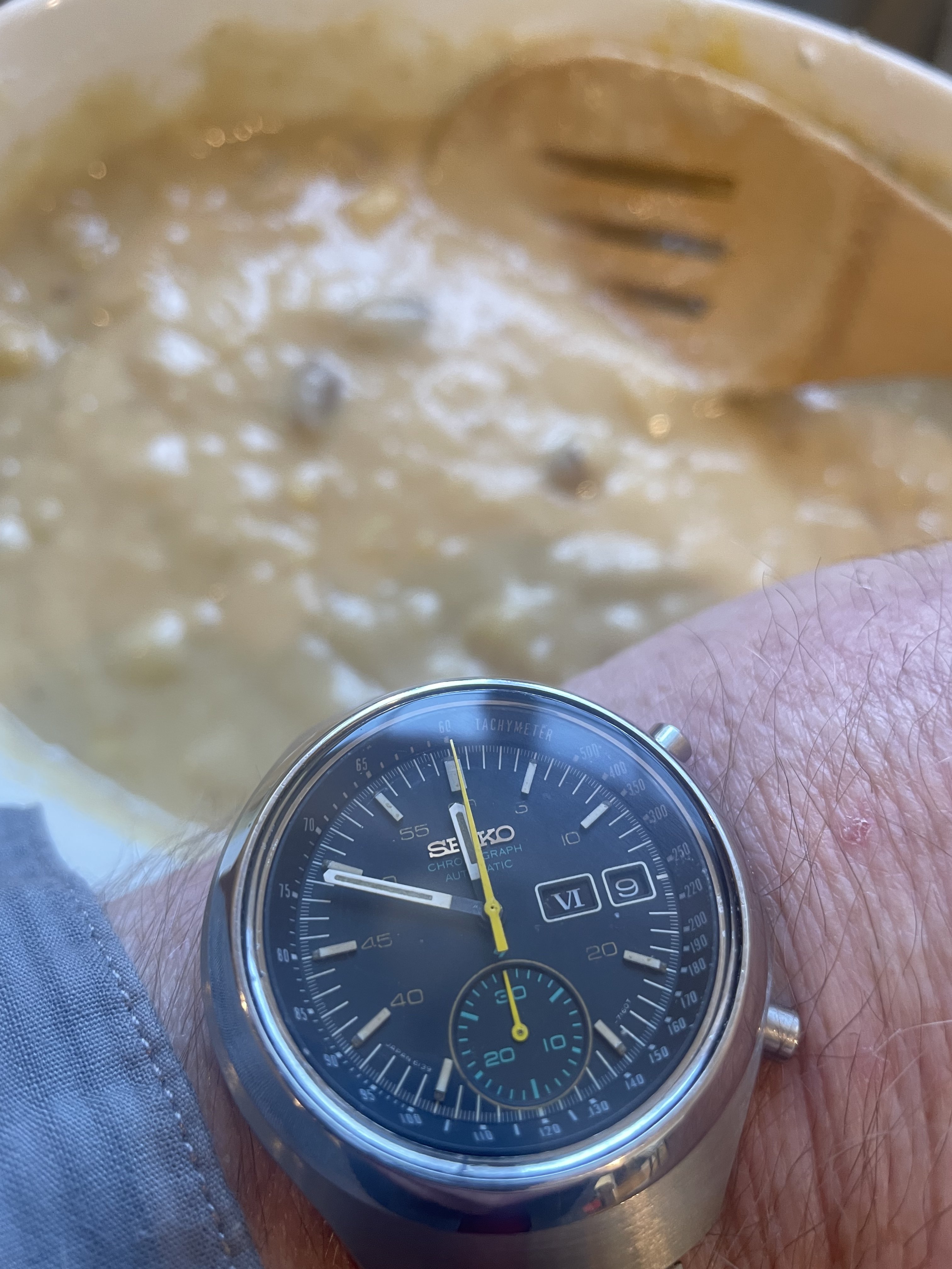 So my wife wanted banana bread, I told her I’ll make it tomorrow she gave me the killer line “it’s ok I’ll make it.” I wish not my wife’s banana bread on any humanity so here i am concocting it. I did allow her to mix it as I got my hurly durly seiko to time said breads stint in the oven.