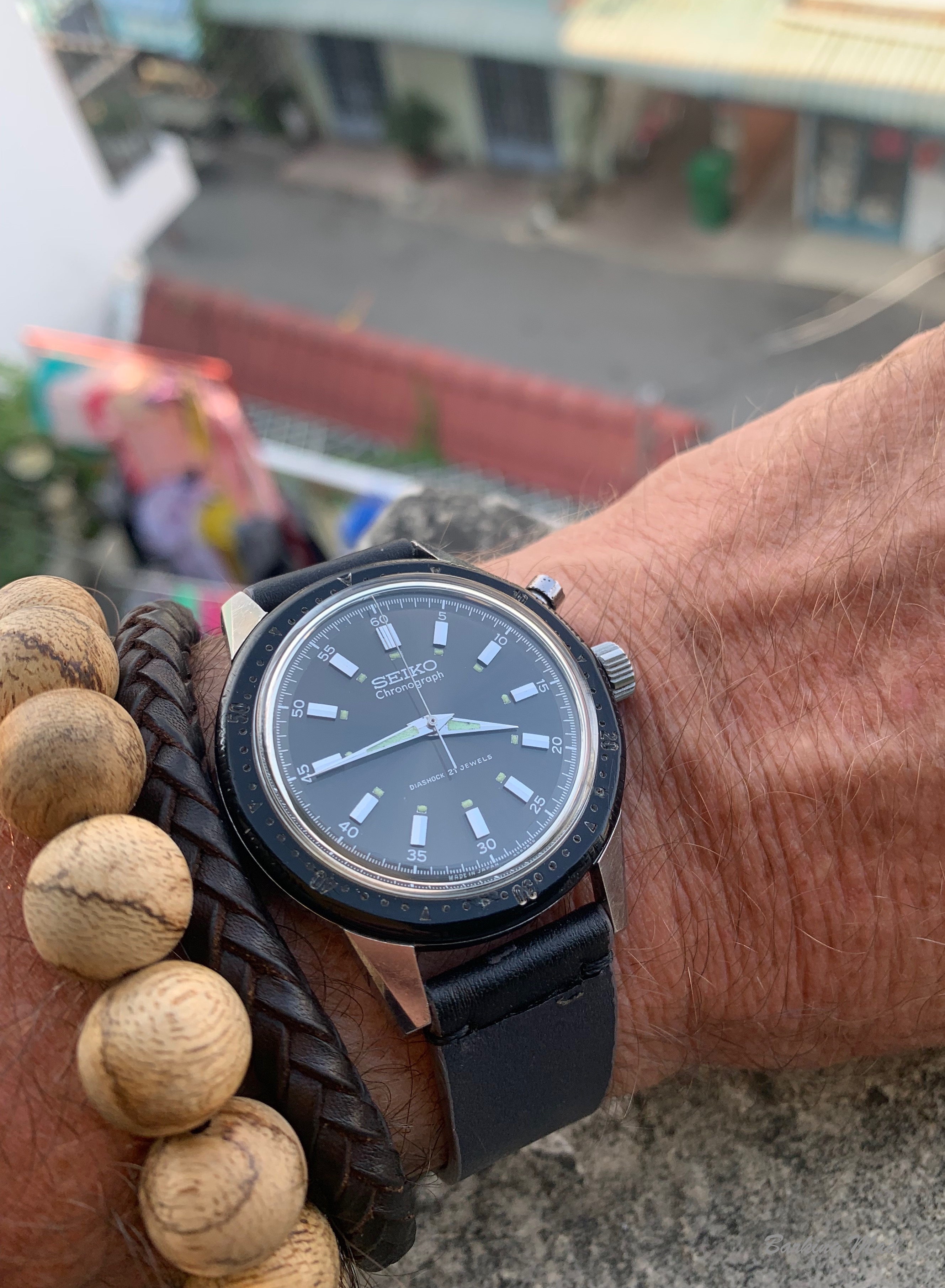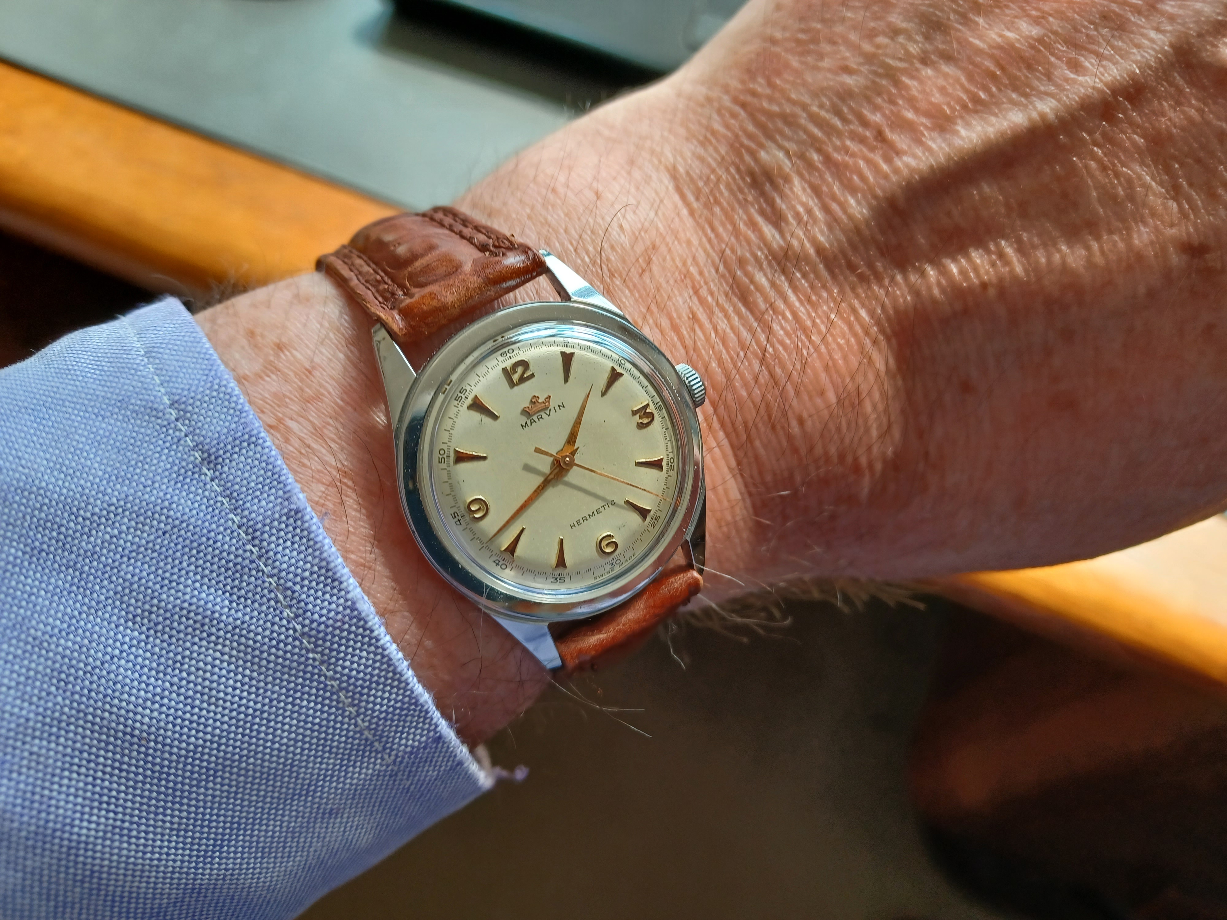 Marvelous Marvin - the sharp lugs, the broad bezel, the fine printing, the copper-tone dial furniture (wish I'd had more sunlight). If it had the "other" crown on the front, folks would be drooling. All of the pleasure, none of the anxiety - bring on Sunday!