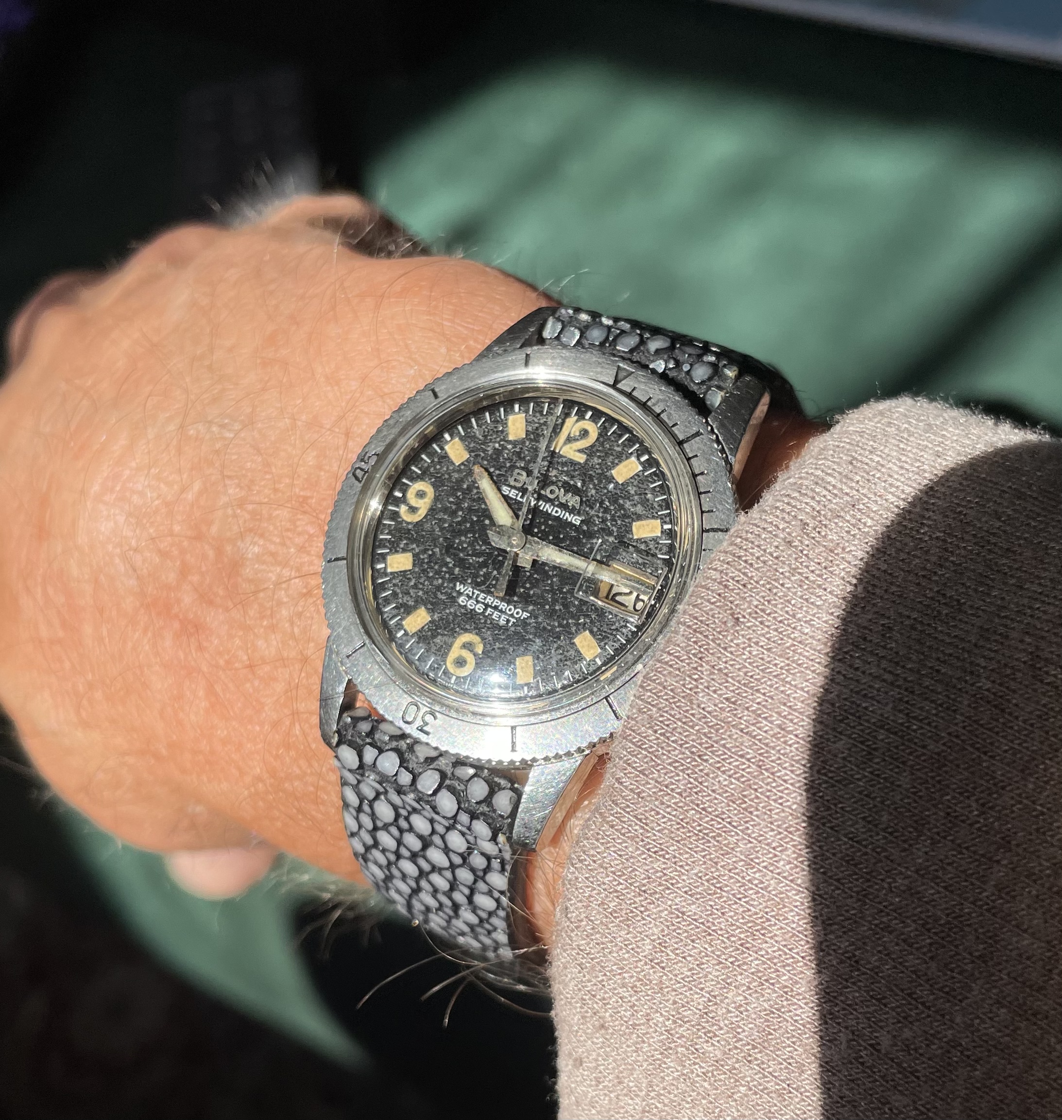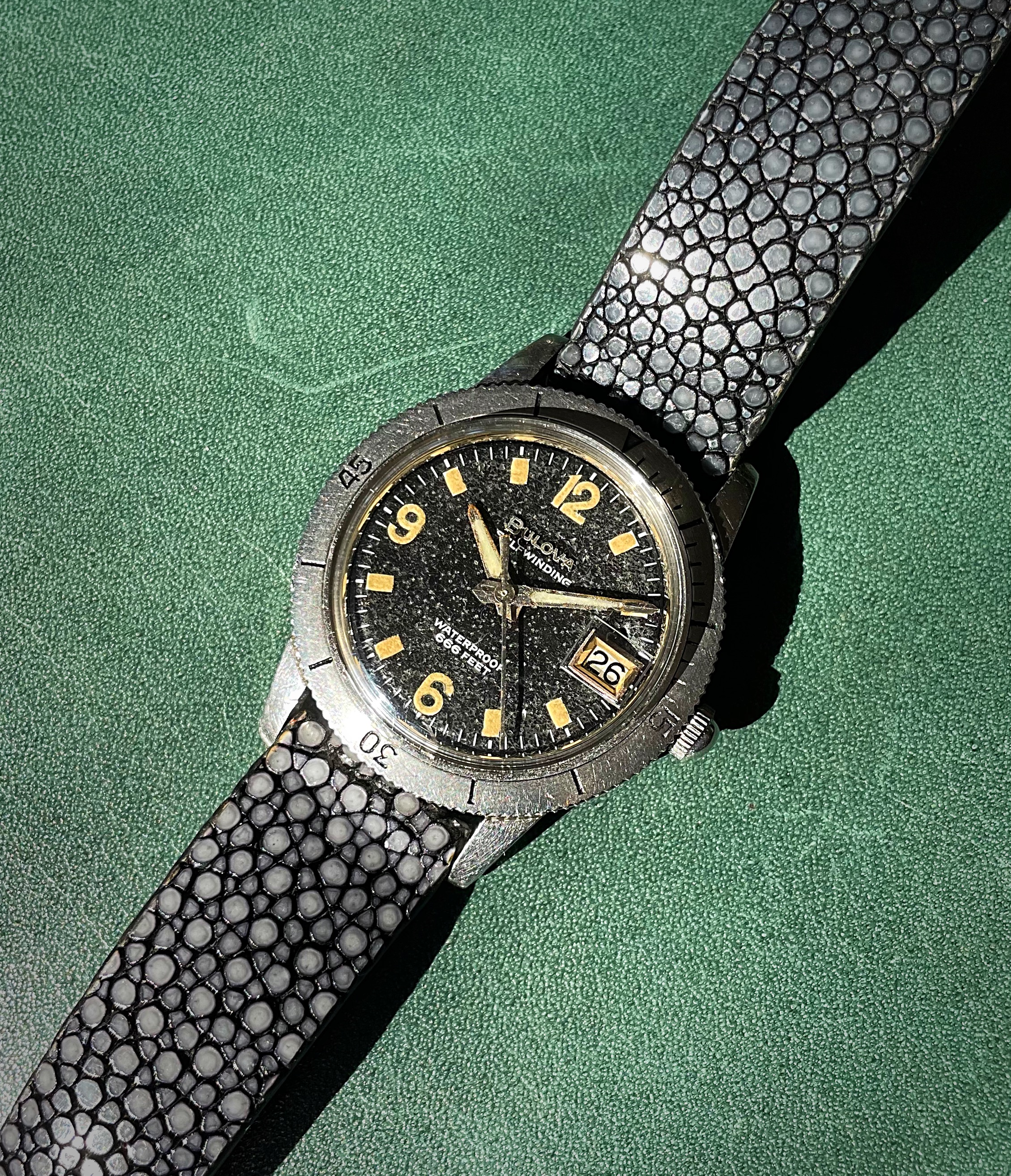 Posts 6,514 Likes 50,381 noelekal ·Apr 26, 2022·Home For Wayward Watches dougiedude Stingray on the 666 Why that's as cute as a speckled pup! The stingray strap goes perfectly with that aged dial and the result is splendid. "Speed" reading on an unseasonably cool April morning in Texas.