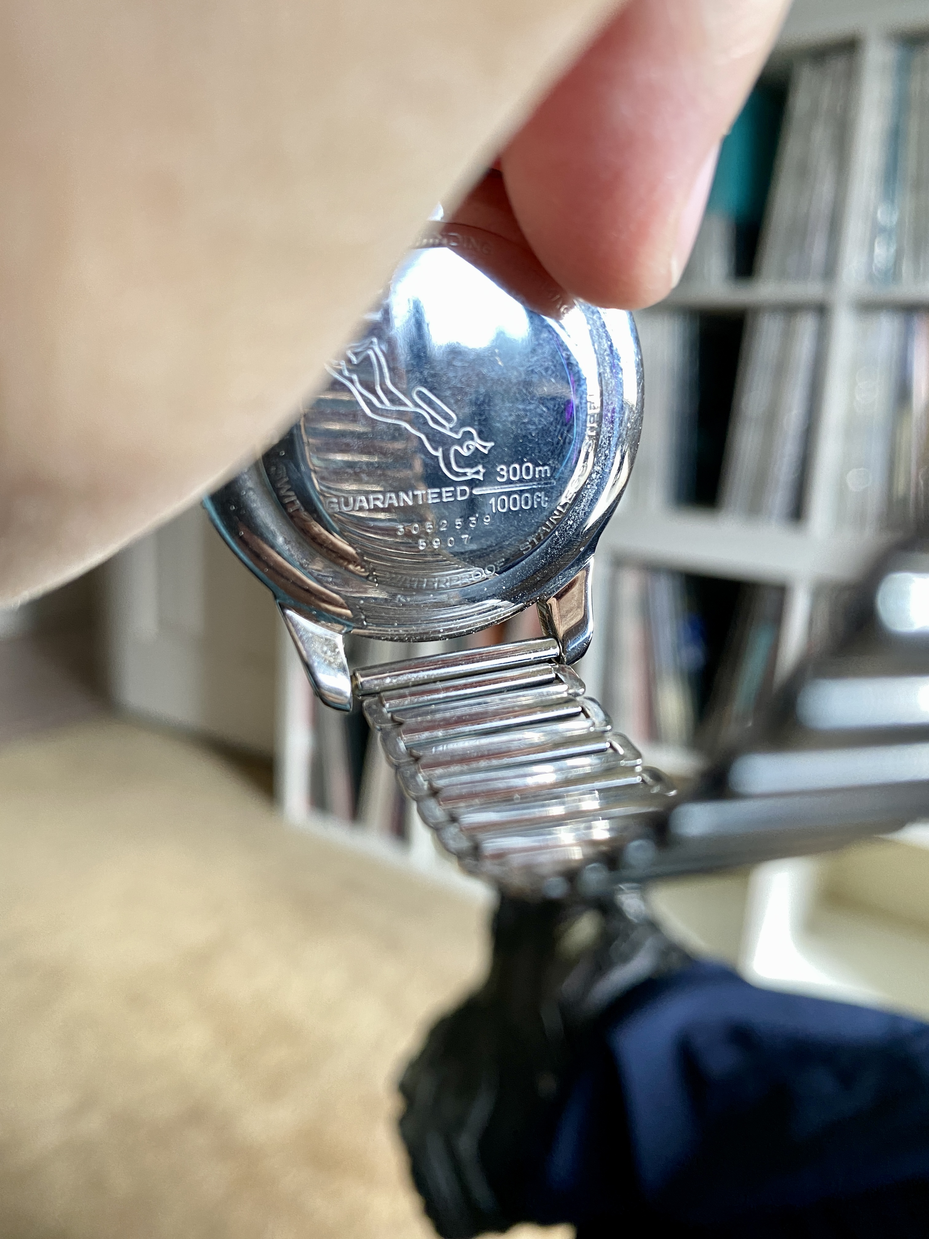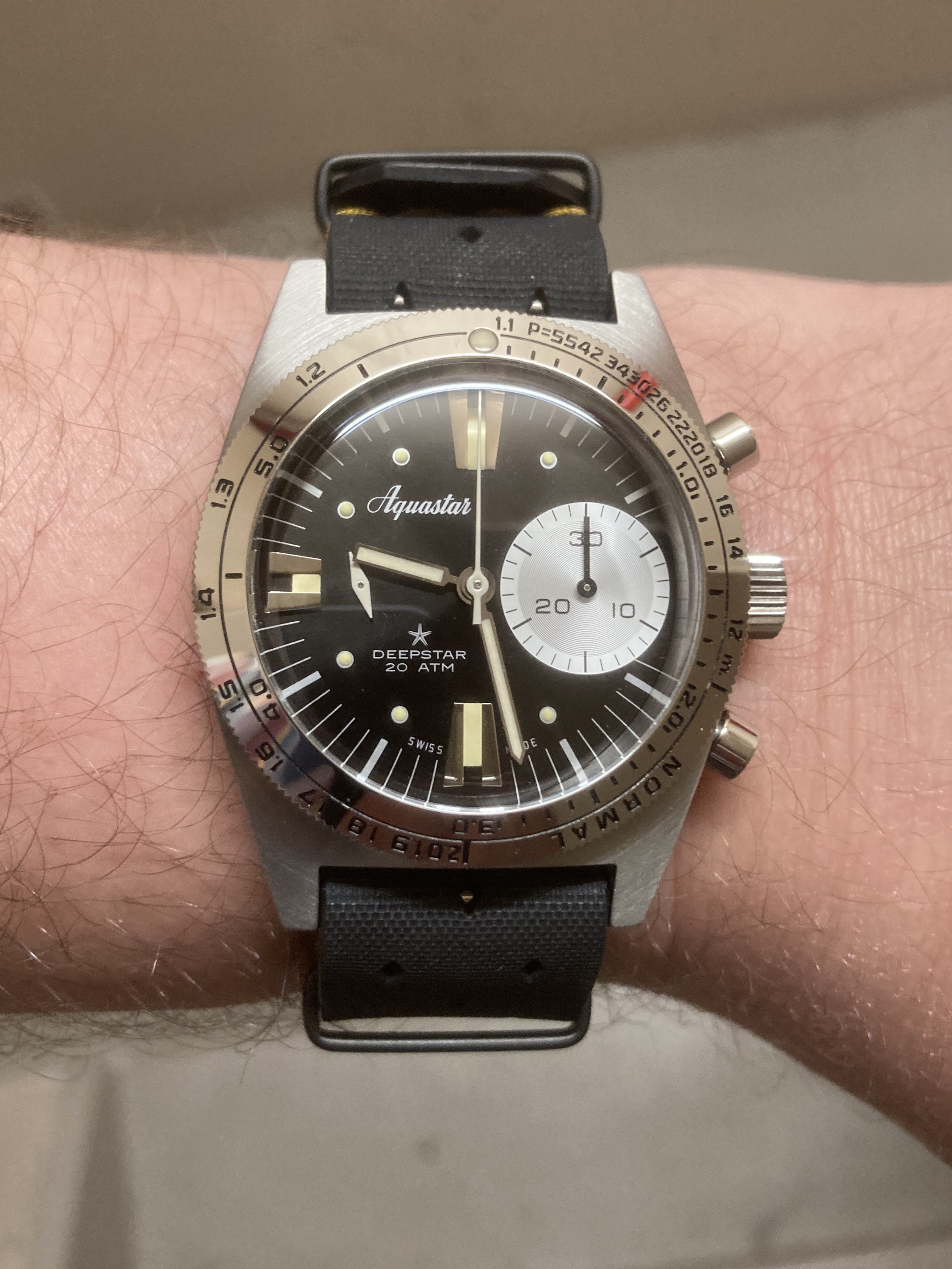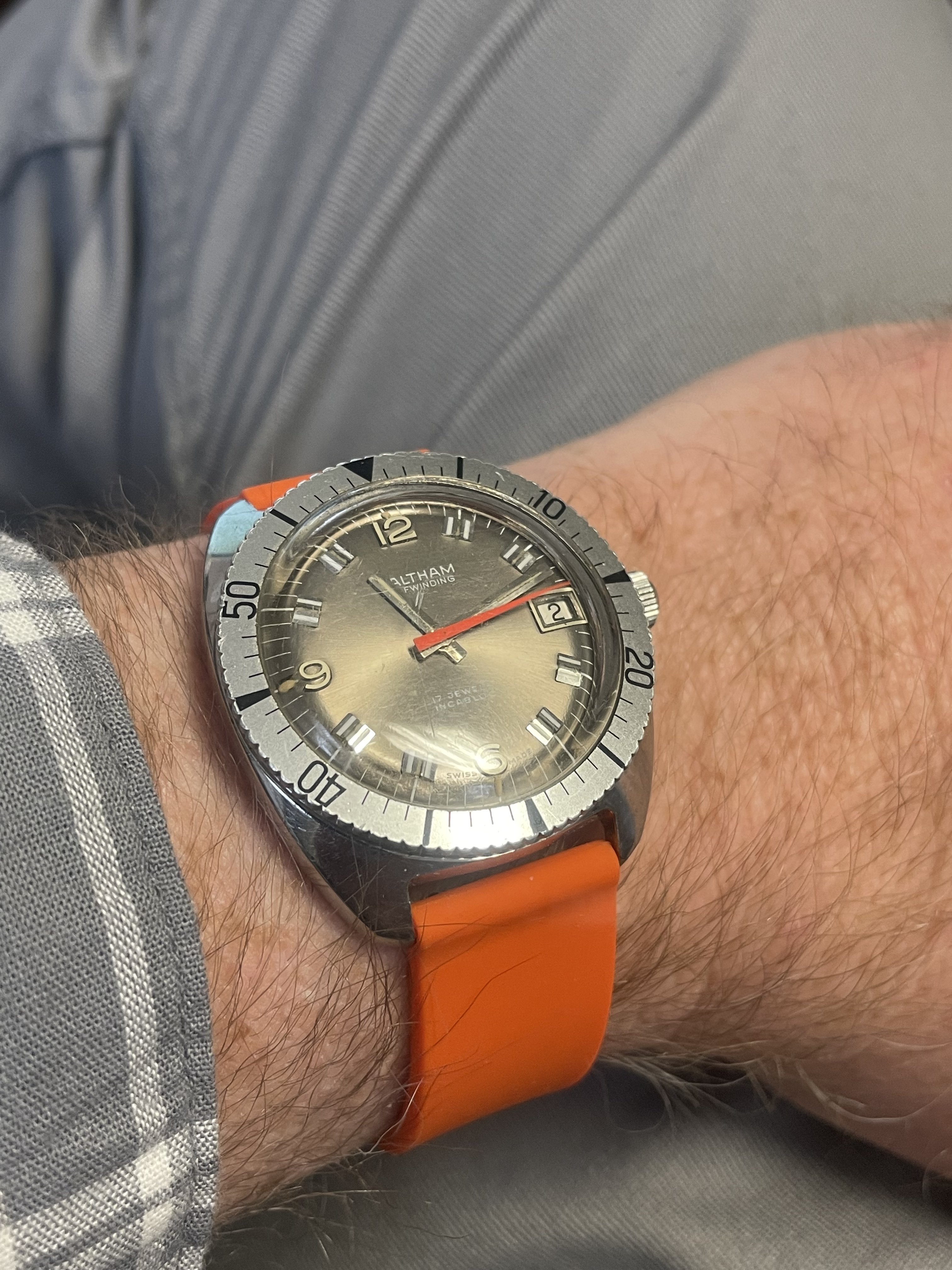 I am trying to get this fashion thing. Grey pants, grey shirt, even sneakers grey so I wanted a grey dial watch. Once again the fluorescent band makes me wonder if I bombed the fashion test but considering I top everything off with a Grateful Dead dancing bear it’s probably moot