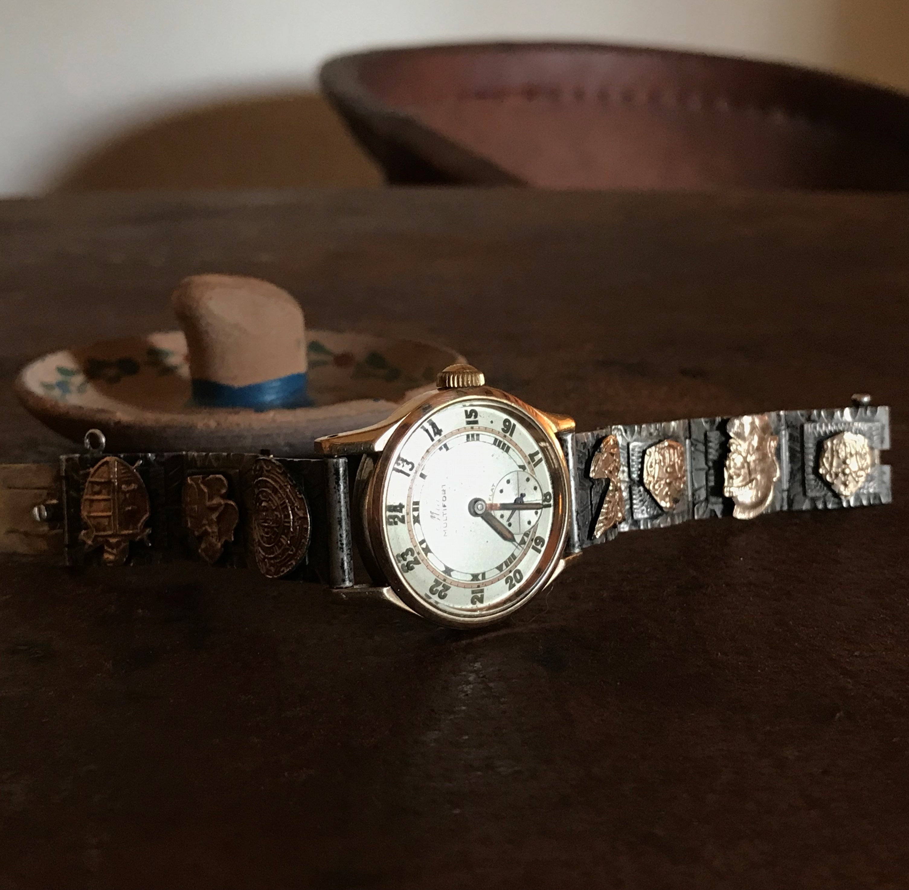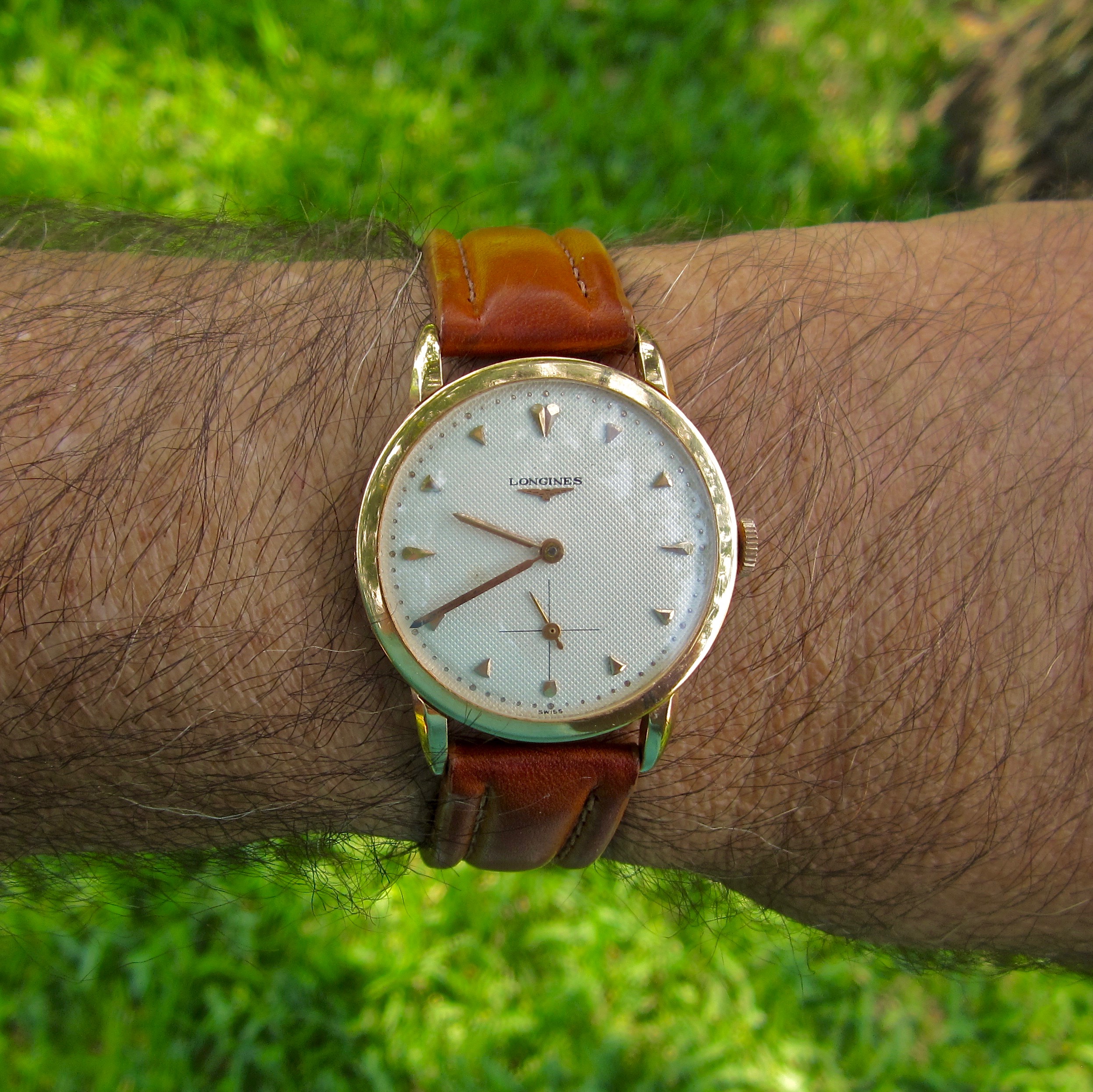 Yesterday ... and today. Late 1940s 18kt gold Longines with 27M movement. Sunday-go-to-meeting choice yesterday and the squirrel watching overhead from the back yard oak tree while I took the photo said he likes it.