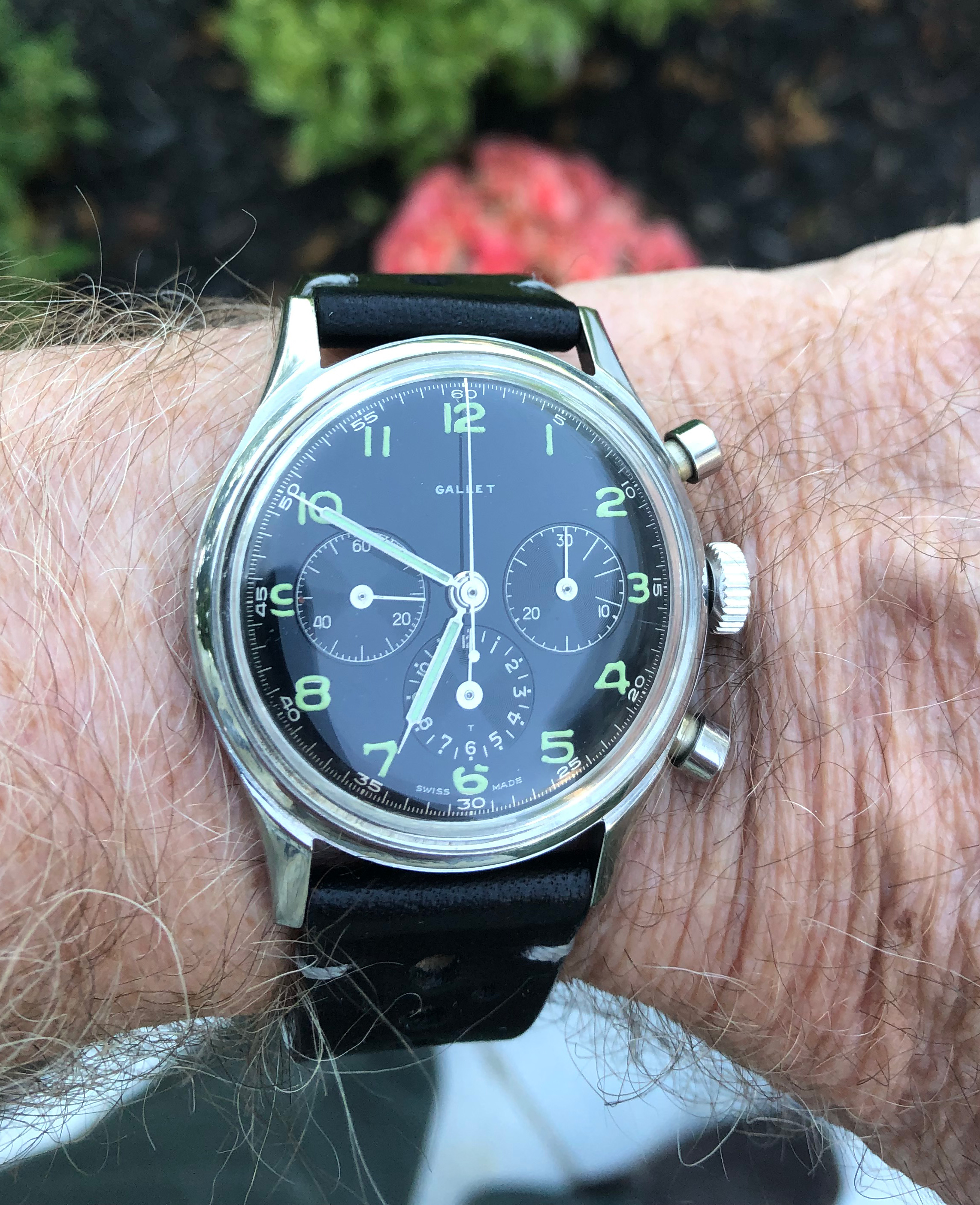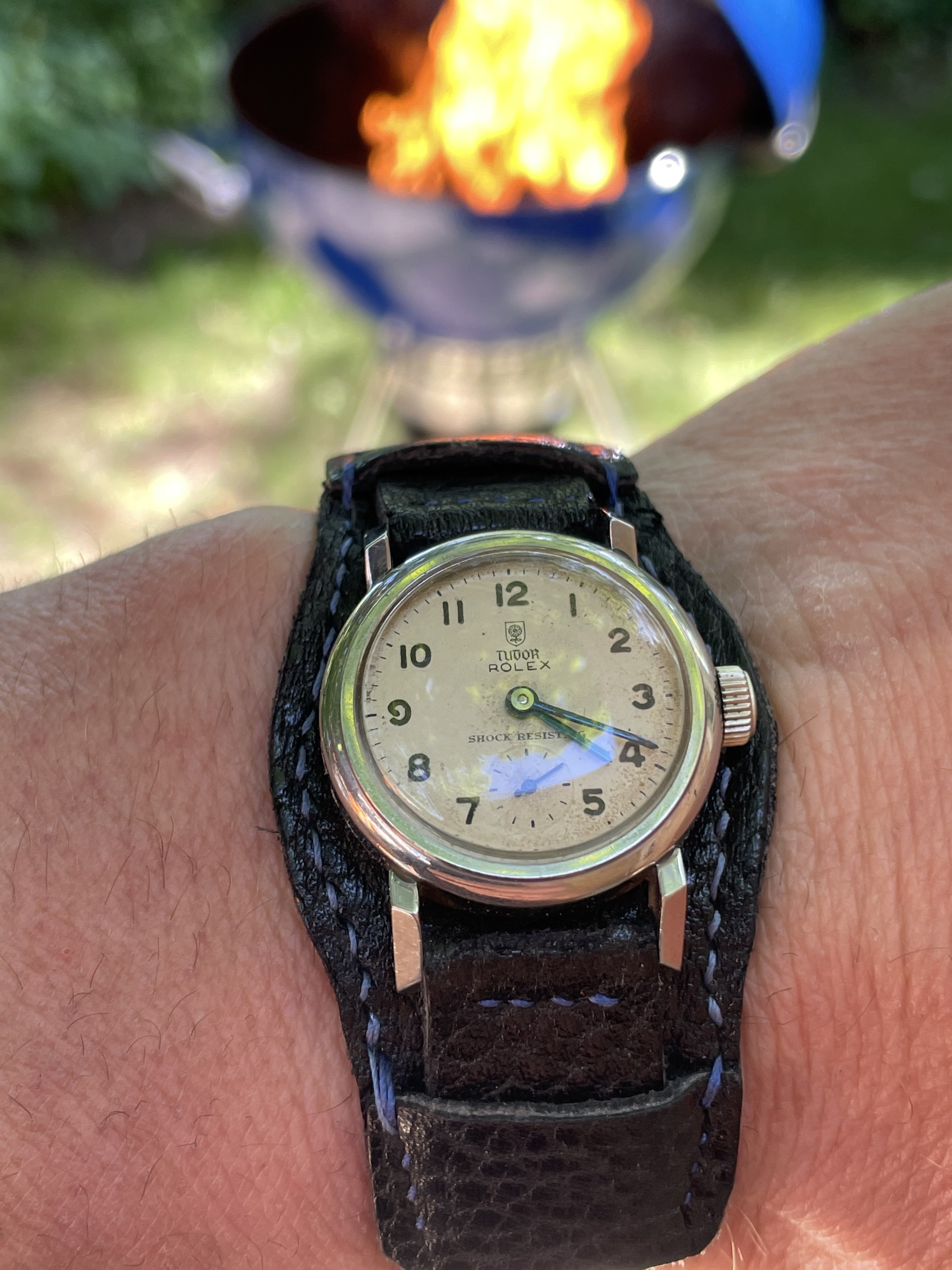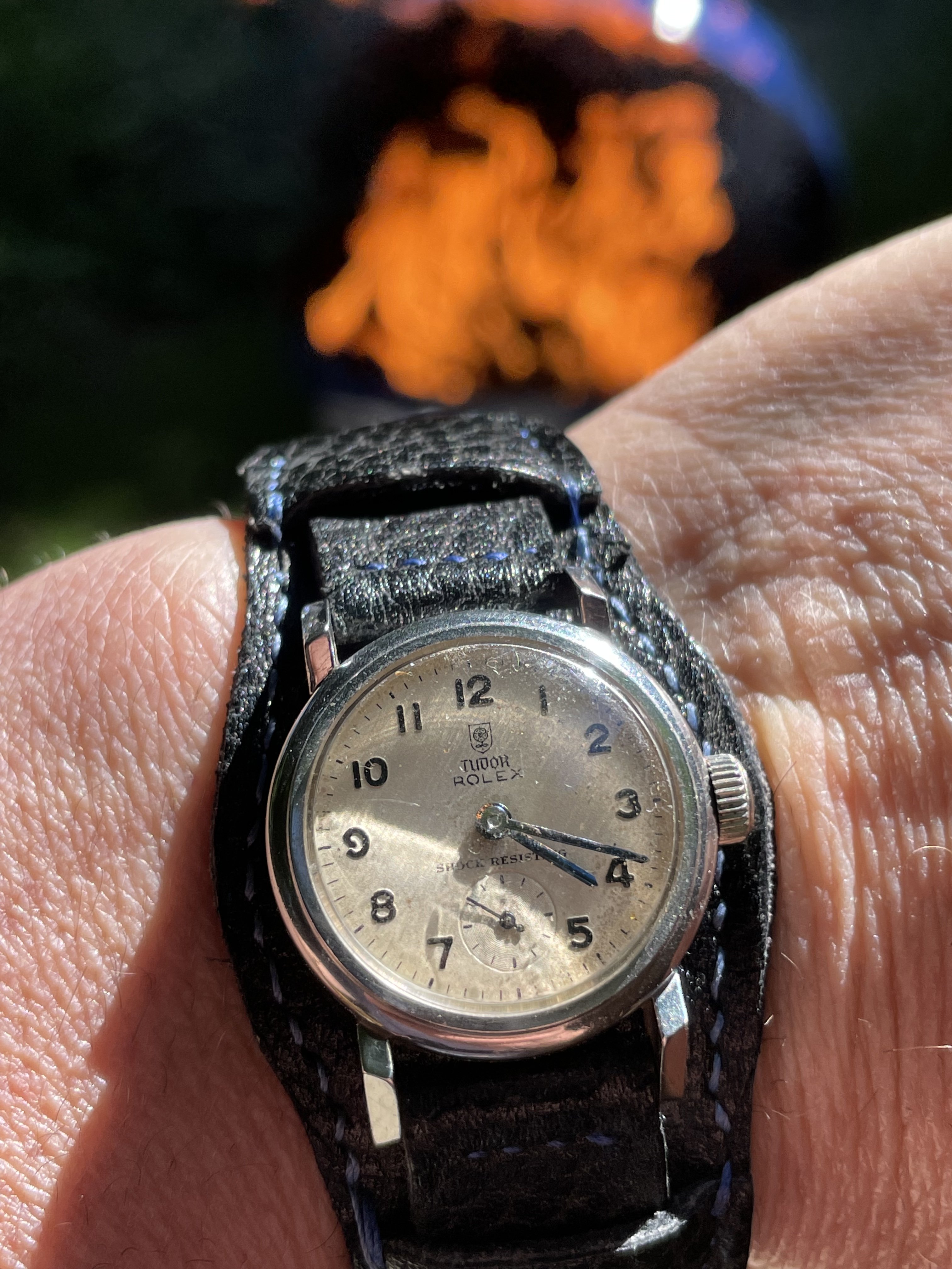 This is my 1933 Rolex Prince Observatory duo-dial “doctor’s watch”. The only one of this model that I have ever seen that is adjusted to 6-positions (9 adjustments), and having 18-jewels. Not the usual 17-jewels. I am the second owner. My late father bought this watch in Saskatoon, Saskatchewan, in 1933. He was a watchmaker. He ran his own hole-in-the-wall jewellery shop where he repaired watches. If somebody needed a watch to use when his own watch was being repaired, my father let him use THIS one! What was he thinking? Movement made for Rolex by the associated firm, Aegler. Unfortunately, it was fitted into a gold filled case. 🙁 It is a good runner, but it has taken on the fragility of age, so I don’t wear it very often.