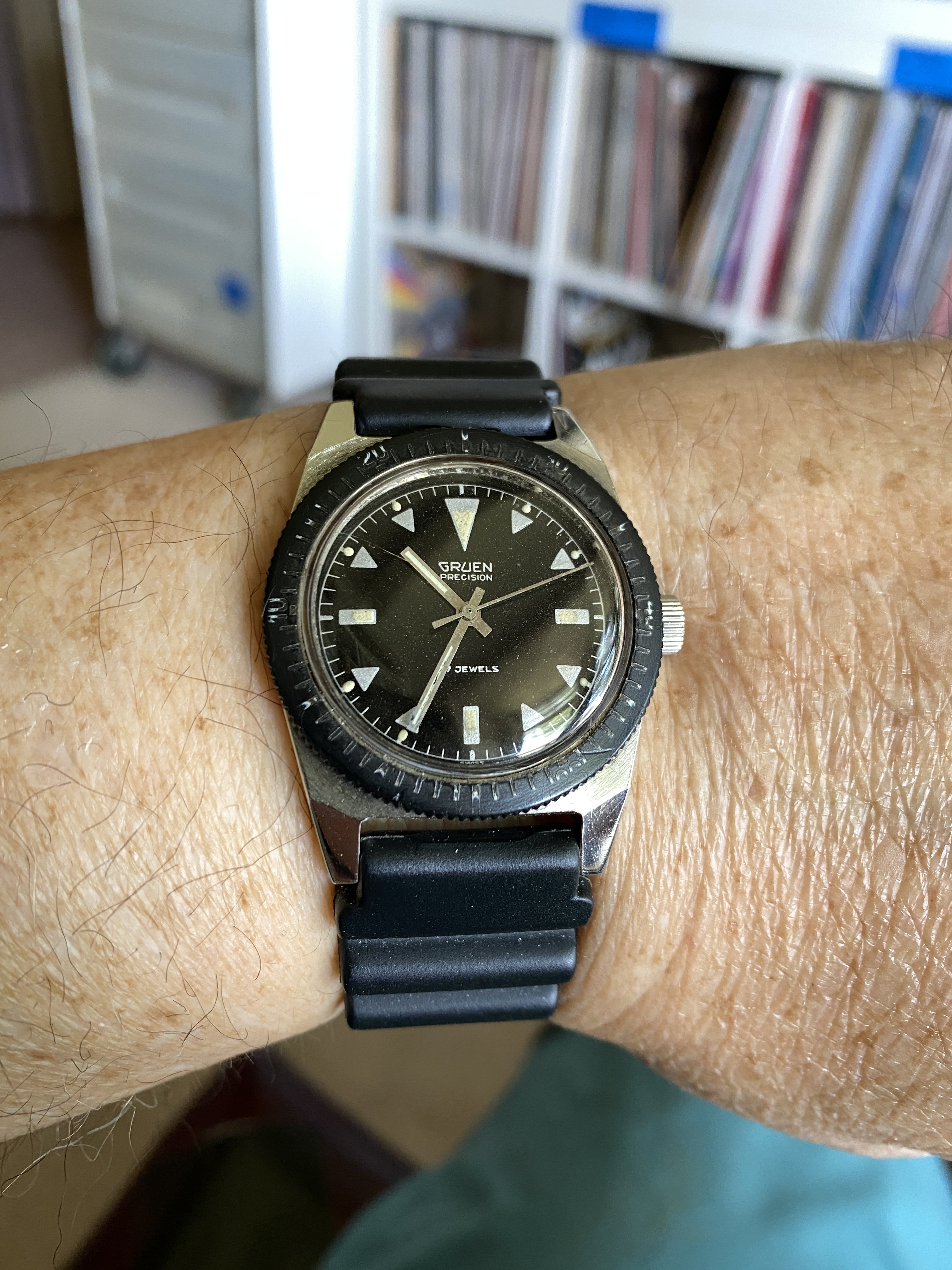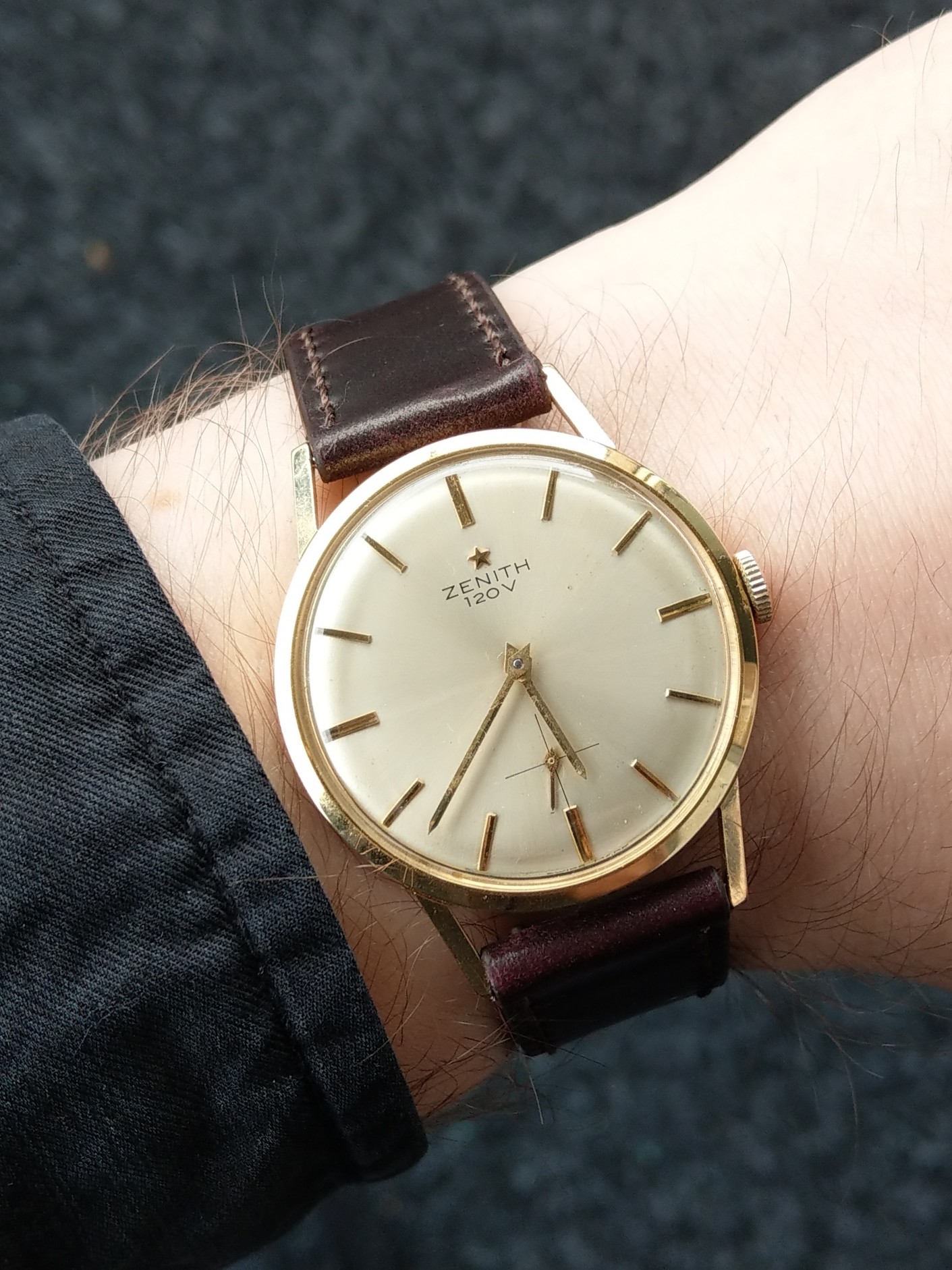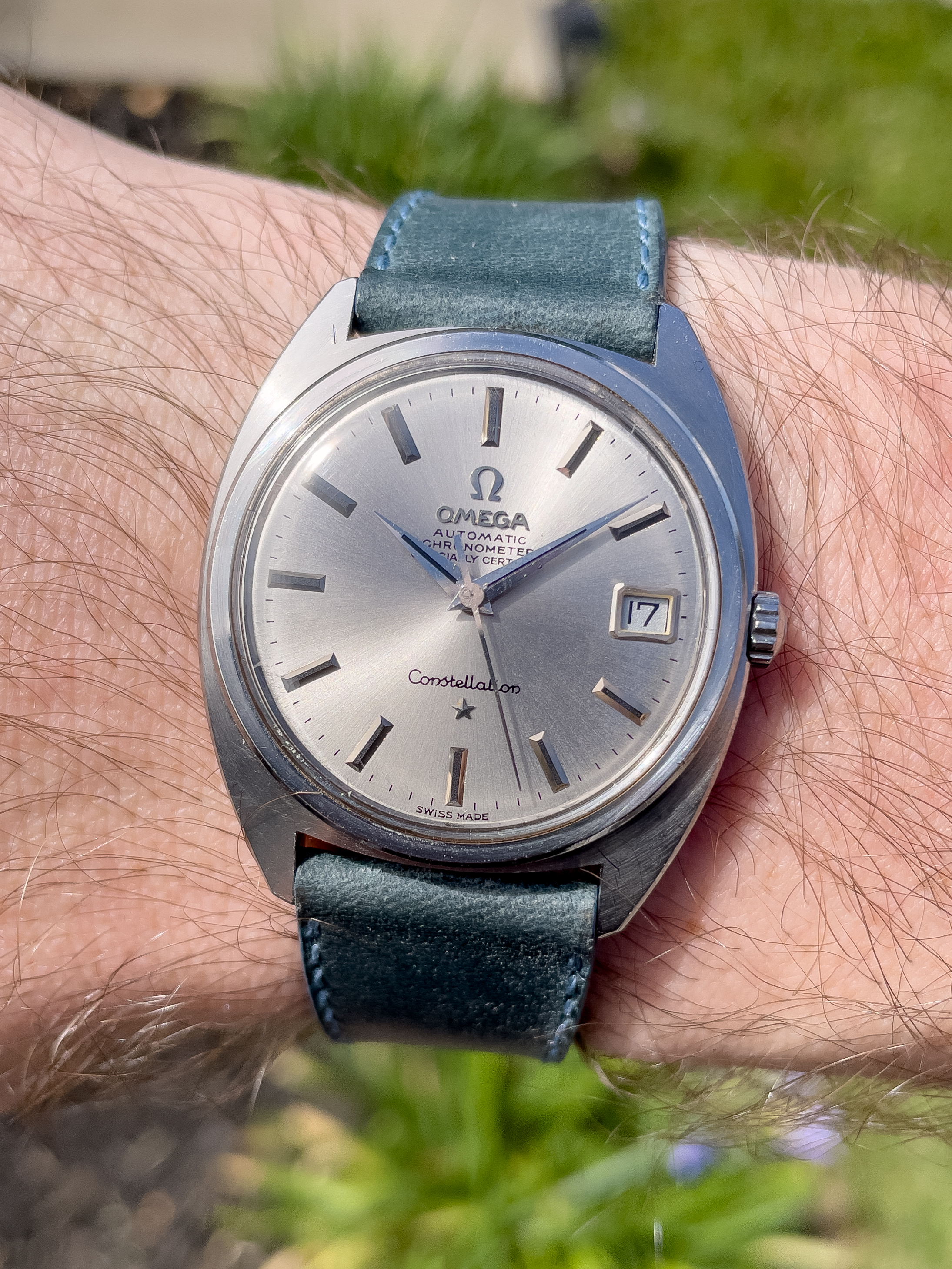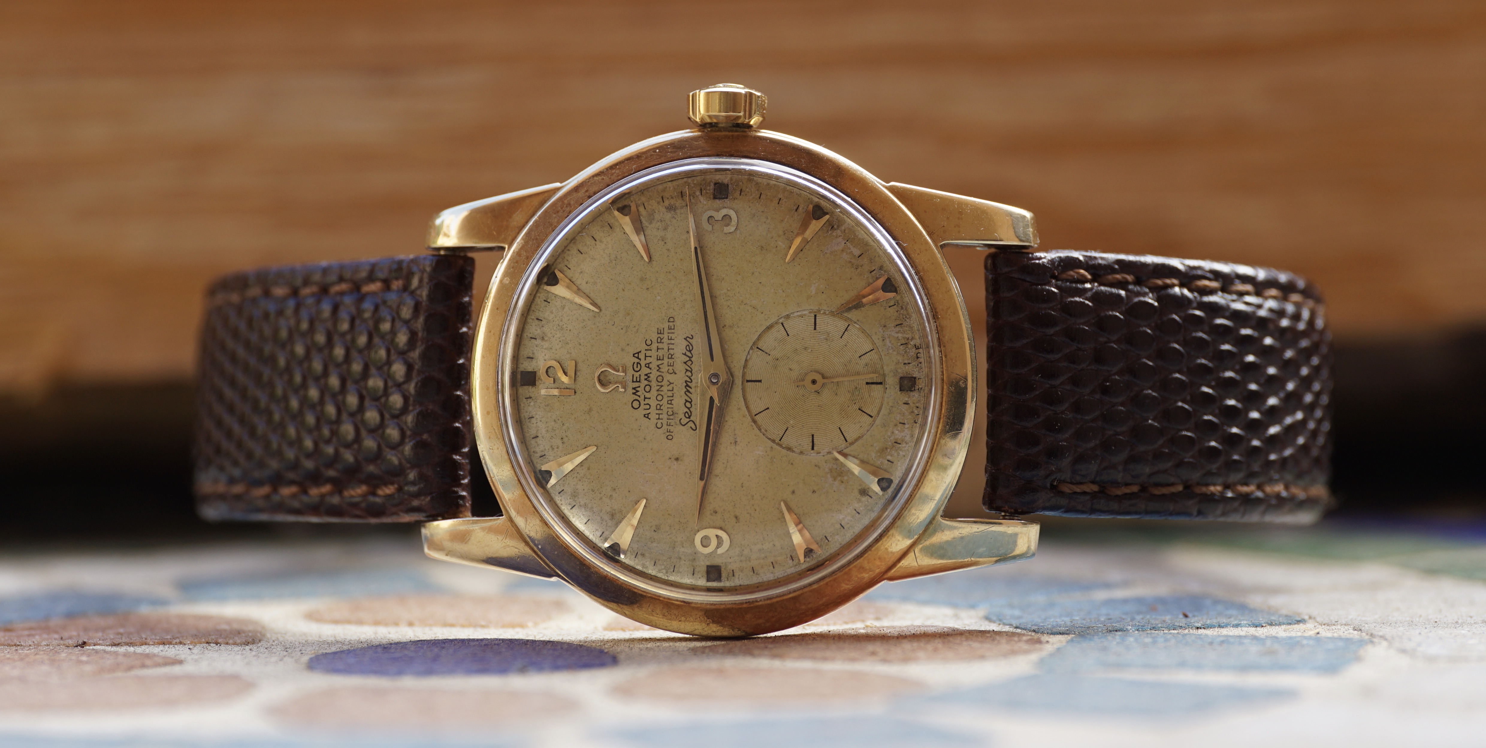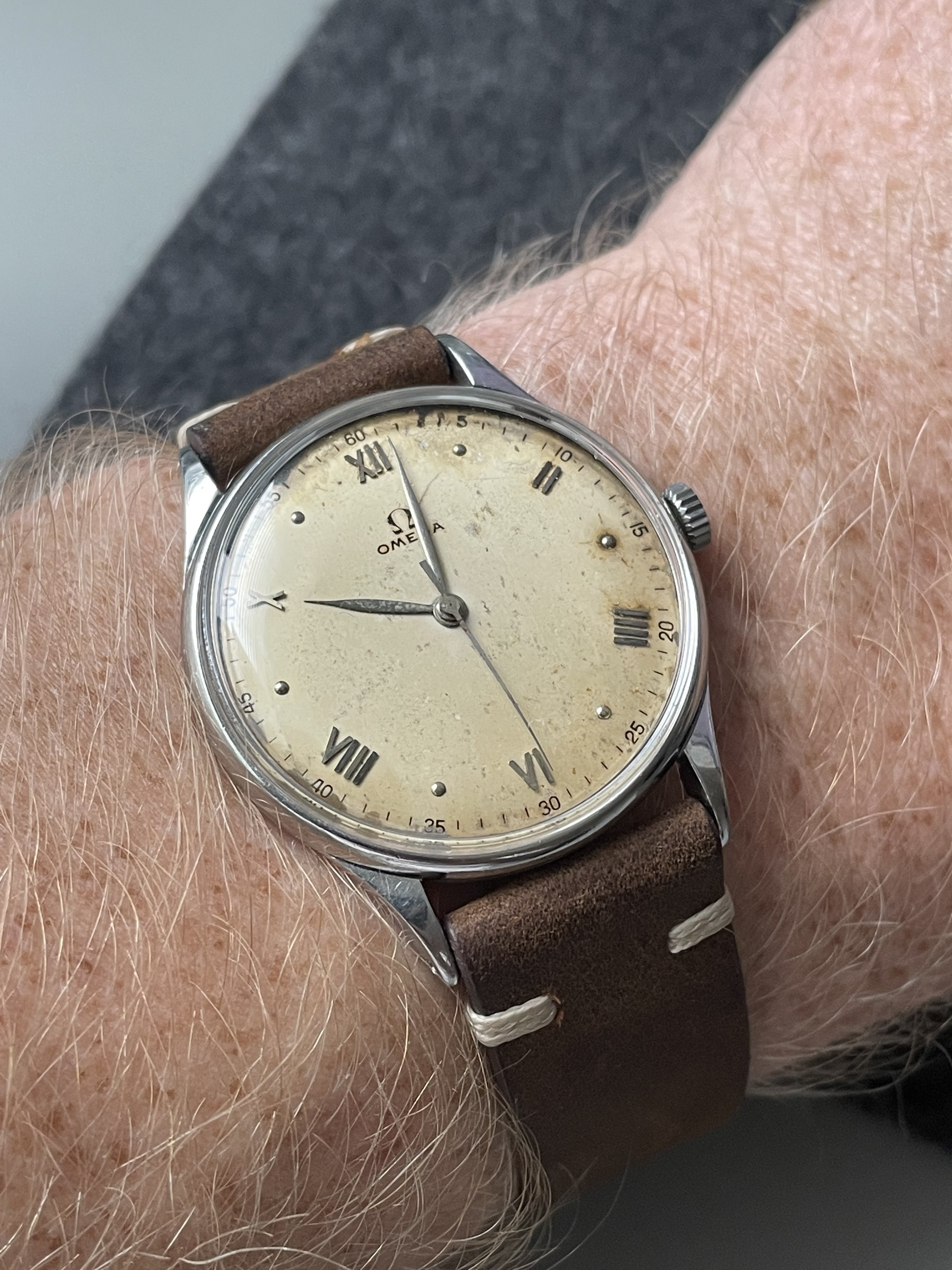 This one, today. Haven’t worn it for months. Too many watches, too much time. Early to mid 1950s, calibre 355 bumper automatic, date at 6:00. Discovered in pieces in a lozenge tin containing the remains of many bumper Omegas. Close to 50 years in pieces, re-assembled, all original except bracelet and NOS stainless steel case. Love it!