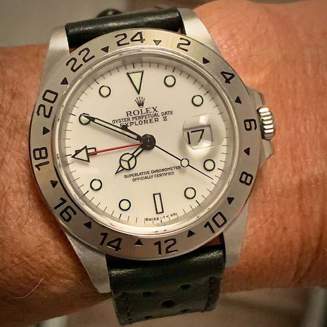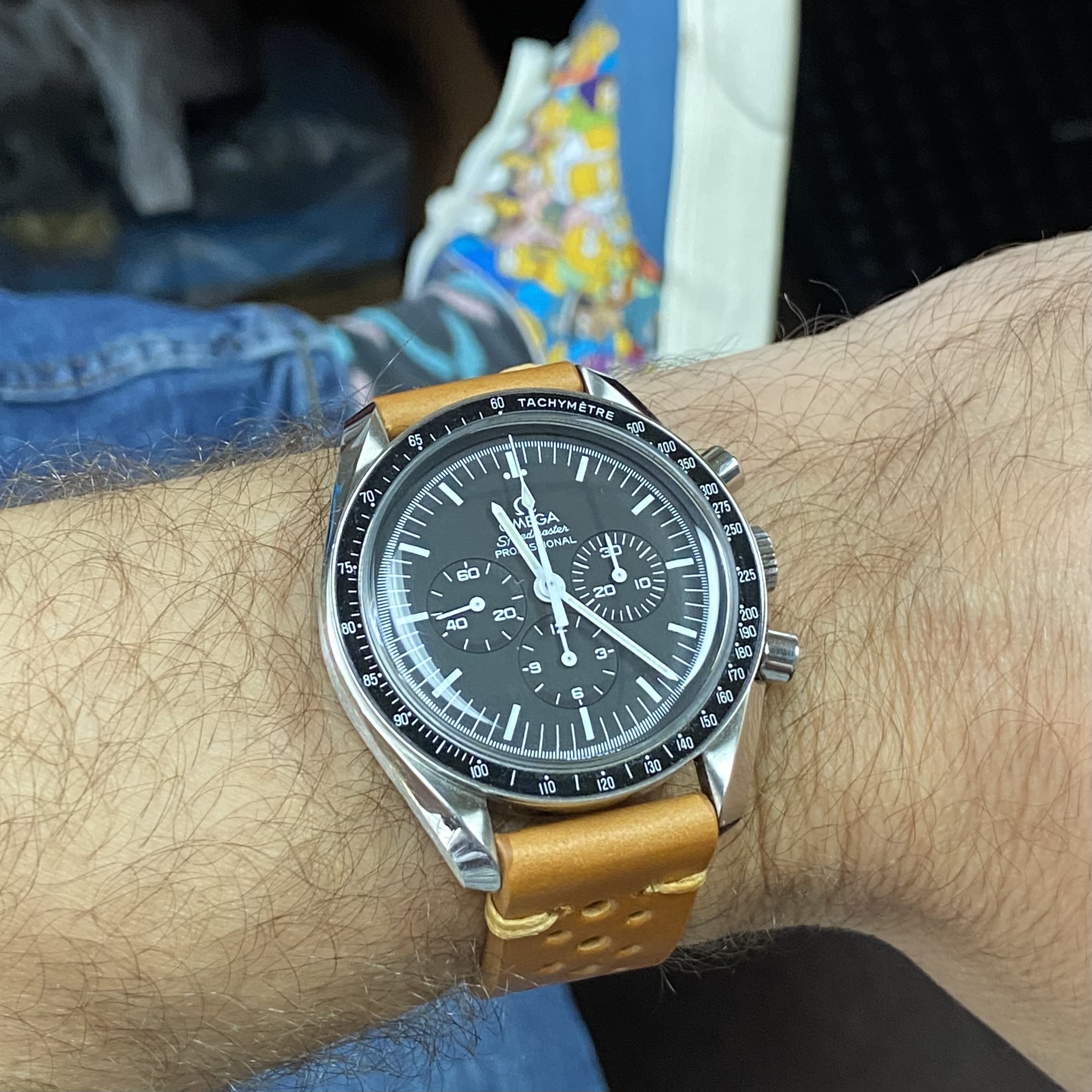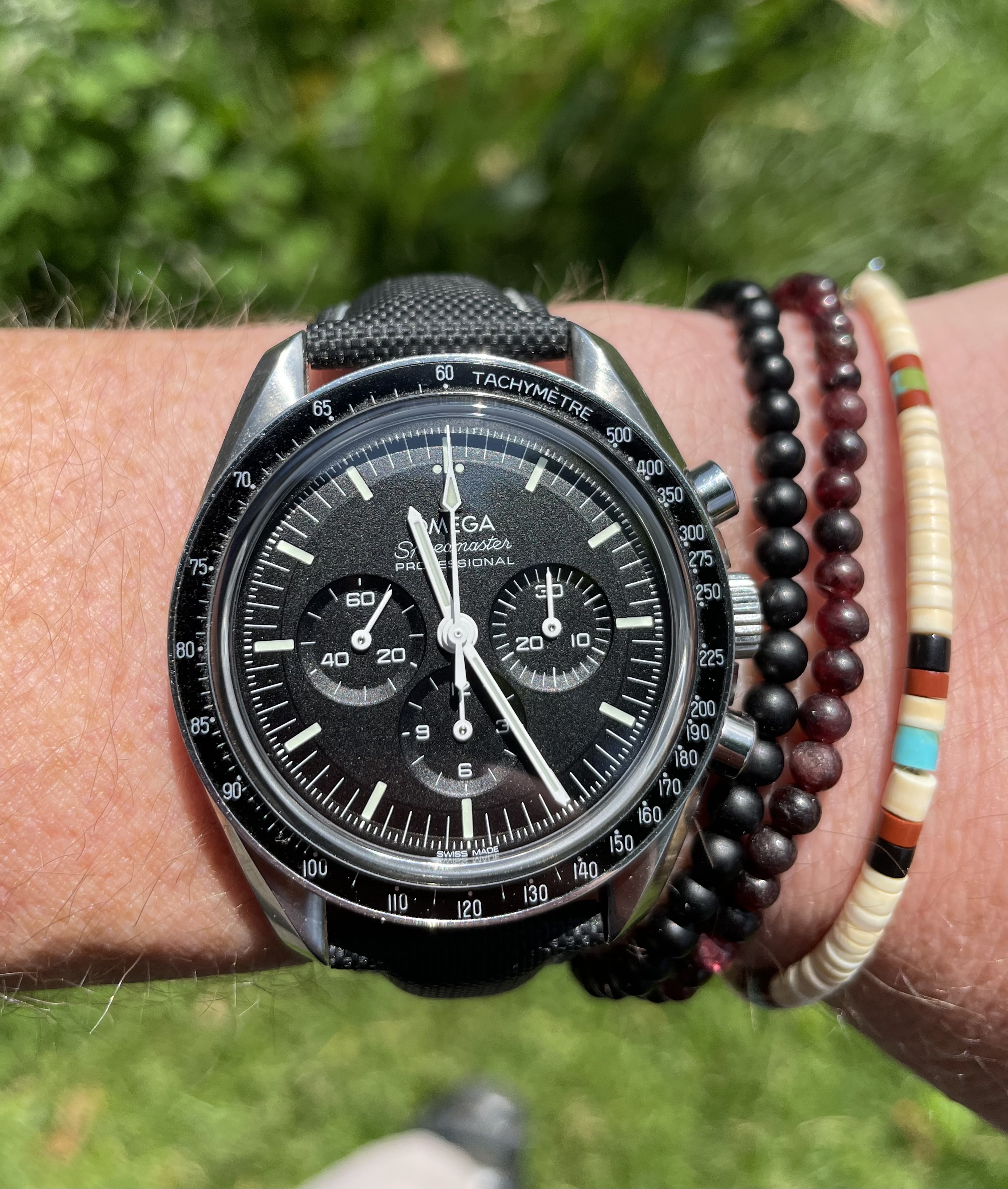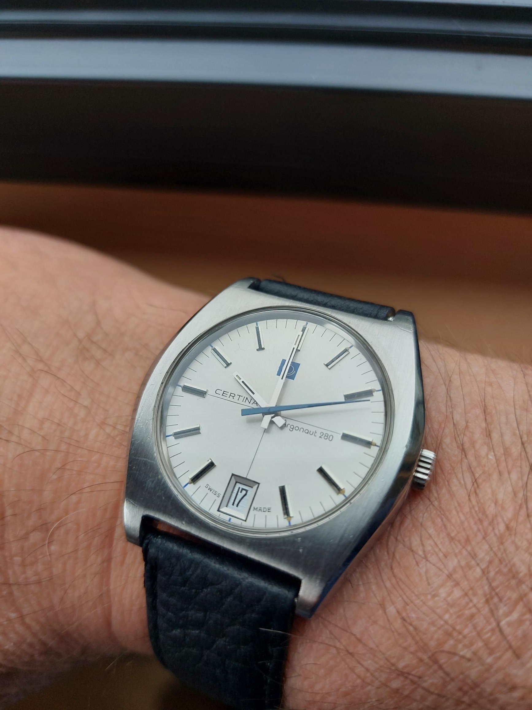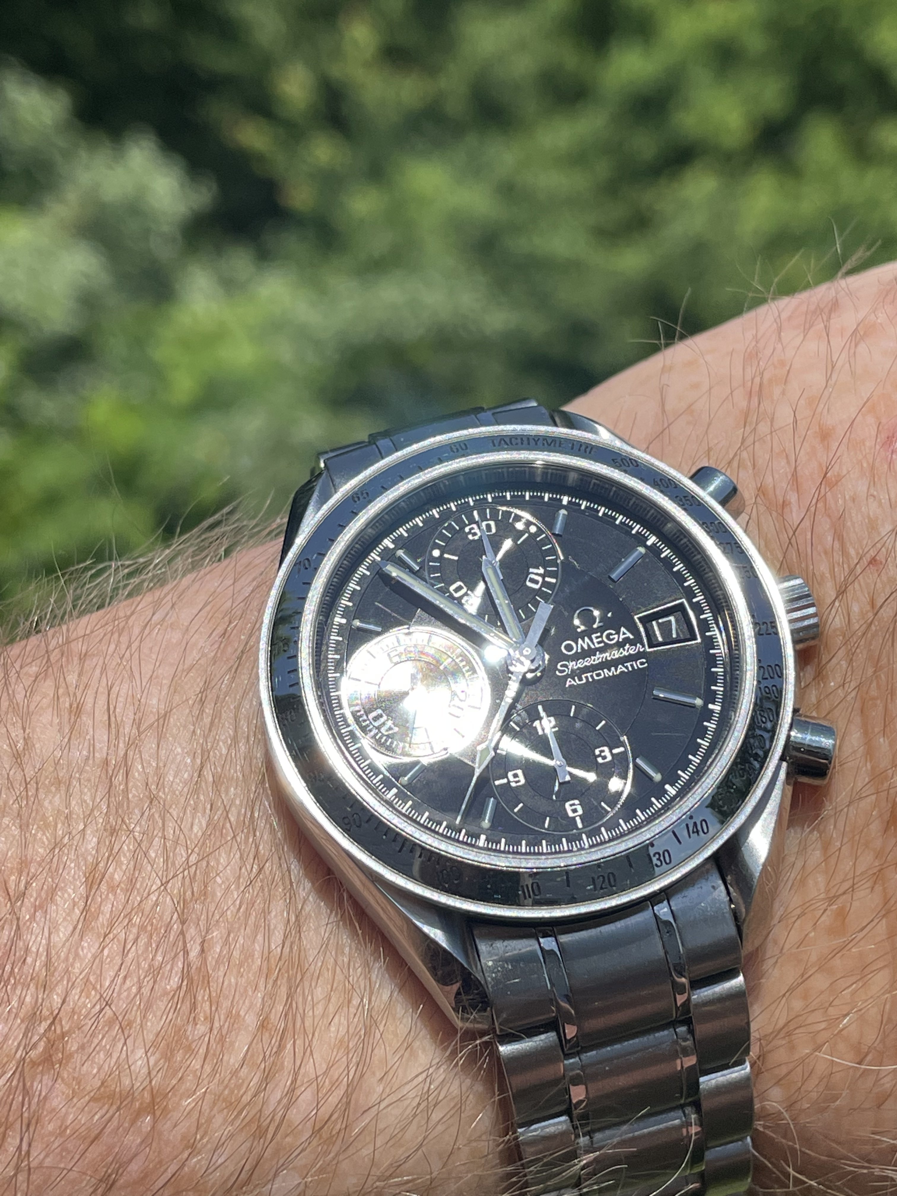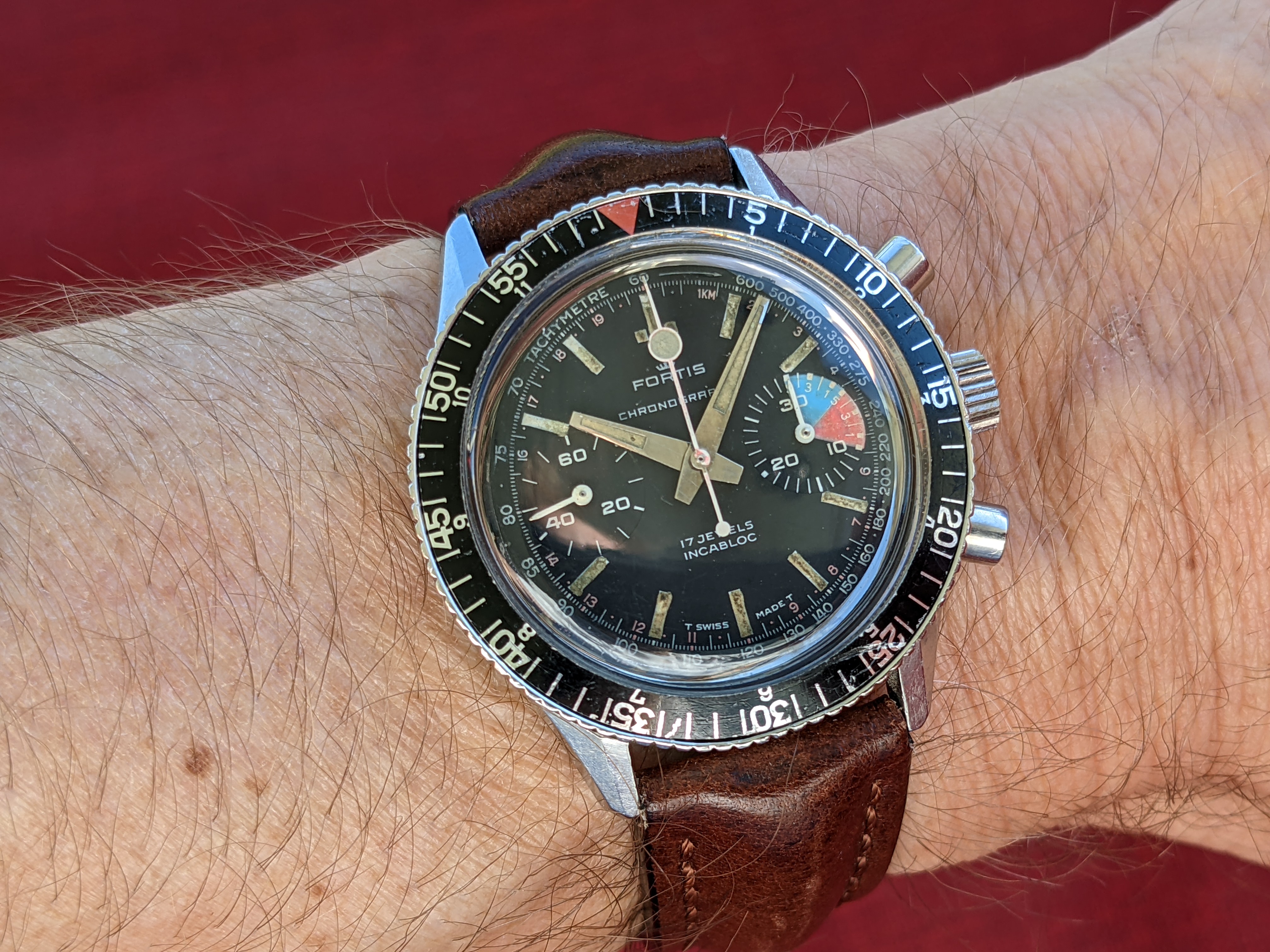 This one, today. Haven’t worn it for months. Too many watches, too much time. Early to mid 1950s, calibre 355 bumper automatic, date at 6:00. Discovered in pieces in a lozenge tin containing the remains of many bumper Omegas. Close to 50 years in pieces, re-assembled, all original except bracelet and NOS stainless steel case. Love it!