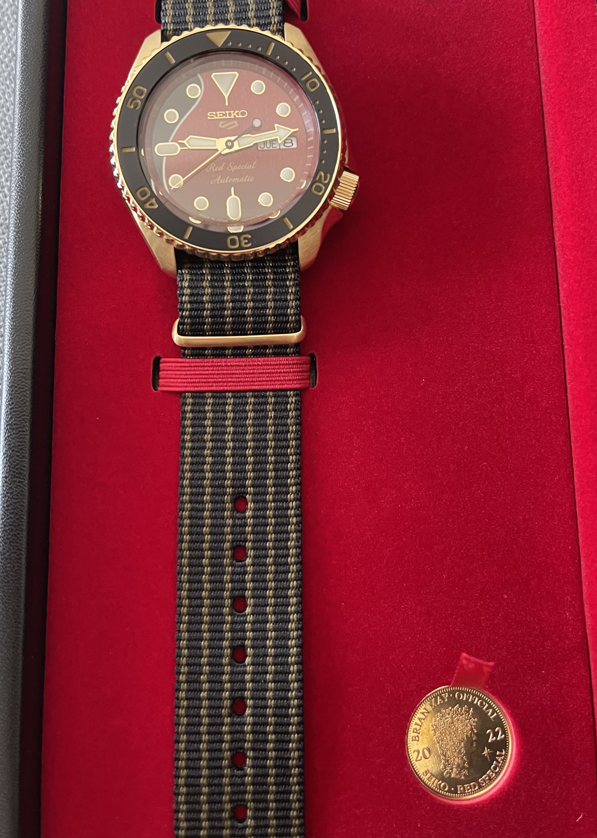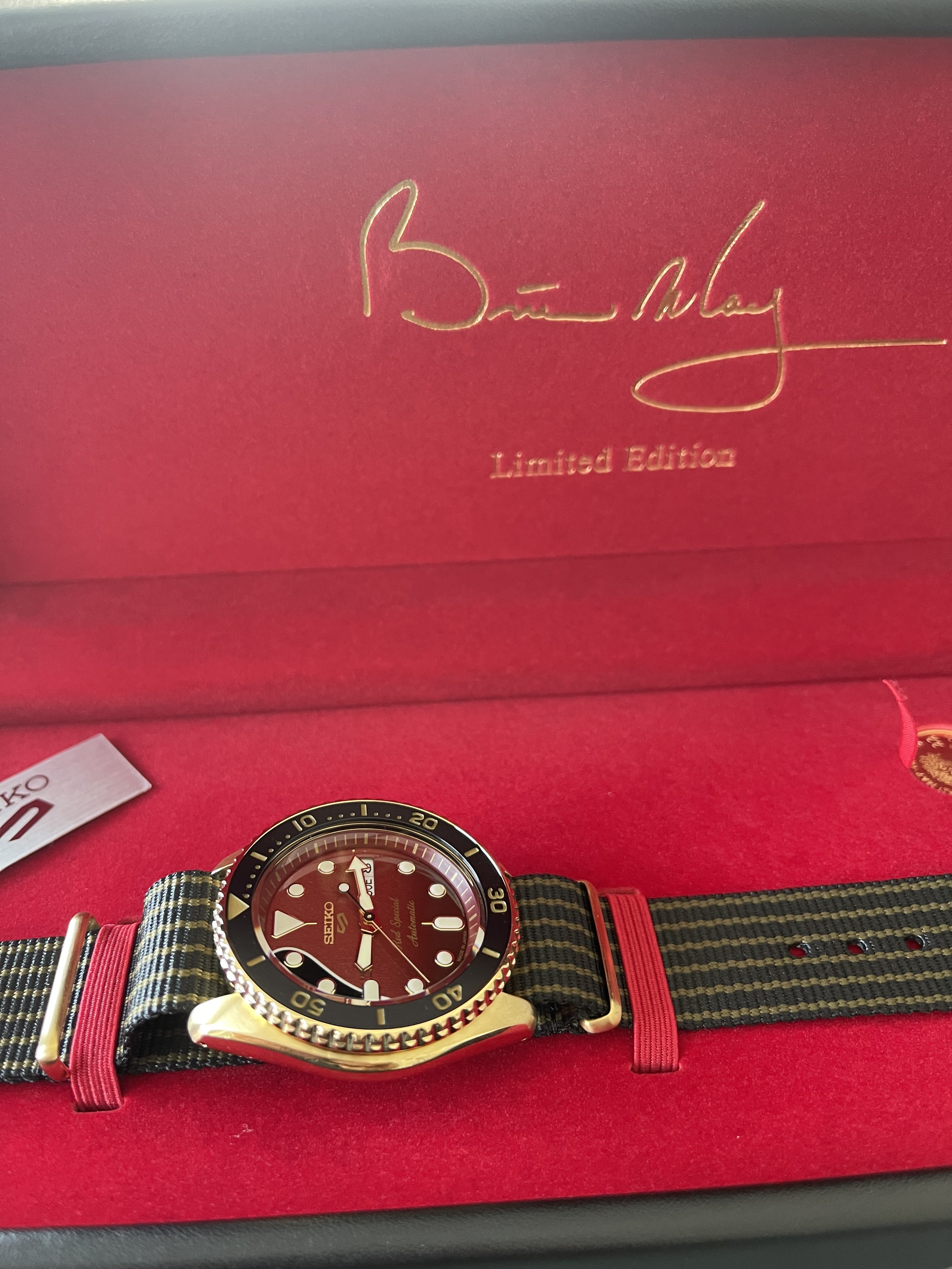 Just delivered today. Brian May of Queen collaborated with Seiko basing it on his guitar the “Red Special” … cool birthday present for my guitar playing and watch loving youngest son