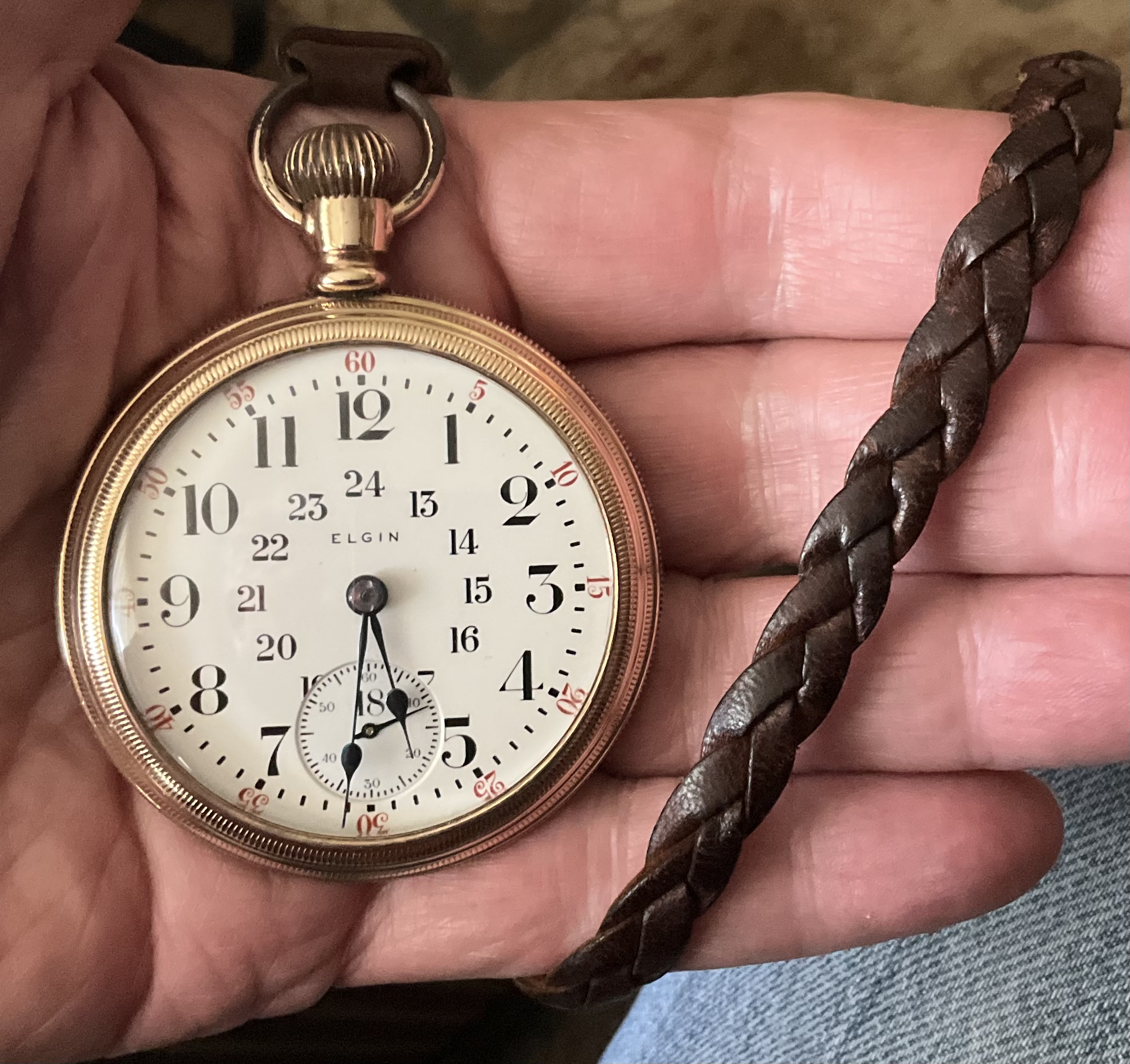Encore! My 111 year old Elgin 15-jewel pocket watch on its @DaveK mystery braid lanyard, after significant repairs and a better case. Not railroad grade in spite of the perfect 24-hour vitreous enamel dial. Dam I love this watch. Cost? I had all the parts I needed, on hand, and a bit of sweat equity.