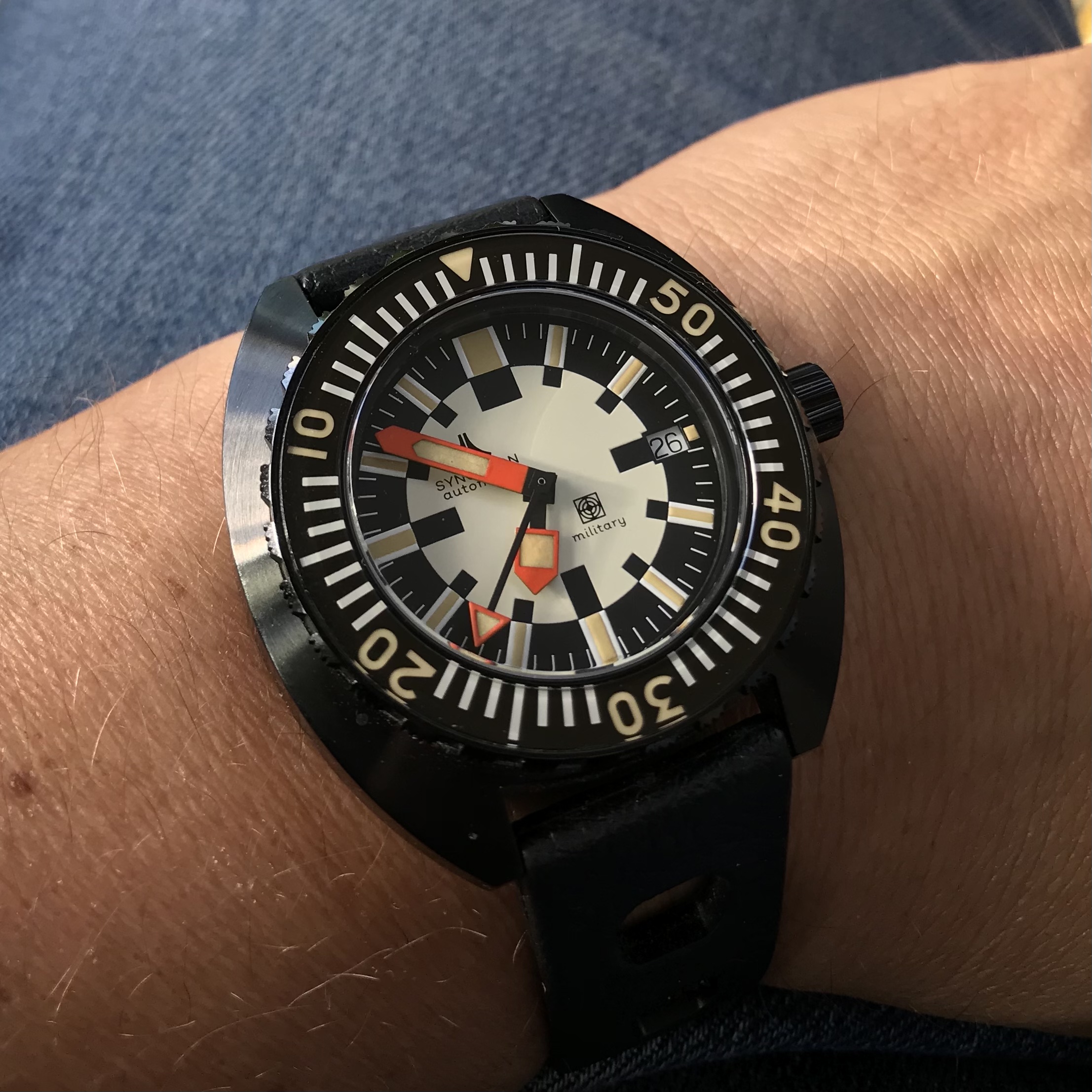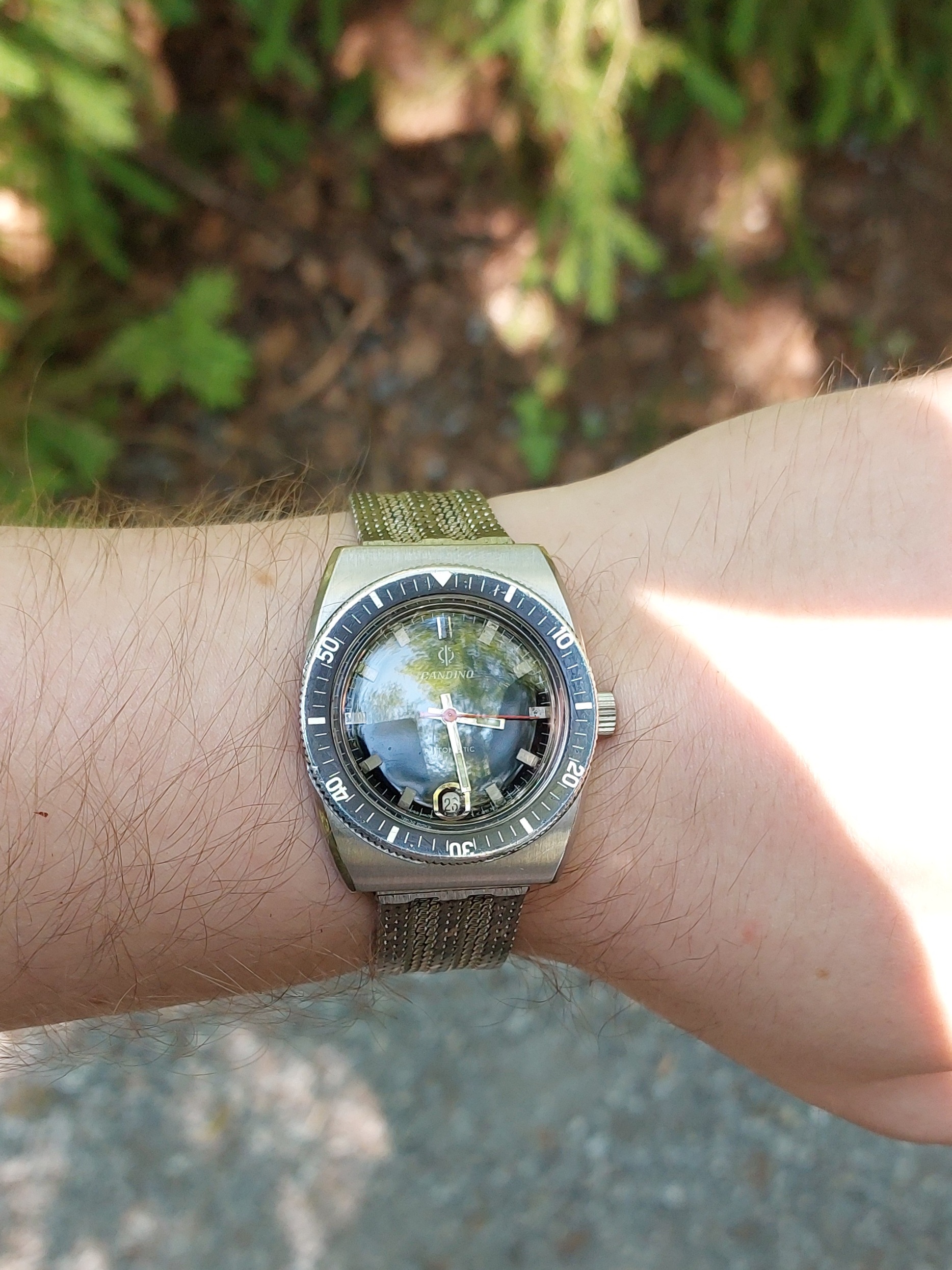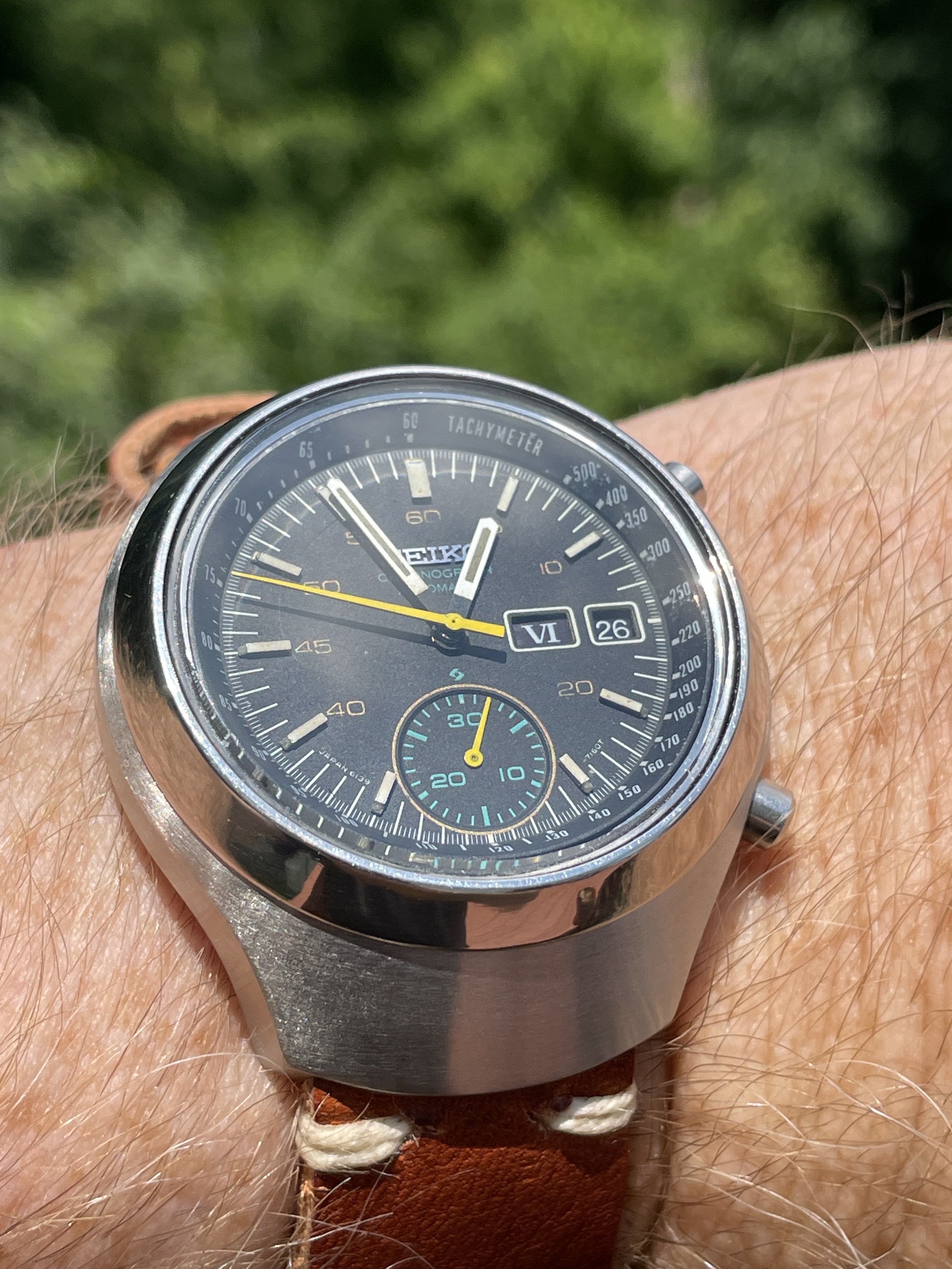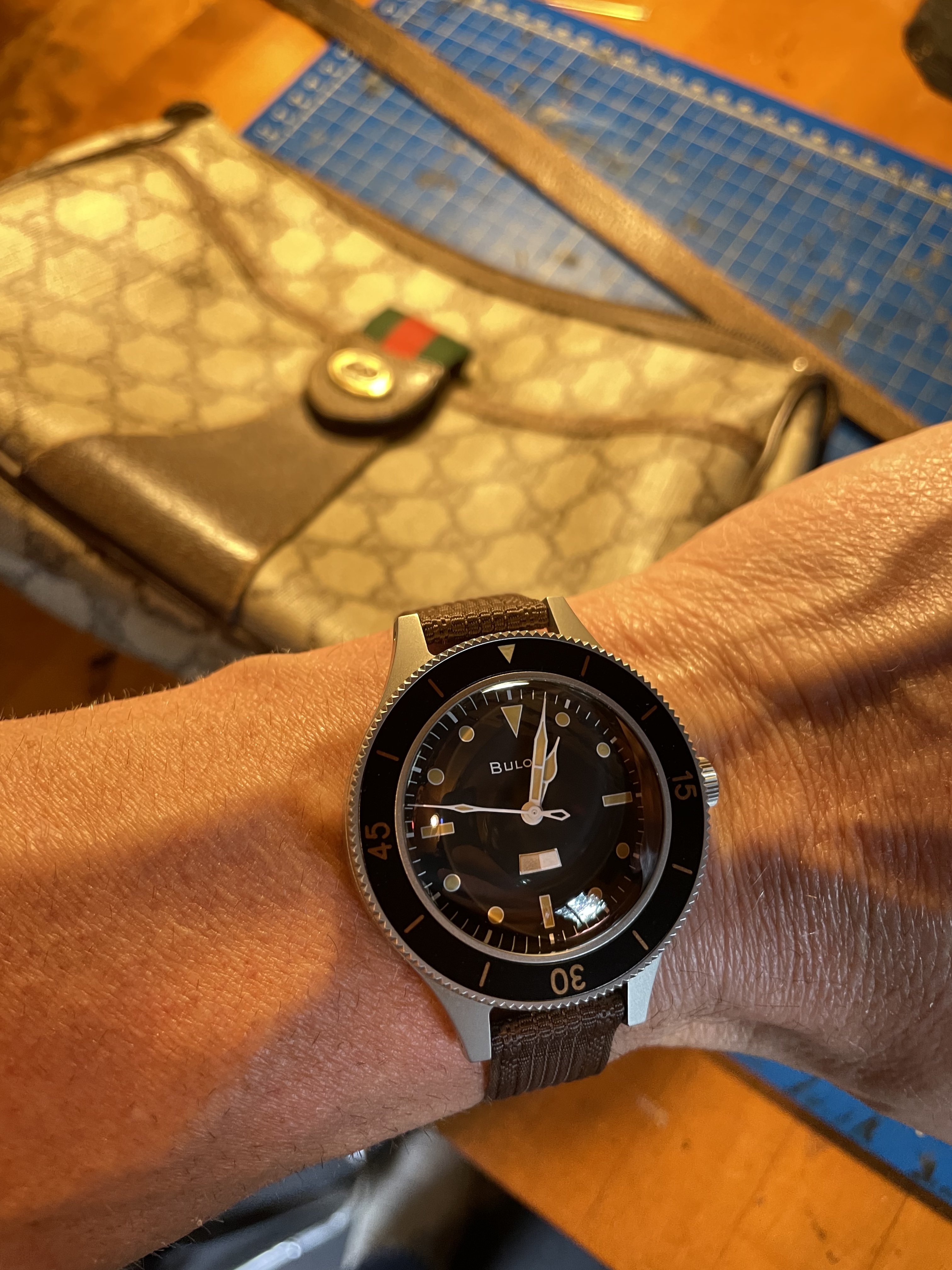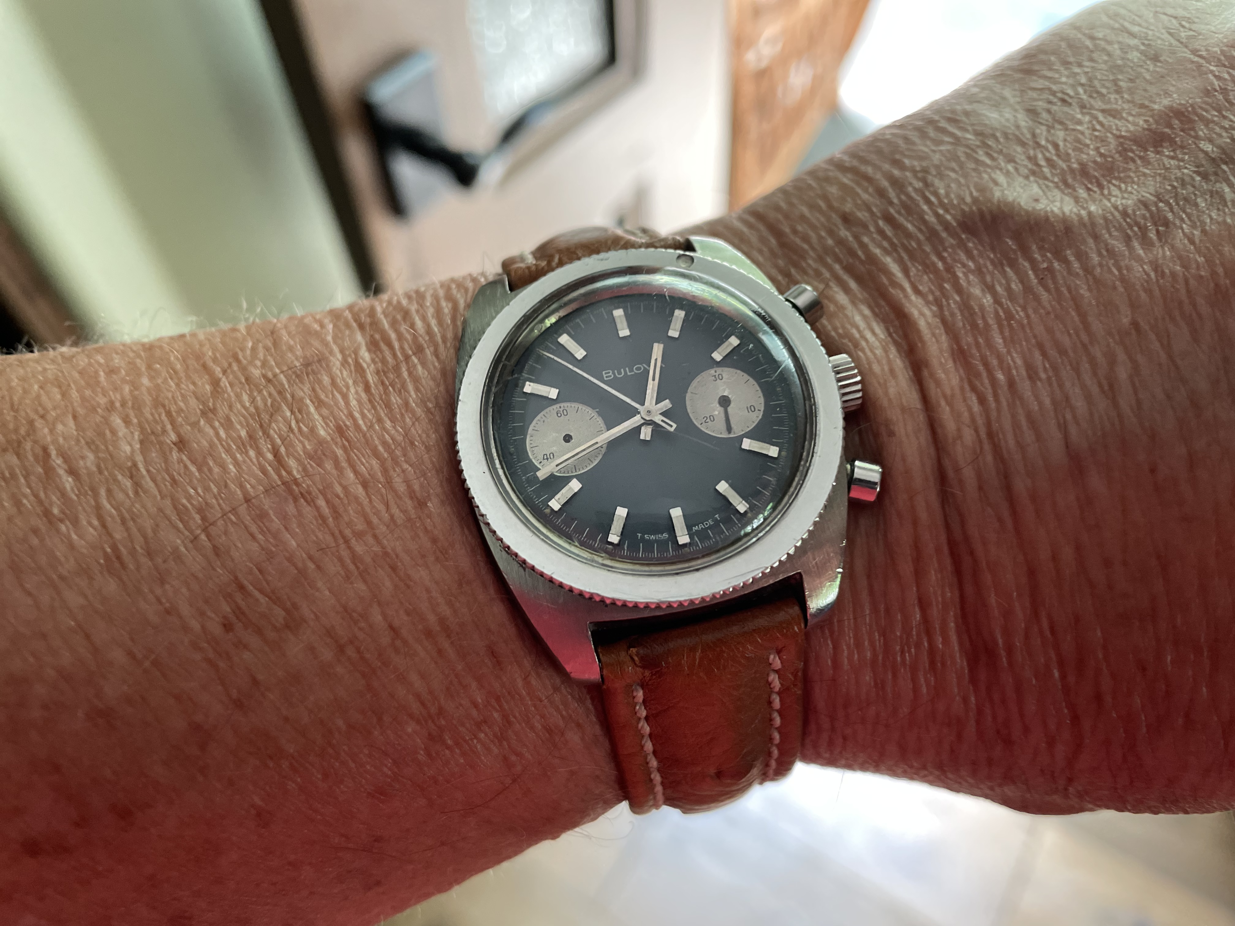 Recent arrival, 1969 Bulova “Deep Sea” ref. 31001. Off to my WM for service, a replacement hand for the left register and to have the crystal polished. Valjoux 7733 runs well.