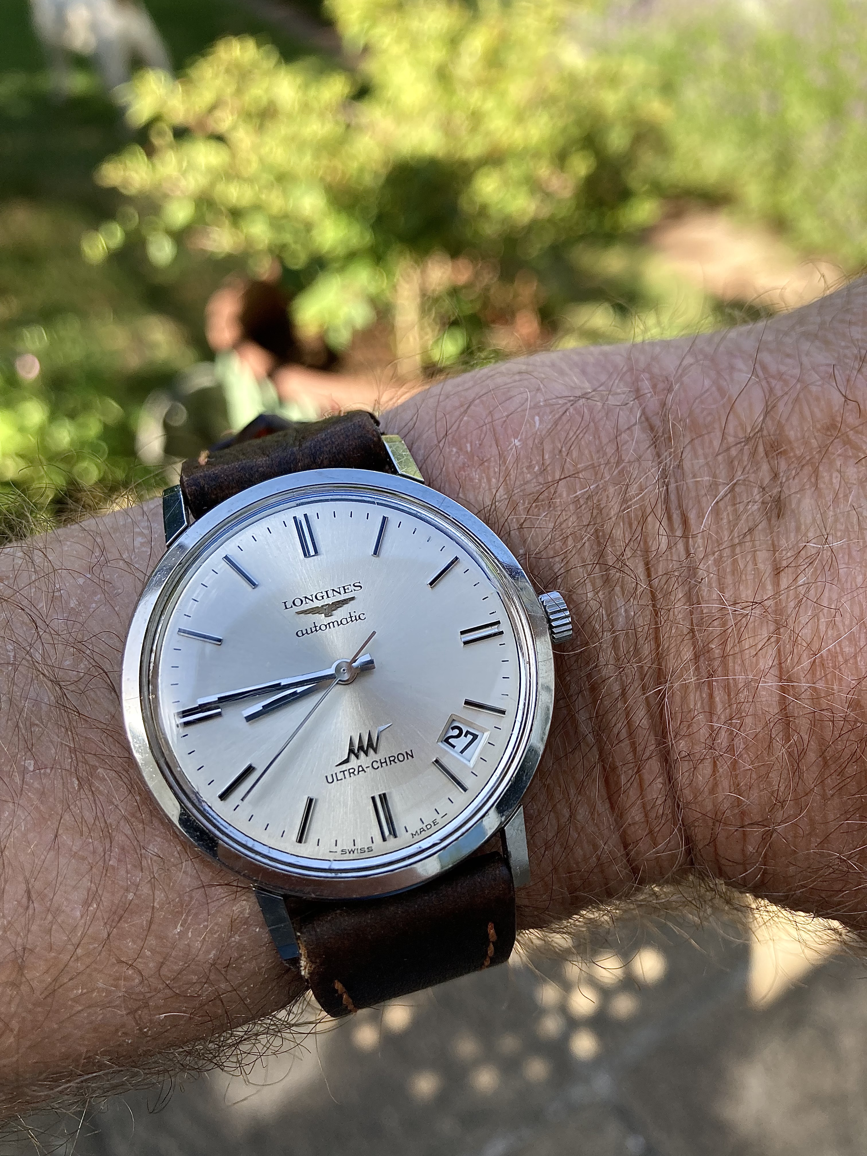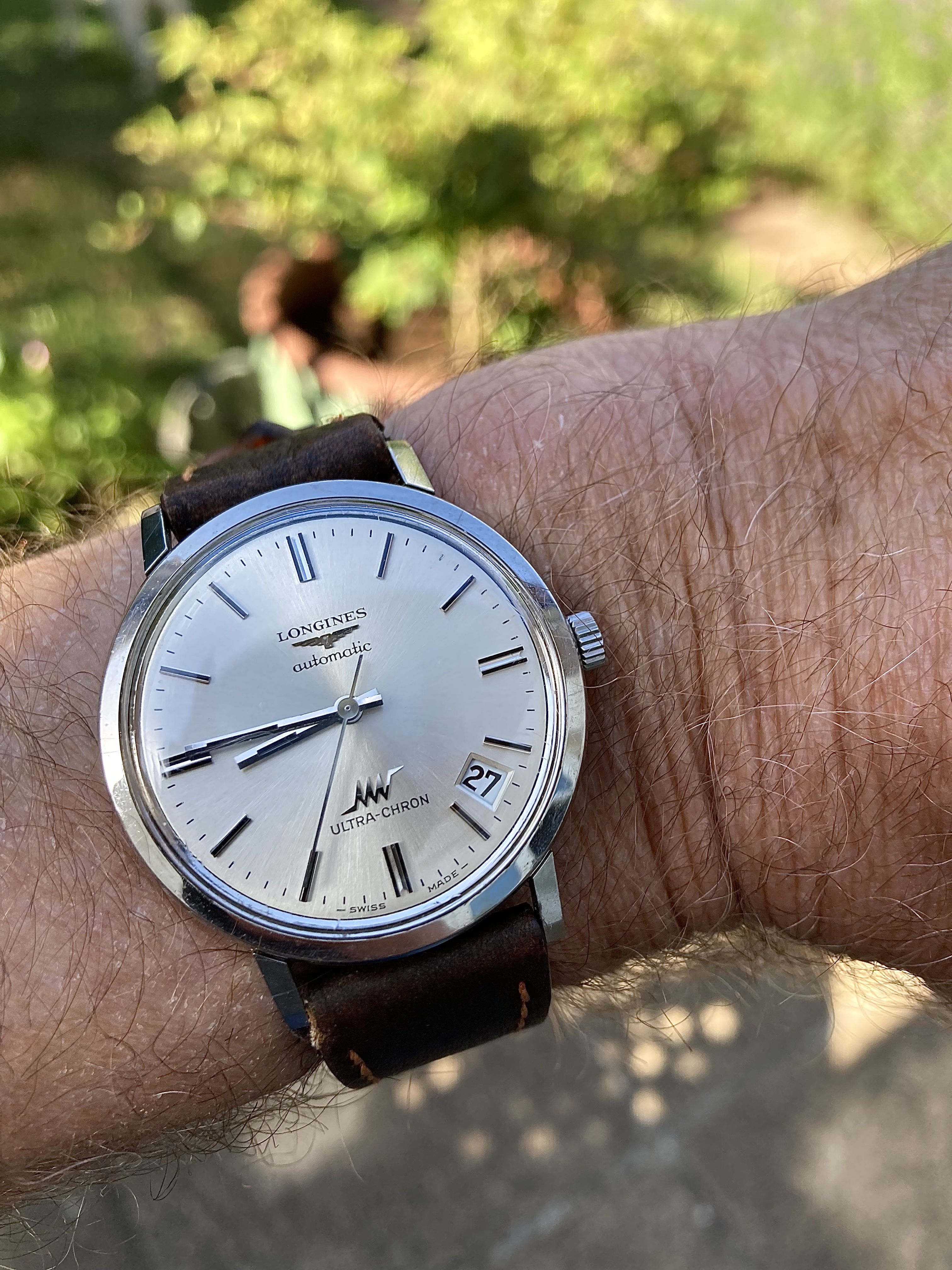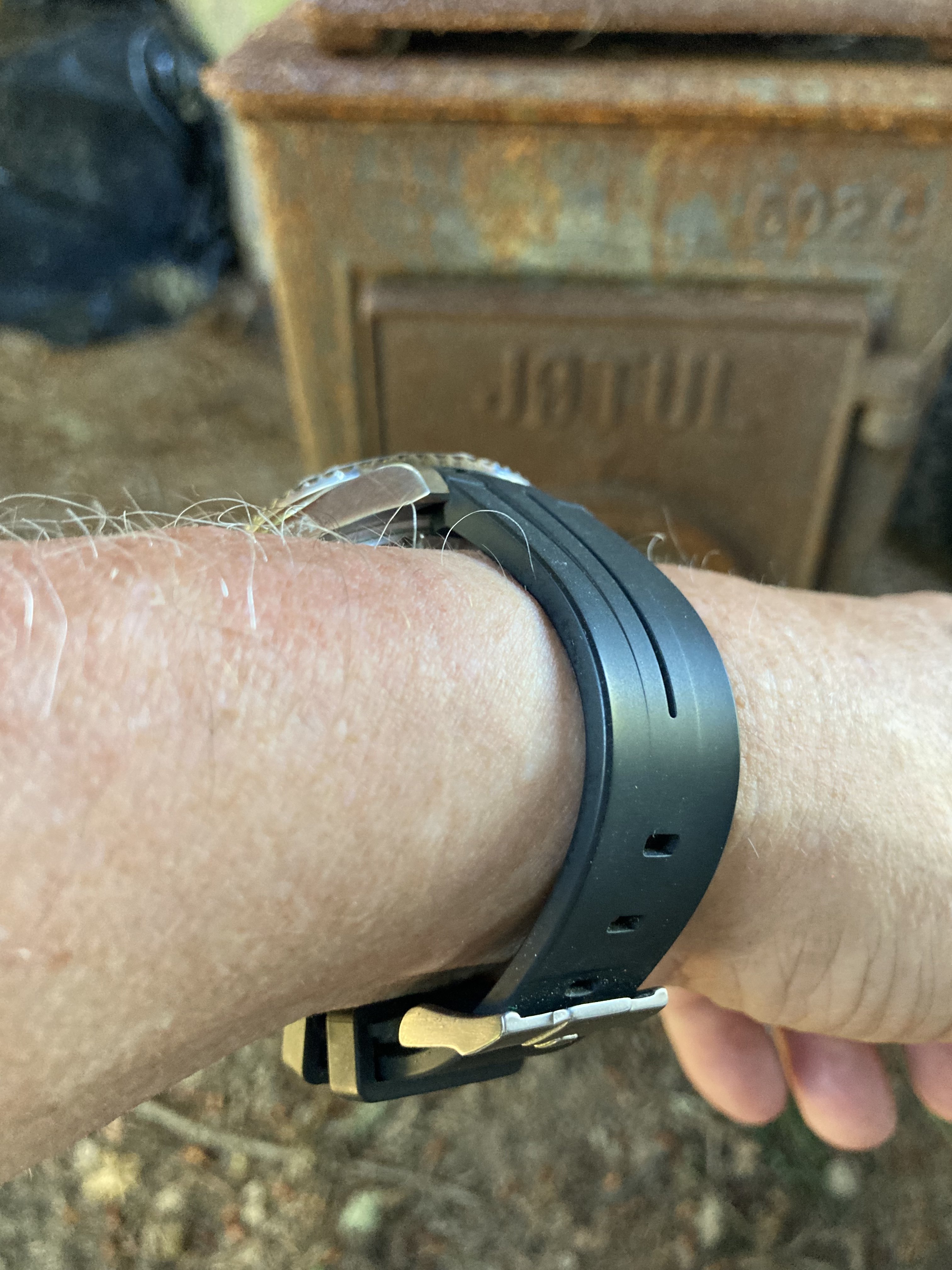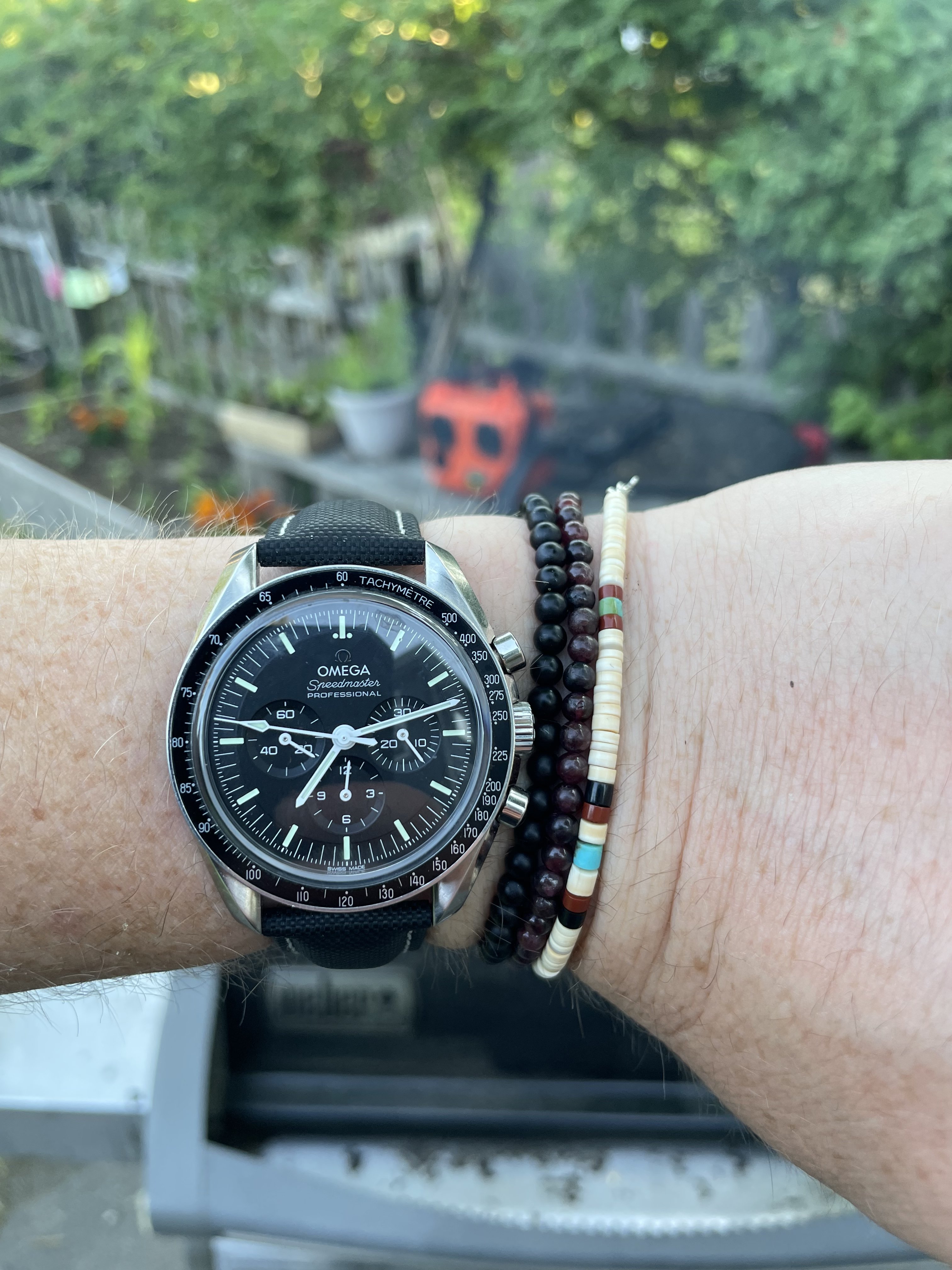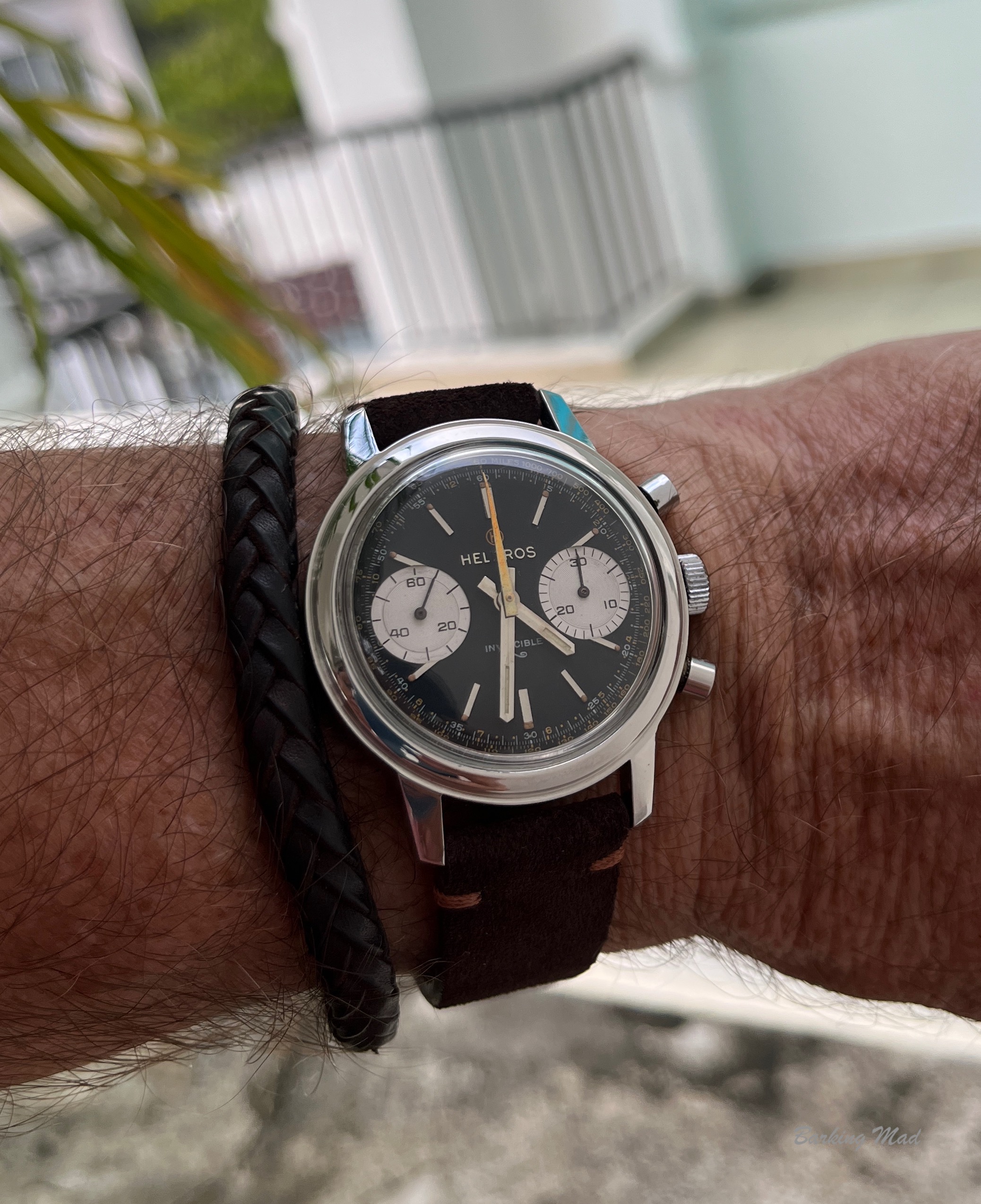 The bracelet is too small, so I put it on this Heuertime racing strap while I hunt for an extra link. Do you think it works? I'm on the fence.