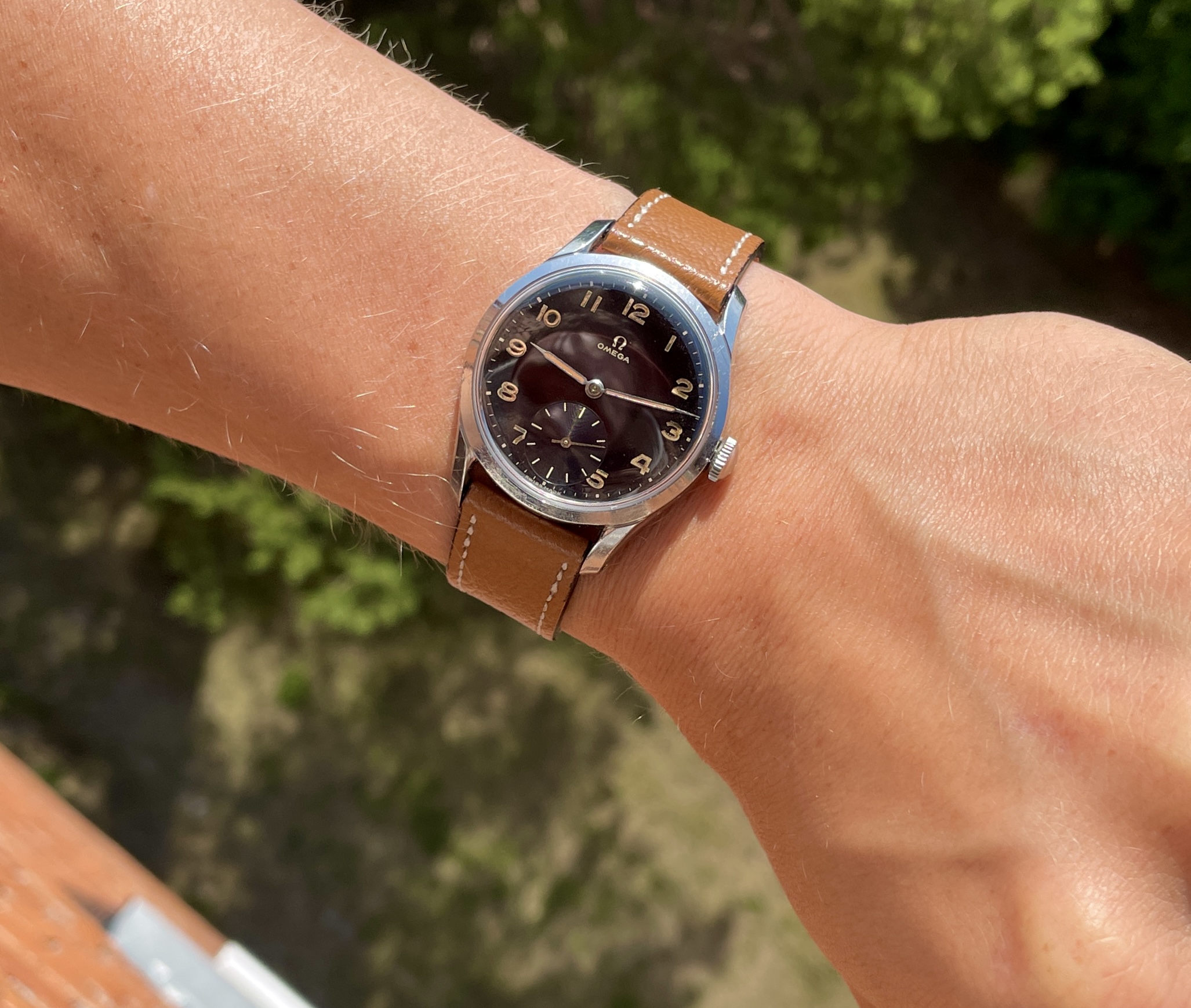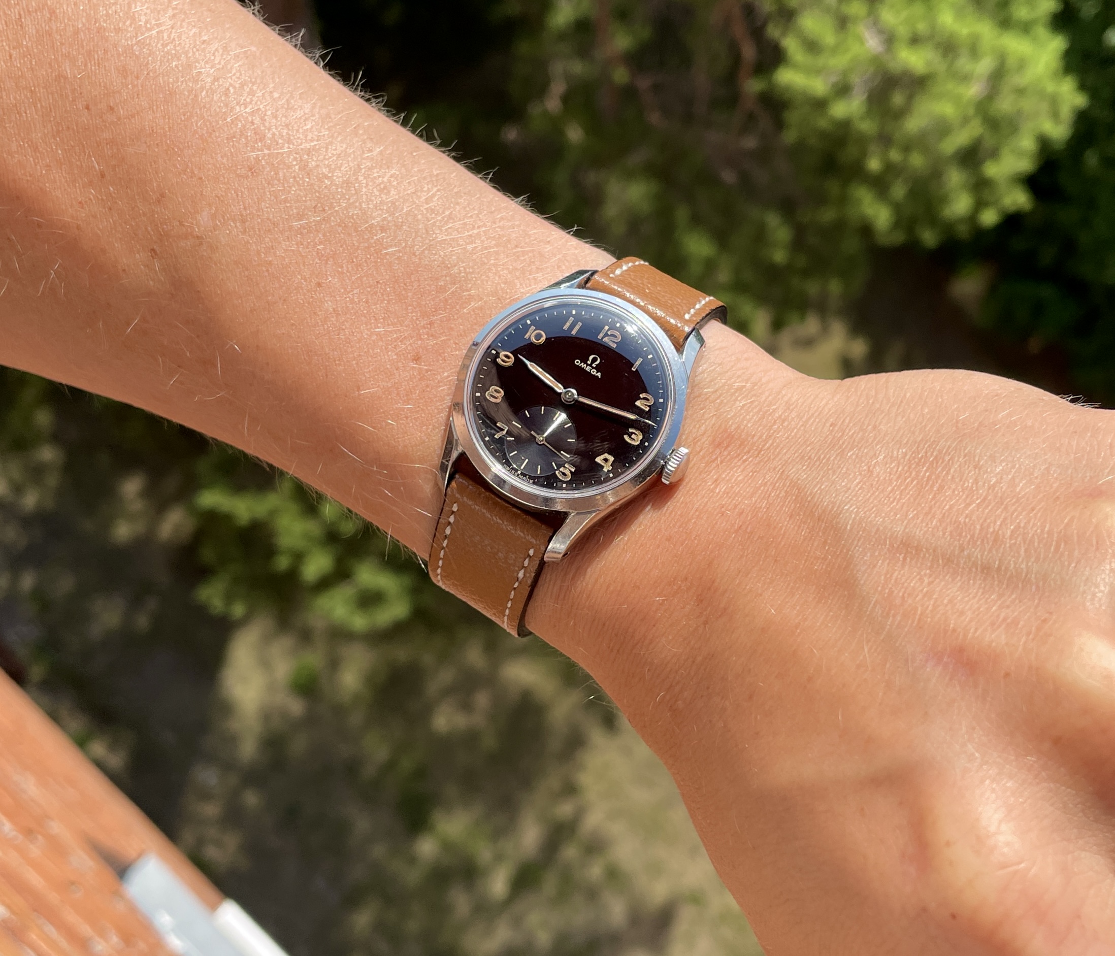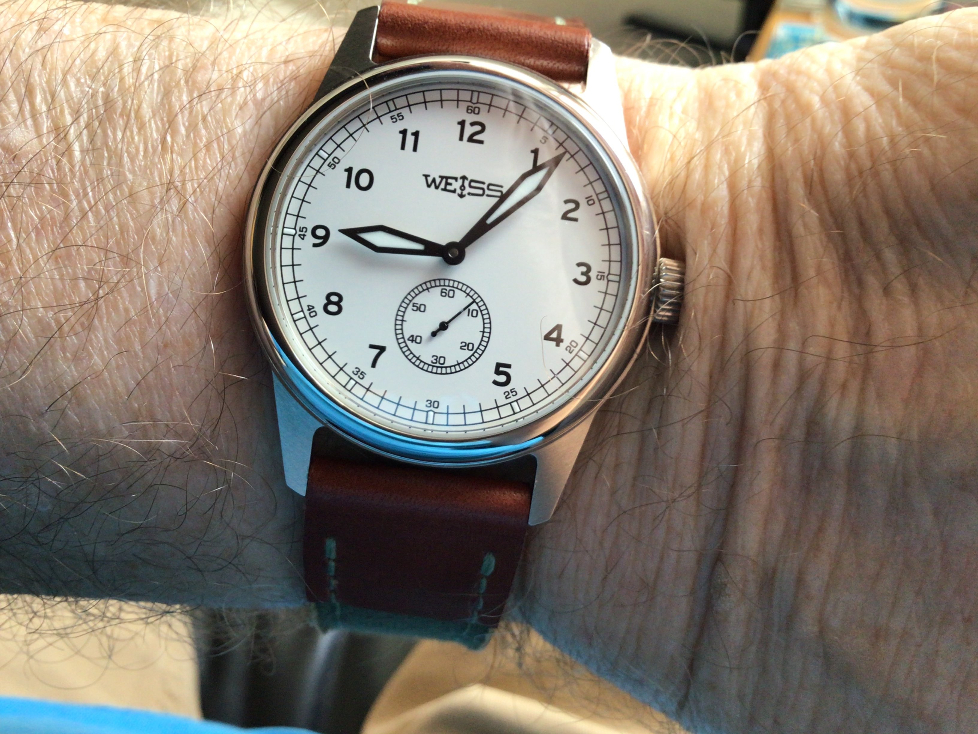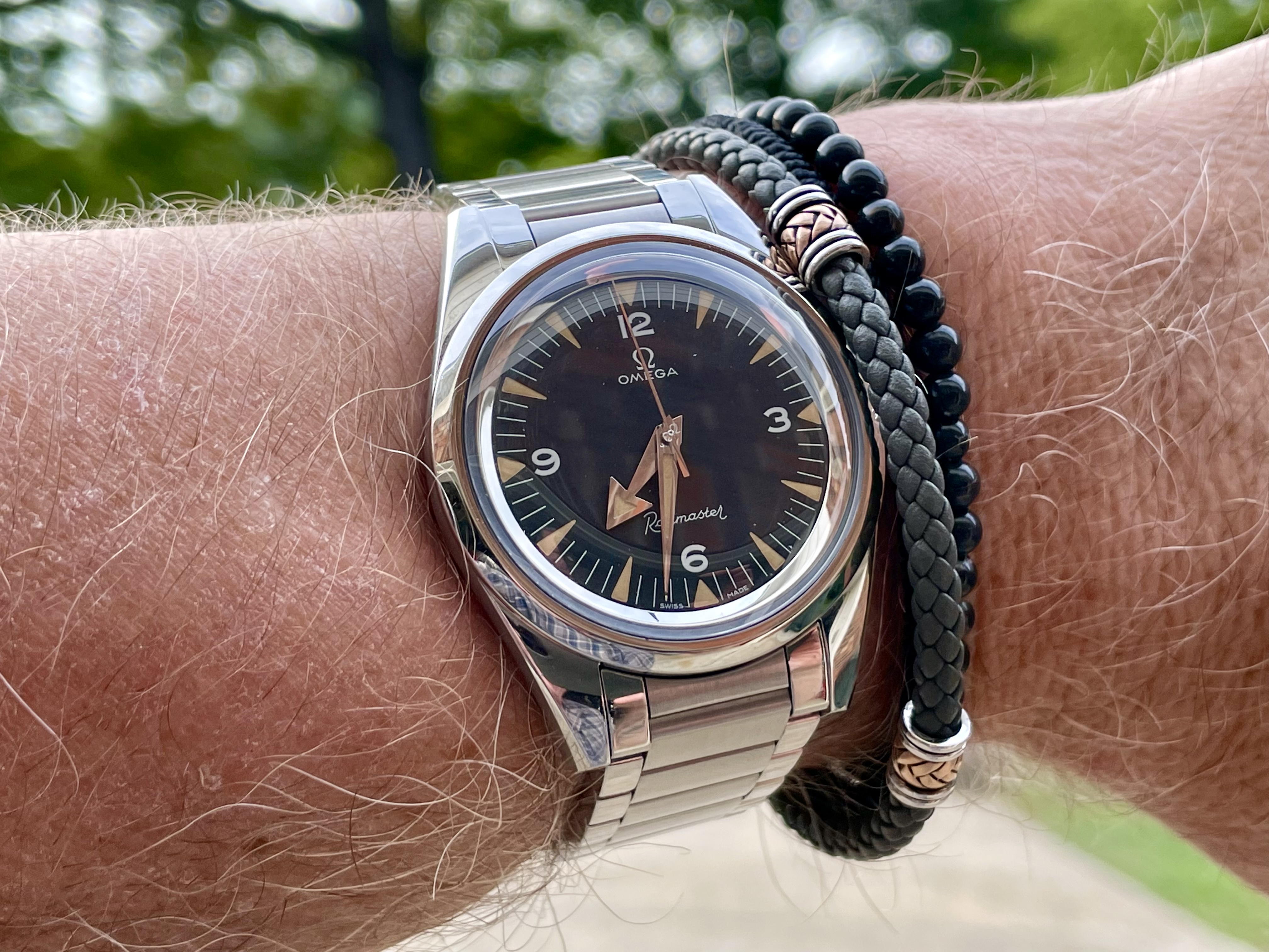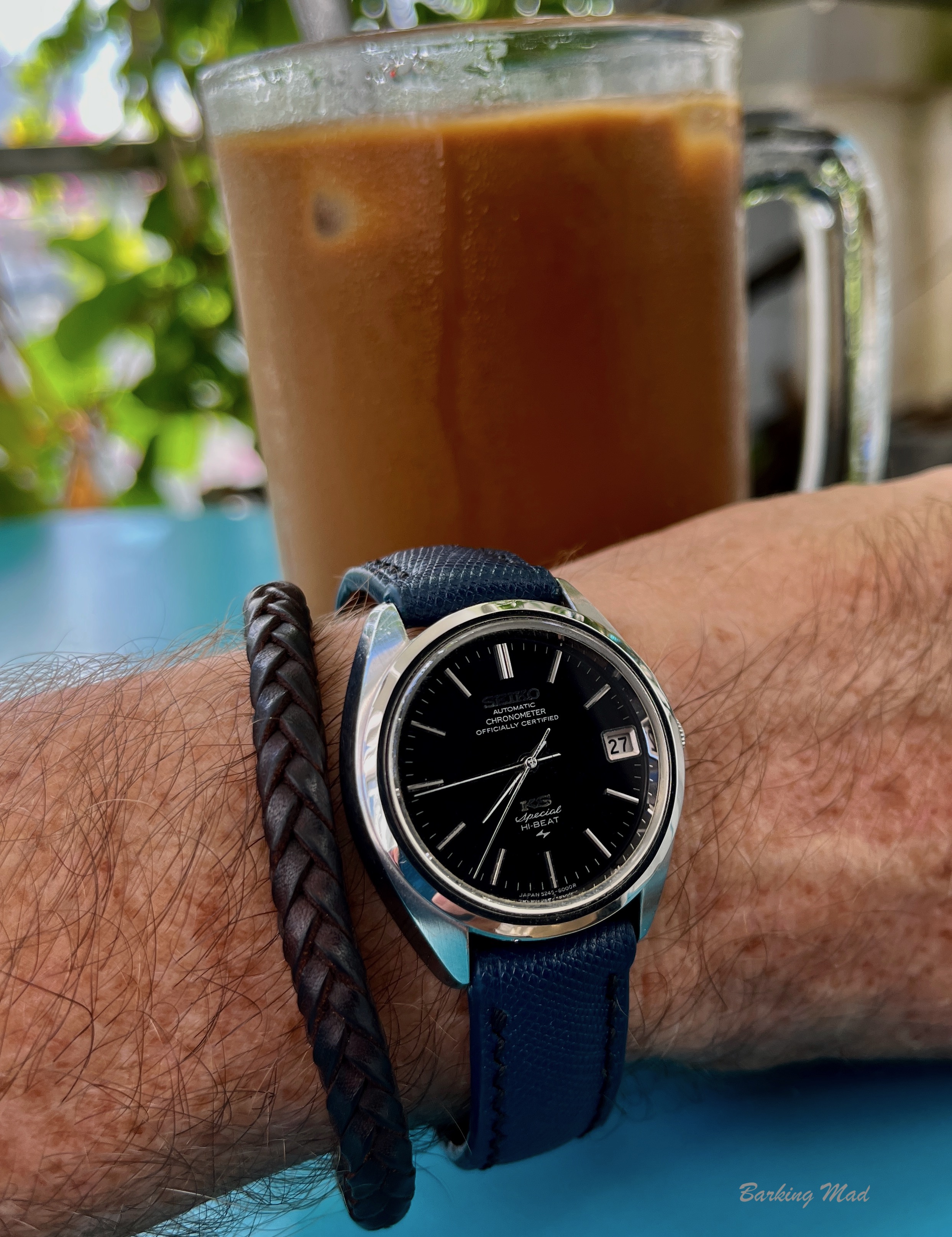 The bracelet is too small, so I put it on this Heuertime racing strap while I hunt for an extra link. Do you think it works? I'm on the fence.