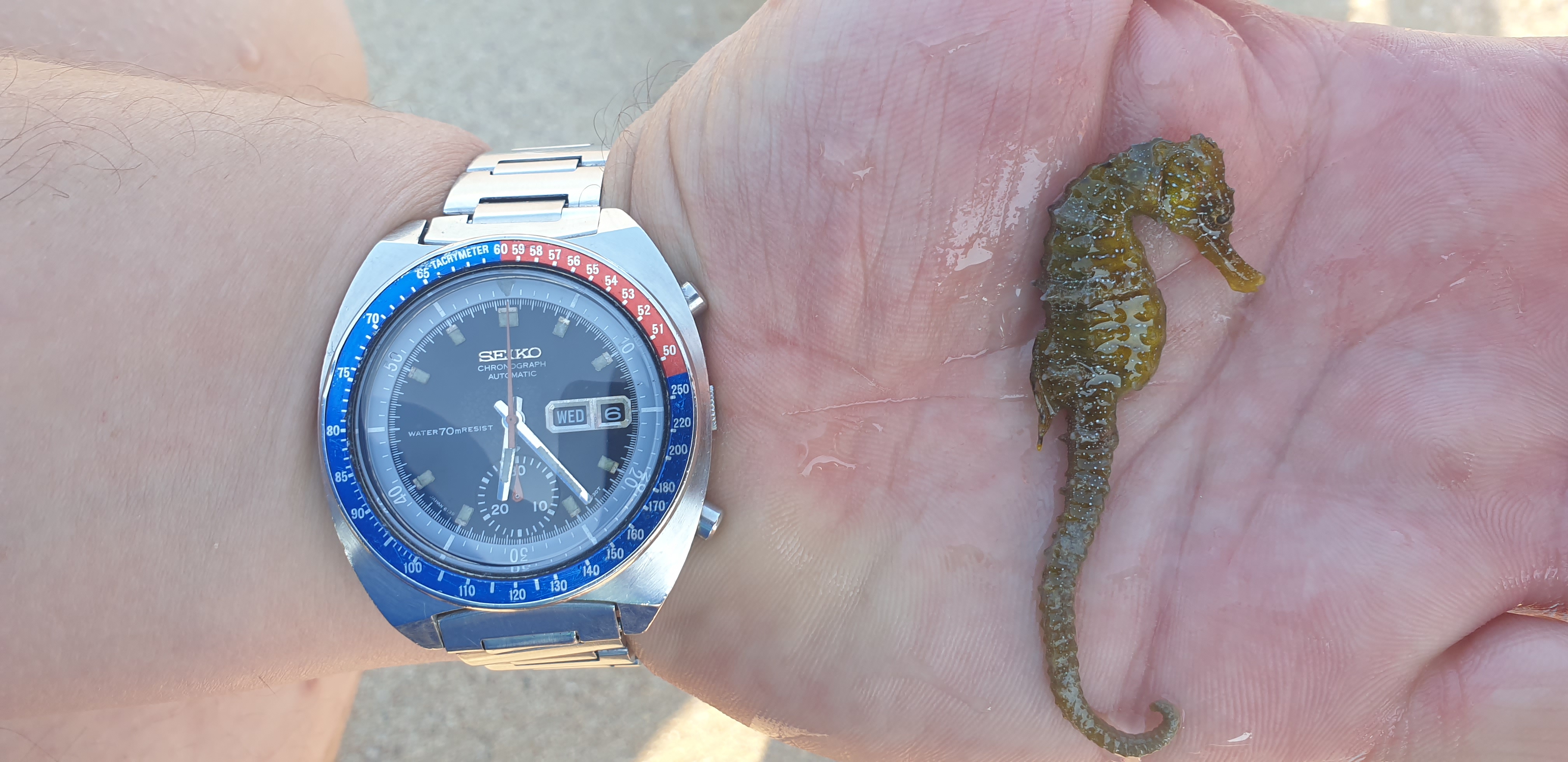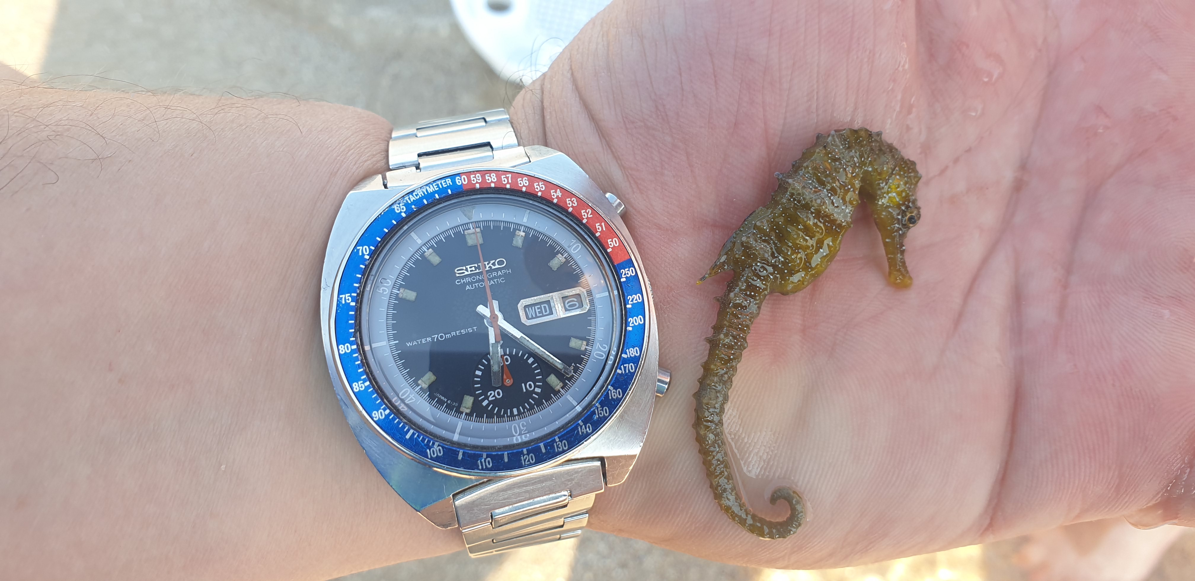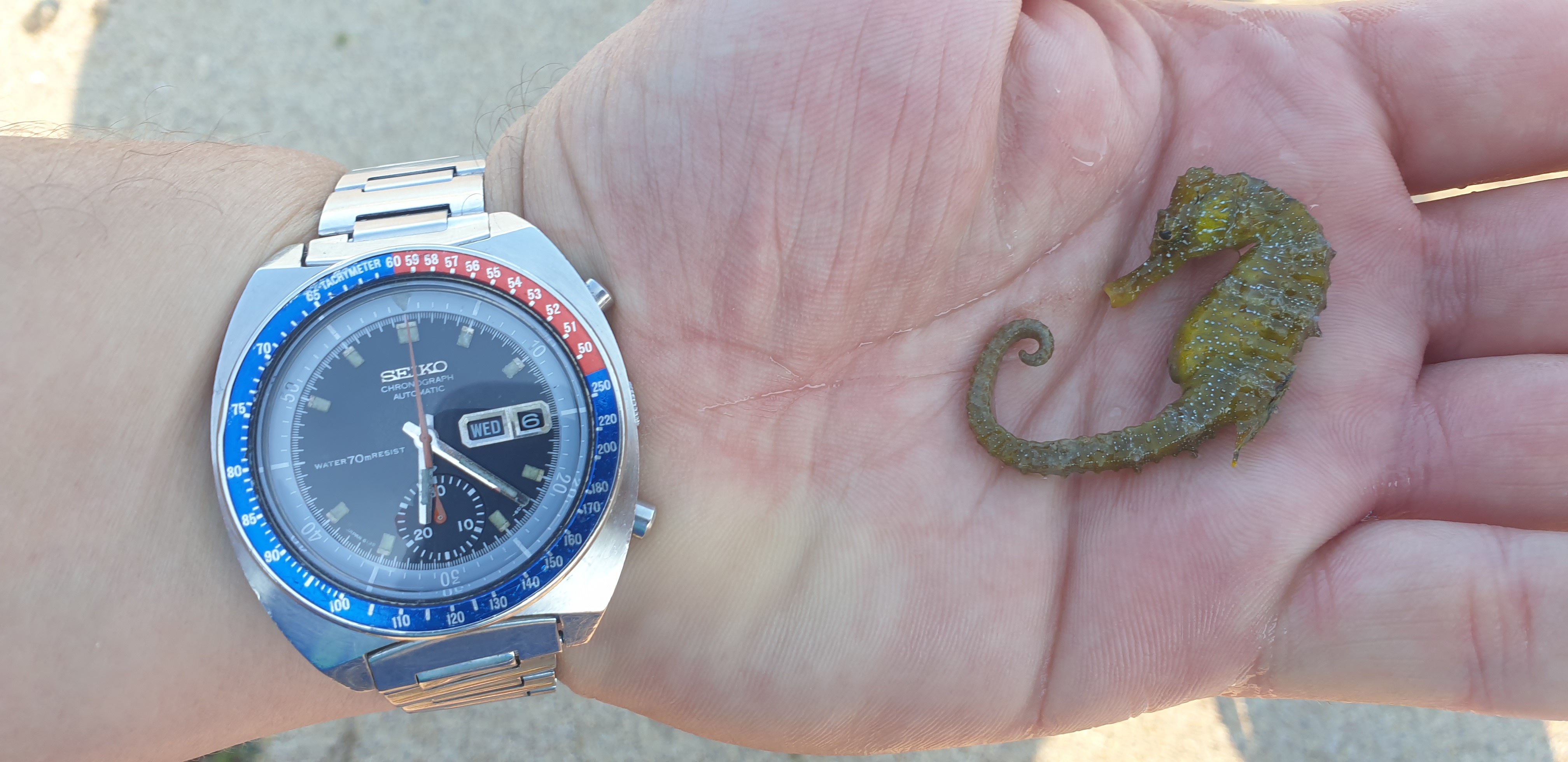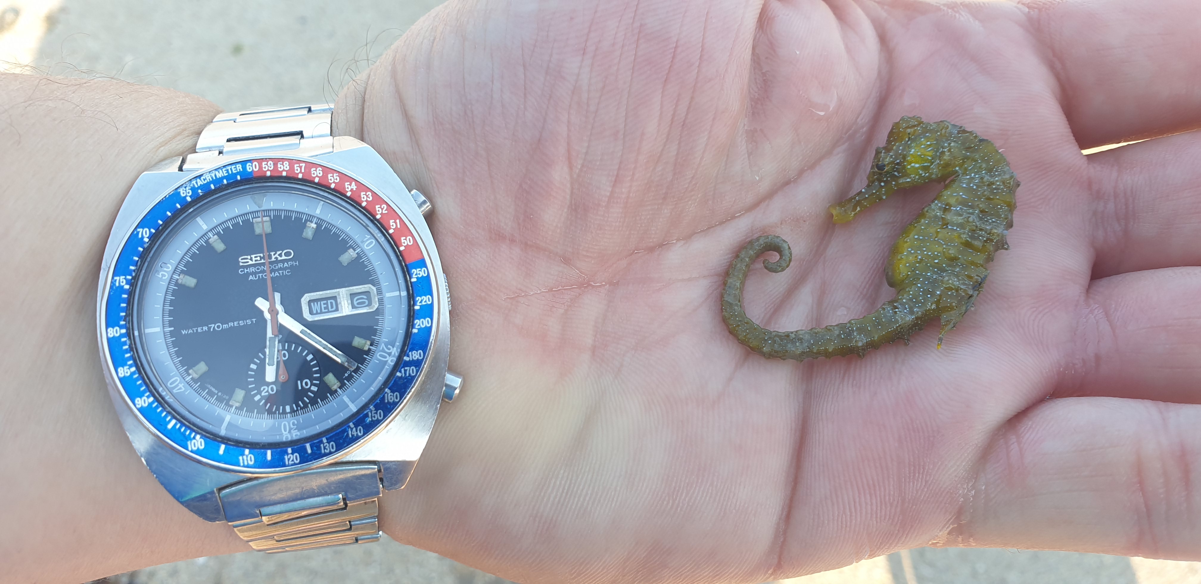 I see and find a seahorse in the sea for the first time. I think he was not in good health. I released it into shallow water with rocks and algae and I hope it recovered...