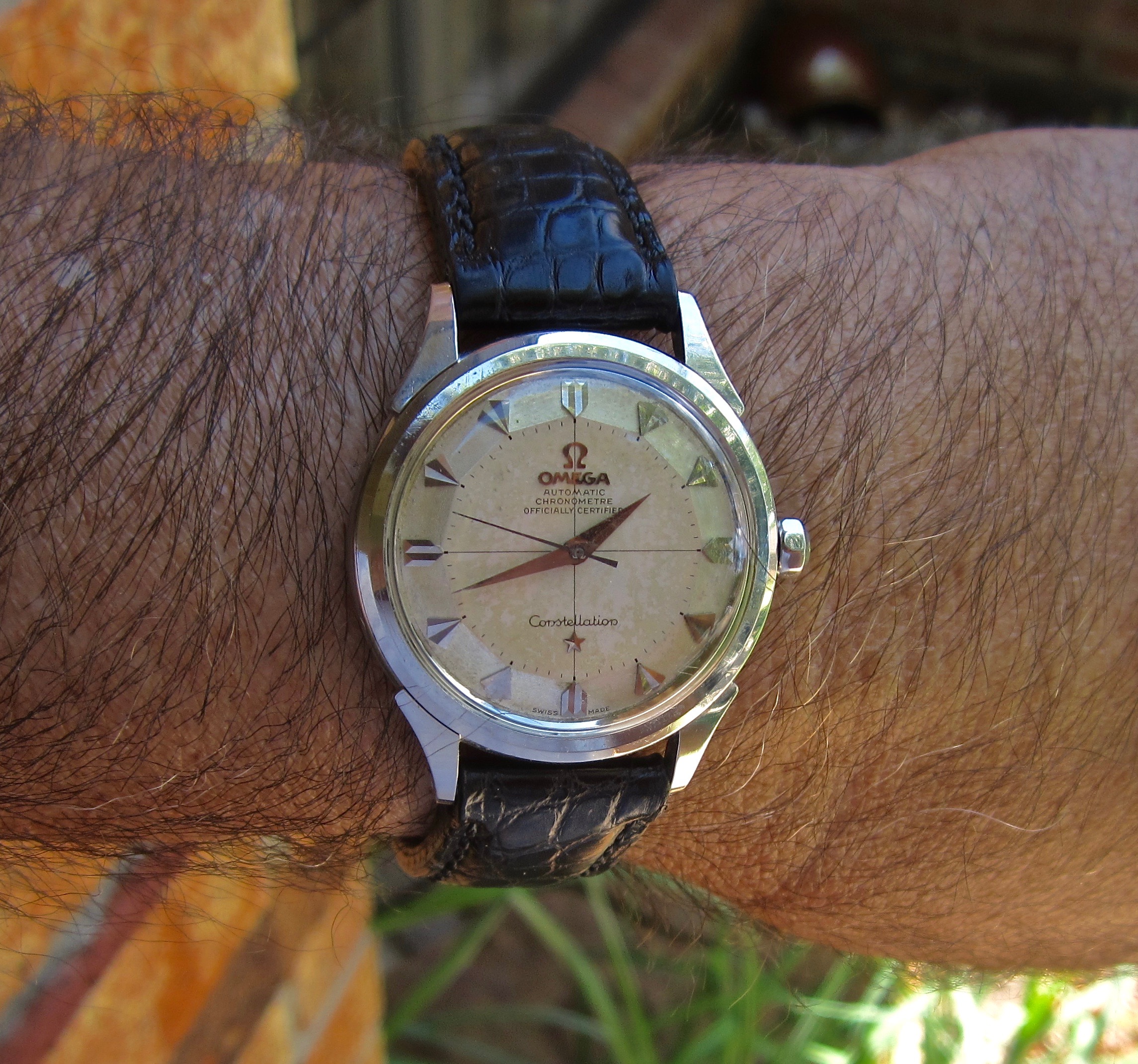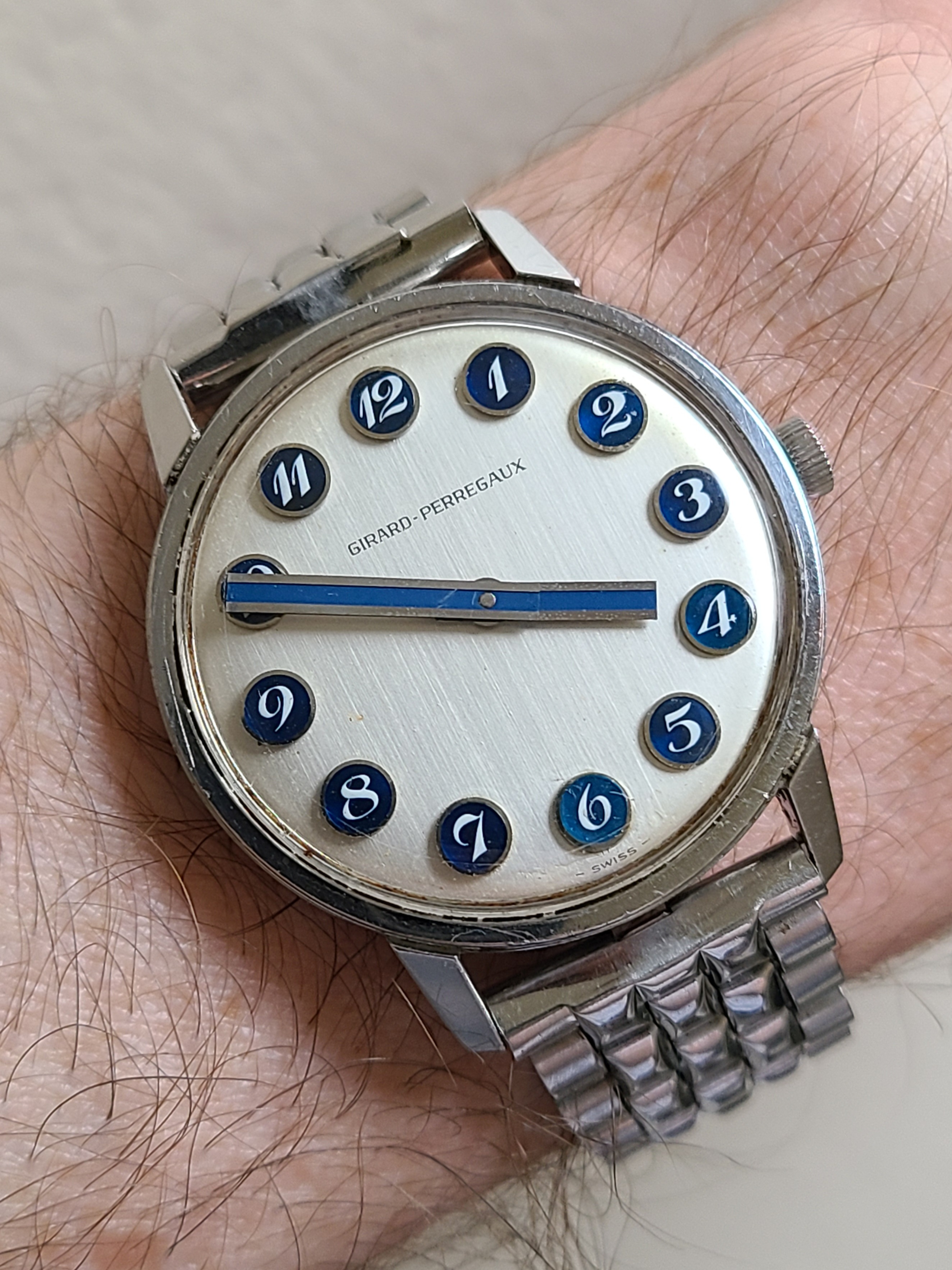 Posts 223 Likes 3,547 DeathandTaxes ·Jul 16, 2022 Wearing my unicorn: 1960s Girard-Perregaux blue breguet telephone dial in steel in original condition (no polishing, no redial, no relume). All other known examples of this model are red or brown numerals in gold plated cases.