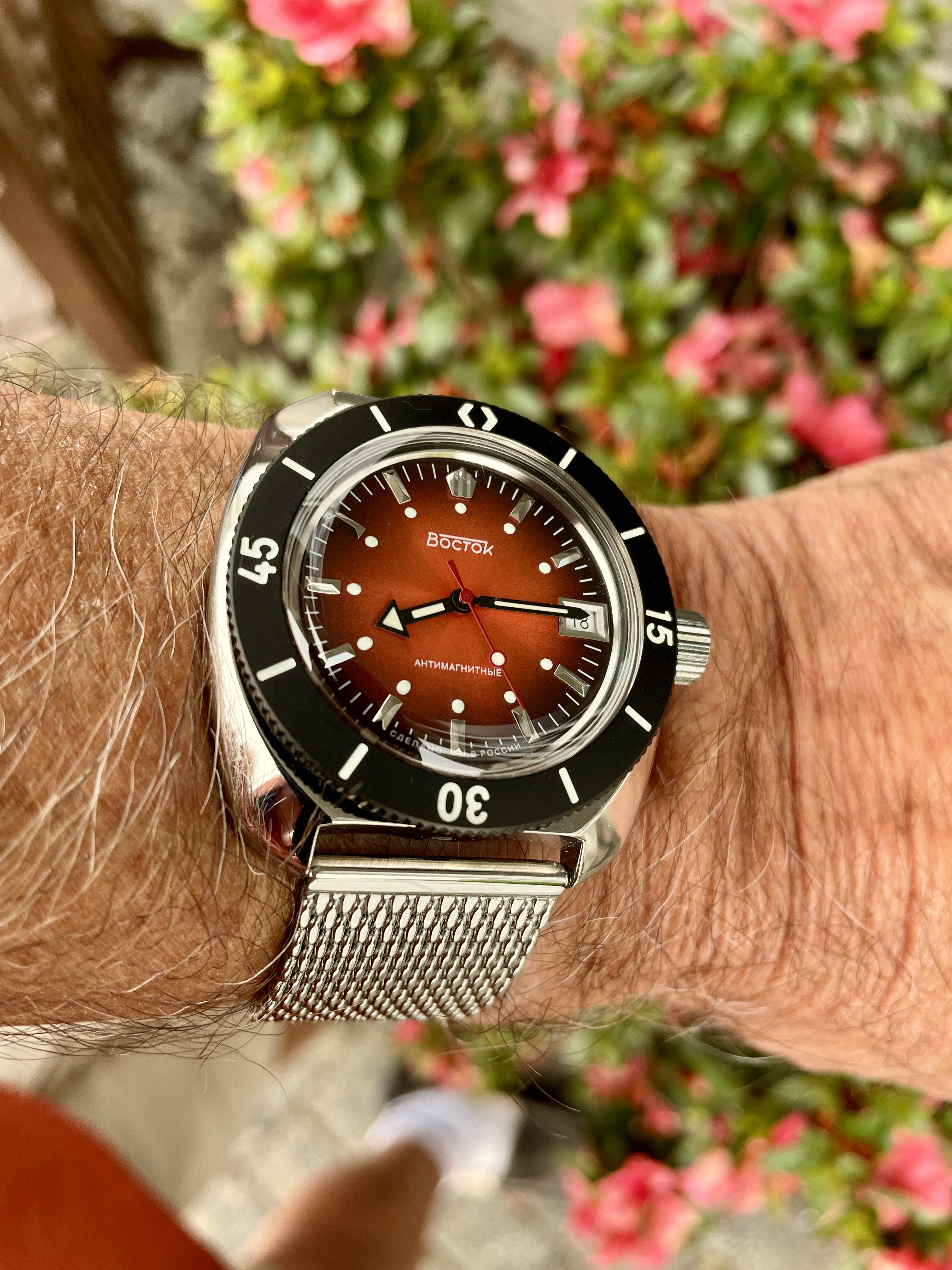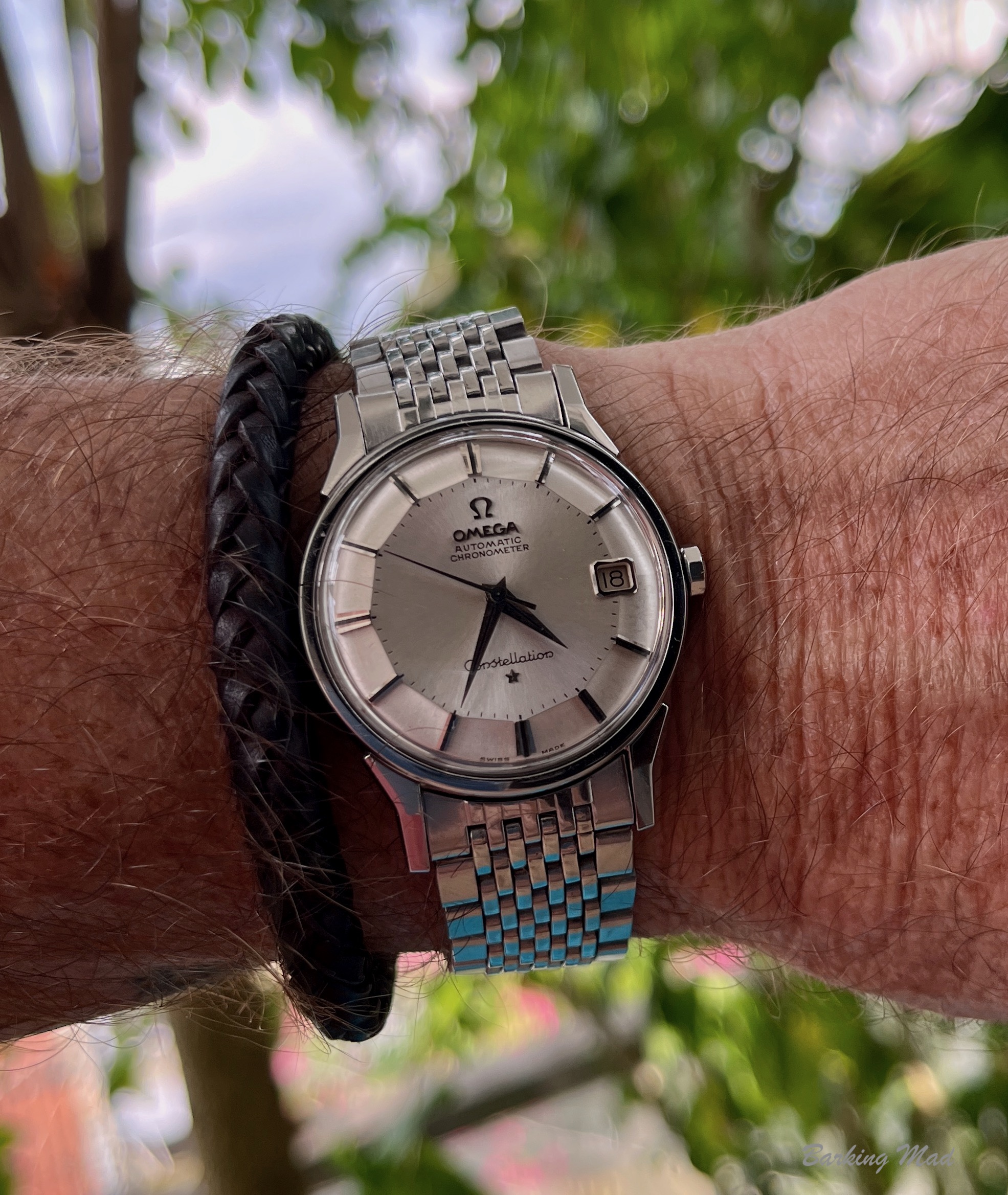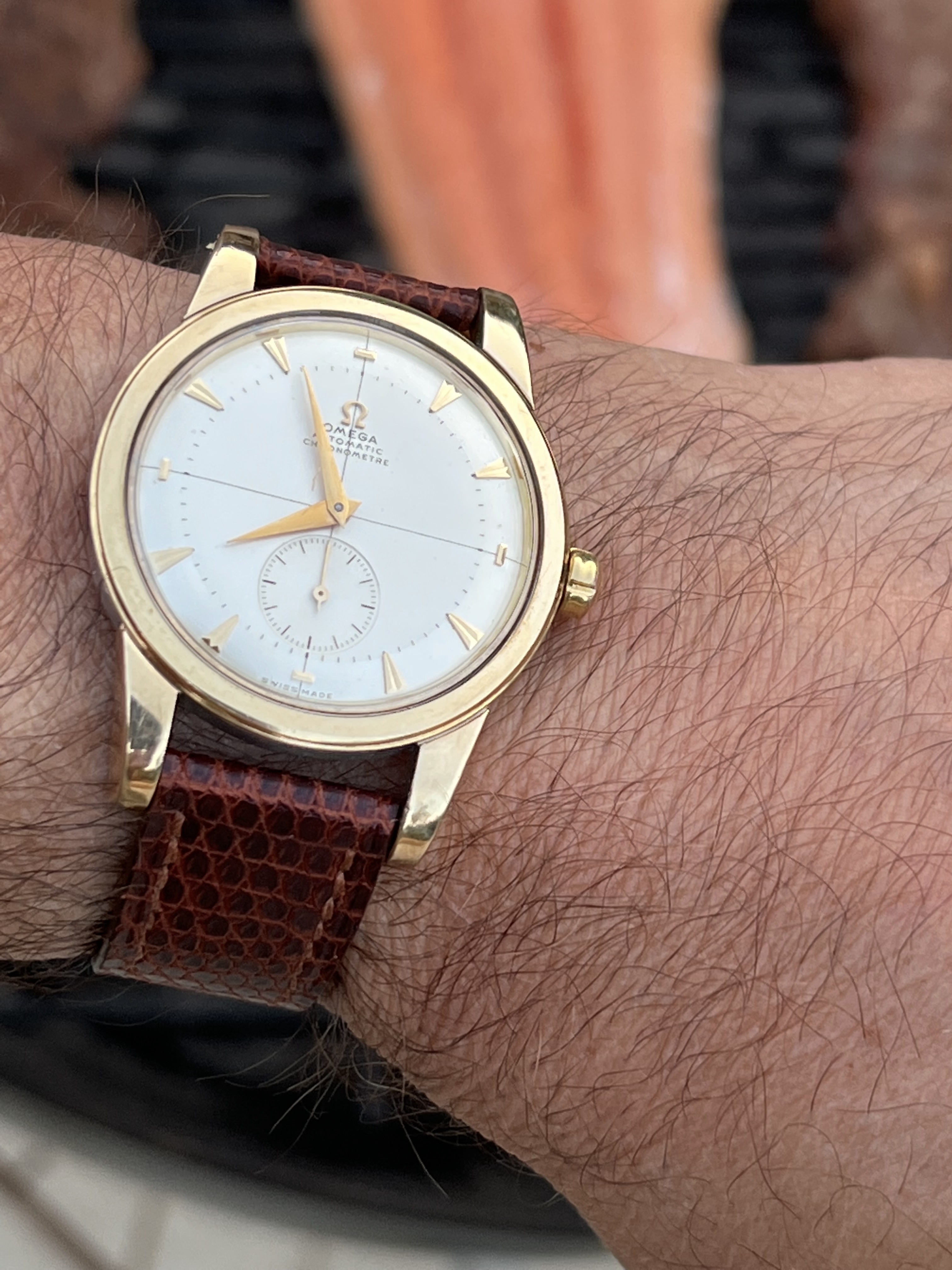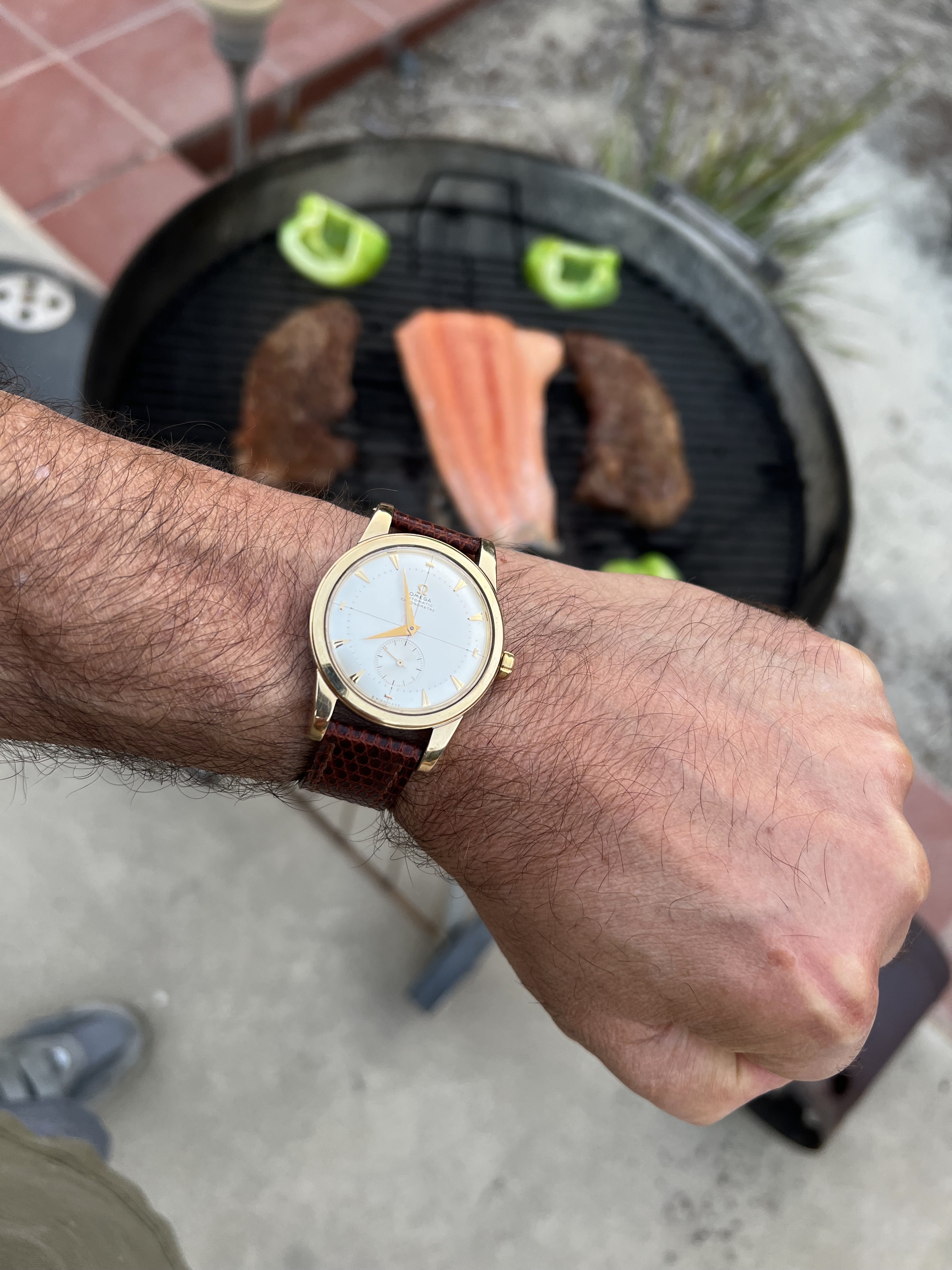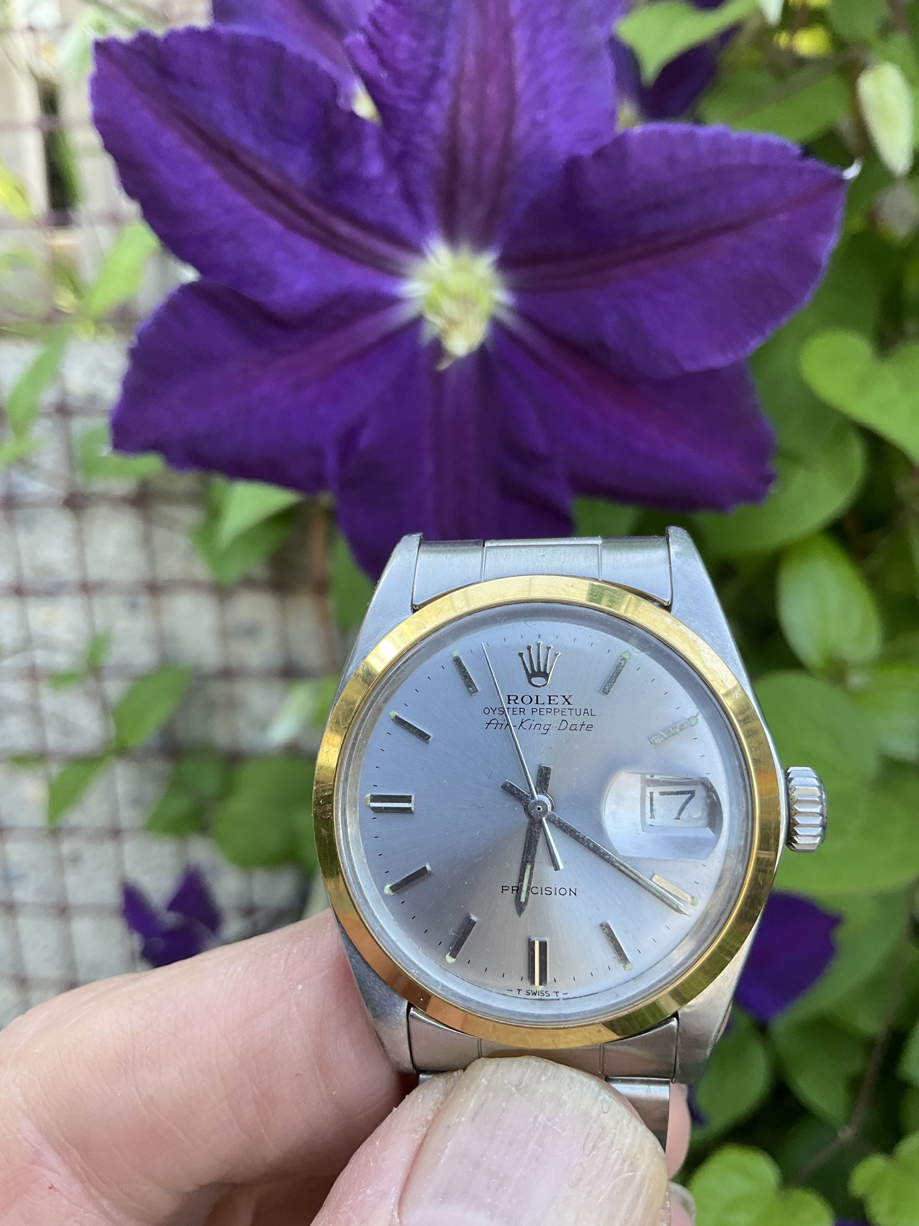 For today, and for a week. My modded 51 year old one owner (me) Rolex Air-King Date. Pictured next to a clematis flower, off my wrist for the sake of taking the picture. There are two clematis plants in Mrs. C’s perennial garden. The one in the photo is 12 feet tall! We’re headed away to the mountains again, on Tuesday. Planning a hot dog lunch on Wednesday in honour of National Hot Dog Day. Yum, yum!