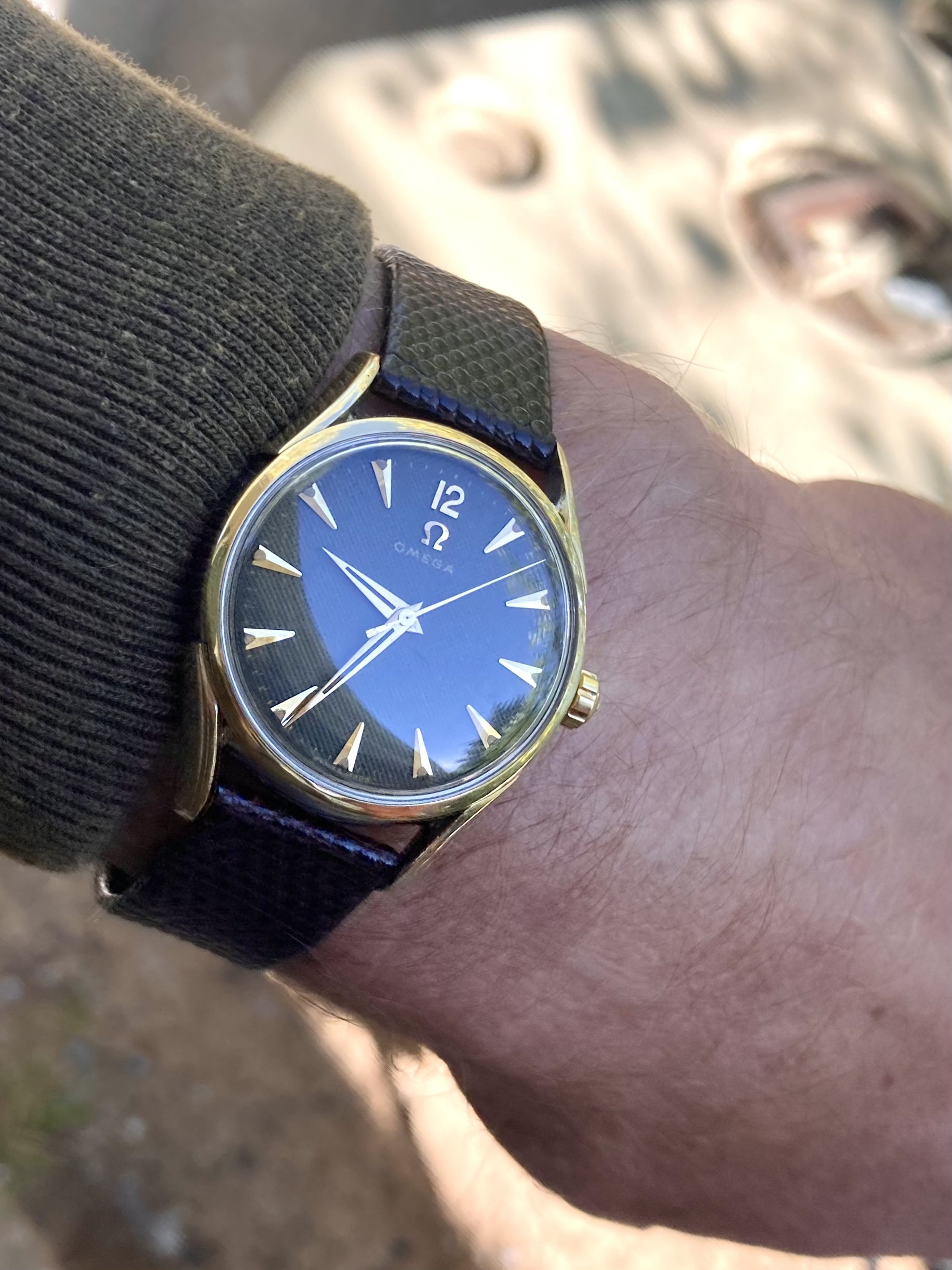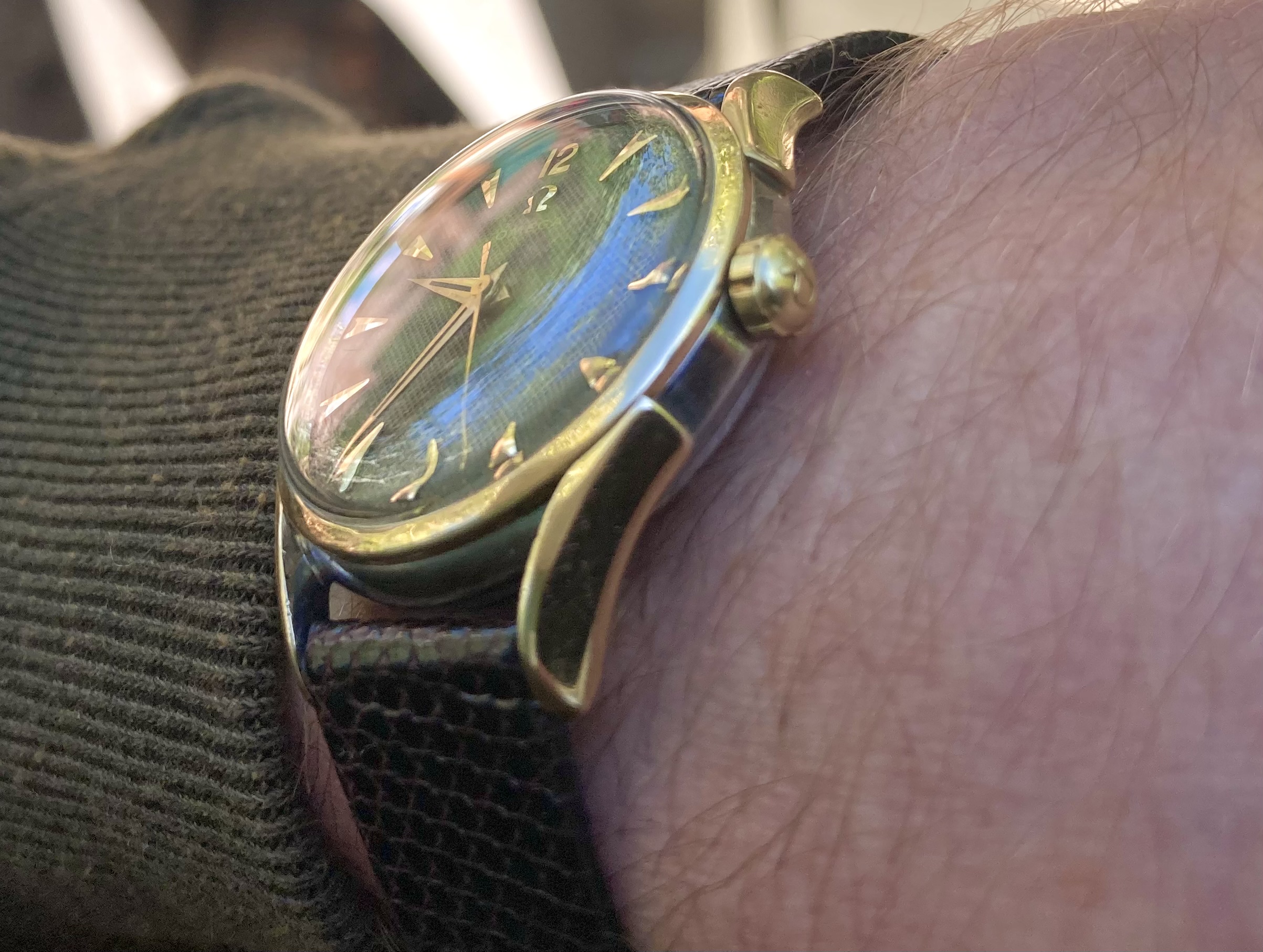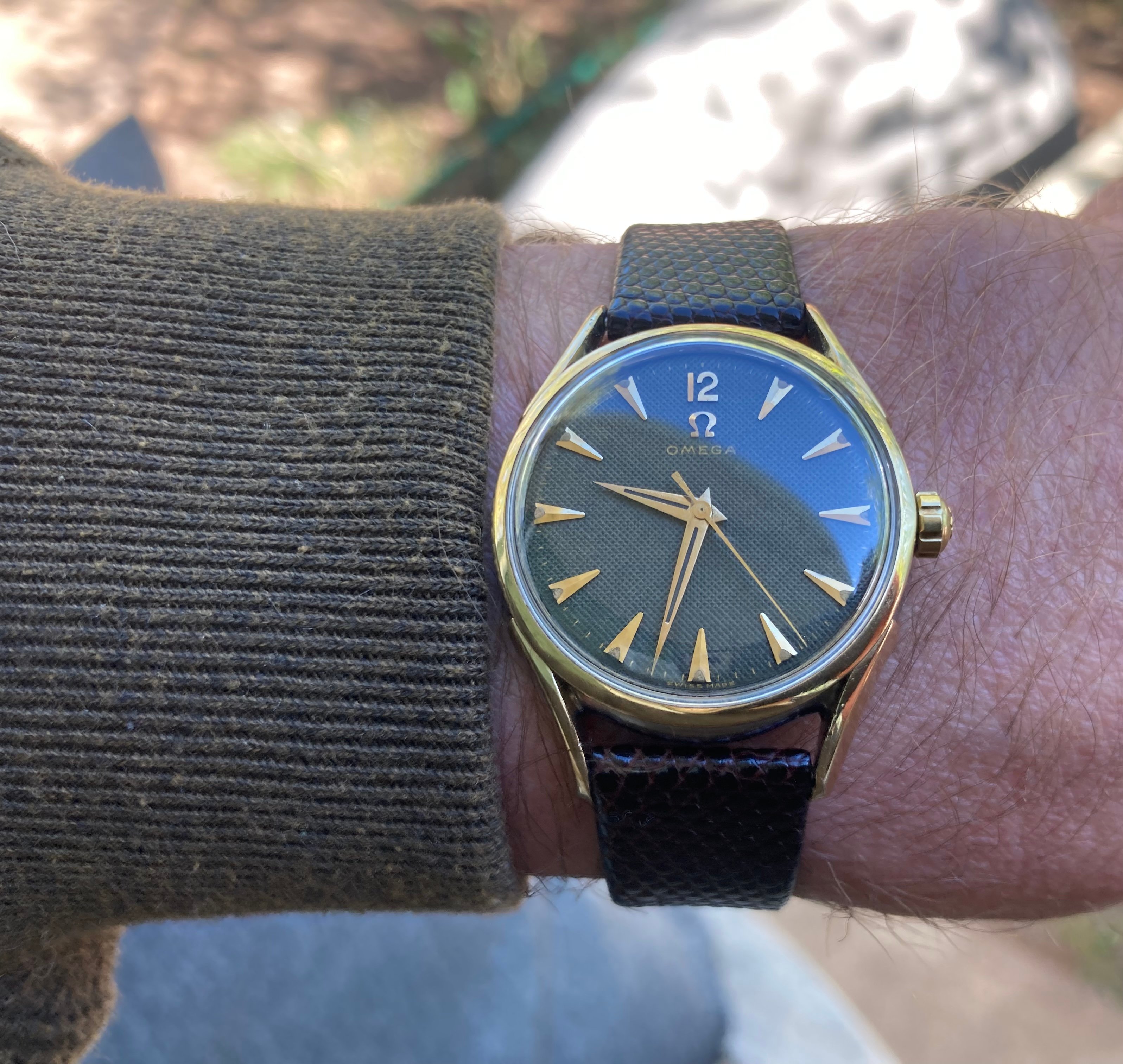 Posts 108 Likes 1,009 ScDevon ·Aug 10, 2022 1953 Waffle Dial. Cal 420. 2-tone stainless / gold case. Vintage lizard strap.