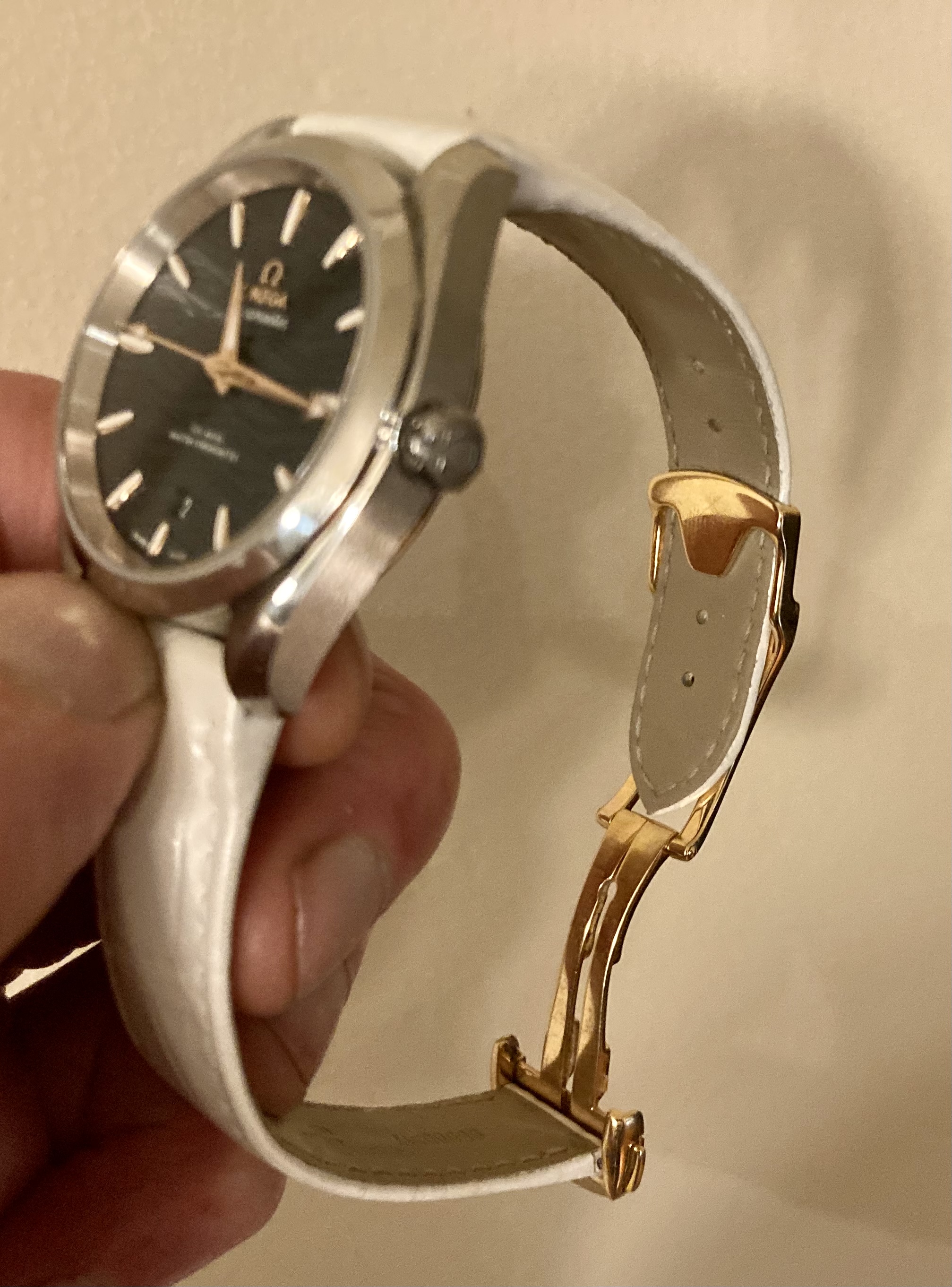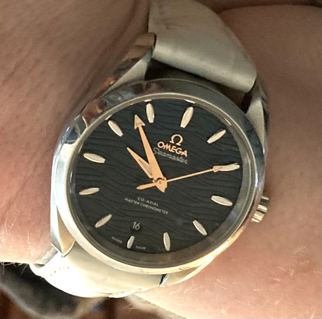 Posts 102 Likes 890 ScDevon ·Aug 16, 2022 The Mrs.is wearing her wave dial Aqua Terra with 18k Sedna clasp and Omega white alligator strap. Cal 8800