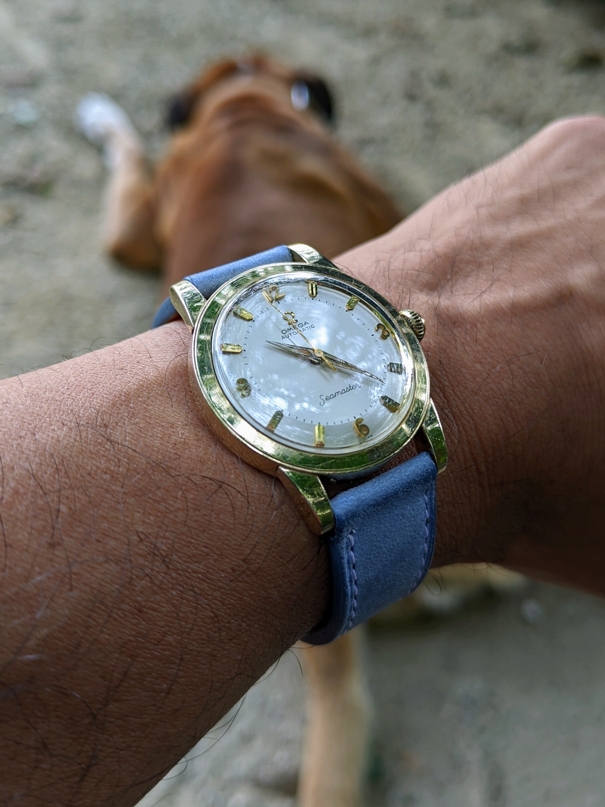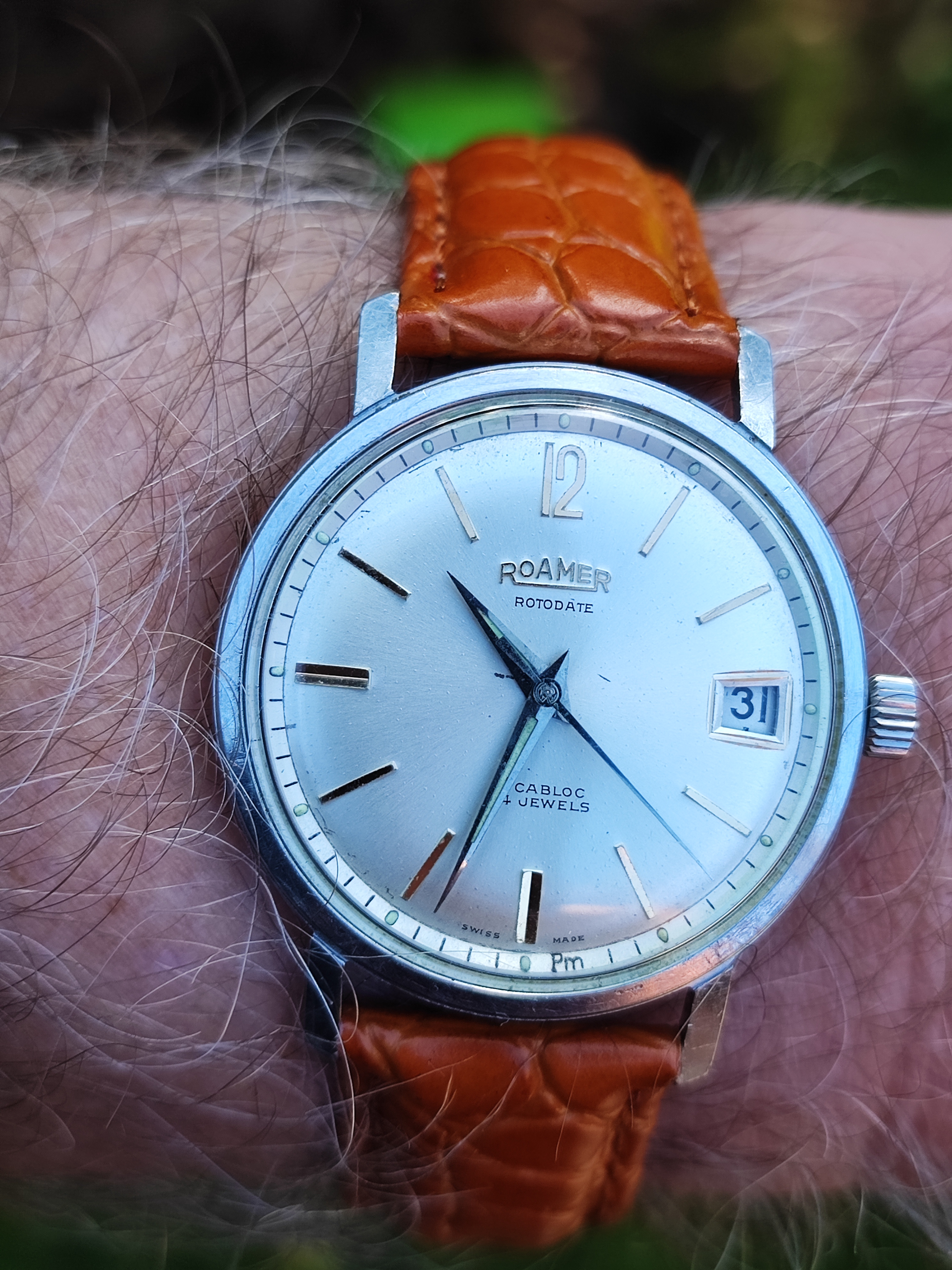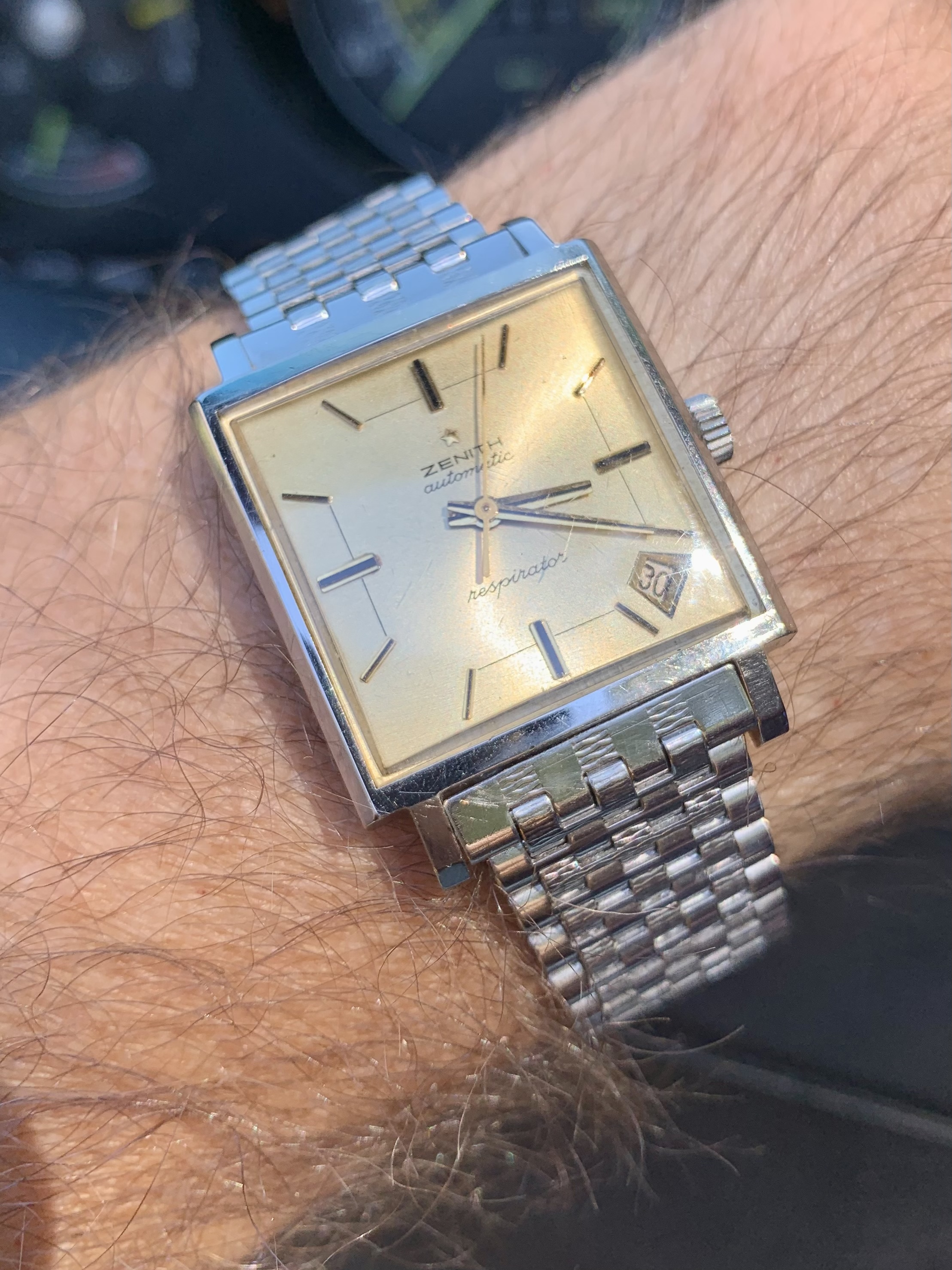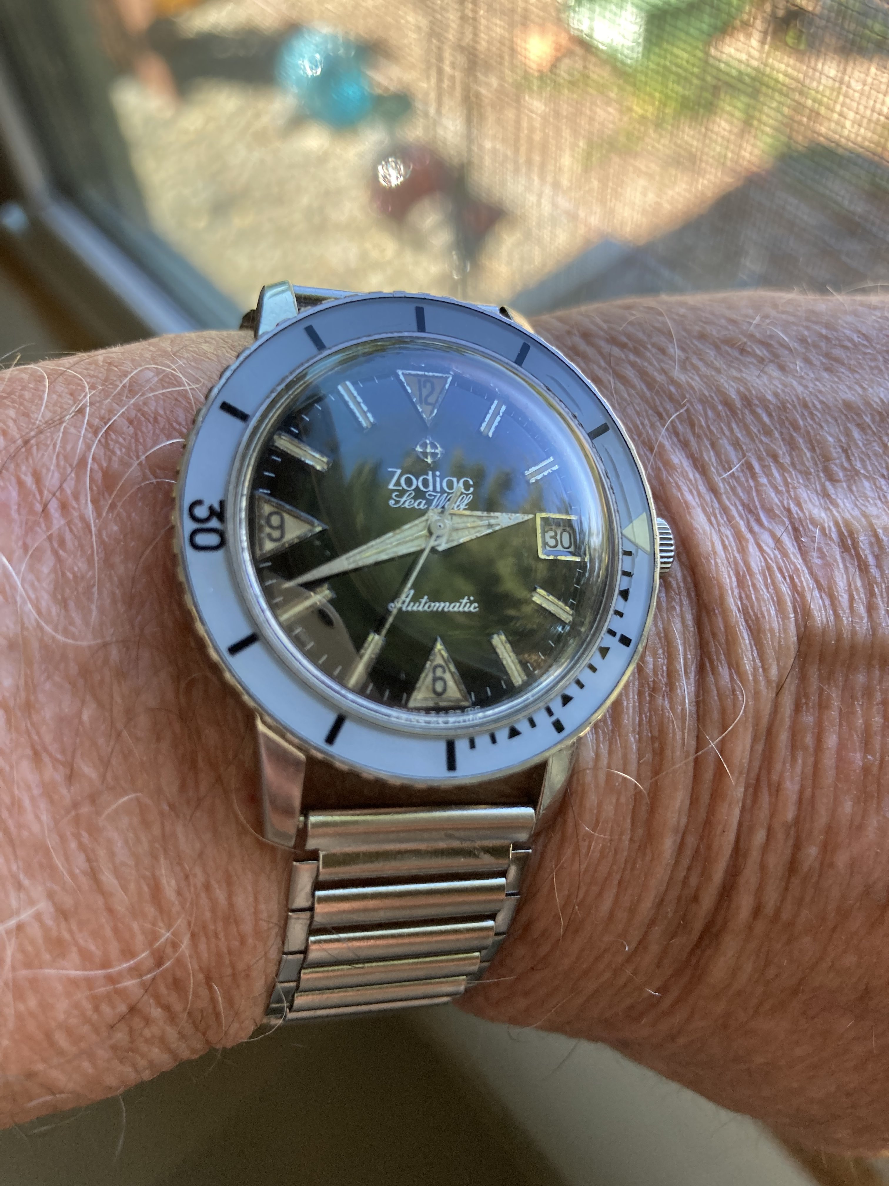 There is just one nice example in green (my favorite) but overpriced (and missing bracelet). There is a similar variant that includes four bezel colors (green, red, blue, black). No idea how they collected four of these rare bakelite bezels. The hands on this version, however, are not orange, so not the same. The orange hands really add to the cool factor along with colored bezel.