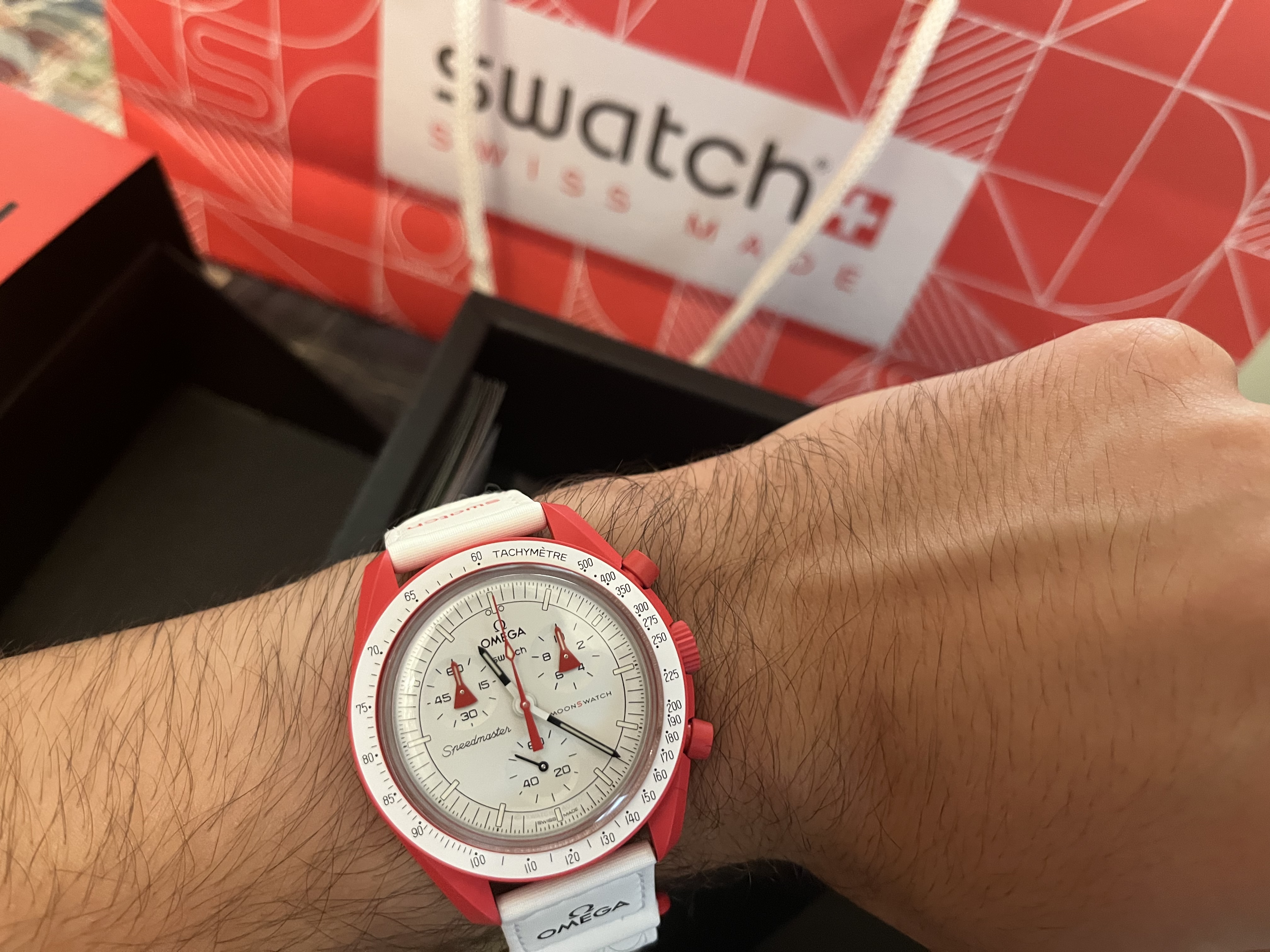 I picked this up at my local Swatch store yesterday. Pretty happy. Only had to wait in line about 20 minutes. Have a good day all.