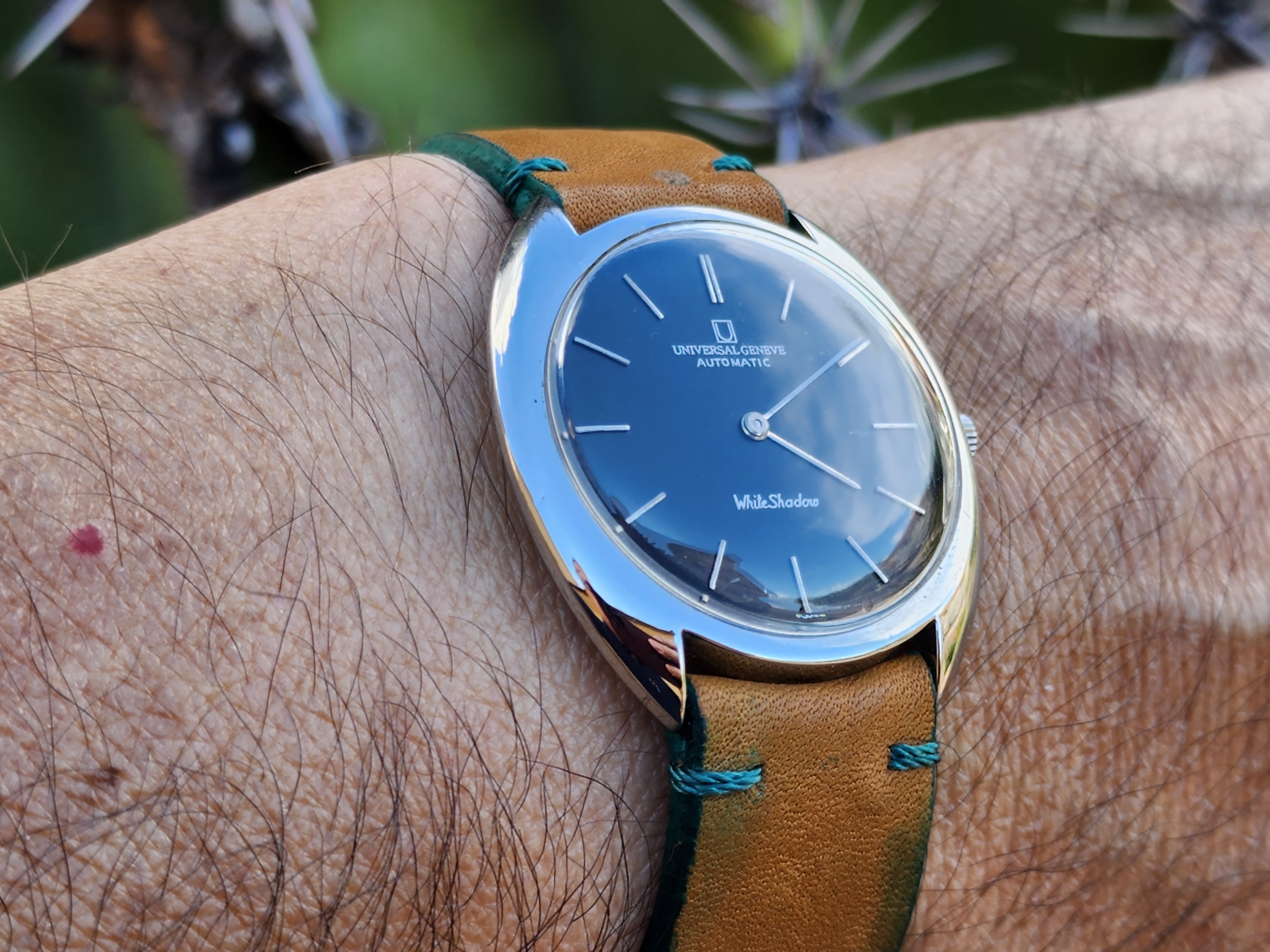 Got another beautiful Gerald Genta watch today: a Universal Genève White Shadow with an in-house, micro-rotor automatic movement. It was the world’s thinnest automatic movement (2.5mm) for over a decade after its introduction in the mid-60's. Today if one wants a slim in-house microrotor, you've to buy a Patek.