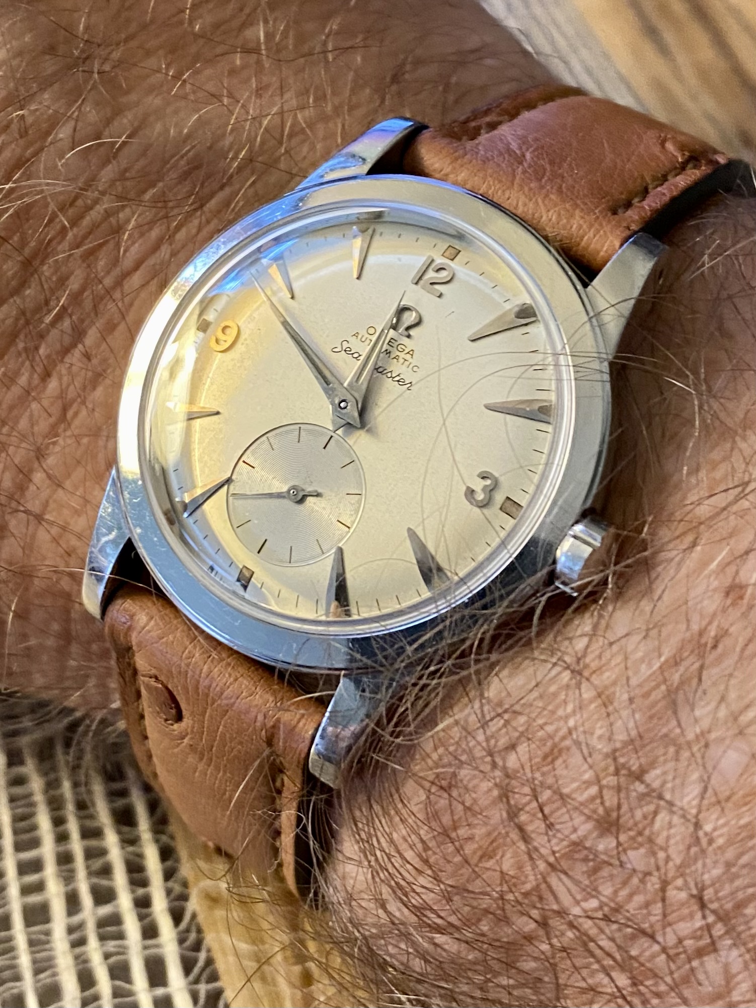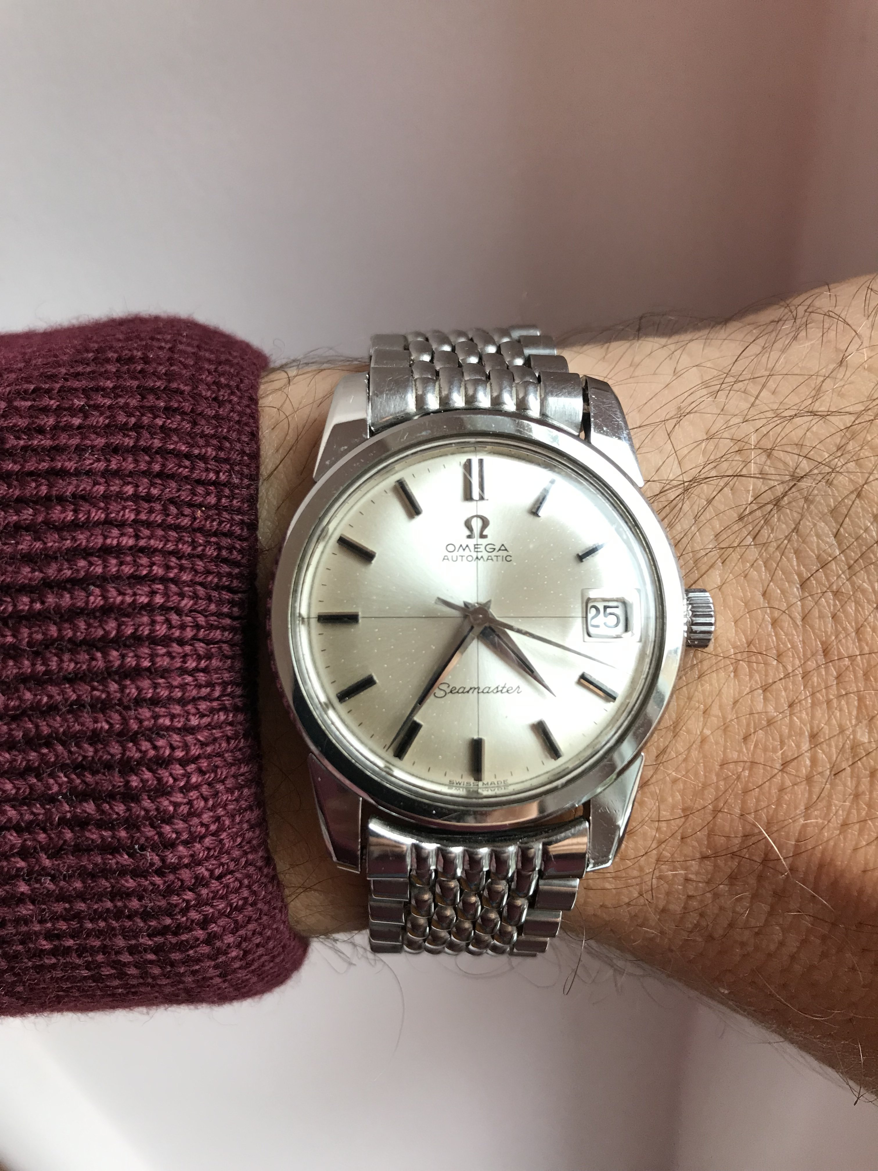 Wearing the original Seamaster at home on a lazy, rainy Sunday. Pot roast on the stove top for Sunday dinner and a surprise birthday party for my sister this evening. Life is good.