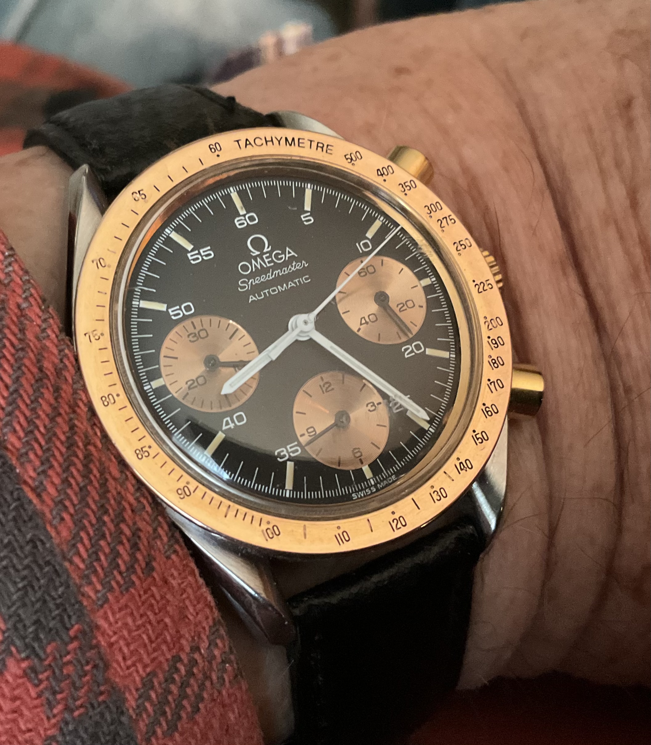 Canadian Thanksgiving, today. All the best to Canucks on the MB. Guests for dinner, later. This demands two ”special” watches. My Hamilton 950B on my @DaveK miracle braid lanyard, and my Omega Speedmaster Reduced, 175.0033 from 1988, 18-karat rose gold bezel and rose gold sub dials, steel case, black shark skin strap.