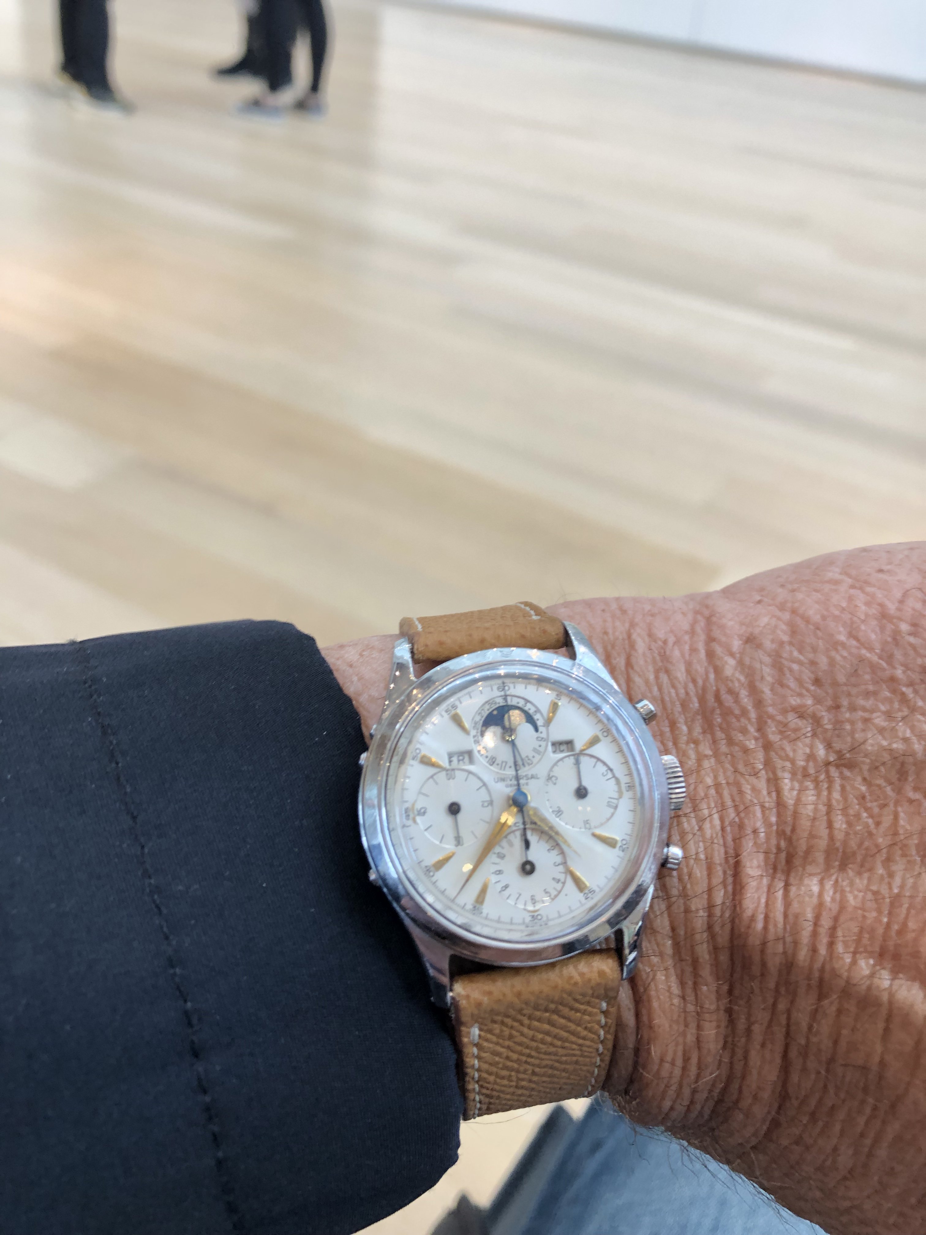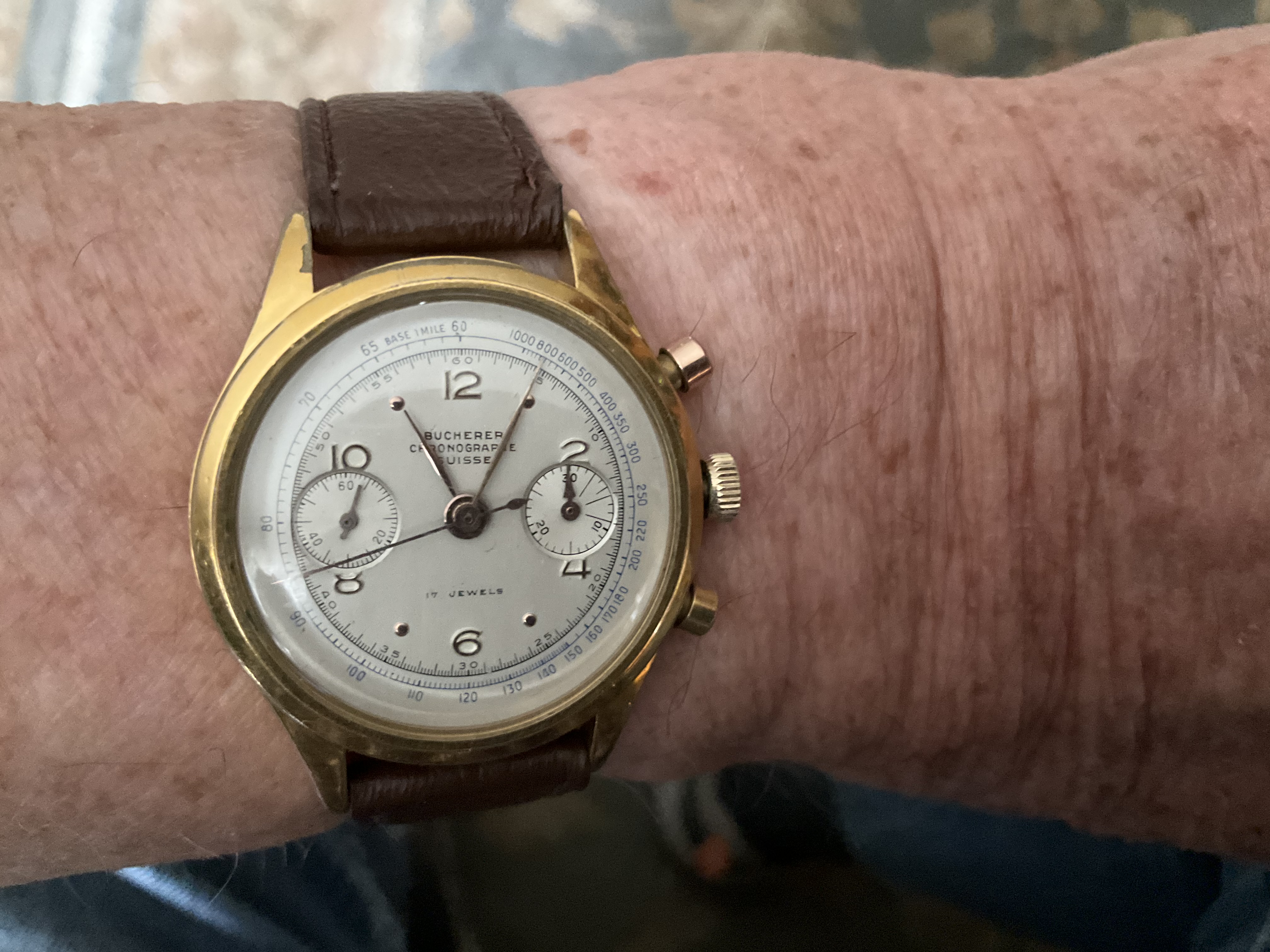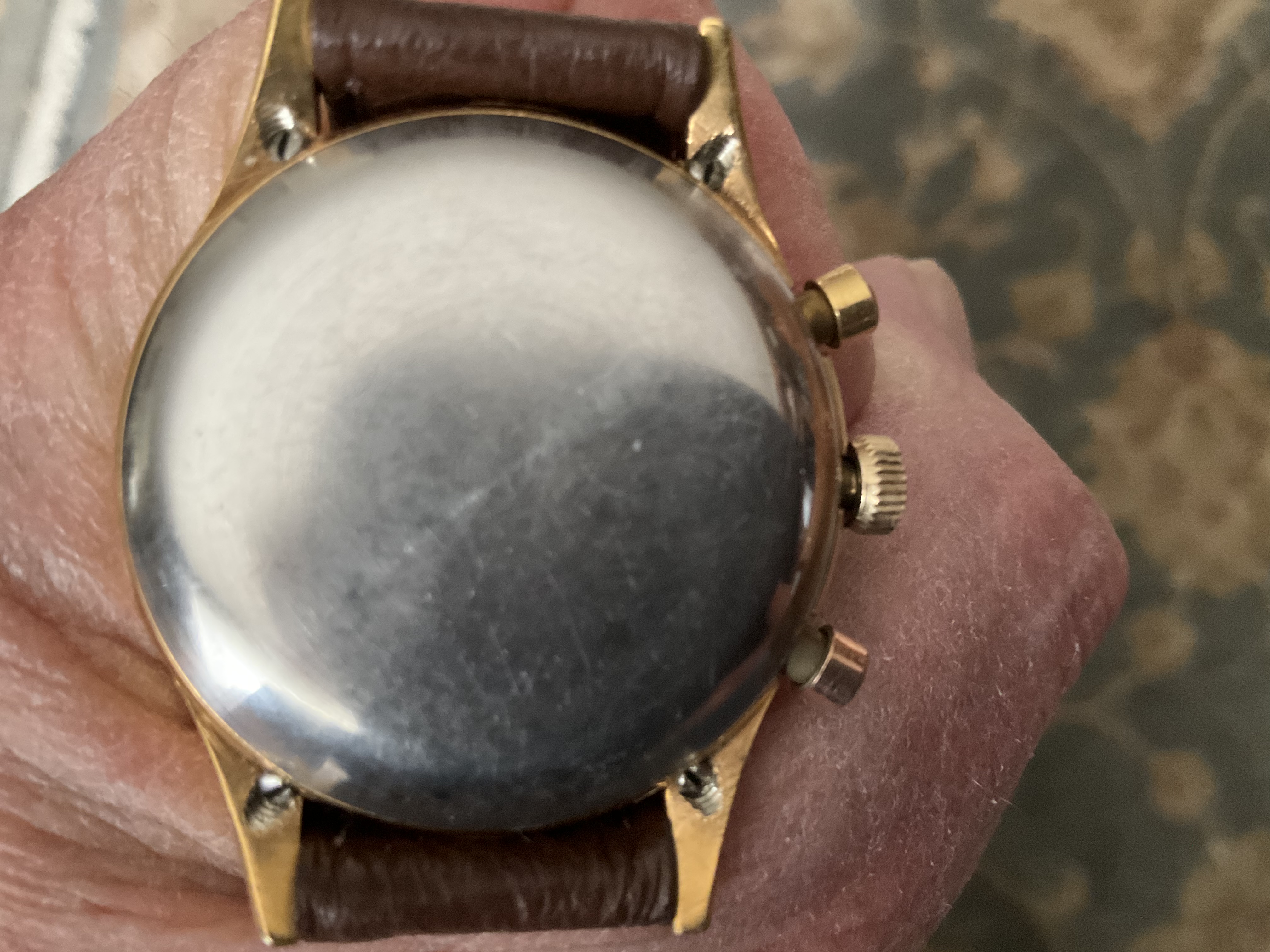 Posted recently on the “projects” thread. Late 1950s (?) Bucherer two-register chronograph, manual wind, 12-Ligne, Langendorf calibre 48 movement. On a back burner for a decade, finally returned to the rotation. Clamshell case, steel back, gold filled bezel, case held together with four “grub” screws, one behind each lug. Examples of similar watches with different dial names posted recently in the WRUW thread recently. Wyler being one. Mine is no beauty, but I’ll enjoy finally being able to wear it.