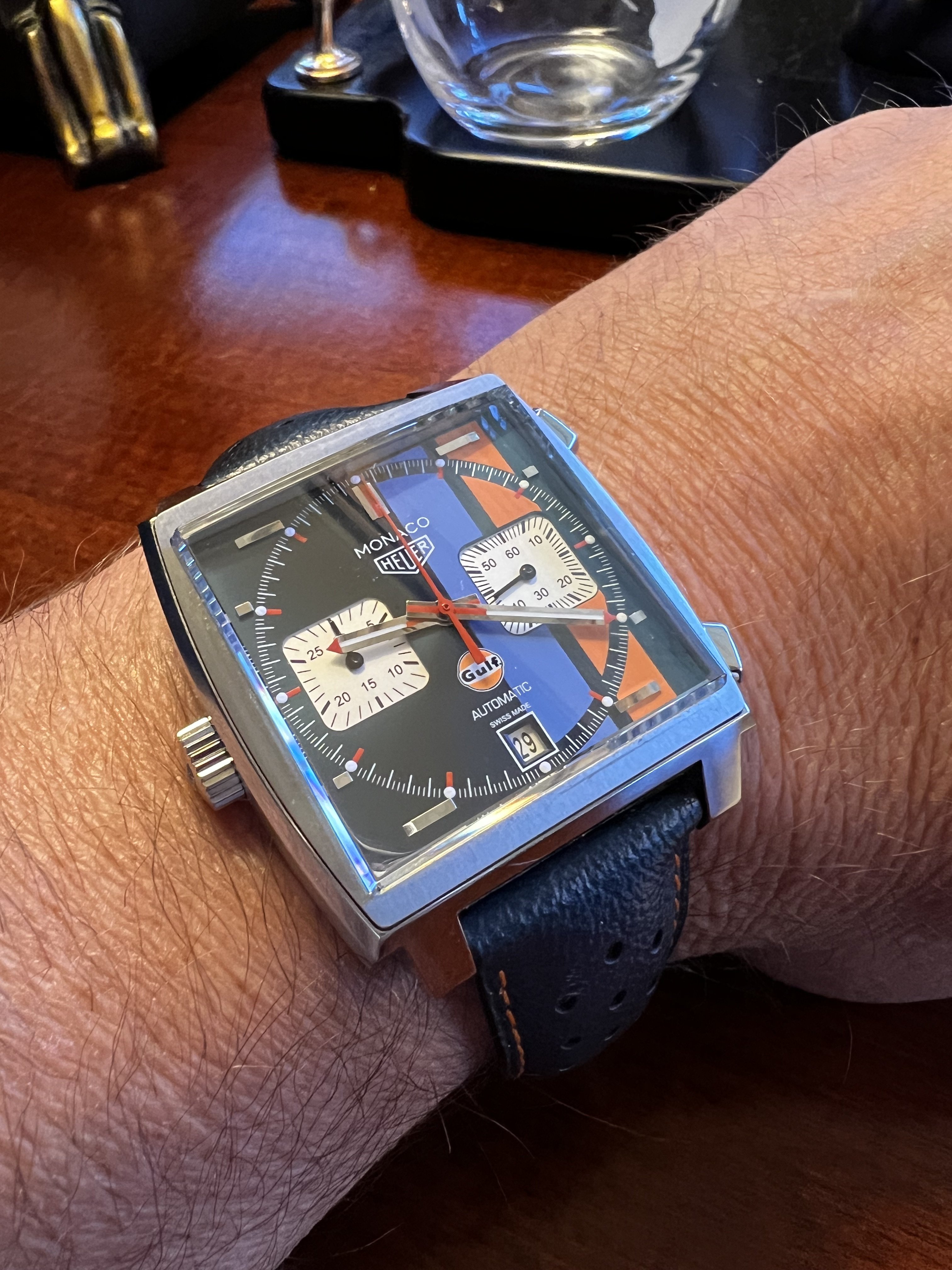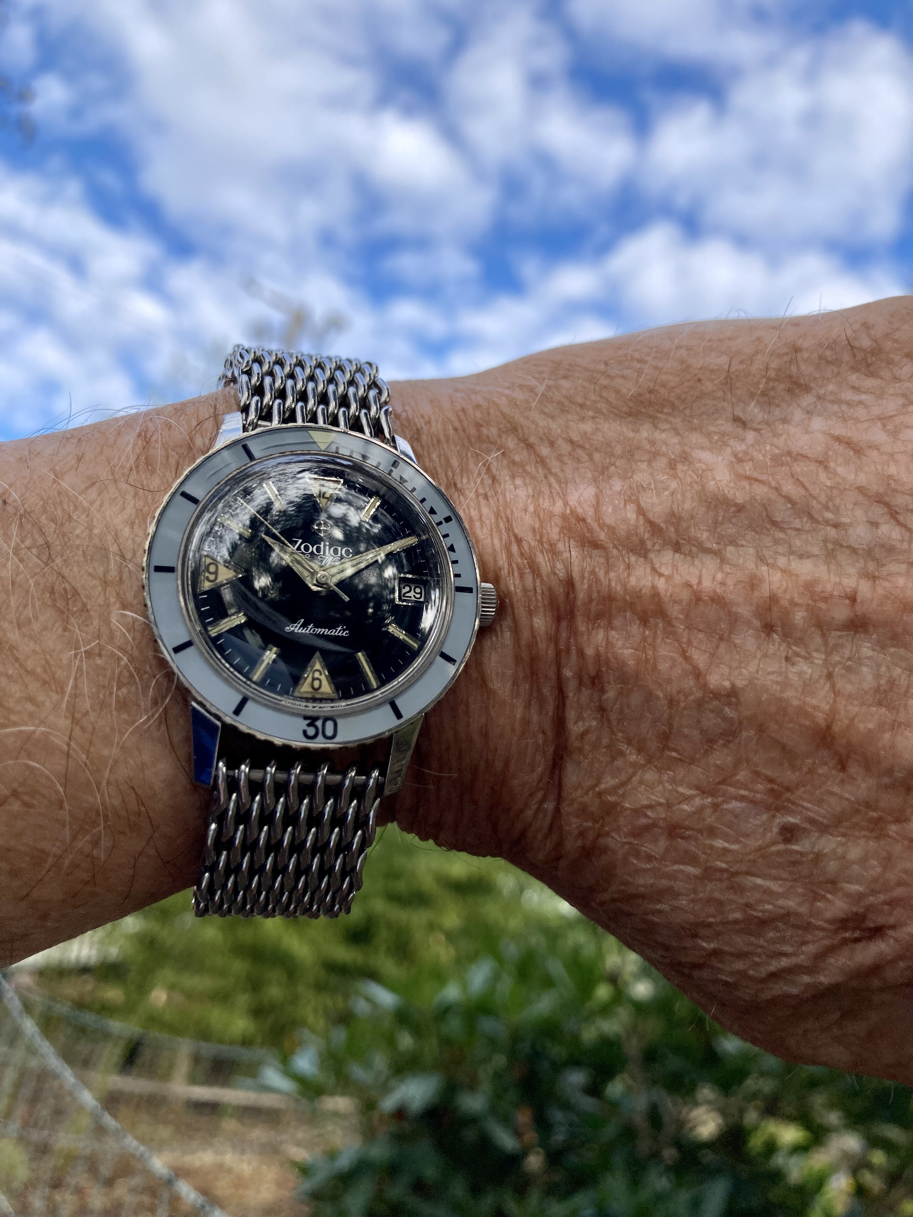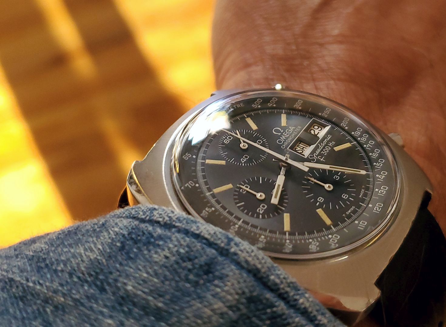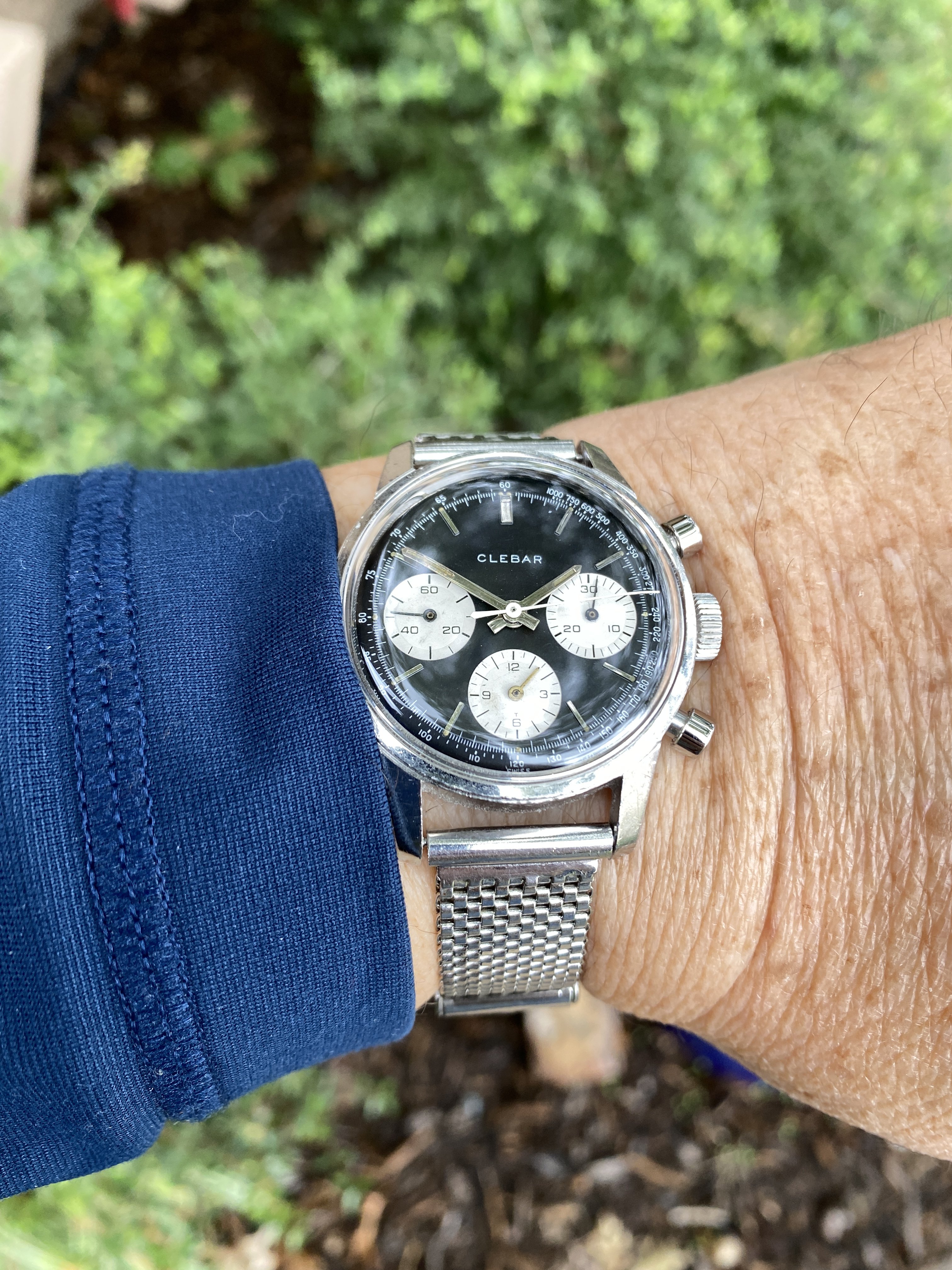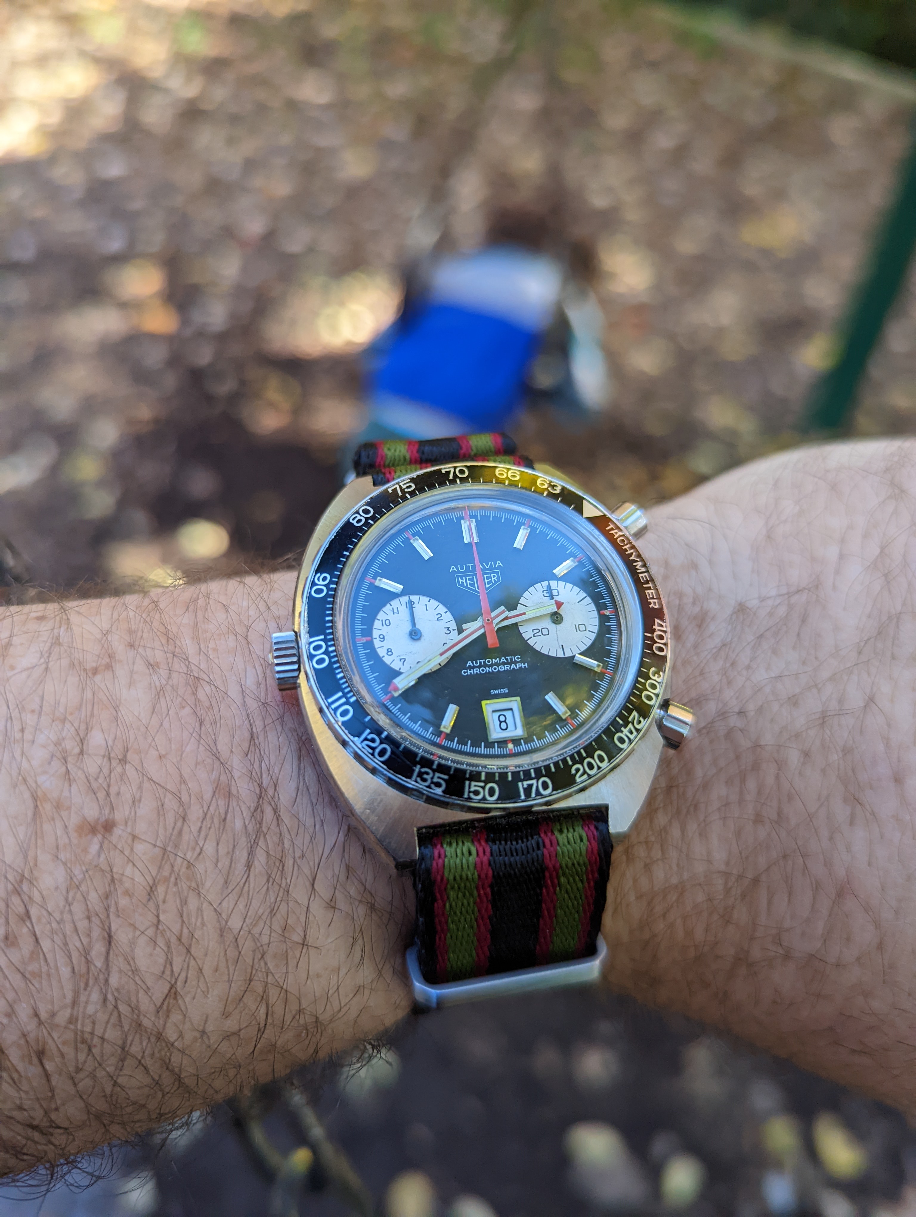 just signed for this today, a Titus Calypsomatic 7986 (between 4 & 5 is a faint scratch not he crystal, not the dial). Stunning dial with gorgeous lume and a date that rotates between red for even and blue for odd, beautifully faded bezel, original big crown, and lovely caseback.