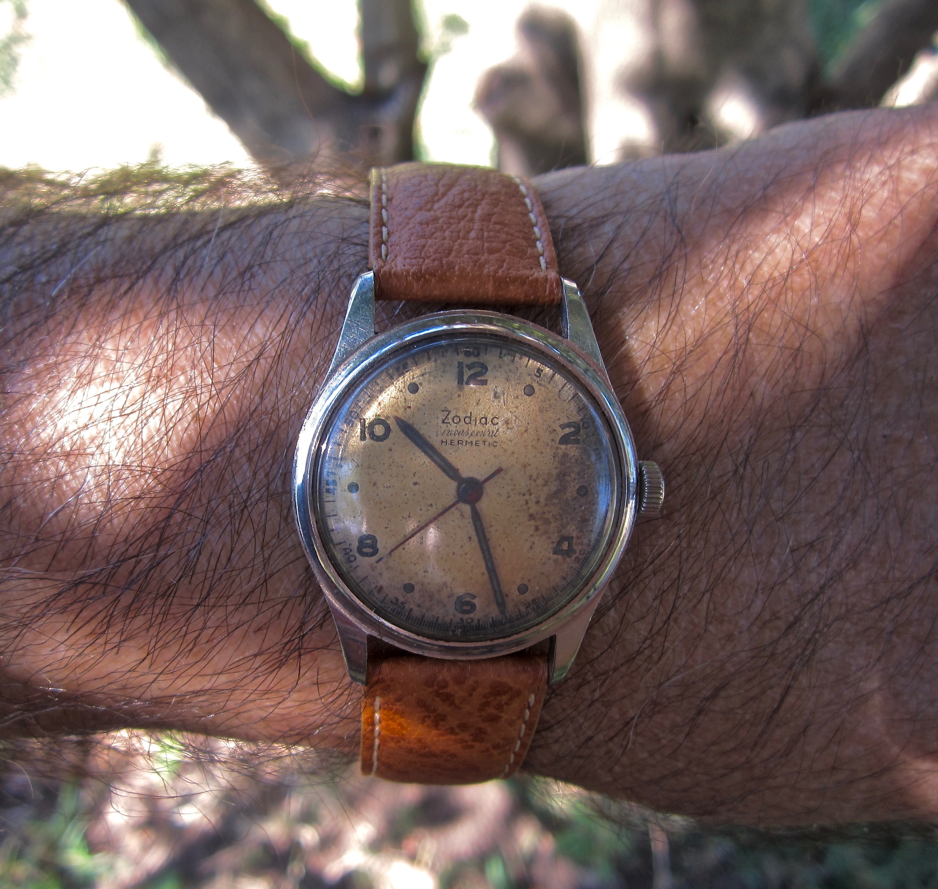 Was a $5 Ebay purchase years ago because I felt sorry for it. A Zodiac Hermetic Incasecurit, it lives in the Home For Wayward Watches. I had it serviced, put a new pigskin strap on it and it's serviceable and ready to go, yet never chosen.