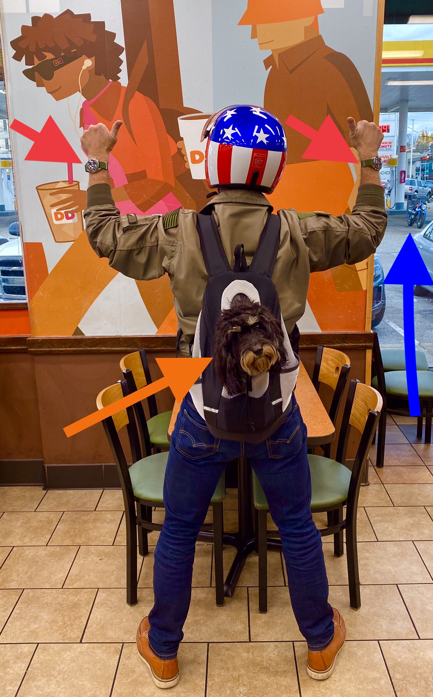 On days off from work, I try to do all sorts of fun stuff at the same time and get a pic…like today, I took our puppy named “Dunkin’” to Dunkin’ on his way back from the dog park…on my Honda Monkey…while wearing my 861 and 1861…good times! 👍