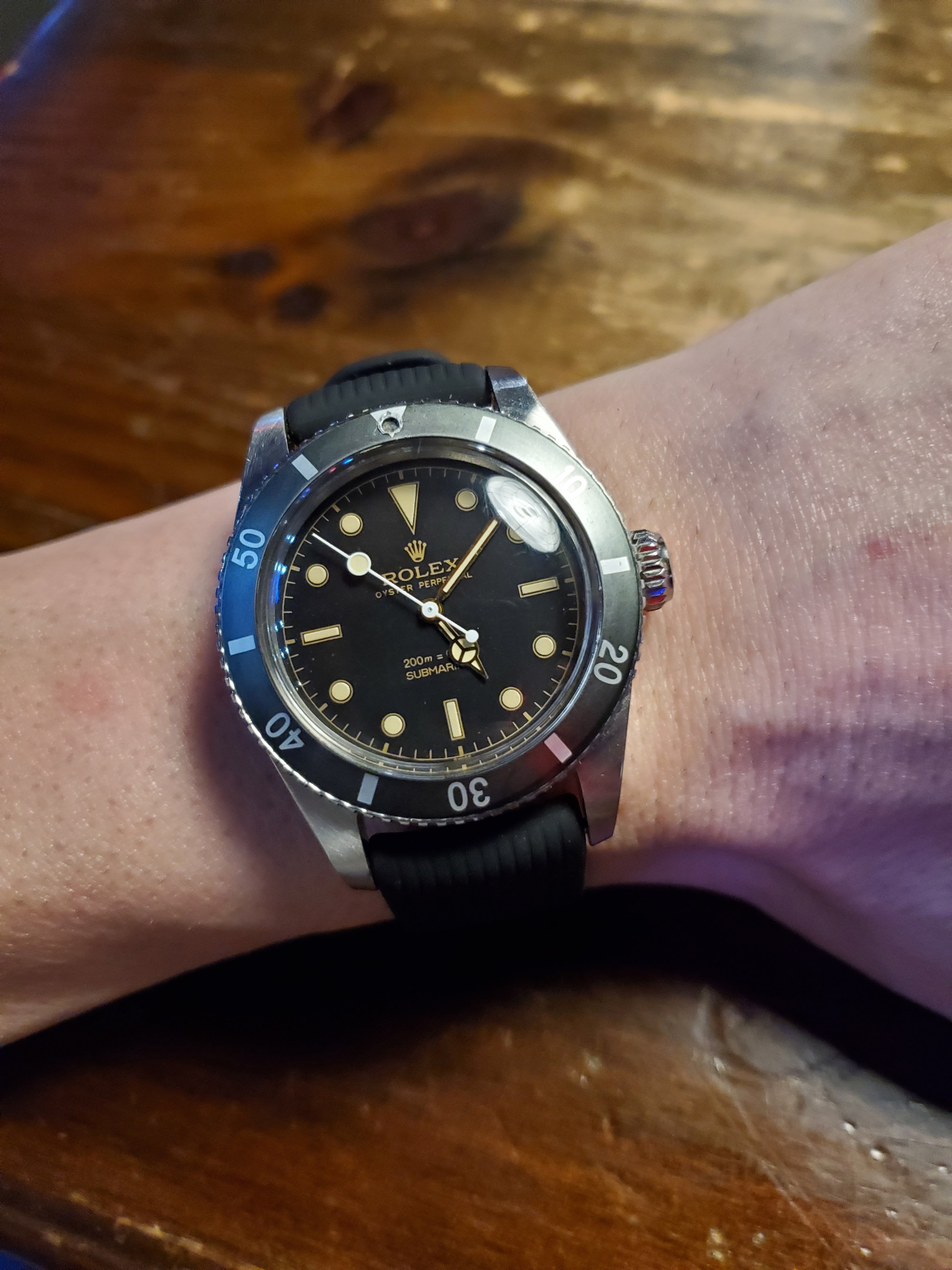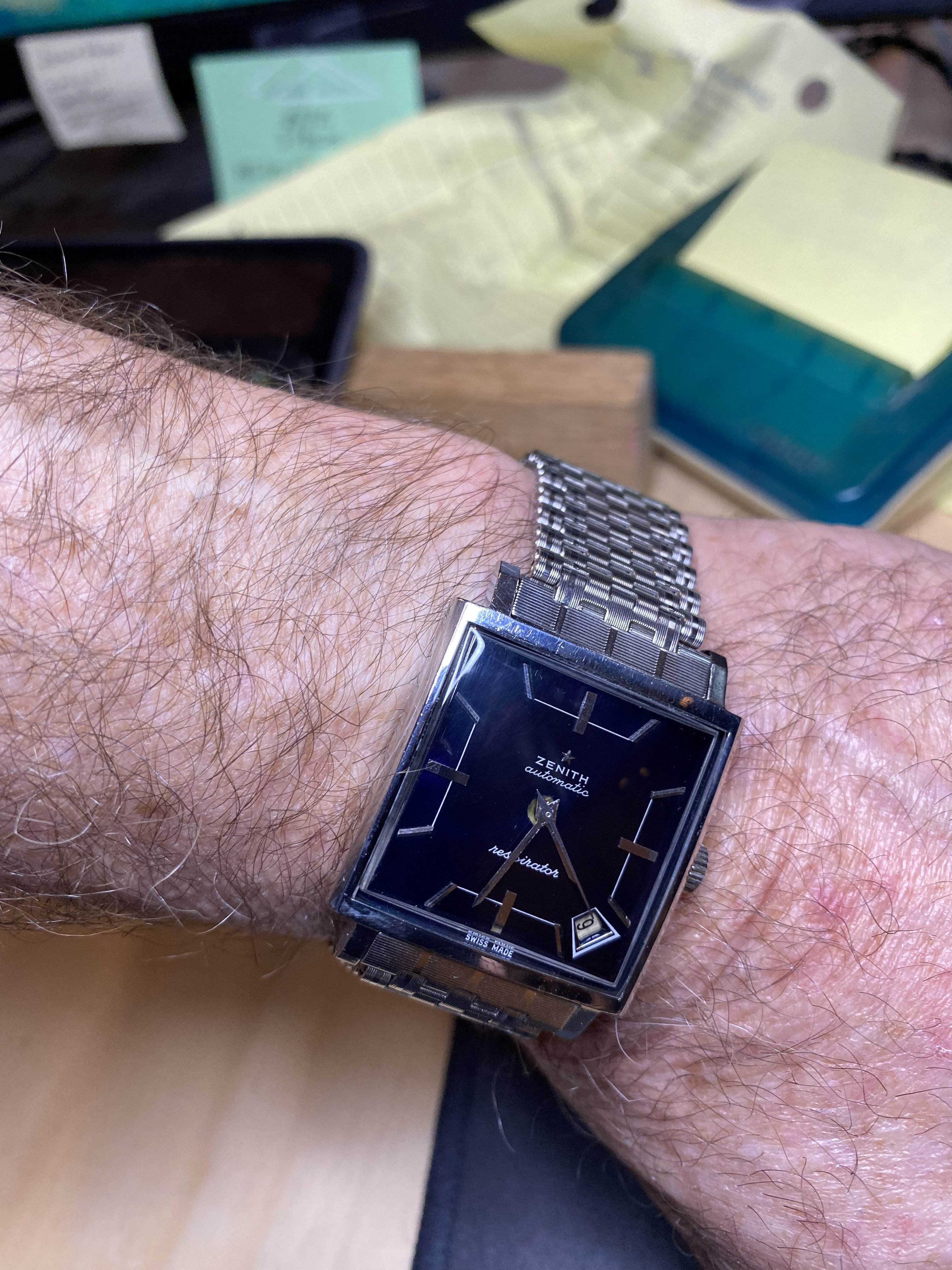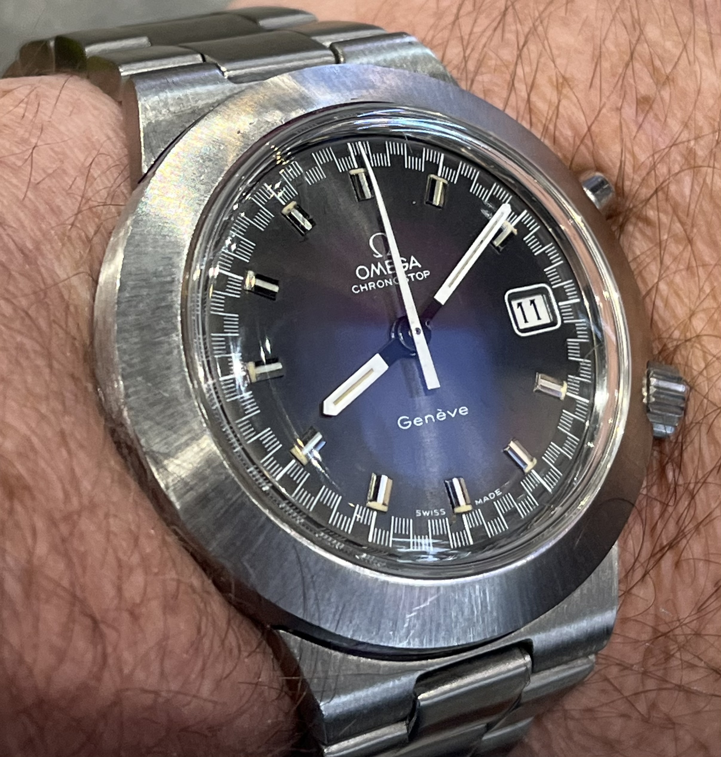 Try as I might, it's been almost impossible to show the beautiful color of this dial. It is a very deep indigo that looks great under natural light and very hard to capture in photos. Purchased from a "thrift shop" type of place in Greece (I thought the dial was black when I purchased it) along with it's original signed NSA bracelet....just serviced and now happily on the wrist.