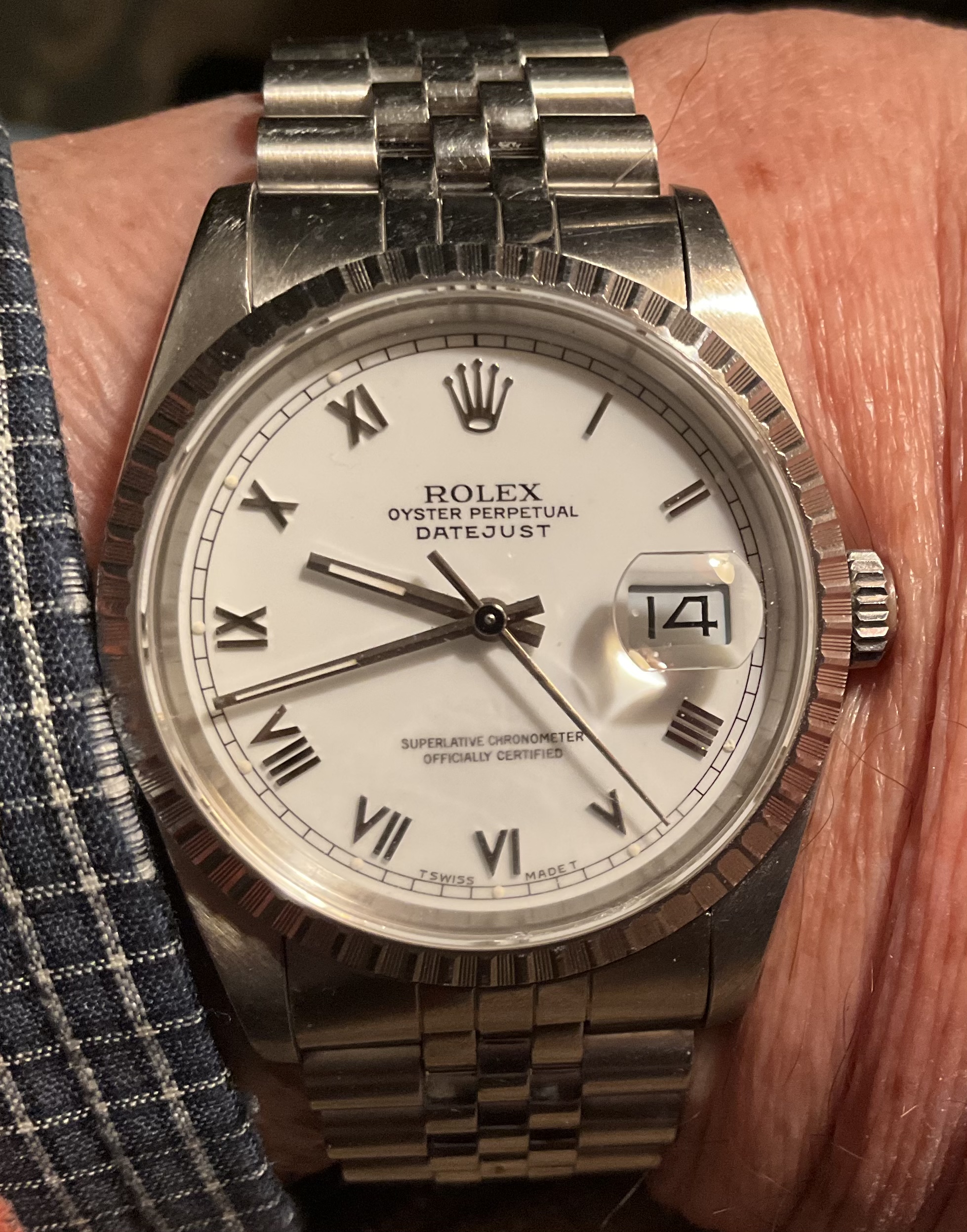 I serviced my Rolex Date-Just today. This was probably the sixth time I’ve serviced it in the 33 years I’ve owned. All original except the mainspring which I replaced about 10 years ago, after the original one broke. I had intended it to be my WRUW Tuesday watch, but I finished servicing it this evening, so here it is.