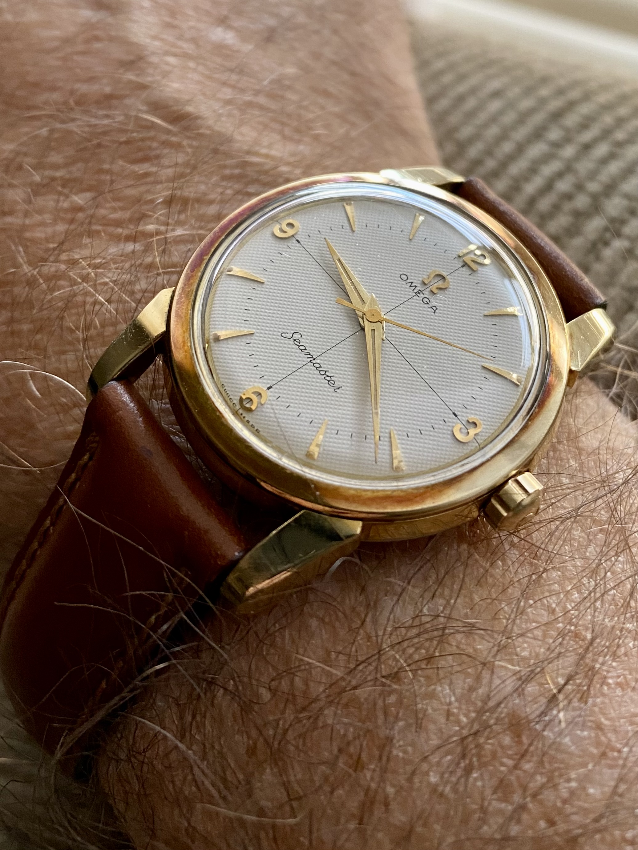 Posts 9,746 Likes 54,551 gbesq ·Nov 17, 2022 Good day all. 1956 Seamaster 2761 with a crosshair waffle dial. Simply perfect. 😀