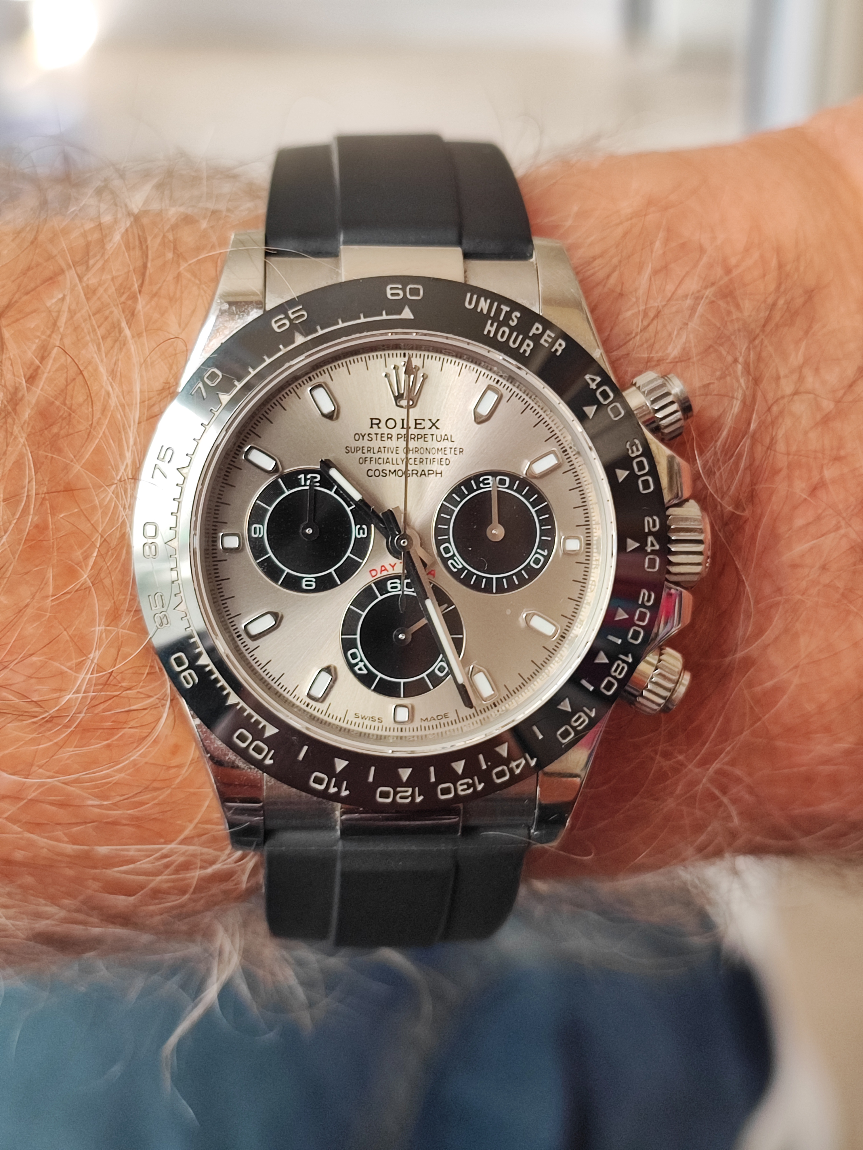 I am probably being defensive as I know the chap & he has no reason to lie to me. I have seen some of his other (mostly Rolex pieces) & am a little more comfortable with those as I own DJ & T BB GMT. We also both own AT WT, mine on steal & his on rubber & I have therefore compared closely as I was considering the rubber strap.