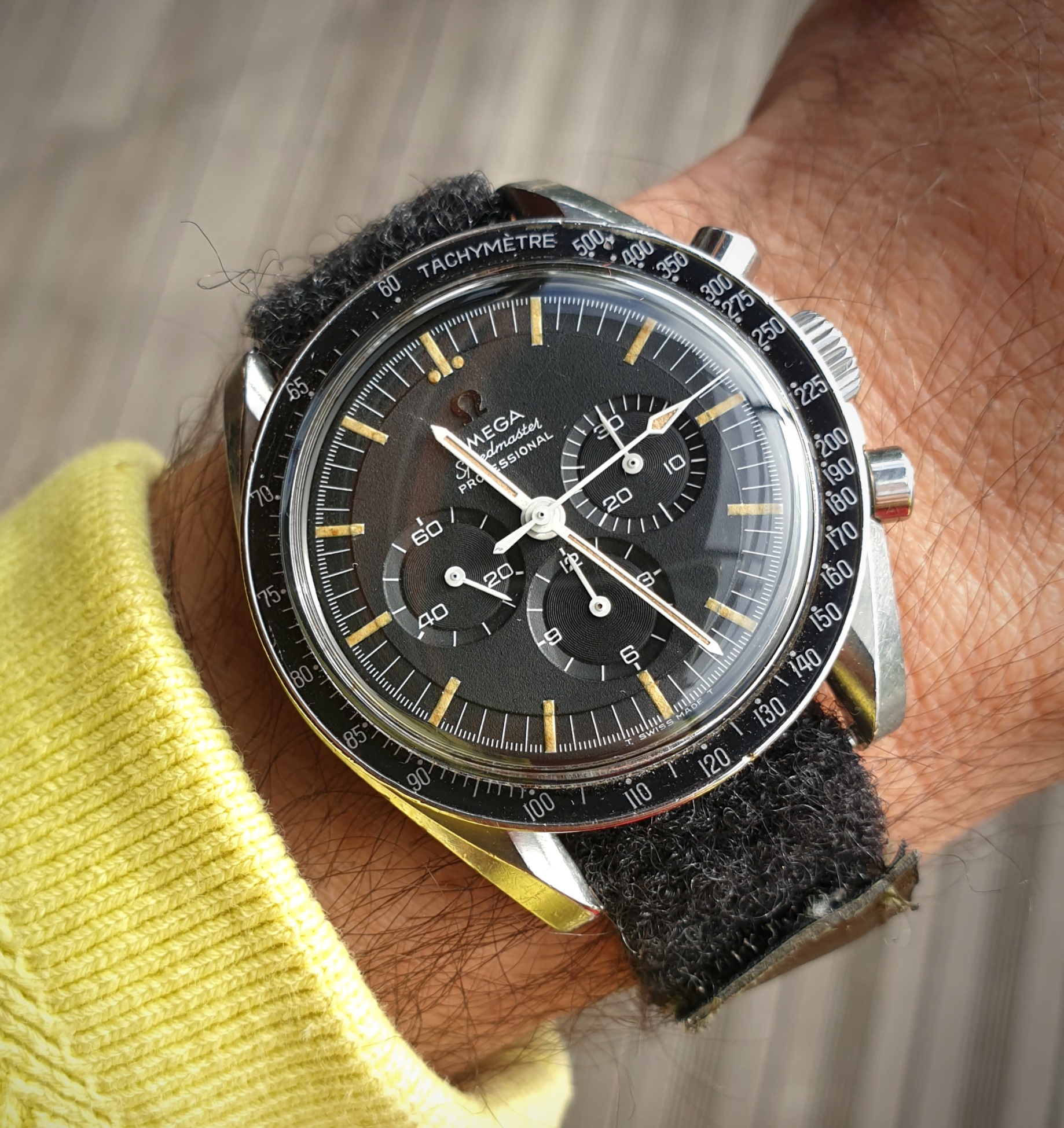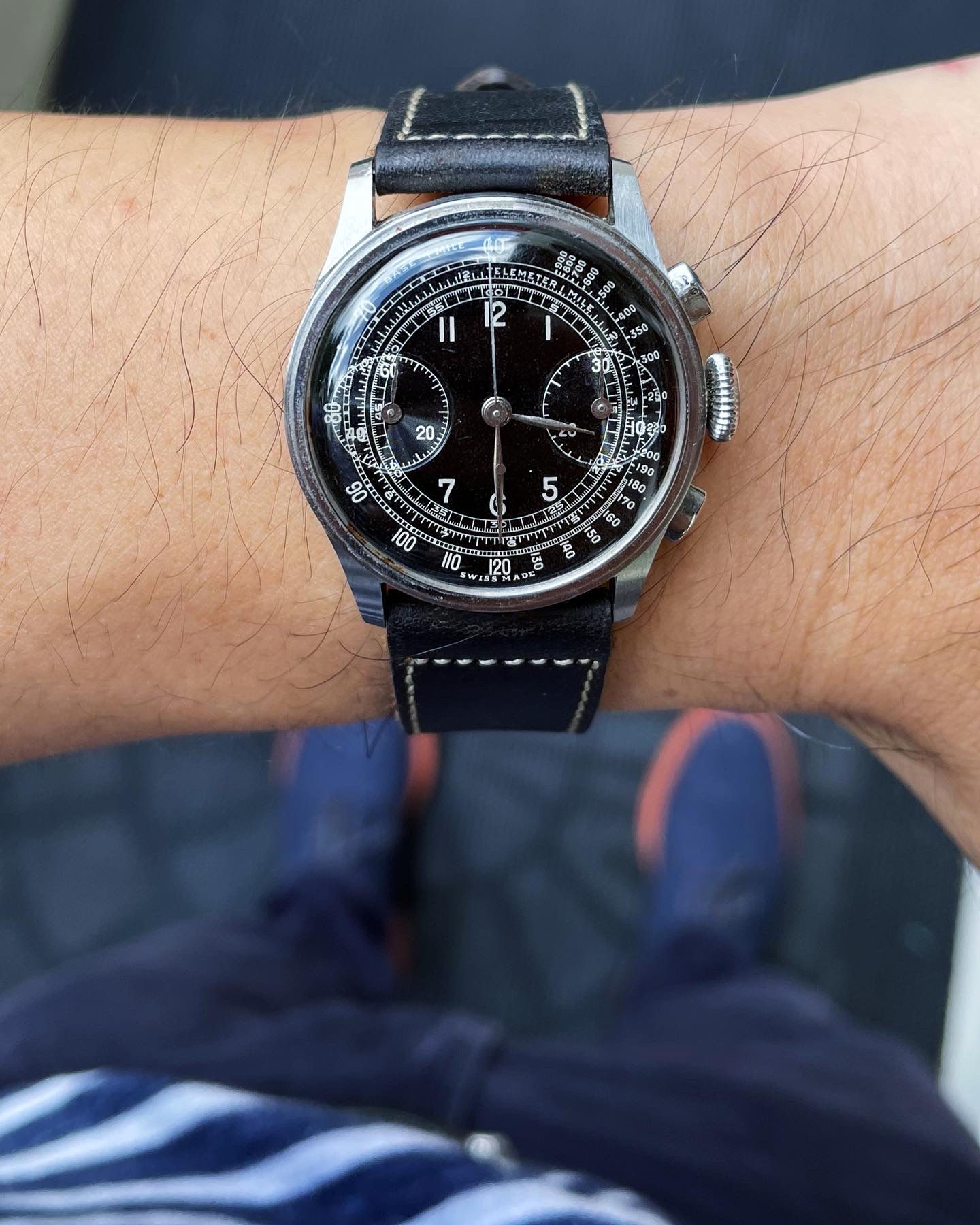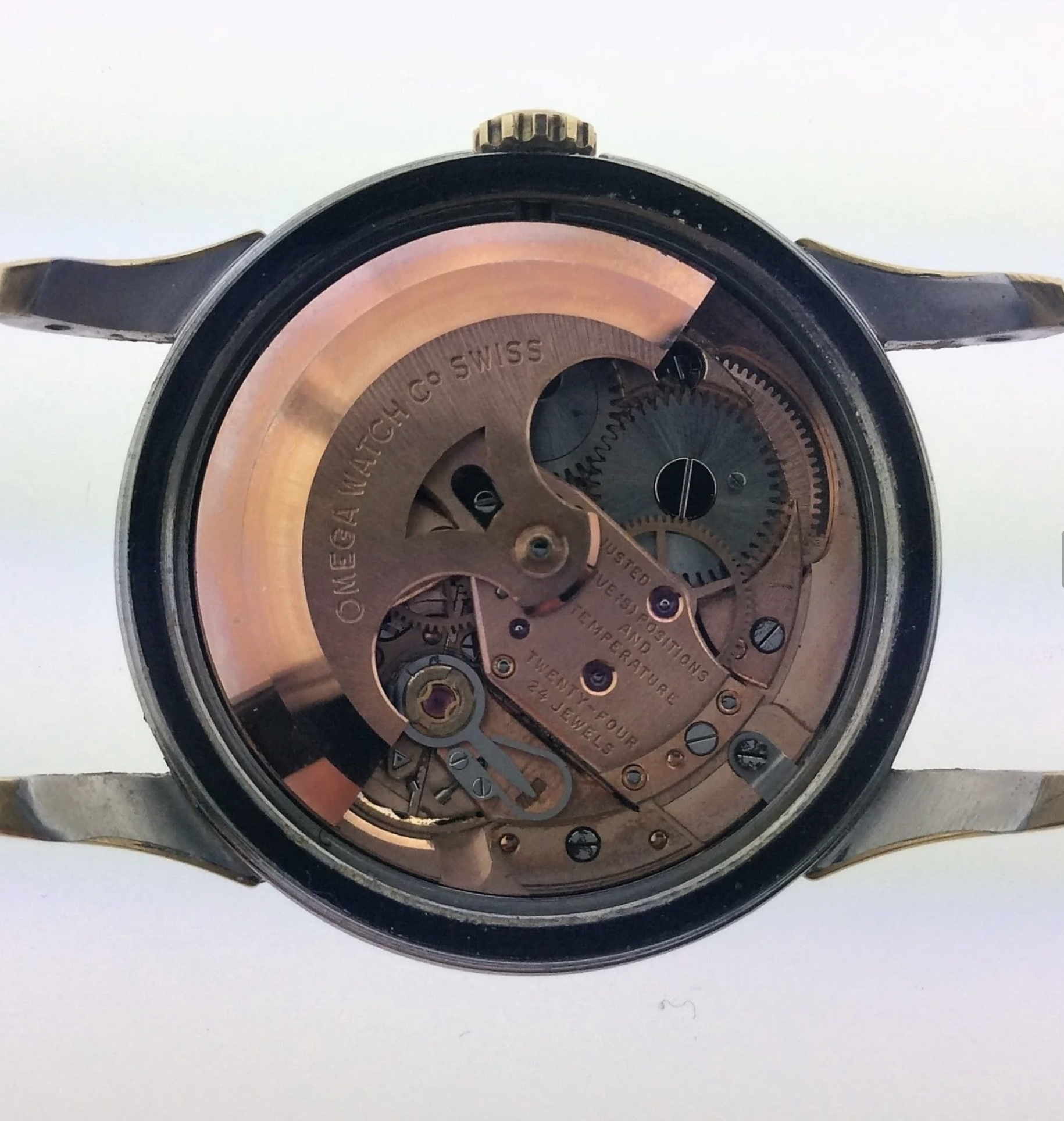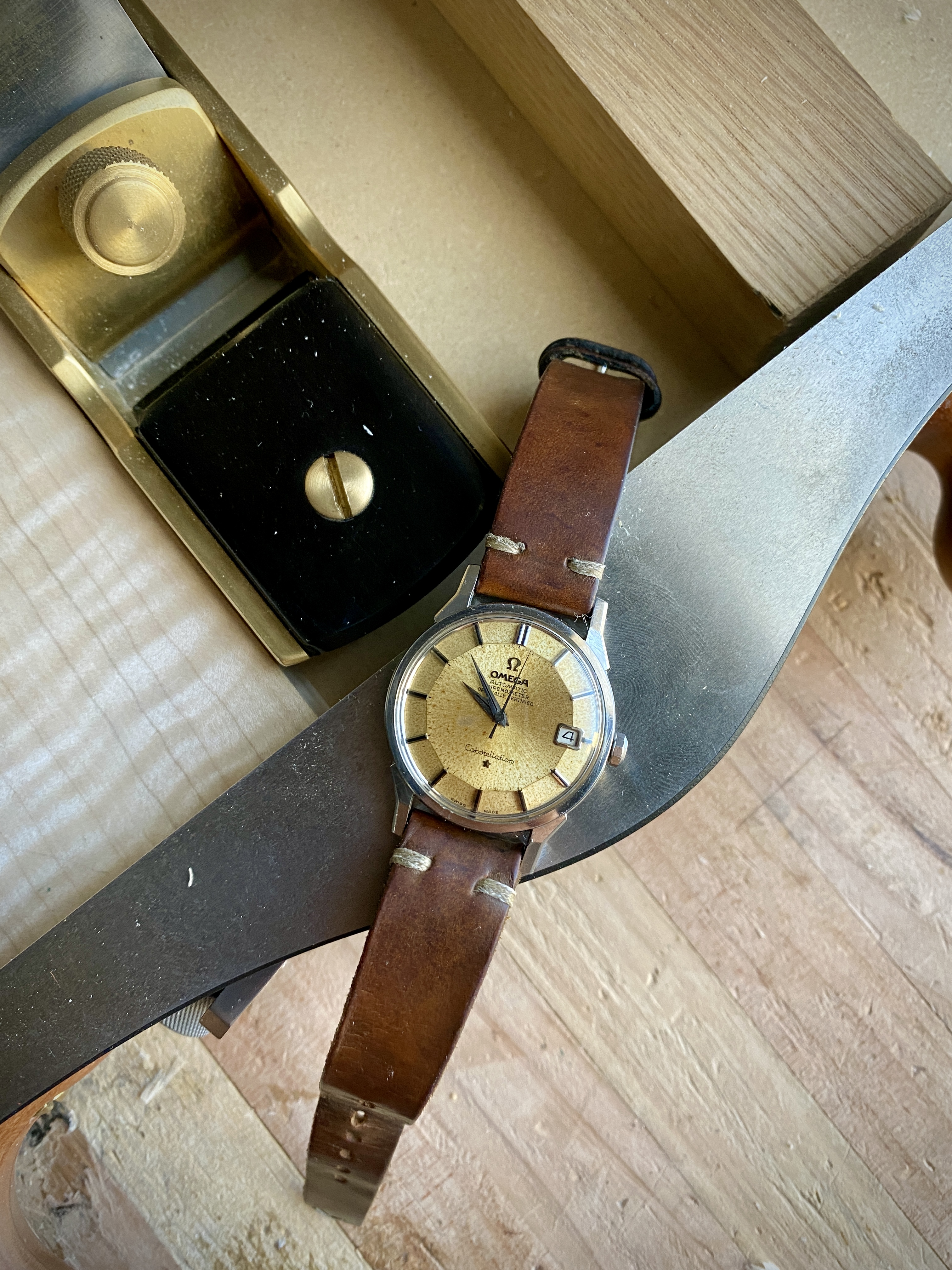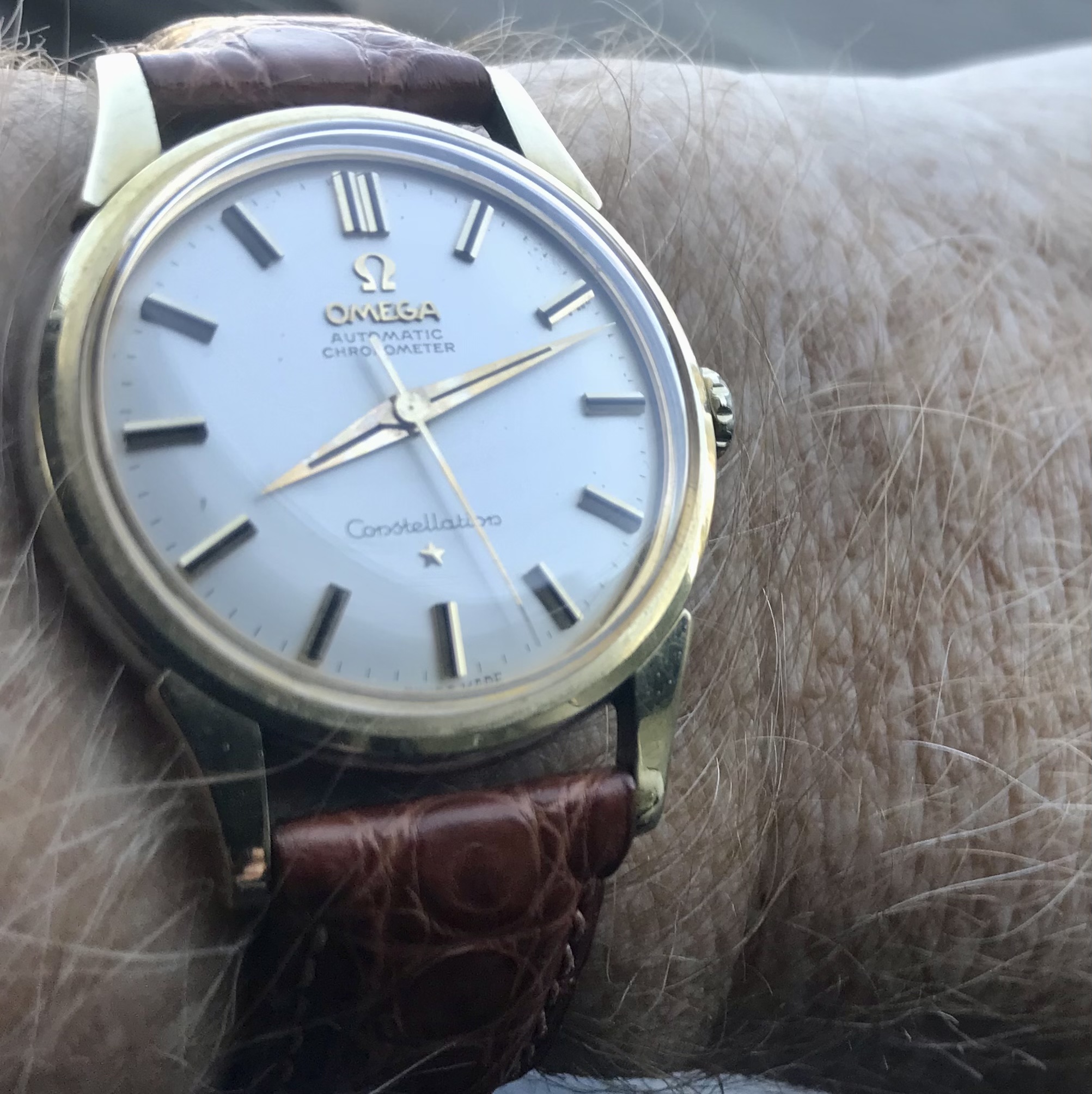 A new one to the collection. A quite rare 1956 Constellation reference 2887 in gold cap with a crosshair arrowhead dial and the ChronomeTRE text. Screw in case back and caliber 501. Incorrect crown and generic crystal, but those minor matters will soon be remedied. 😀