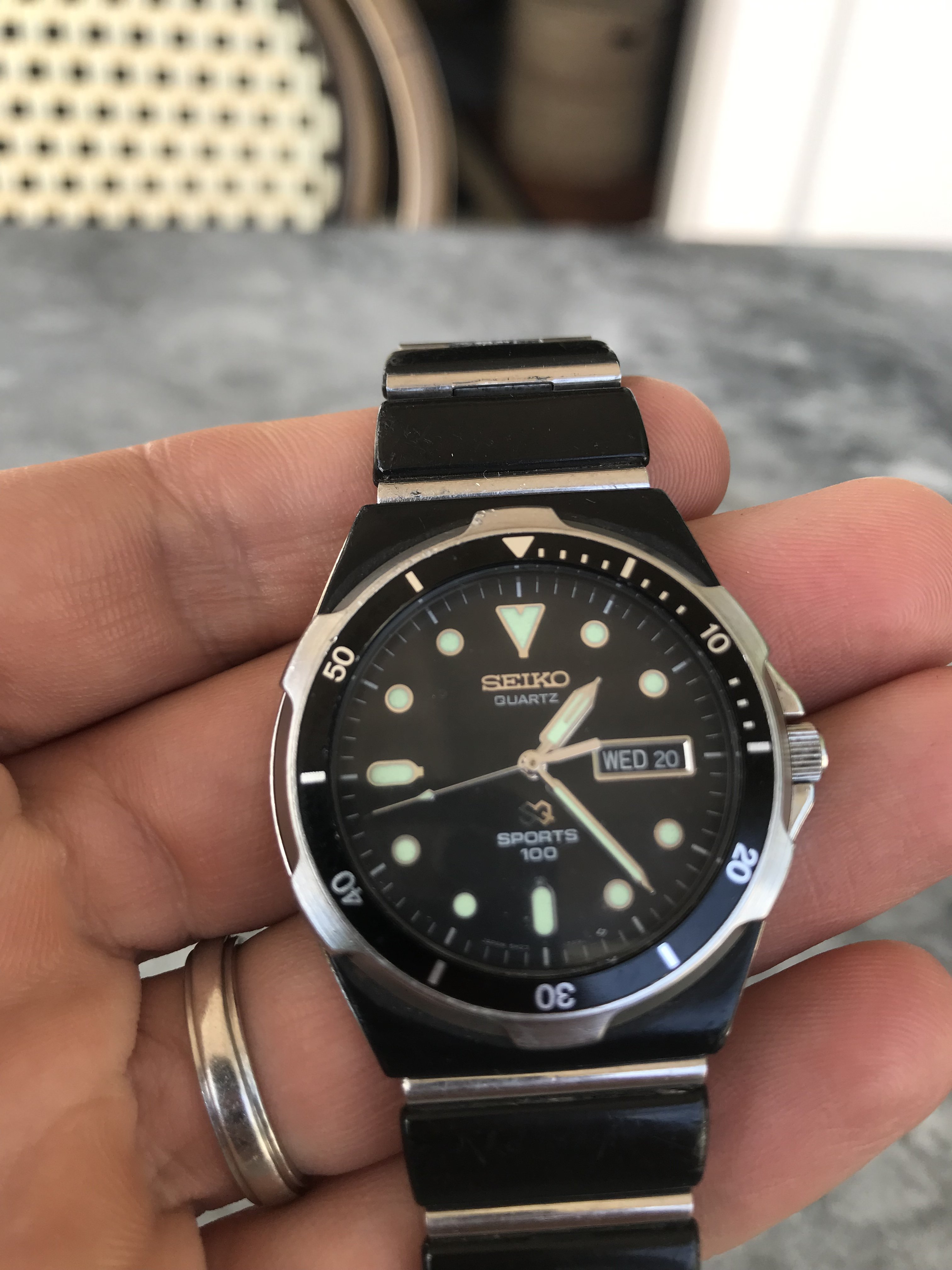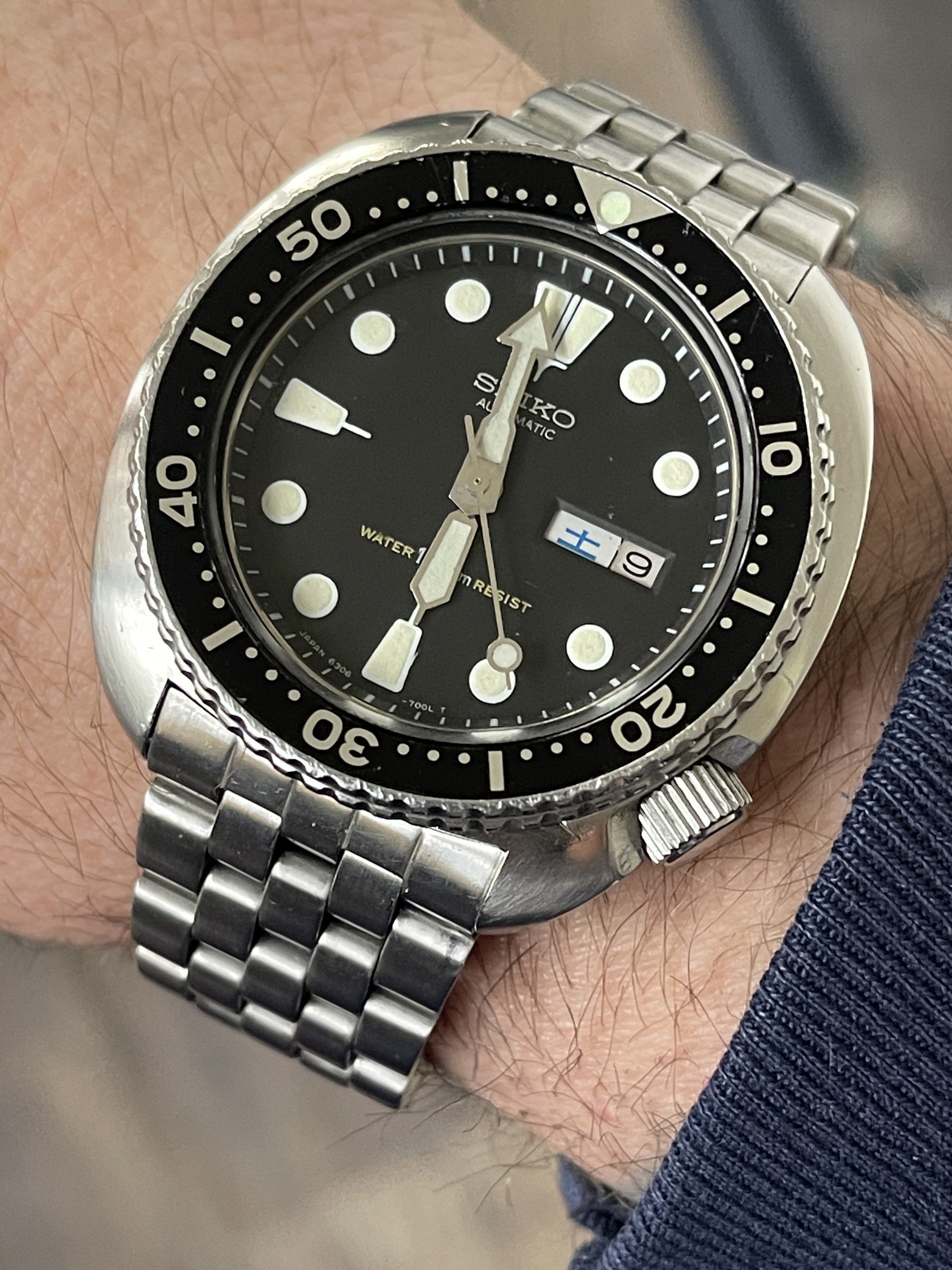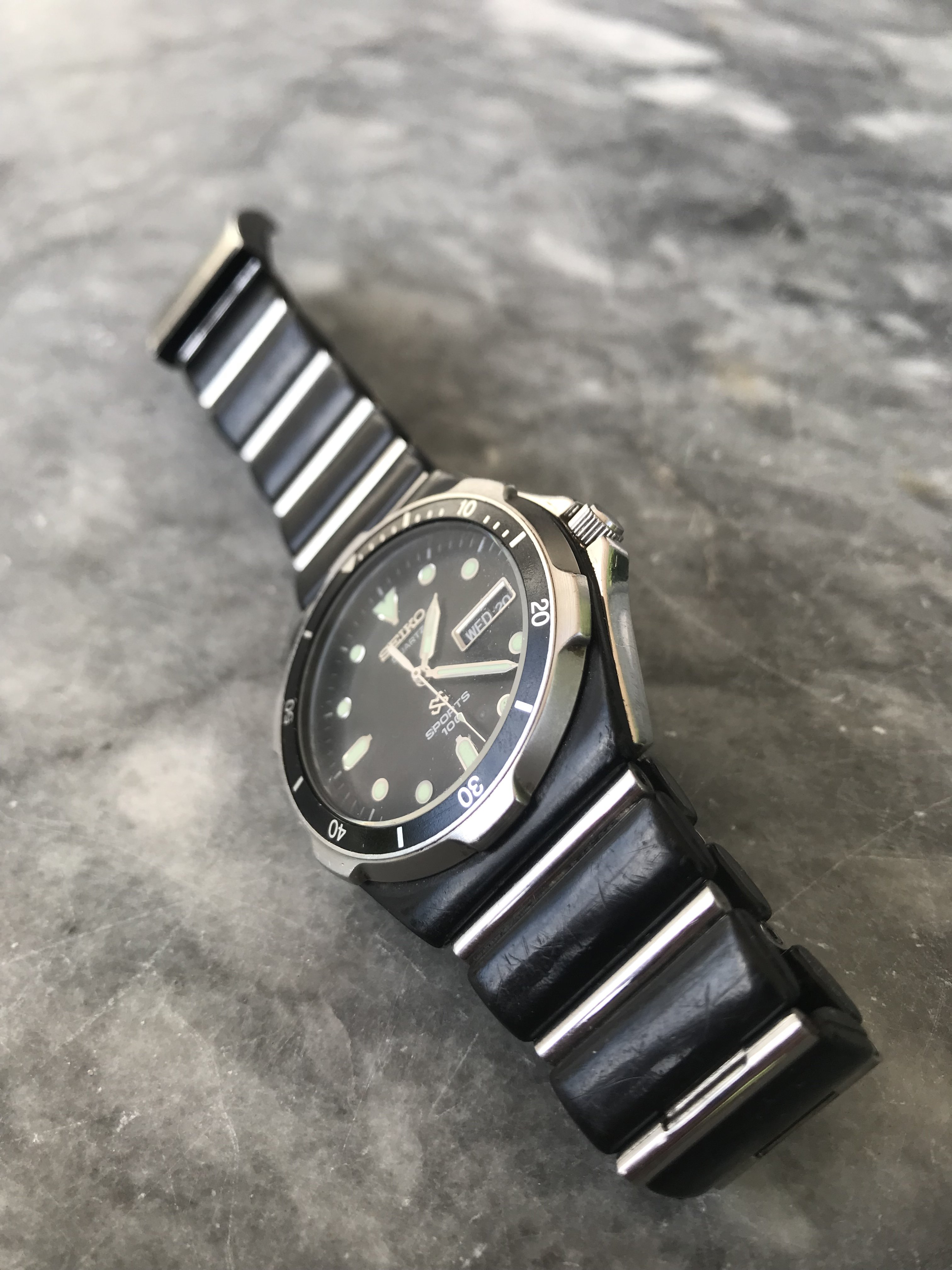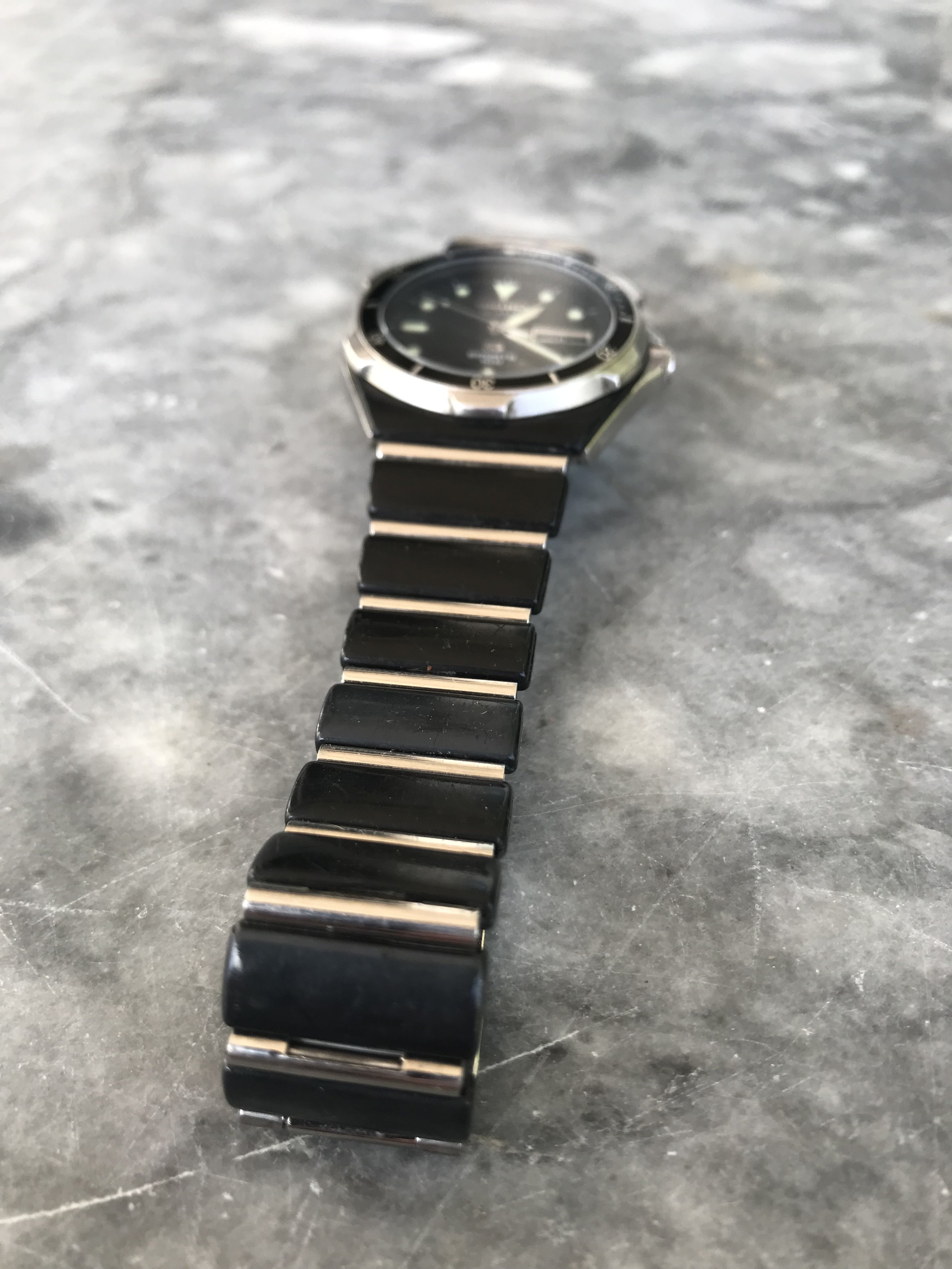 Still wearing this odd, plastic-clad quartz Sports 100 diver from January 1986. It’s a 5H23-7B10. Picked it up locally in South Africa, covered in grime and wrist cheese. Cleaned up quite nicely, though it’s definitely seen some wear, especially on the plastic bracelet links. 40mm including the crown guards but wears smaller. Awesomely 1980s 60-click bidirectional bezel. No lugs to speak-of, but the bracelet isn’t really integrated. Just a weirdly charming curiosity from mid-1980s Seiko.