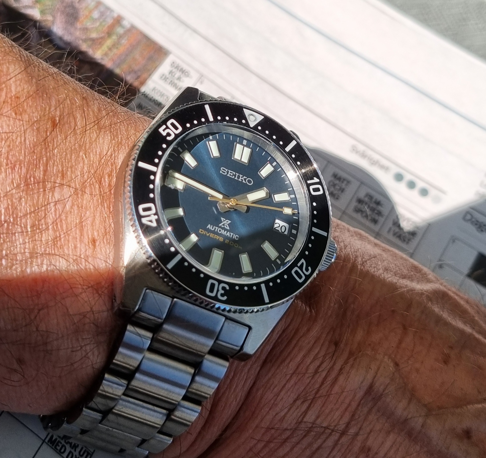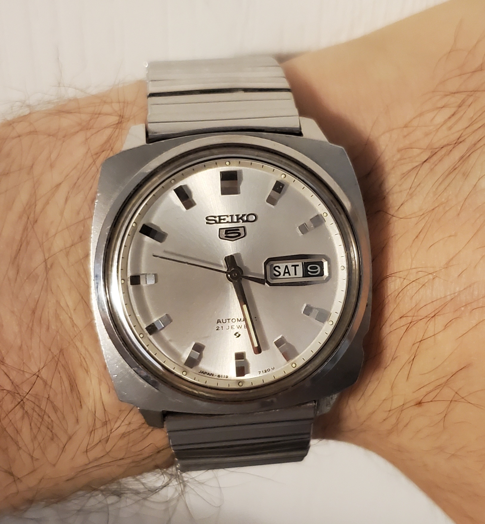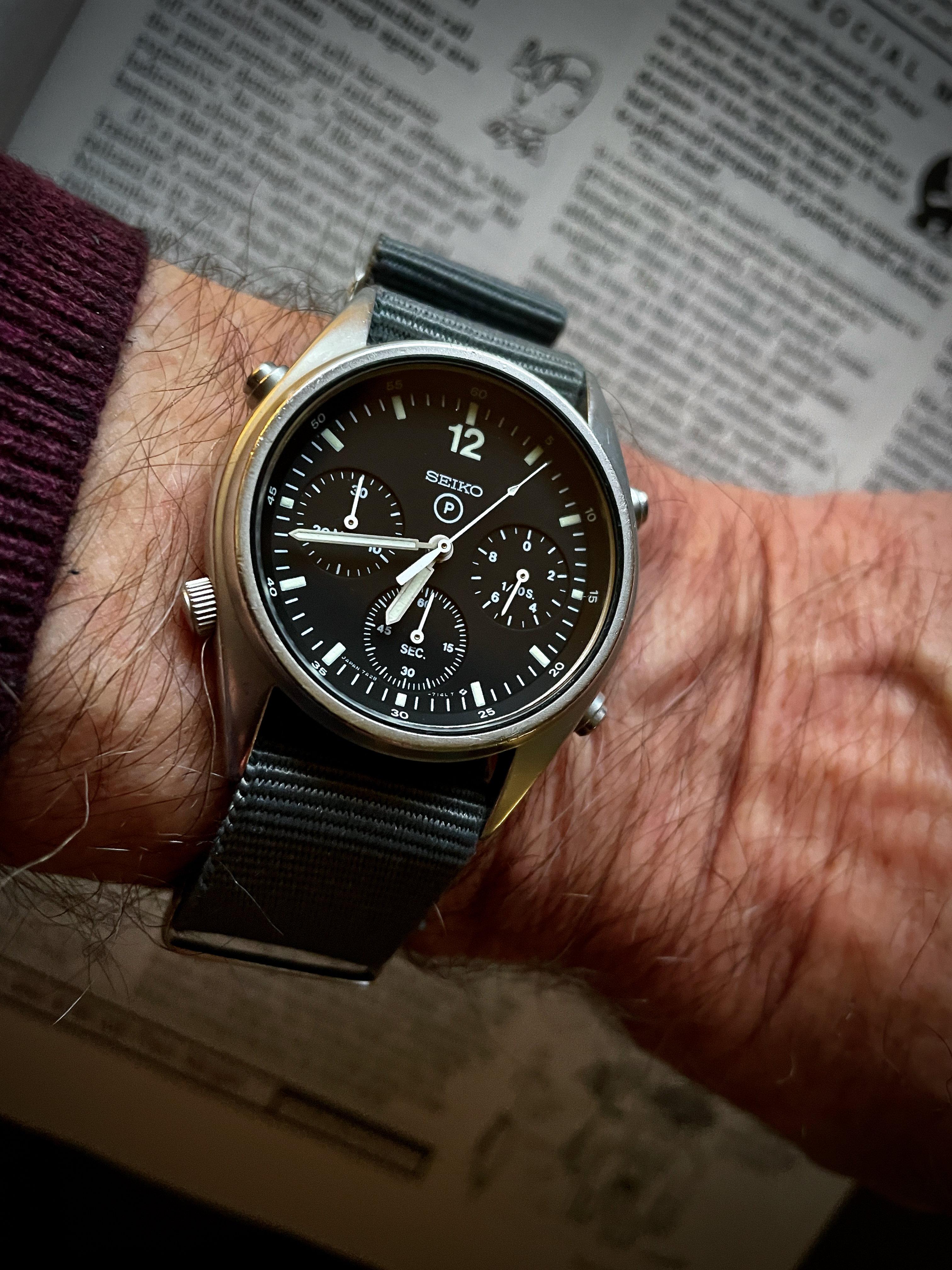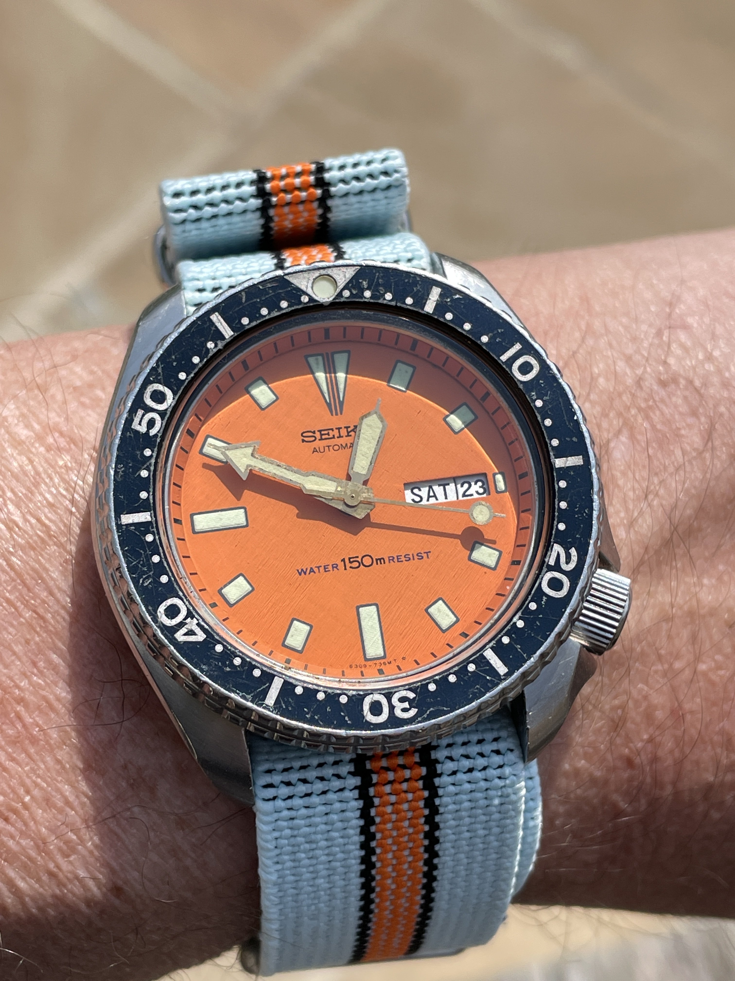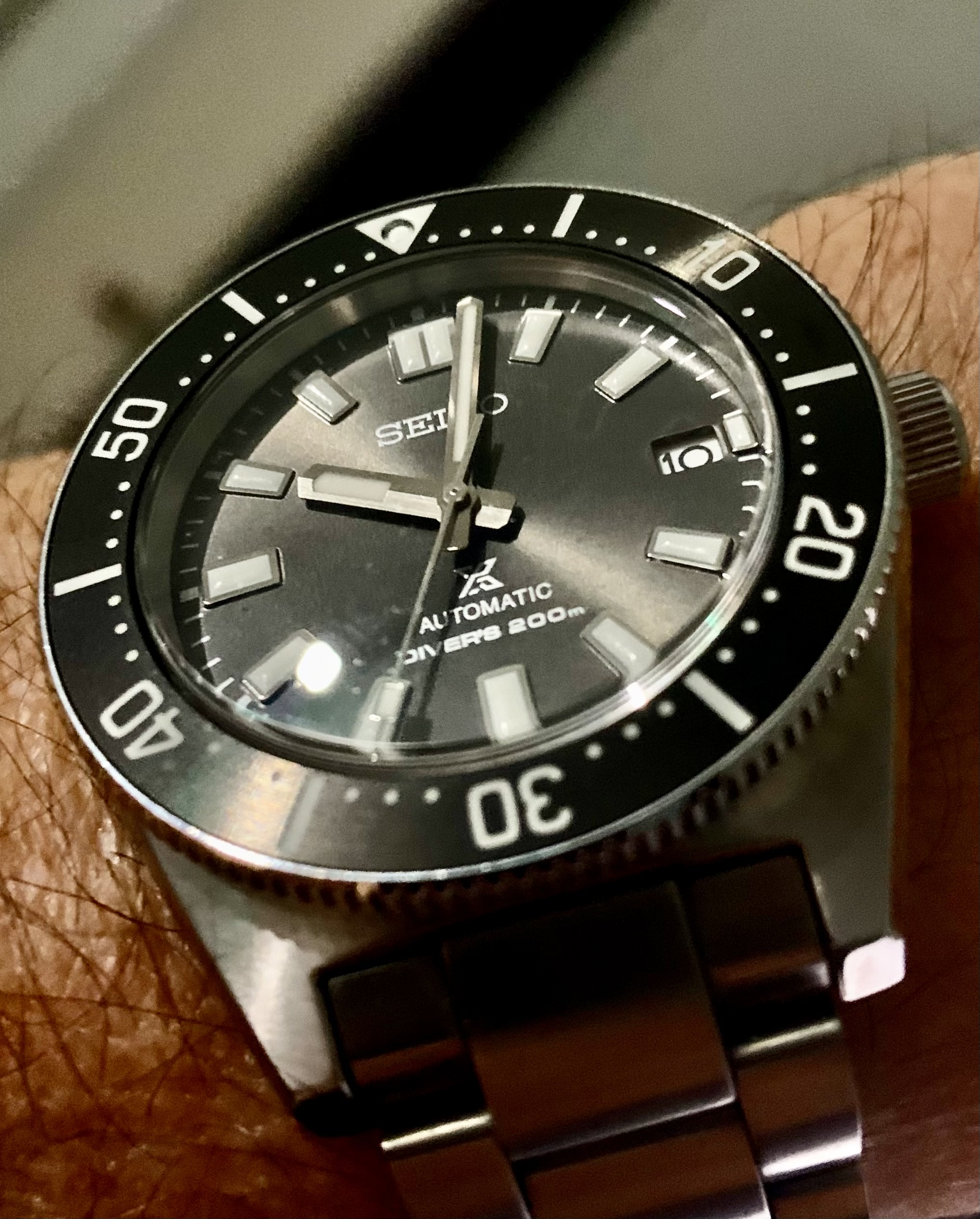 Still wearing this odd, plastic-clad quartz Sports 100 diver from January 1986. It’s a 5H23-7B10. Picked it up locally in South Africa, covered in grime and wrist cheese. Cleaned up quite nicely, though it’s definitely seen some wear, especially on the plastic bracelet links. 40mm including the crown guards but wears smaller. Awesomely 1980s 60-click bidirectional bezel. No lugs to speak-of, but the bracelet isn’t really integrated. Just a weirdly charming curiosity from mid-1980s Seiko.