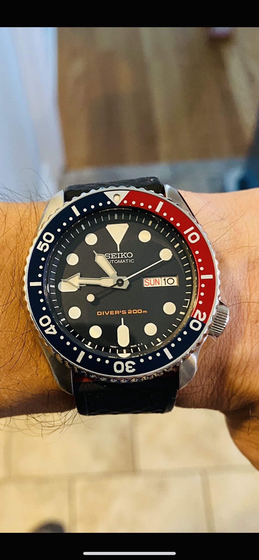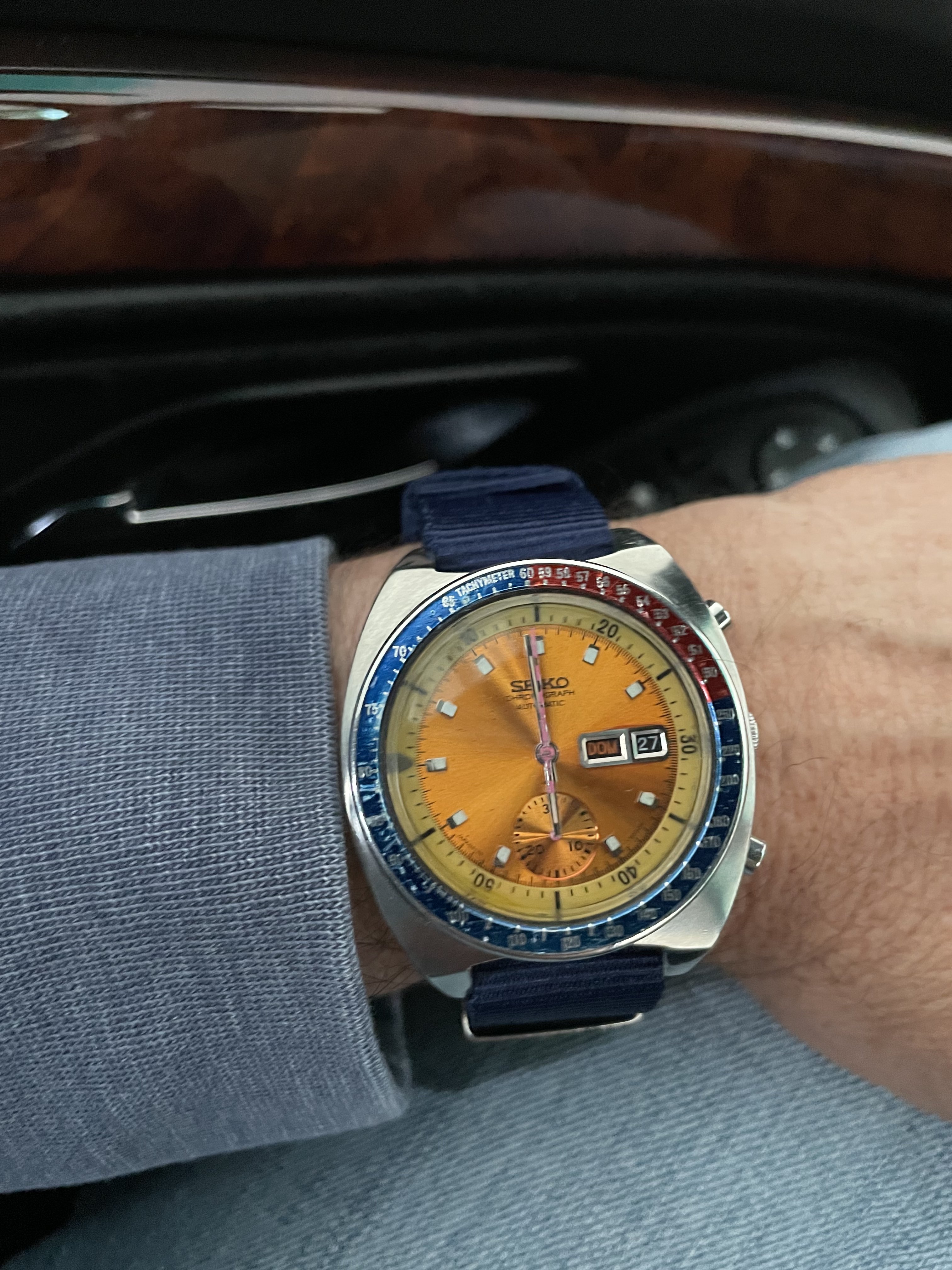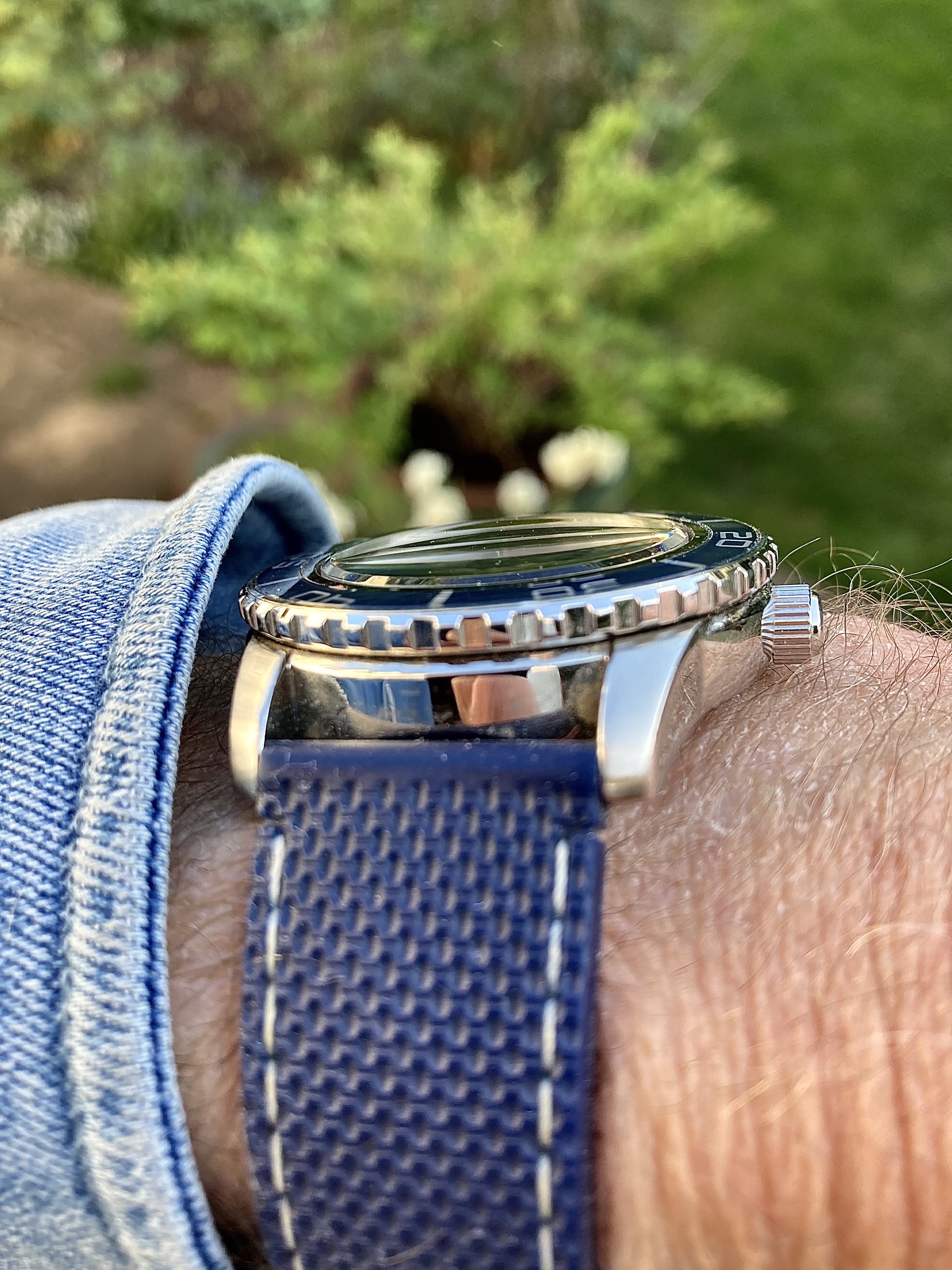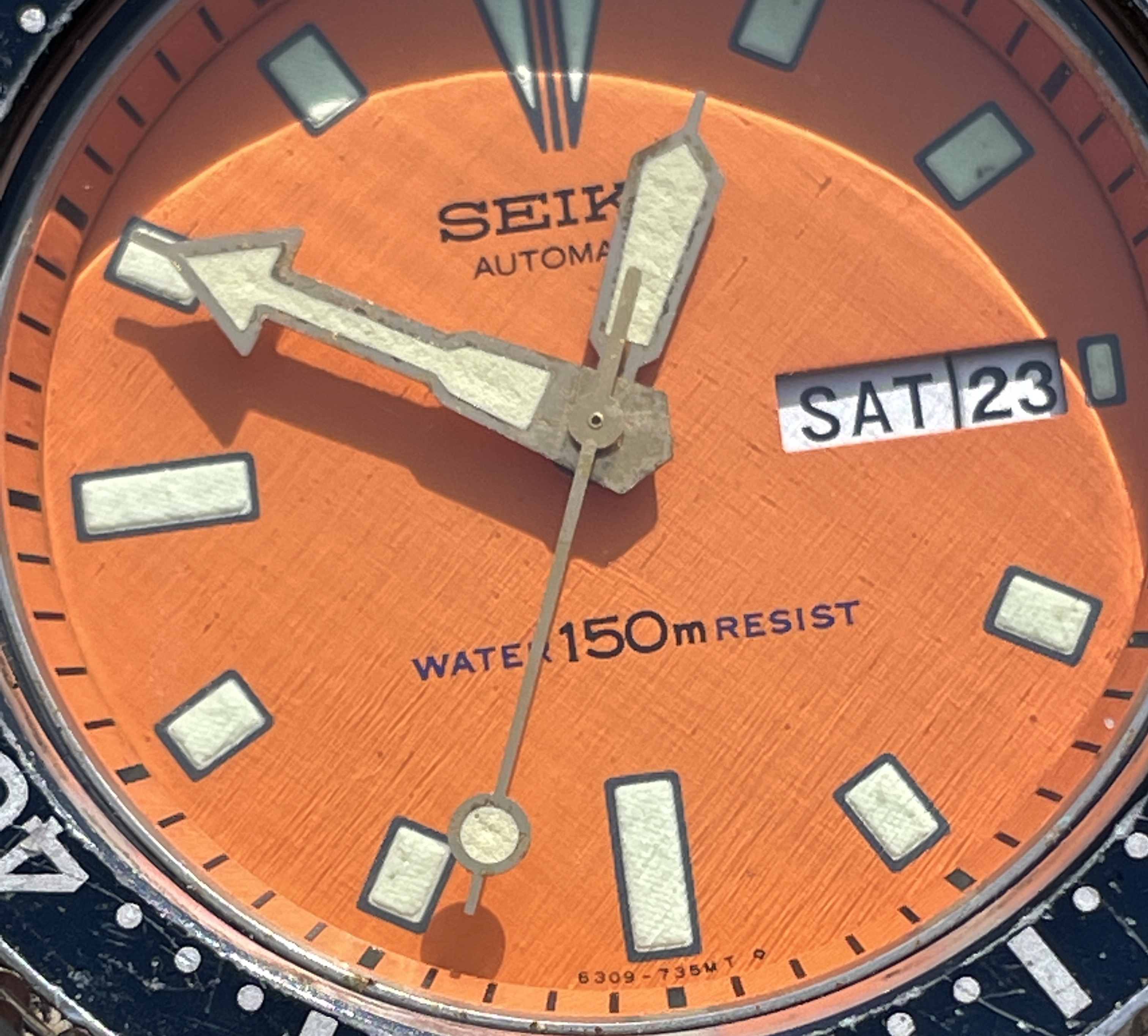 Still wearing this odd, plastic-clad quartz Sports 100 diver from January 1986. It’s a 5H23-7B10. Picked it up locally in South Africa, covered in grime and wrist cheese. Cleaned up quite nicely, though it’s definitely seen some wear, especially on the plastic bracelet links. 40mm including the crown guards but wears smaller. Awesomely 1980s 60-click bidirectional bezel. No lugs to speak-of, but the bracelet isn’t really integrated. Just a weirdly charming curiosity from mid-1980s Seiko.