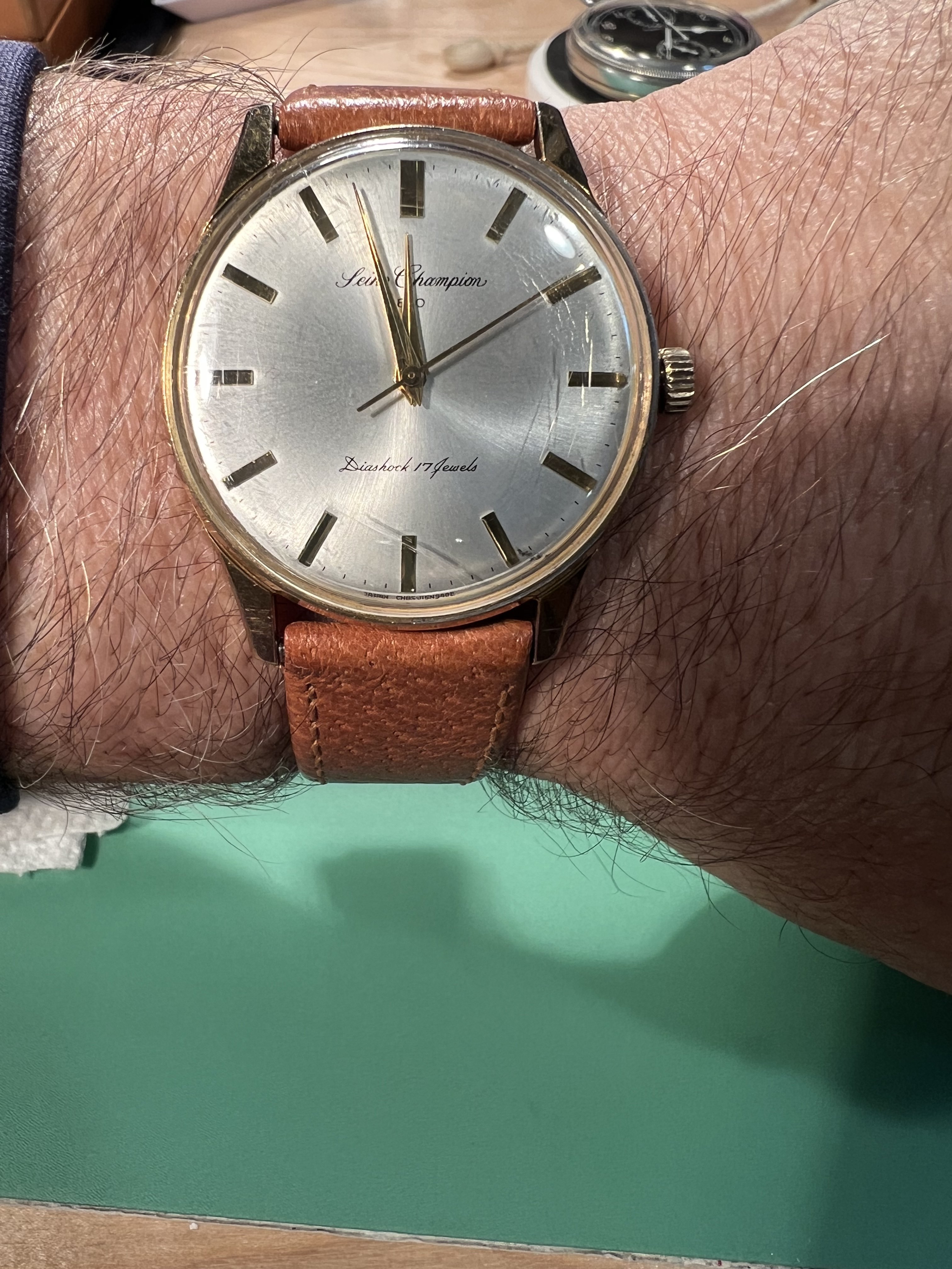 Posts 2,741 Likes 5,543 SOG53 ·Mar 12, 2023 Champion 850 J15018 from 1960, on vintage pumpkin pigskin band. Needs a new crystal, big watch for the time 36mm