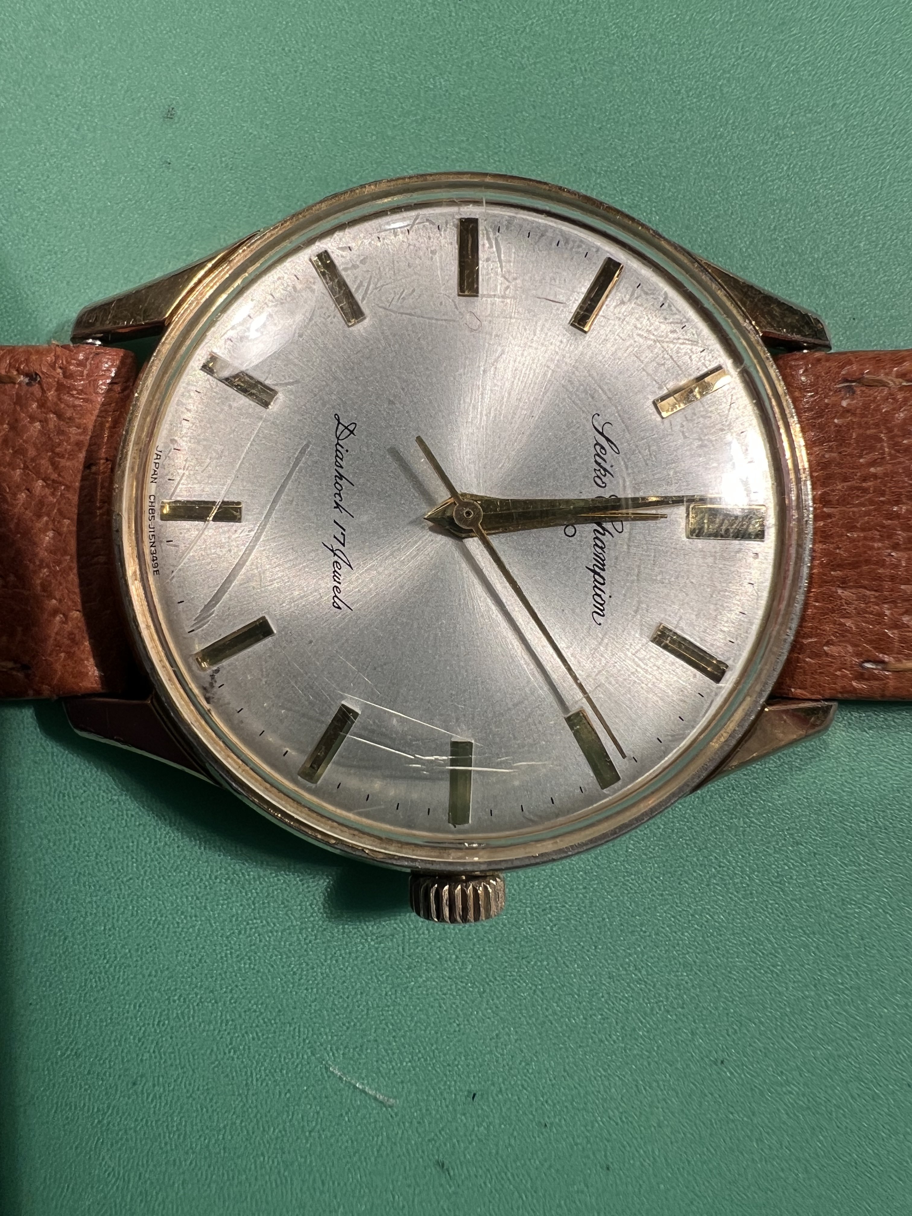 Posts 3,027 Likes 6,444 SOG53 ·Mar 12, 2023 Champion 850 J15018 from 1960, on vintage pumpkin pigskin band. Needs a new crystal, big watch for the time 36mm