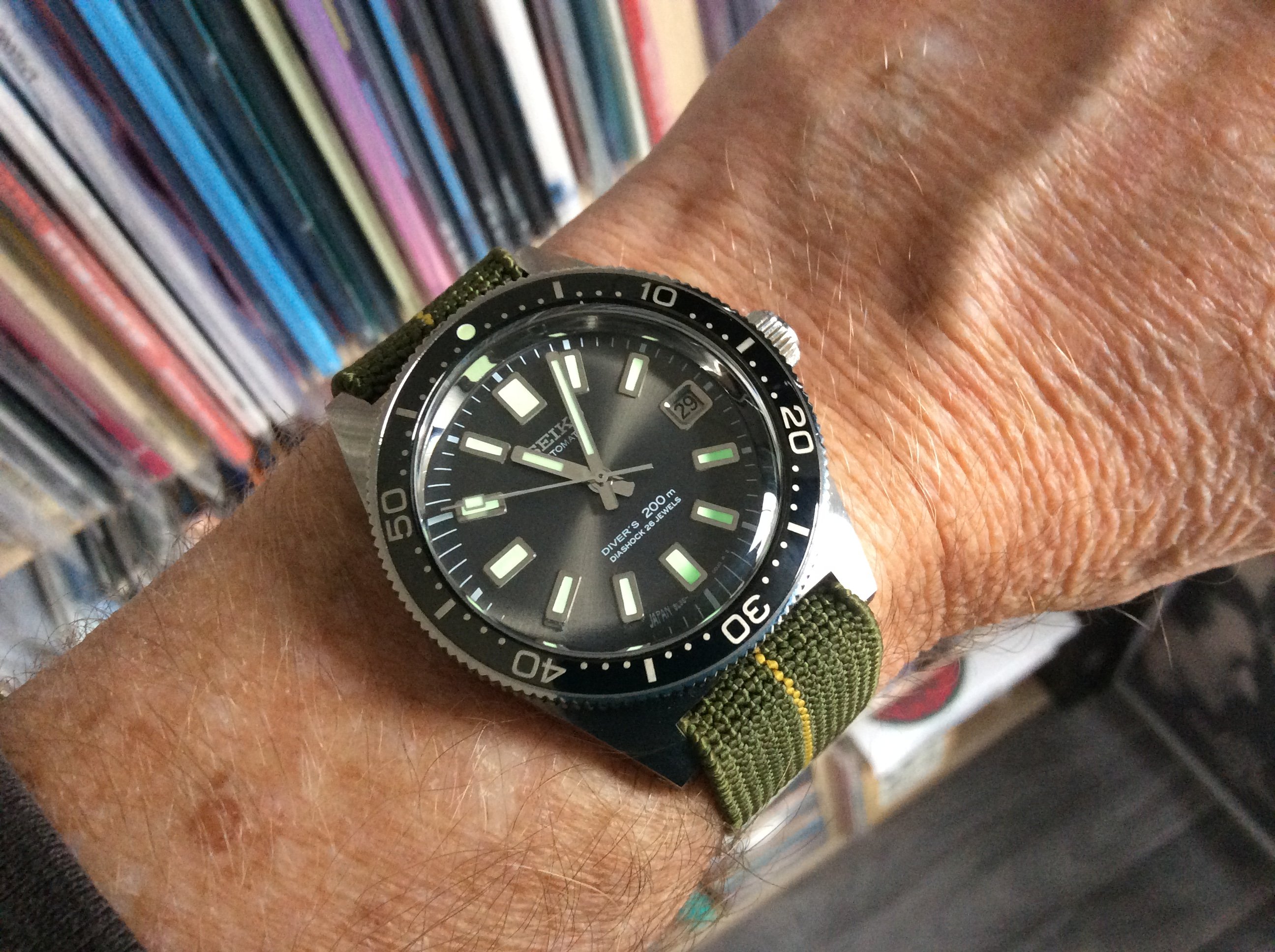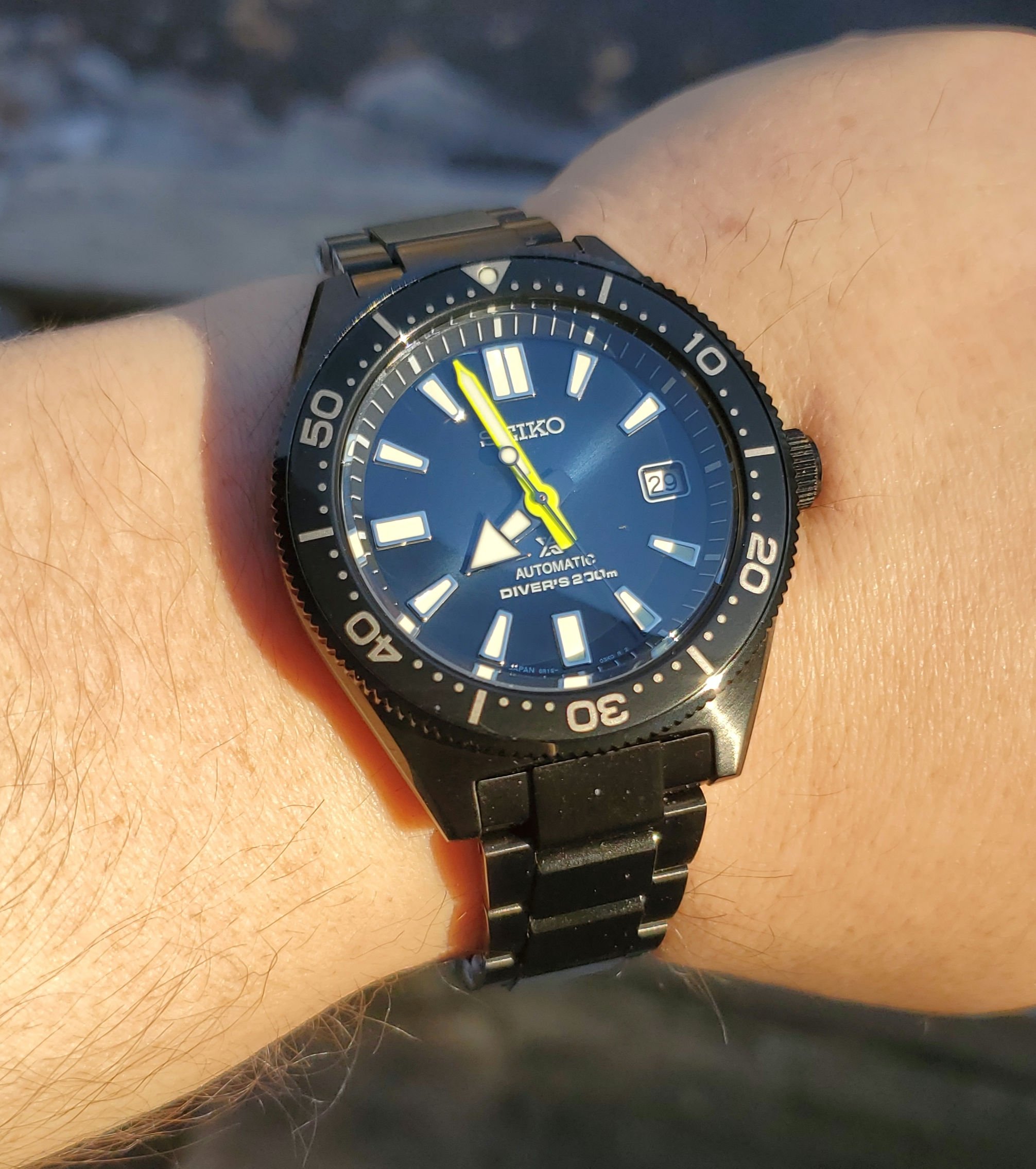Prospex Historical Edition Diver's Watch 200m SBDC085 "Darth 62MAS" and love the dial on this one. The reverse lollipop seconds hand is different. I don't know why there isn't even a very tiny amount of lume on the other end of the seconds hand as there appears to be a small amount of white paint. I really wanted (still would buy one) a SRP633 which is the black ion-plated "Mohawk" but found this one while looking for other black finished Seikos.