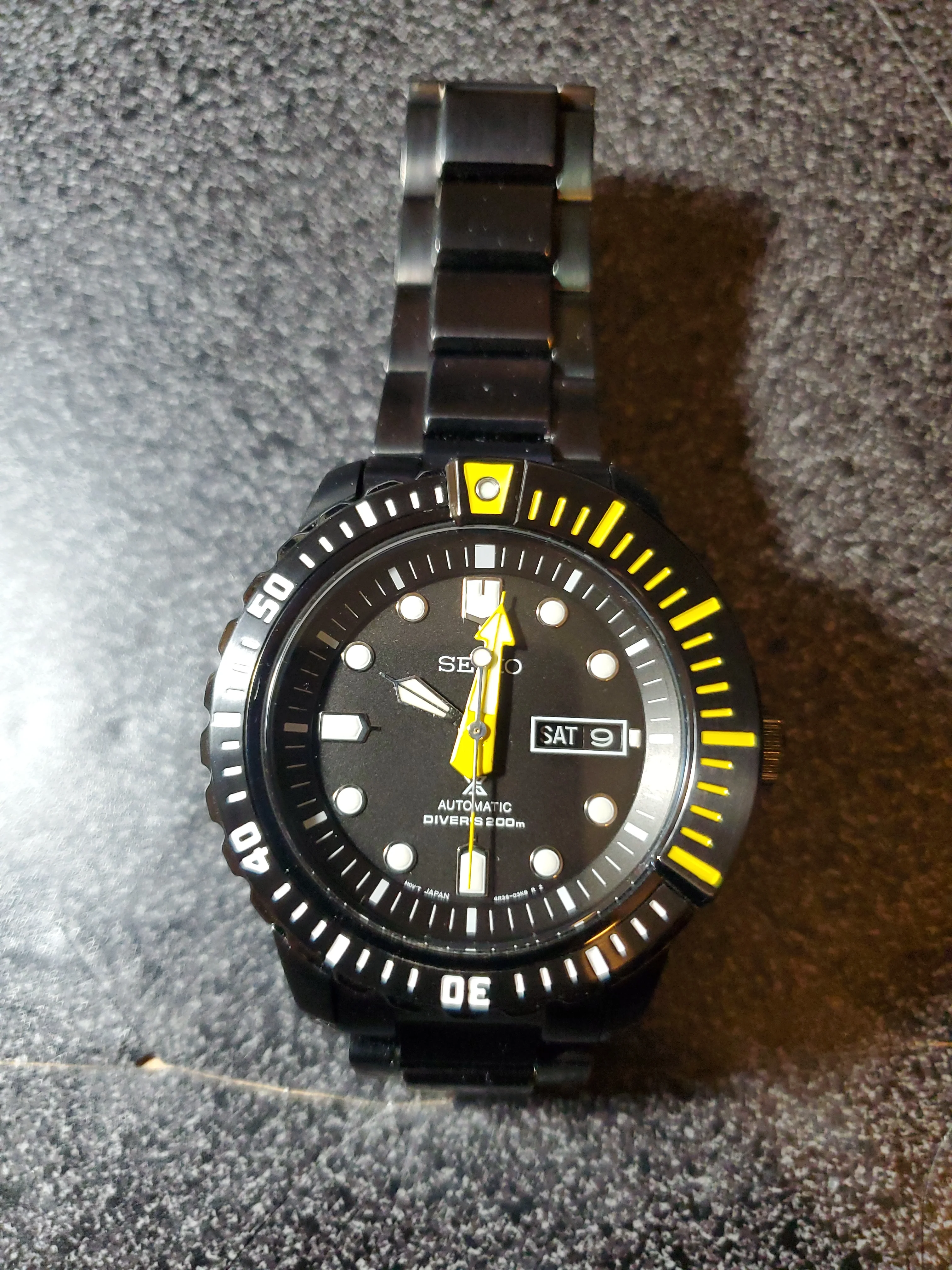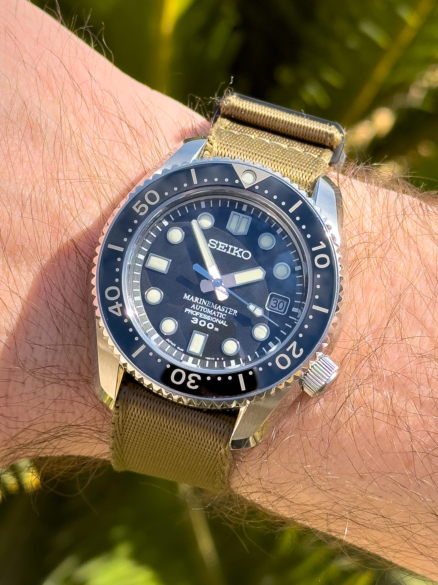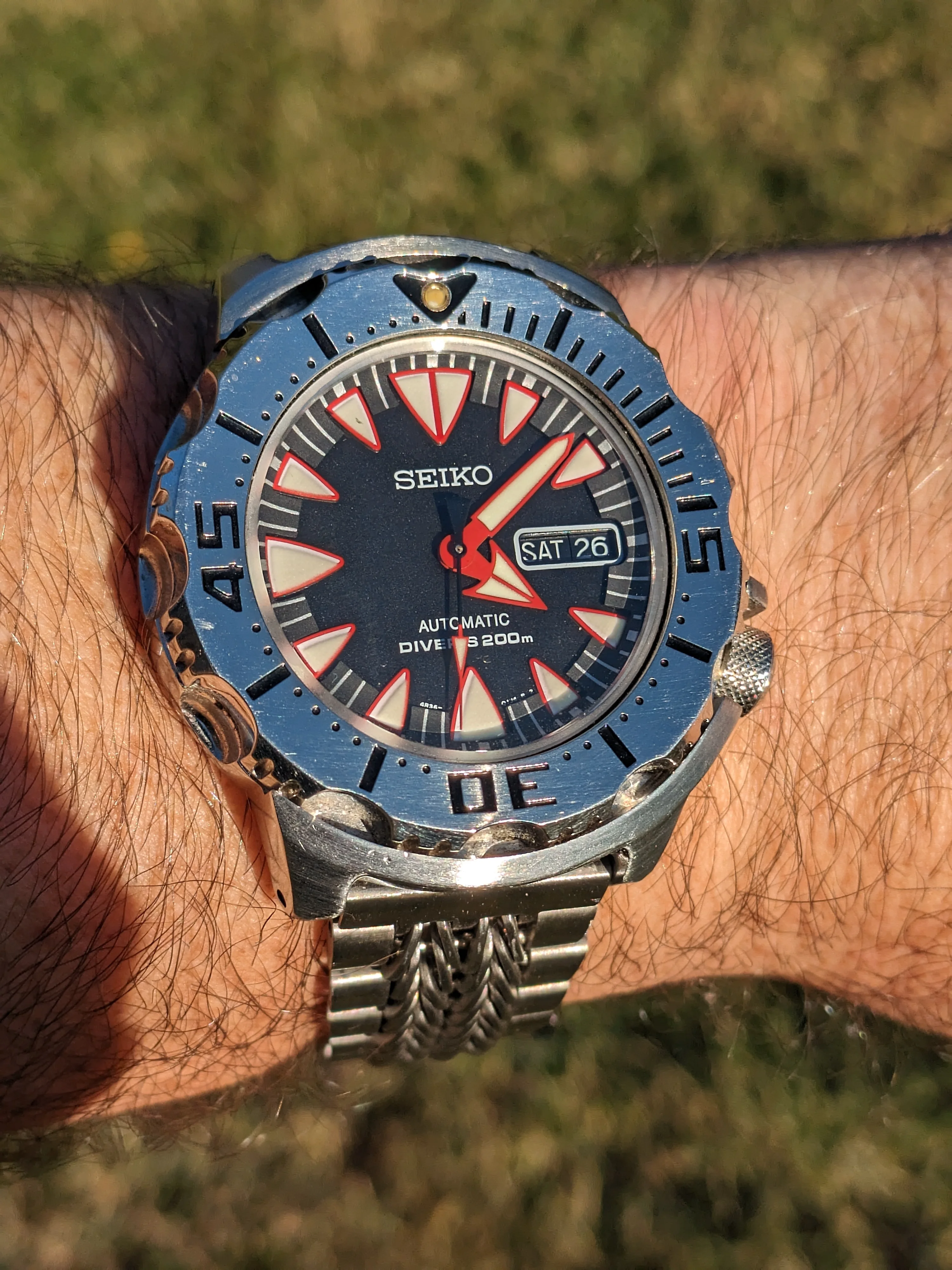Finally got the Mohawk together. This started as a salesman's sample - no movement. Got a 4R36 movement off eBay and then proceeded to break the stem. That started a whole saga trying to get a crown. The Seiko original isn't available, tried two that looked similar. Didn't work as the stem seemed a bit too short. Ended up with a Crystal Times CT272 crown that seals screwed or unscrewed in 6" of water. Plan is to buy a CT208 crown which looks like the Seiko crown and then test to 200m. I also installed a flat sapphire crystal with blue AR that I found on eBay. The Mohawk isn't supported by the aftermarket so it was hard going.