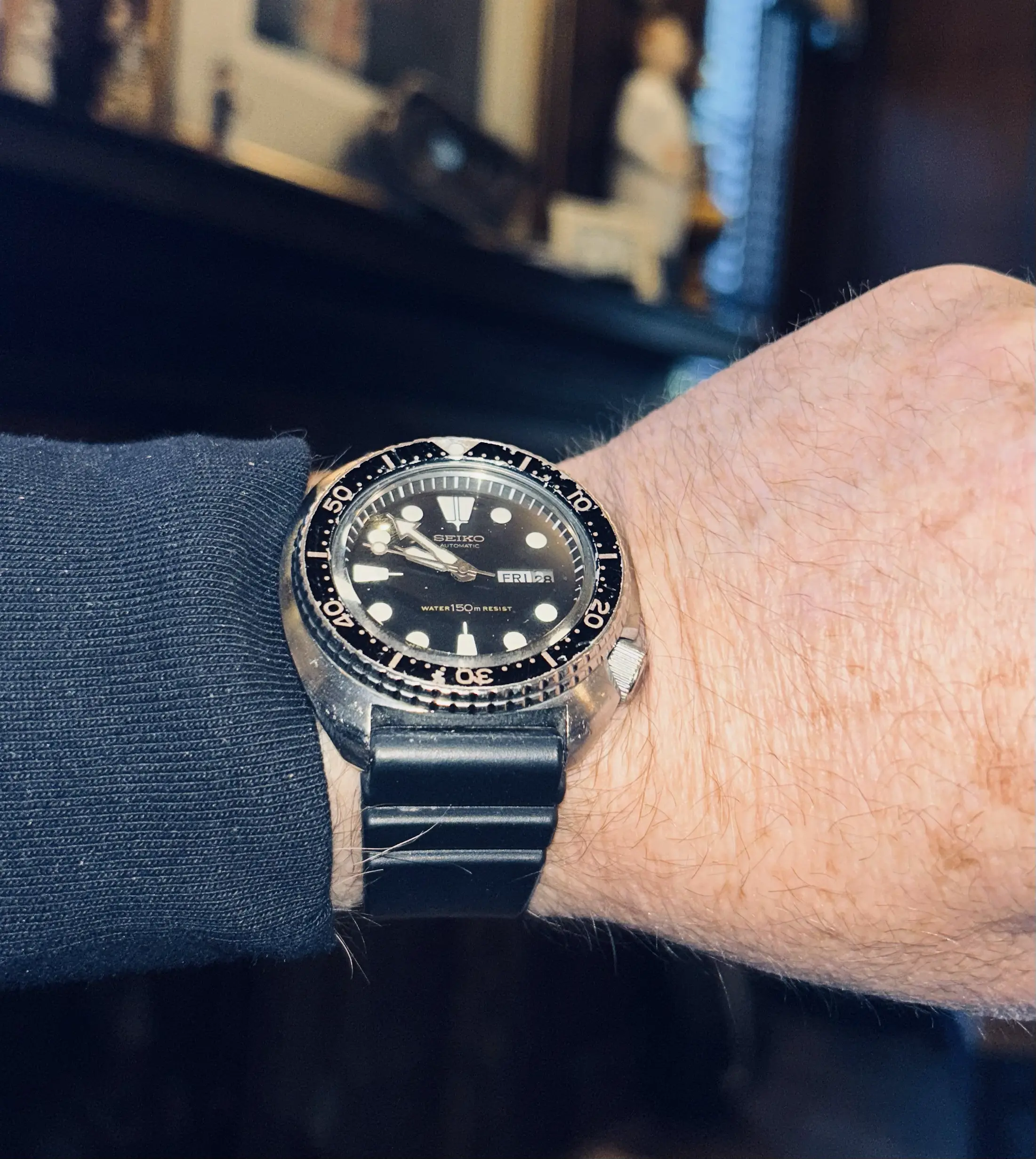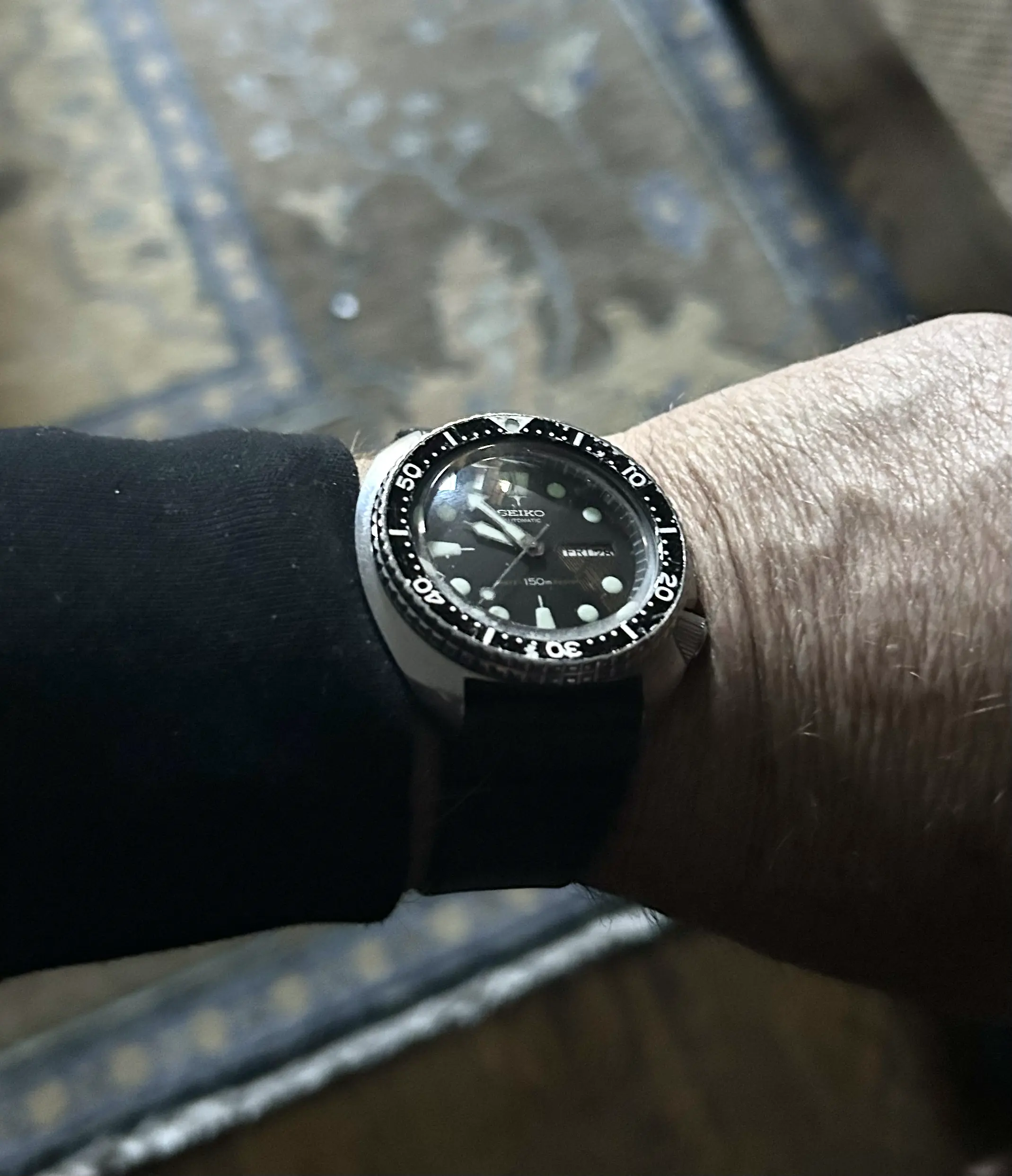 My 1978 turtle---- which I just had serviced locally at Capetown Diamond in Roswell GA.. It is literally keeping perfect time and as good as my Speedmaster, if not better… this one has a domed crystal whereas my 1983 has a flat crystal with a original Seiko band.. To be honest, I really love the look of this dome and the Bezel is all beat up and original the way I like it