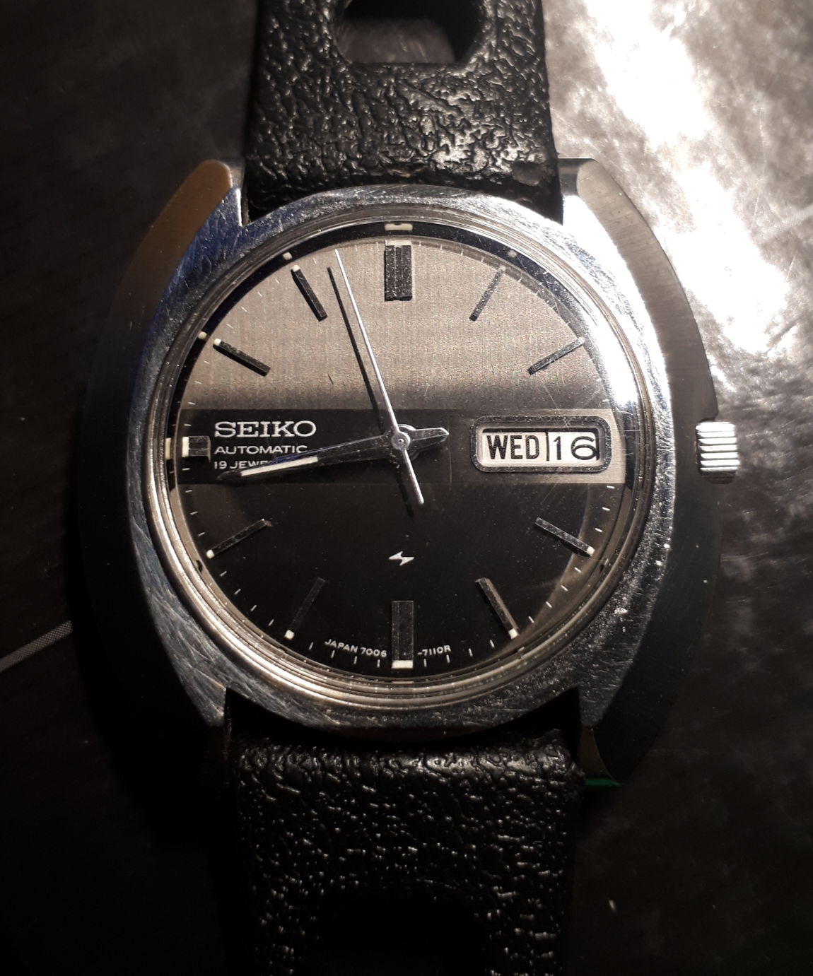 I must say, this deep dark blue enamel dial - with the lacquered off white hands and Roman numerals ...and the golden crescent moon second hand counterweight..is simply gorgeous... I can stare at this Seiko all day. Pictures don’t even tell the story. One has to have it on. Sometimes the dial looks wet , others times matte with a pebbly surface. Color varies in many shades of dark blue ...I like the way the enamel dimples at both the center of the dial and around the date window- Gives great depth to the whole dial. Yeah I know it’s not Seikos best movement - and the exhibition caseback is no big deal - still this watch is ( for blue dial) fans something to drool over. The seller Threw it on a dove-grey calfskin strap from Molequin...I like the contrast.
