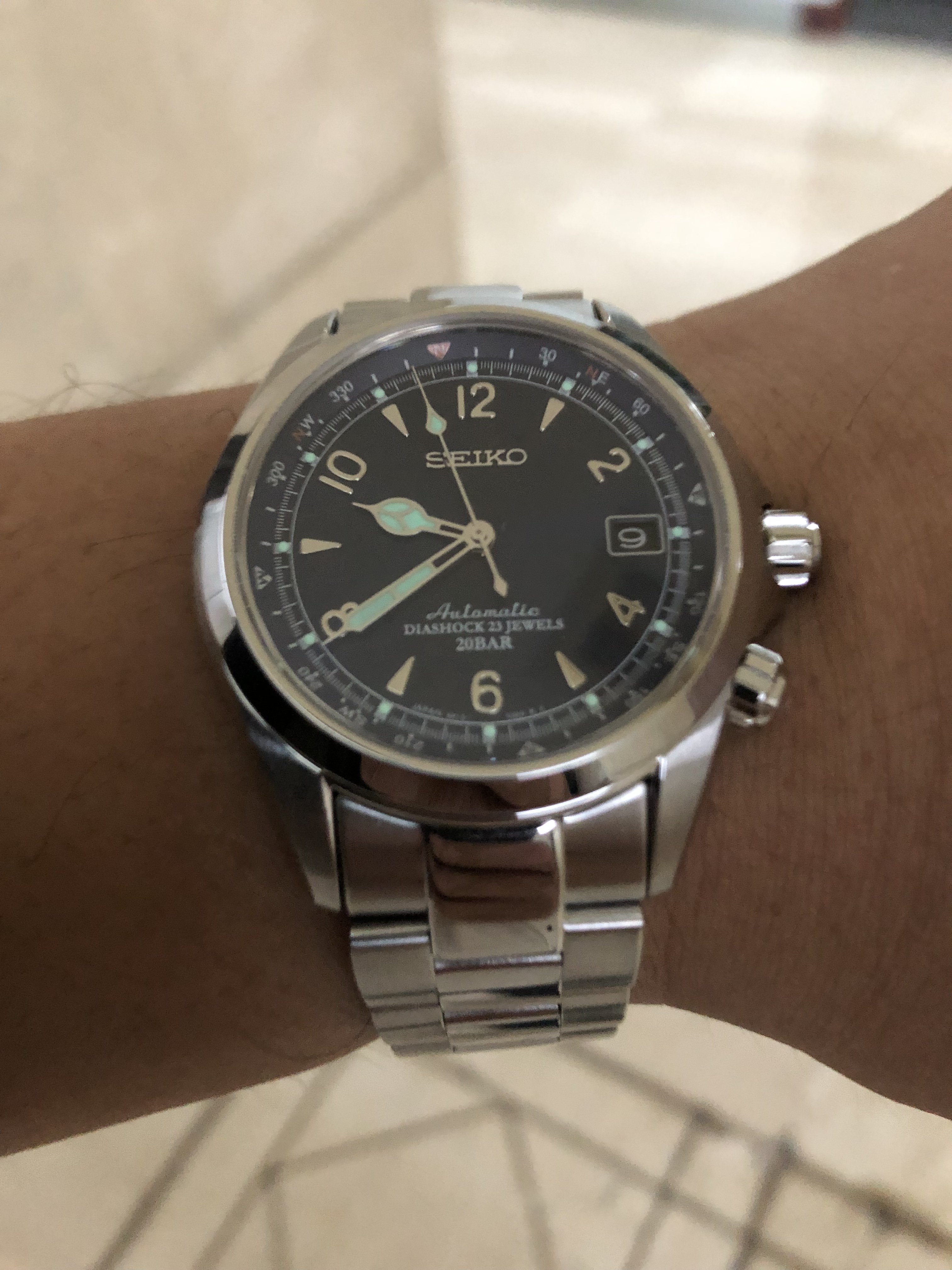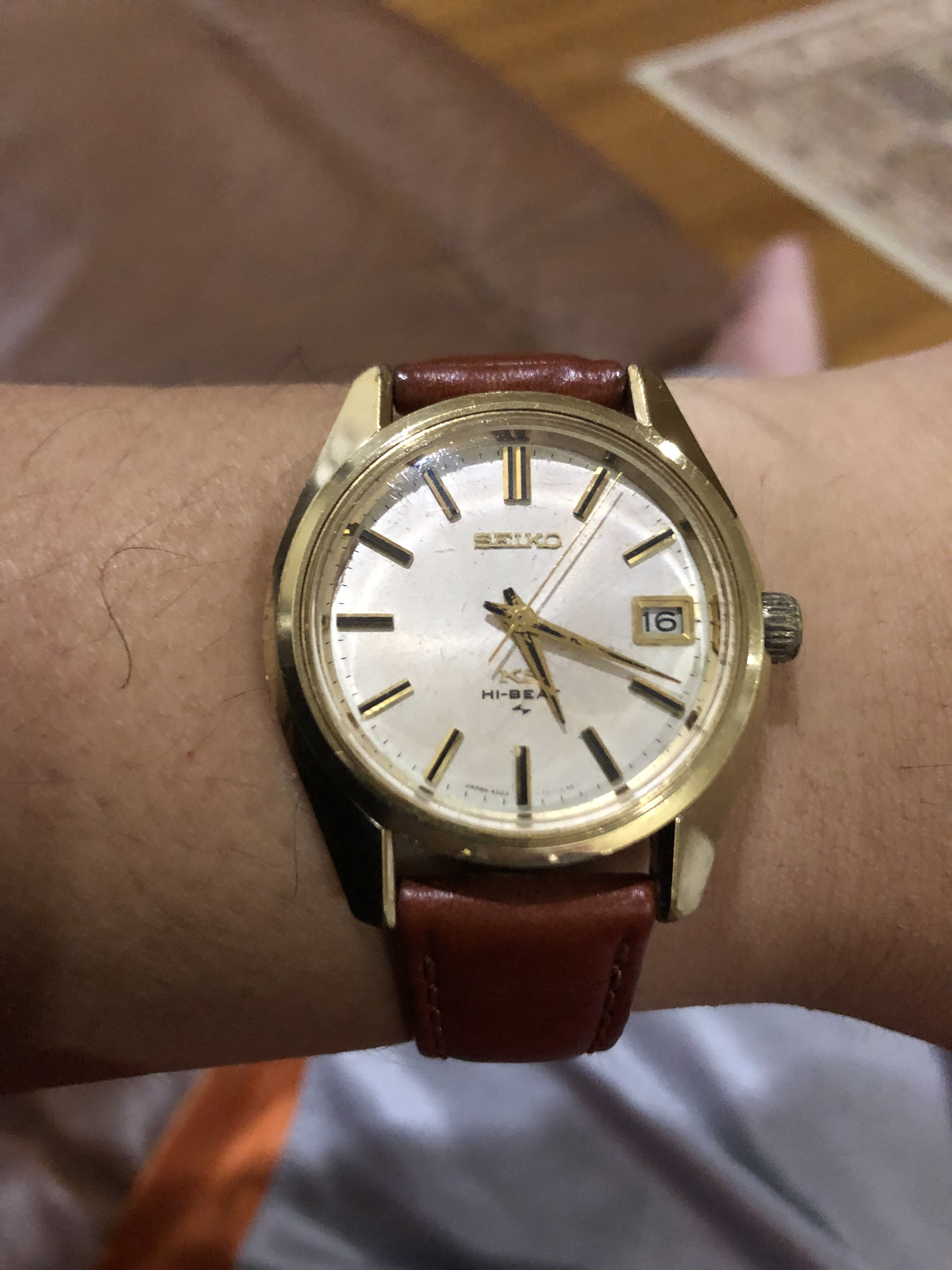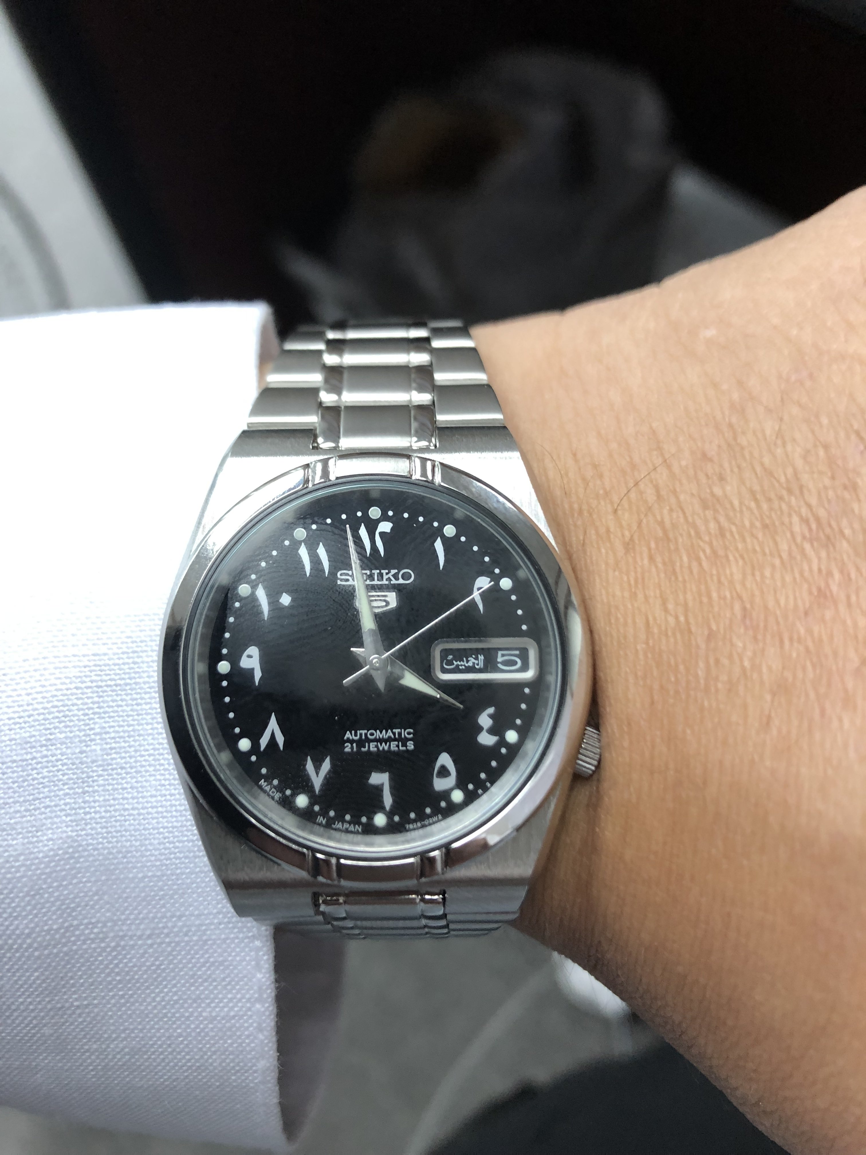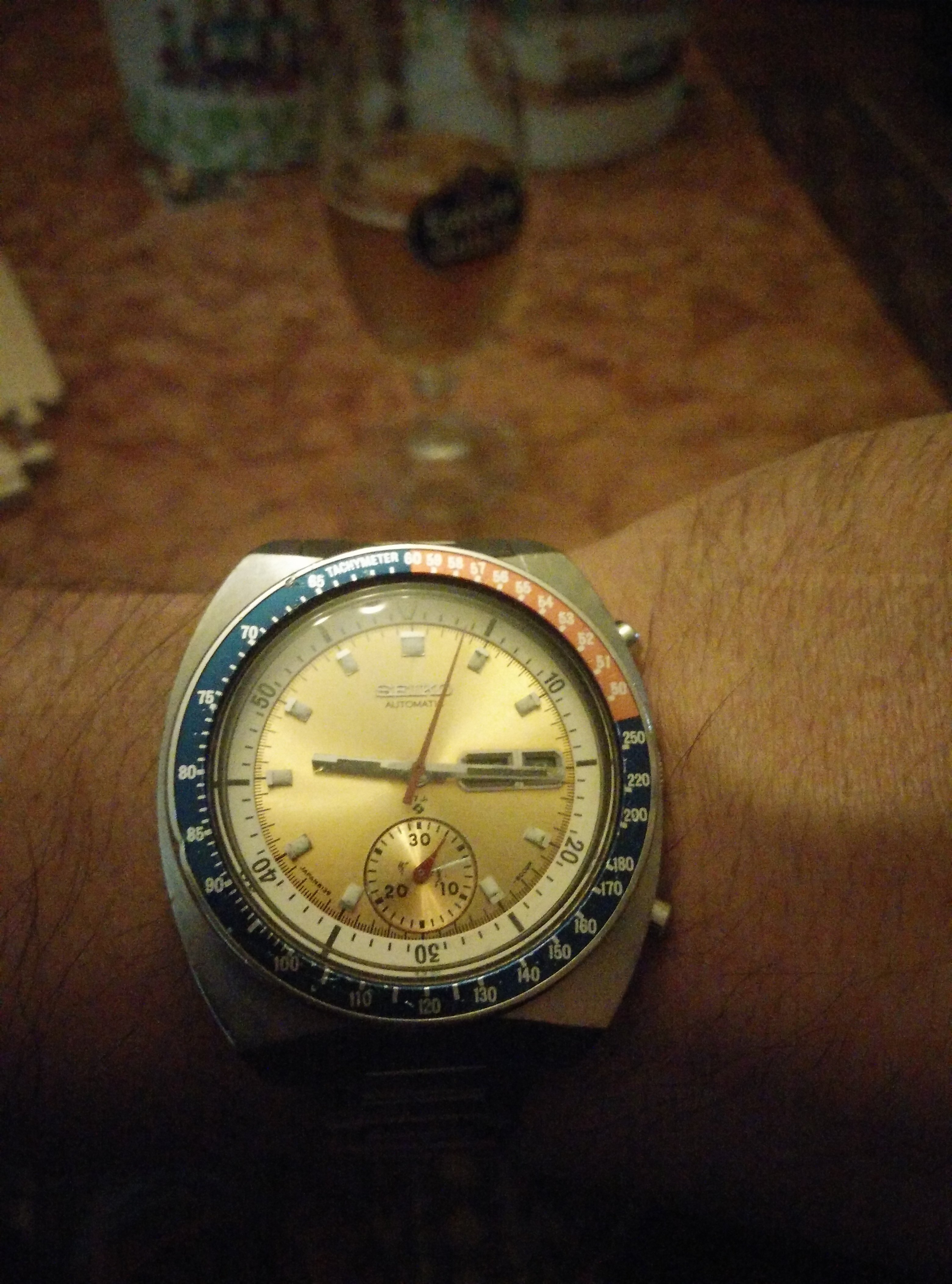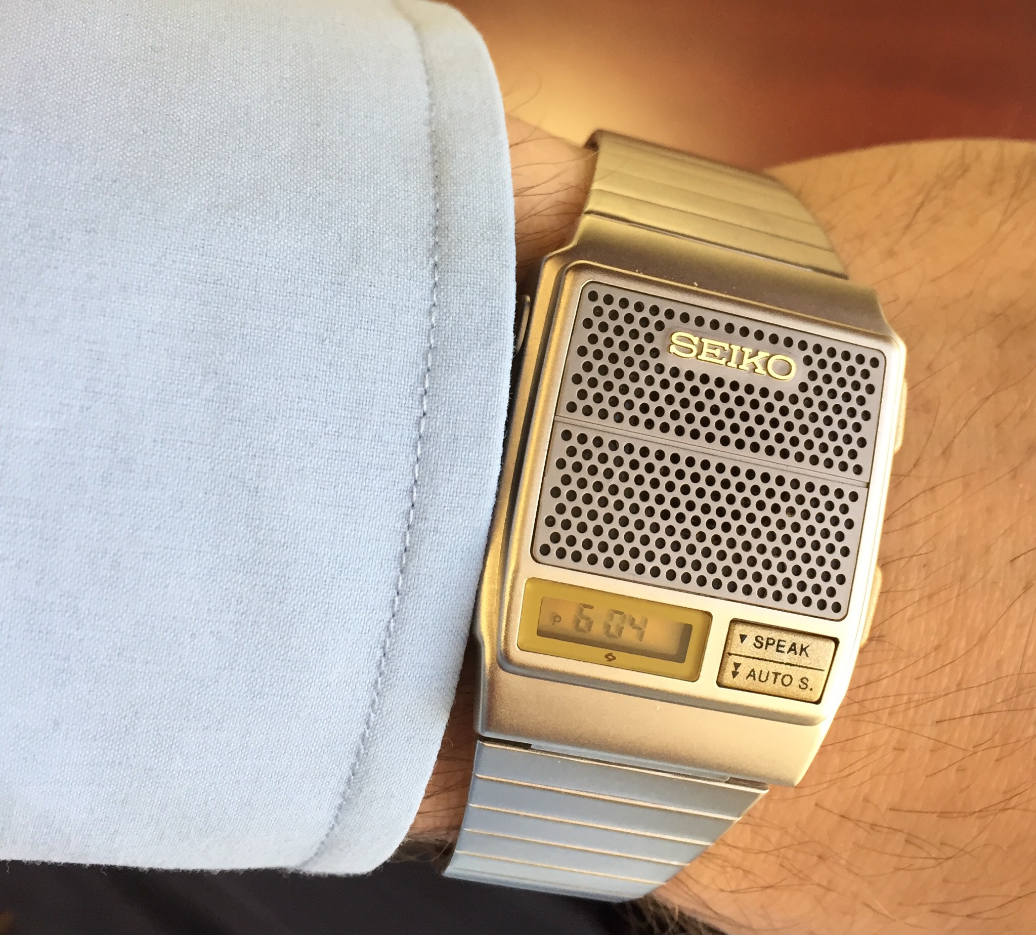 I am delighted with this one, which arrived today. I’ve had my eye on it for some time now; it is the first watch I’ve picked up in over a year: a Seiko A965-4000 “talking watch”. It announces the time in an English female or German male voice!